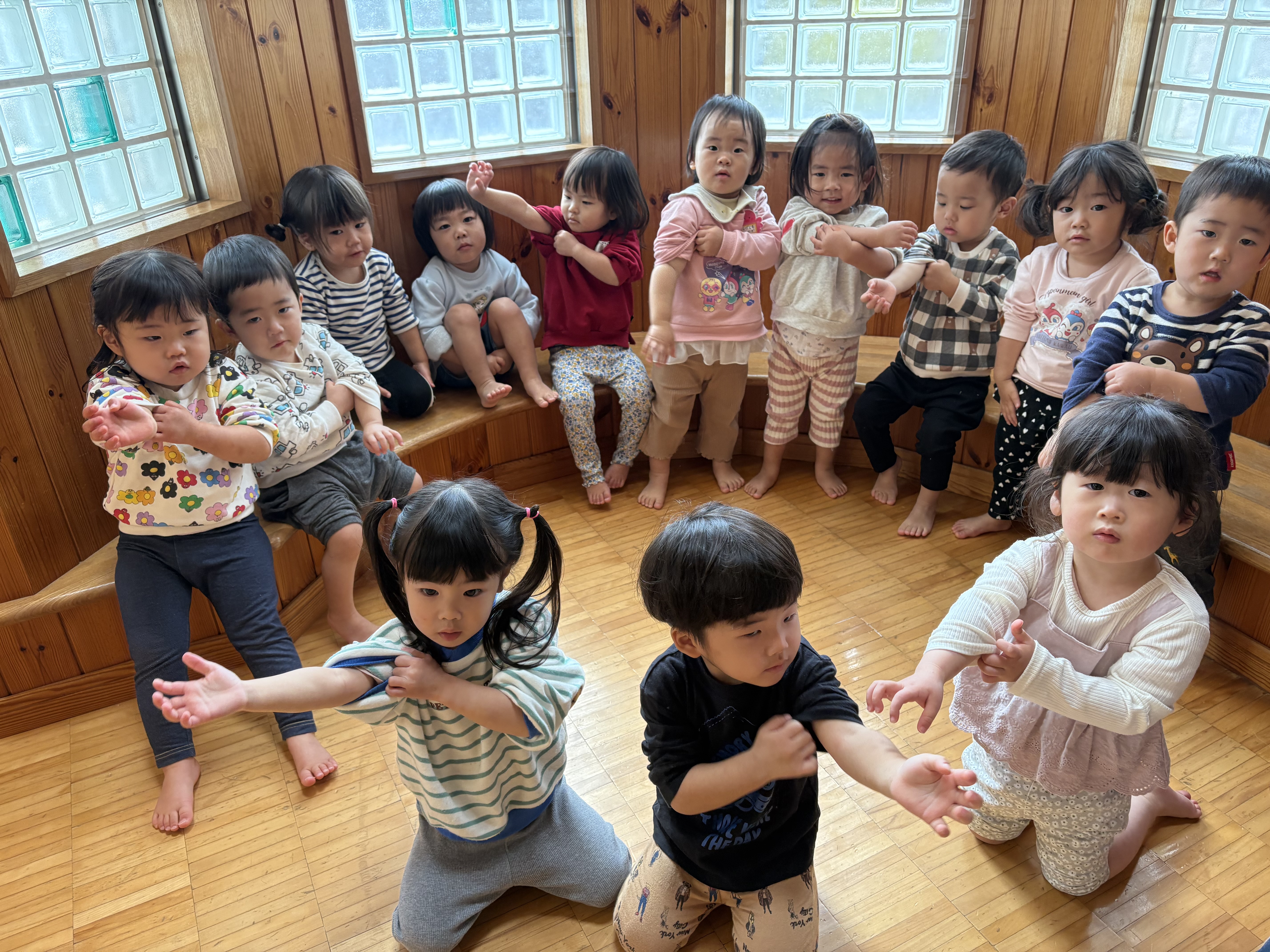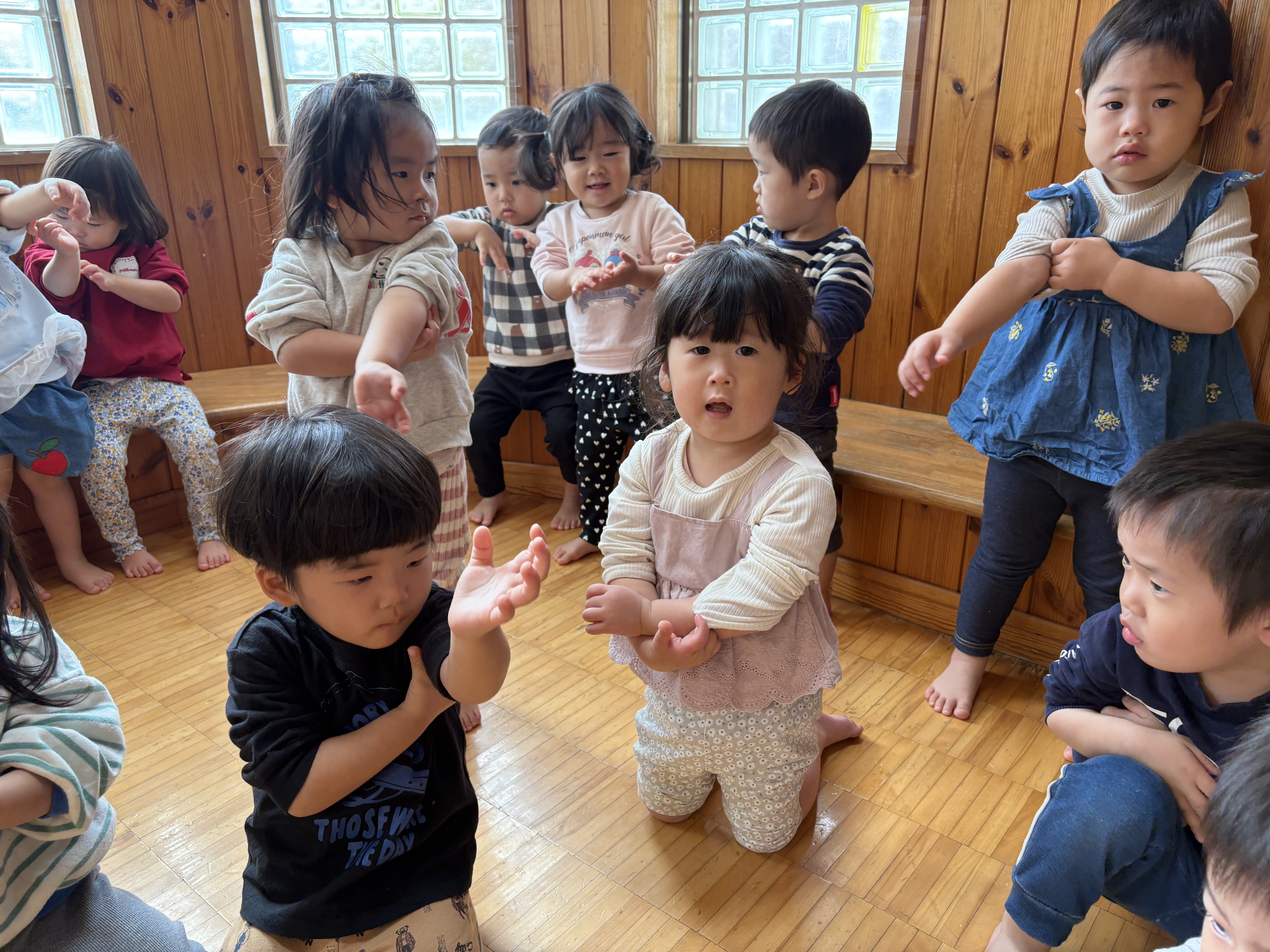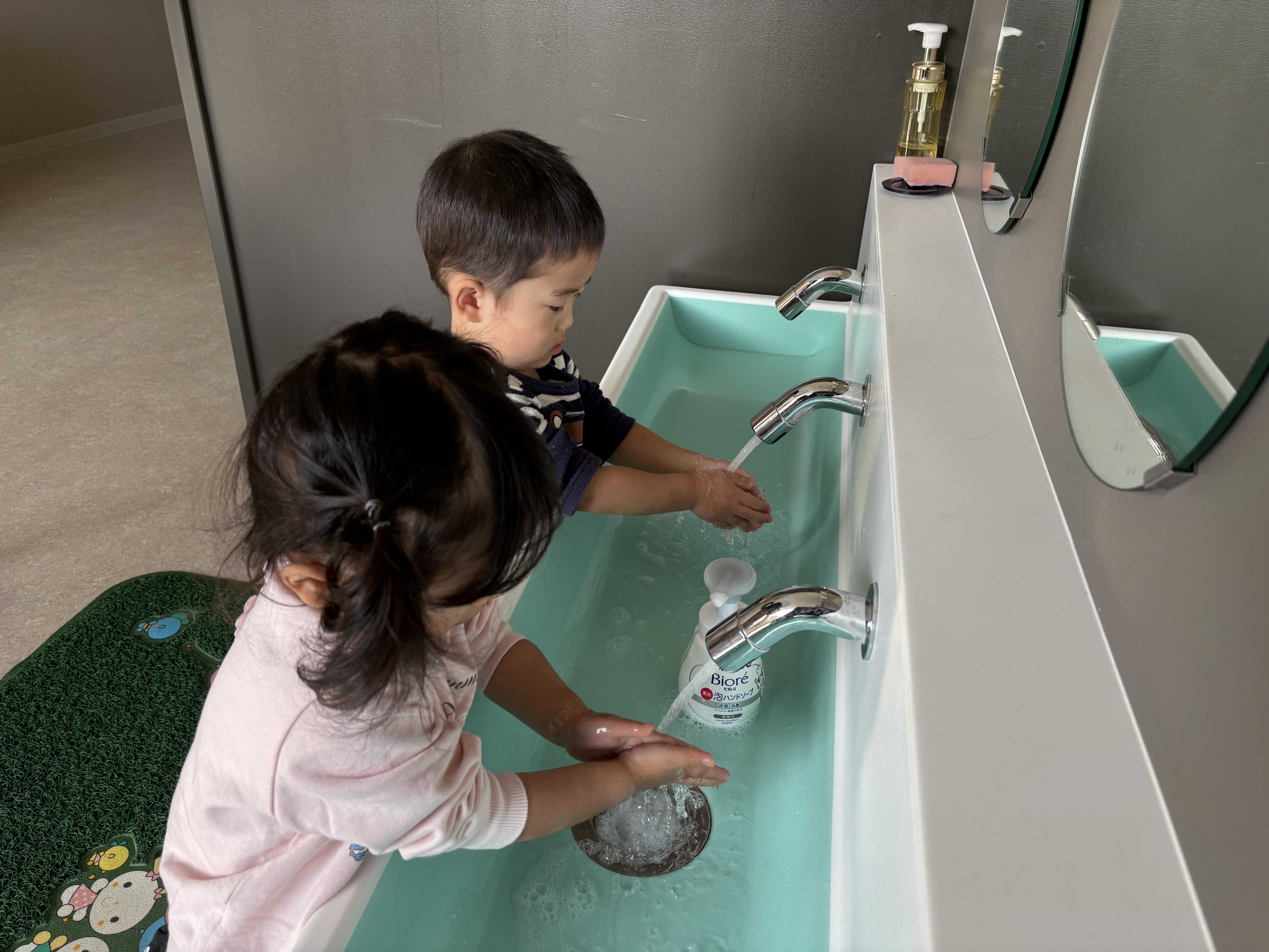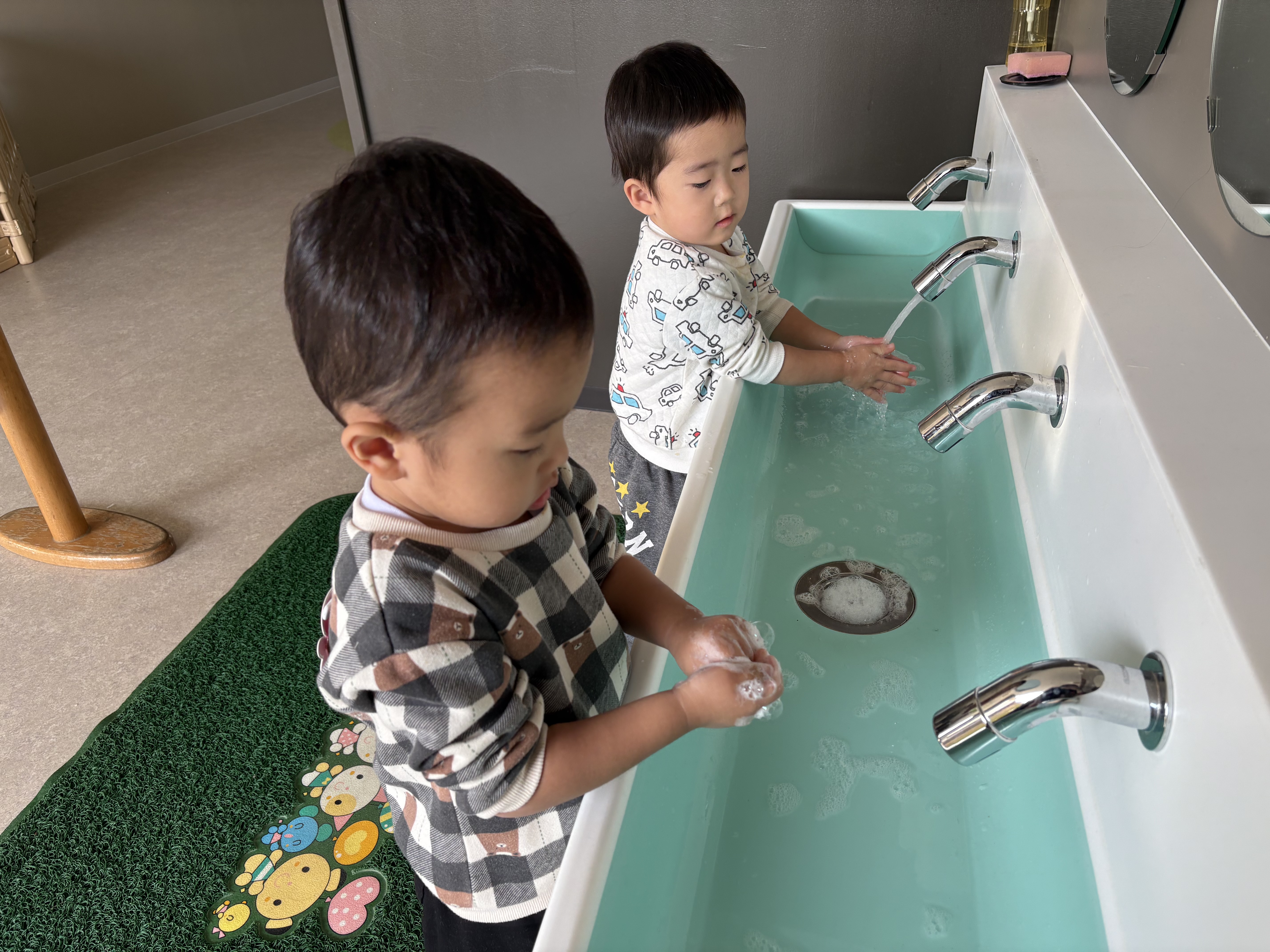 手洗いも前までは保育教諭と一緒にしていましたが、少しずつ手を洗う方法も身に付け、習慣づいてきたように思います。自分たちで手を洗うように声をかけると石鹸のボトルを押して泡を手につけると手の平をすり合わせながらゴシゴシと洗っています。このように1つ1つ自分たちでできることが増えてきていますが、始めは上手くいかず、すぐに諦めていました。日々の積み重ねでできなかった事もできるようになり達成感を味わいながら自分でしたいという気持ちが強くなっていくんだなと思いました。2歳児になると自己主張が強くなっていき何でも興味を持ってやってみようとします。これからも「自分でする」「やってみる」などの気持ちを読み取りながらいろんなことに挑戦させていきたいと思いました。