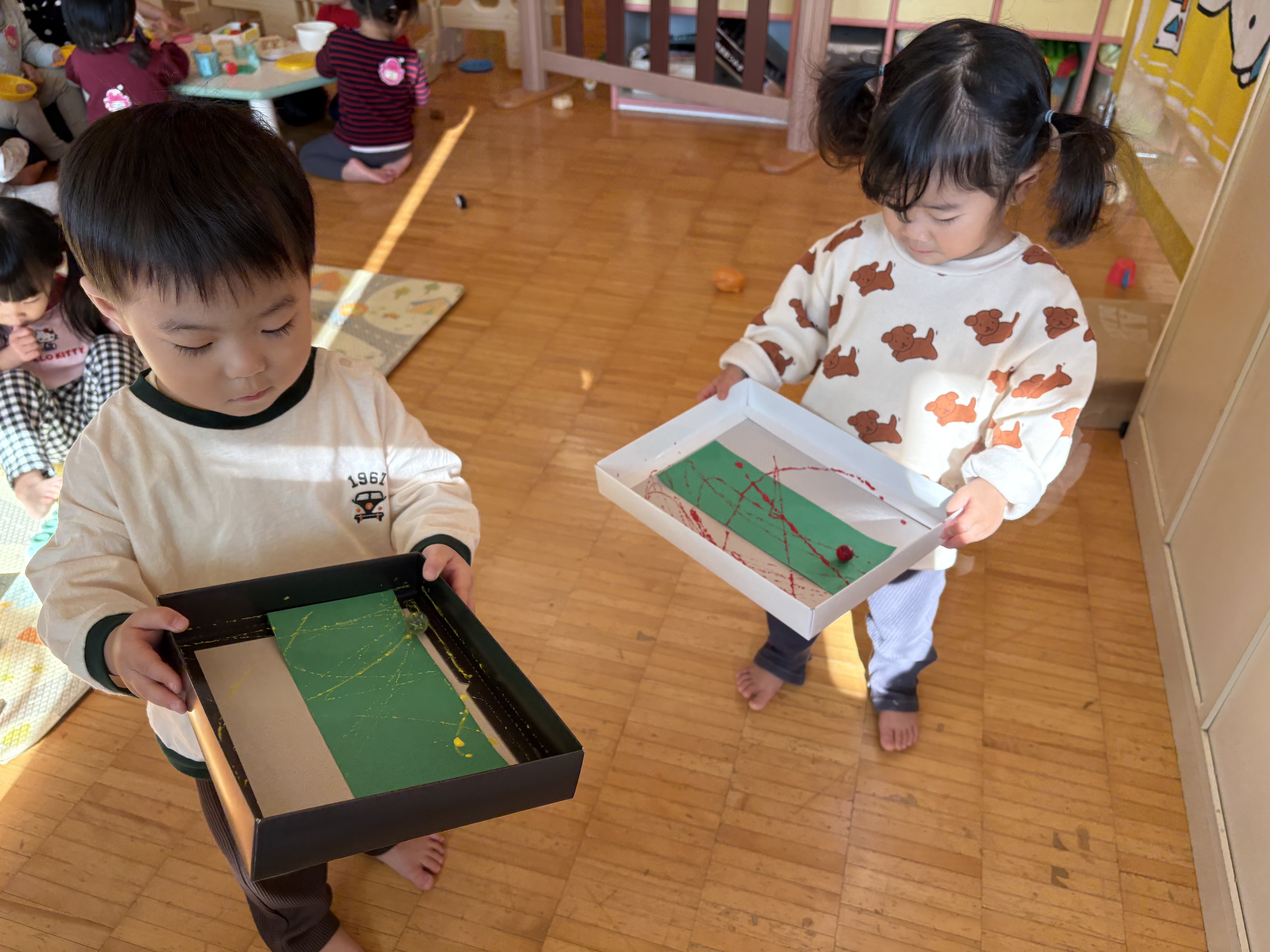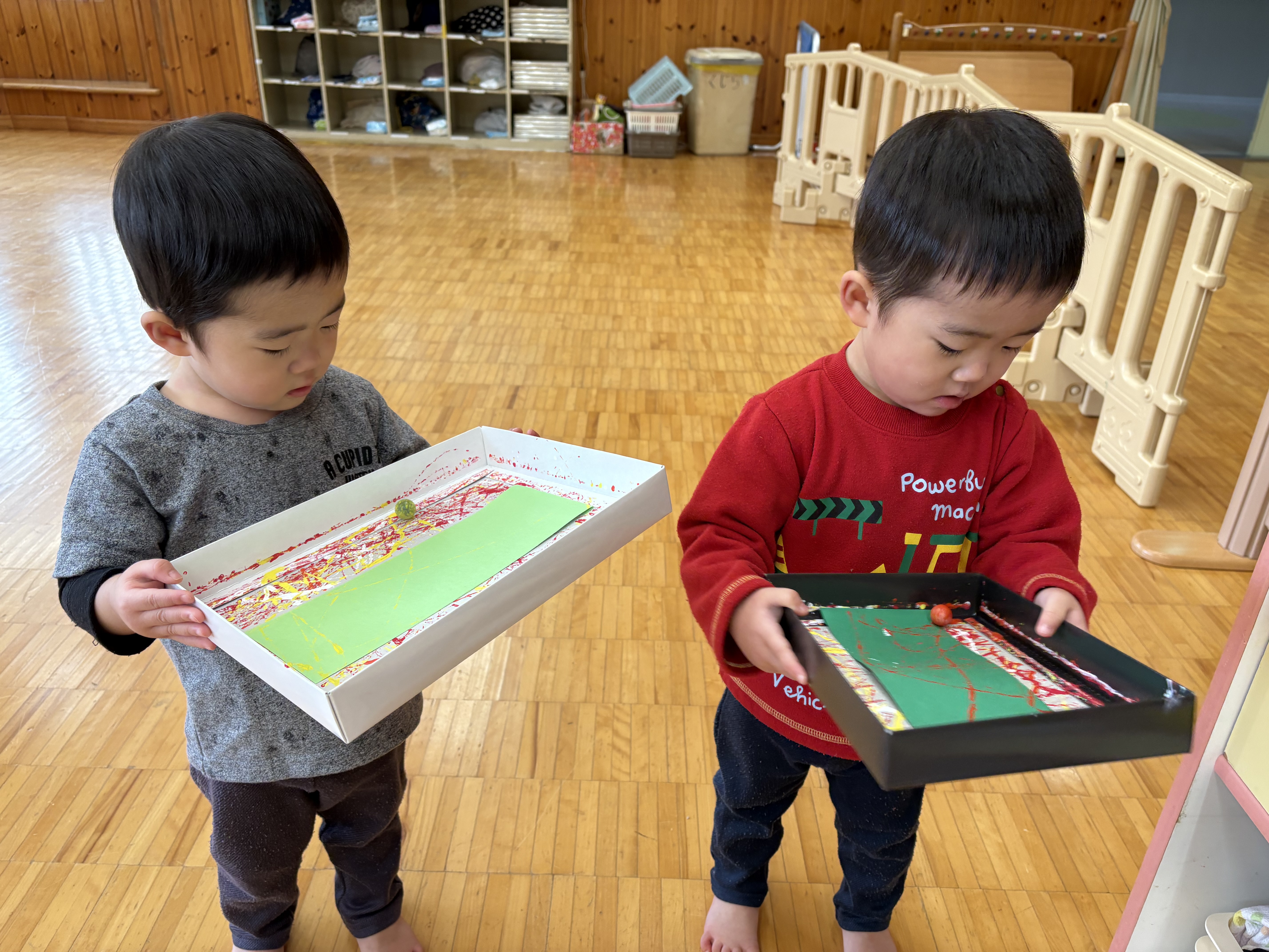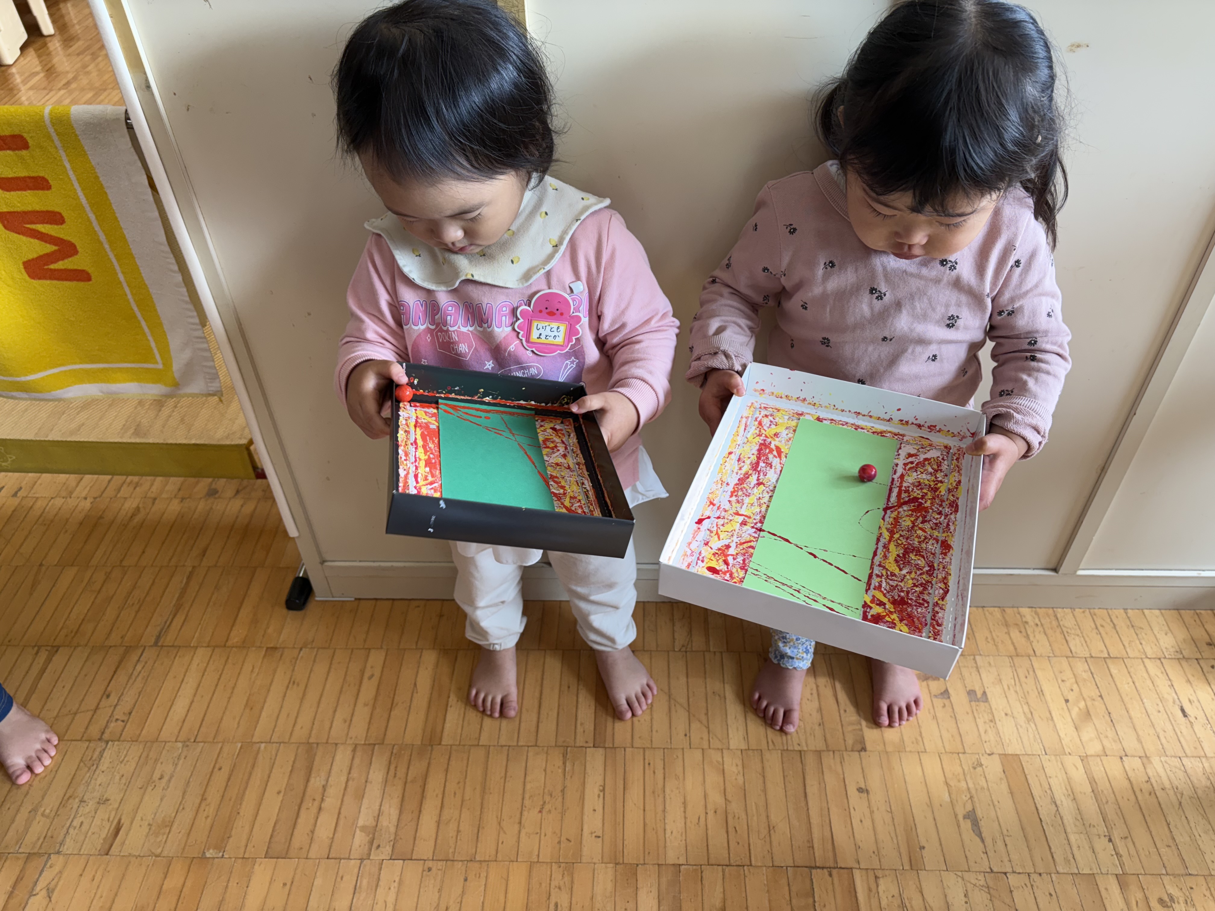 そんな時、この日は何でも興味津々の子どもたちは保育教諭が絵の具やビー玉を並べていると寄ってきてその手元をじーと見ていました。そこで絵の具が付いたビー玉を紙の上に置いてコロコロ転がして見せると目を輝かせて子どもたちから「◯◯する」「する!!」と手を出してきて触ろうとし始めました。紙が入った箱の中に色が付いたビー玉を入れるとコロコロ転がっていくビー玉を目で追いかけたり、箱をしっかり持ちながら上下・左右に動かしてみたりして色が付いていくことに気が付き、上下・左右に動かすだけではなくフライ返しのように箱を振っている子もいました。このようにして遊びながら偶然にできた模様の作品は12月のクリスマスツリーに変身する予定です!!