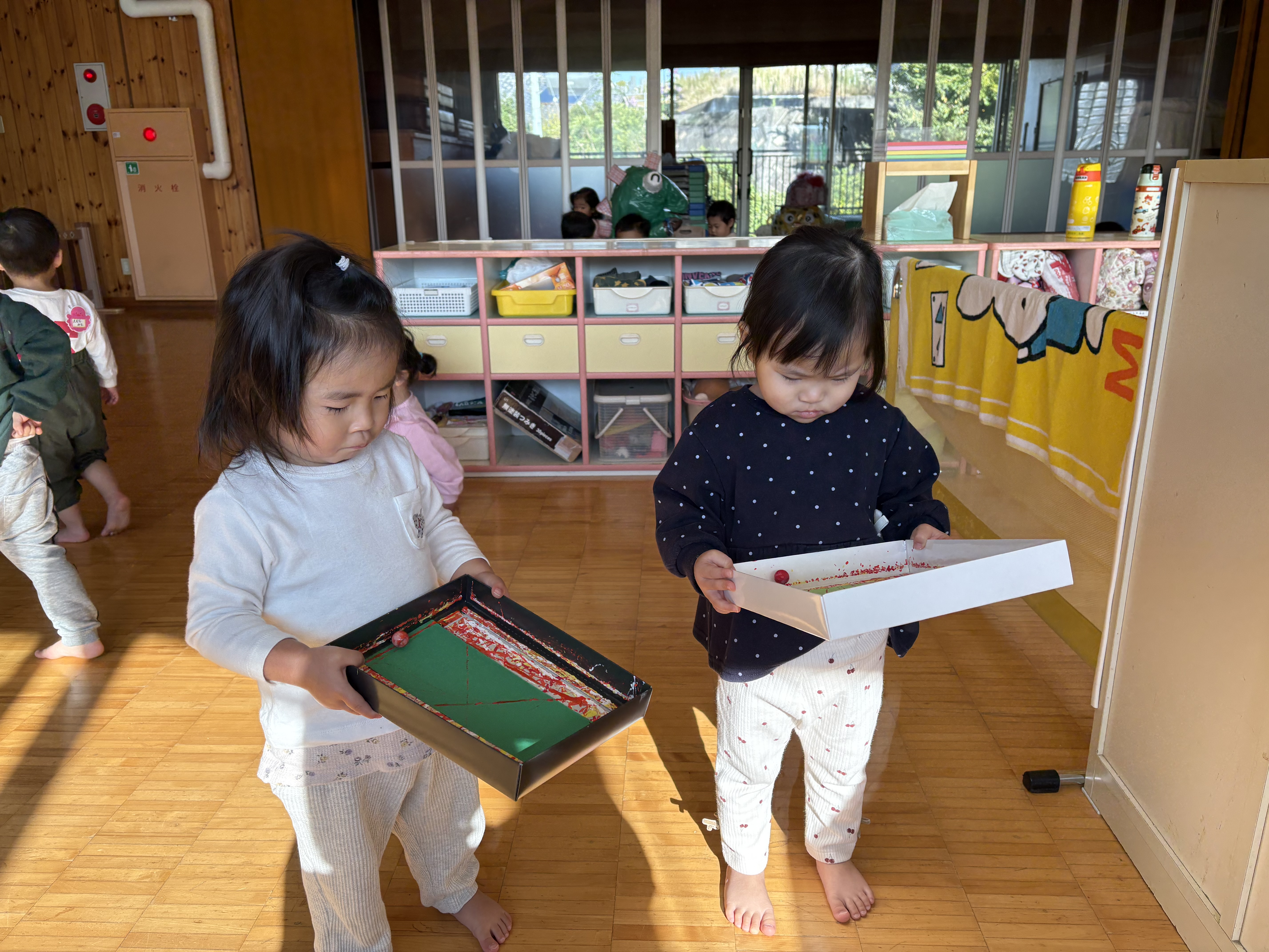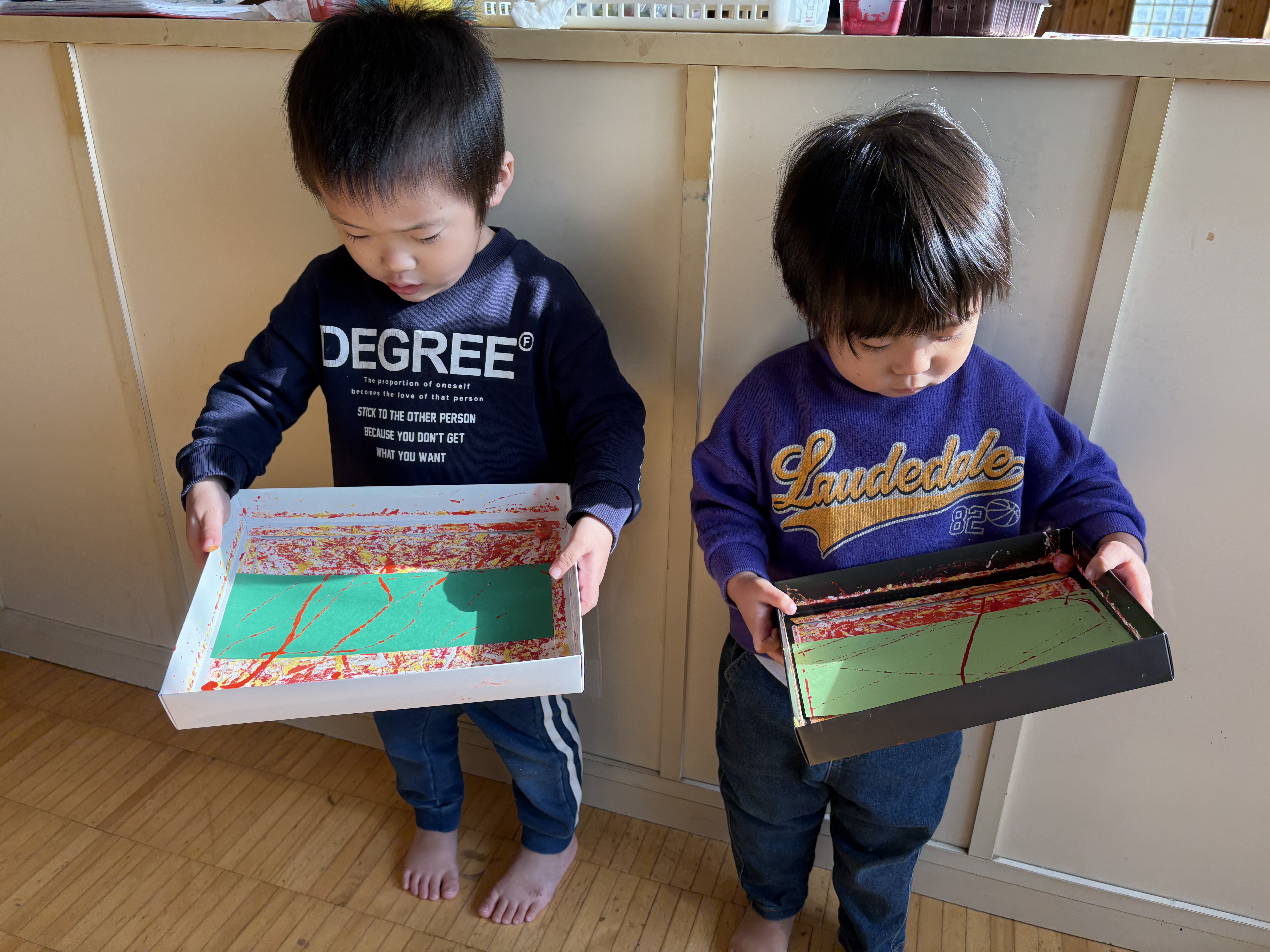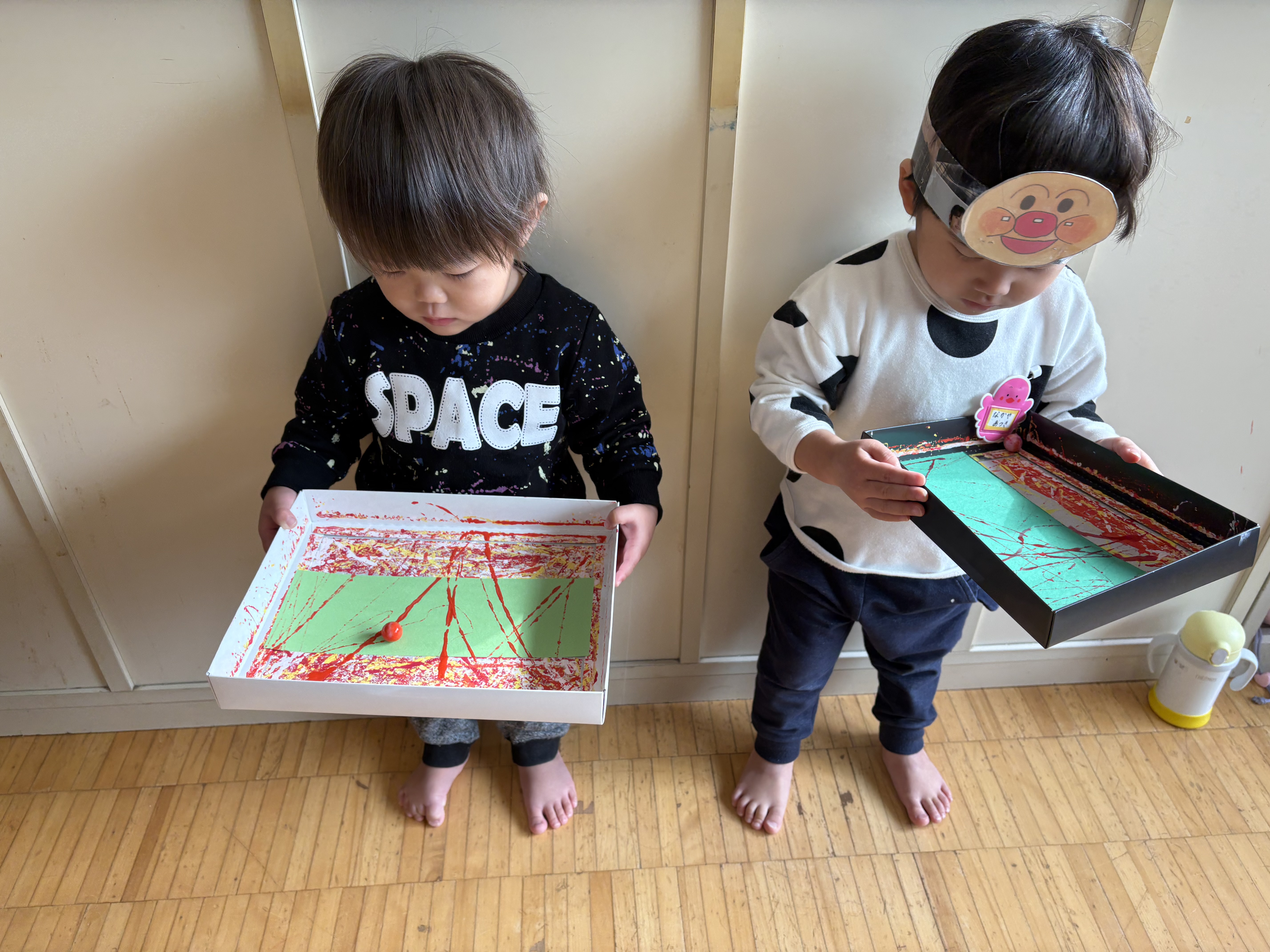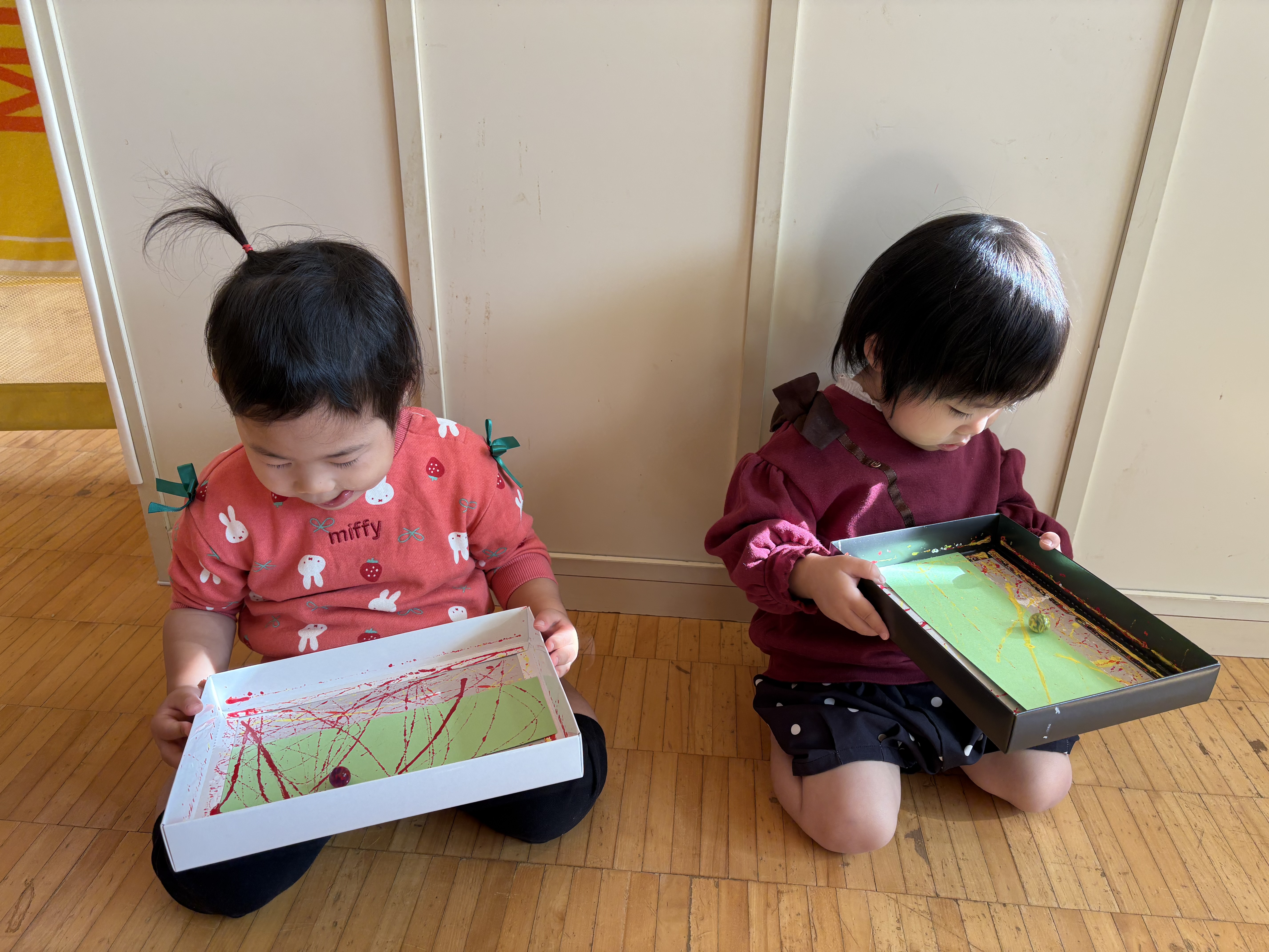 そんな時、この日は何でも興味津々の子どもたちは保育教諭が絵の具やビー玉を並べていると寄ってきてその手元をじーと見ていました。そこで絵の具が付いたビー玉を紙の上に置いてコロコロ転がして見せると目を輝かせて子どもたちから「◯◯する」「する!!」と手を出してきて触ろうとし始めました。紙が入った箱の中に色が付いたビー玉を入れるとコロコロ転がっていくビー玉を目で追いかけたり、箱をしっかり持ちながら上下・左右に動かしてみたりして色が付いていくことに気が付き、上下・左右に動かすだけではなくフライ返しのように箱を振っている子もいました。このようにして遊びながら偶然にできた模様の作品は12月のクリスマスツリーに変身する予定です!!