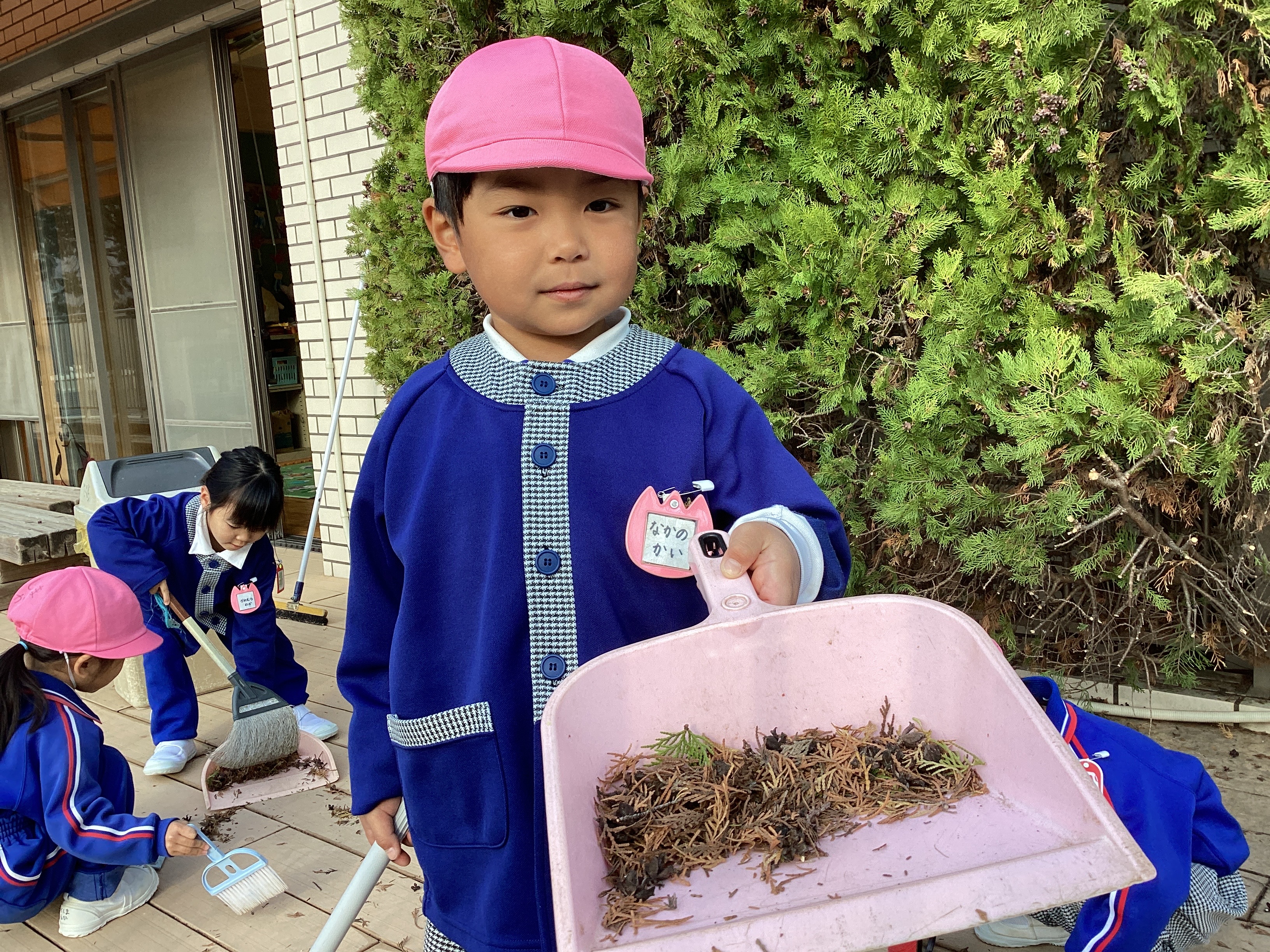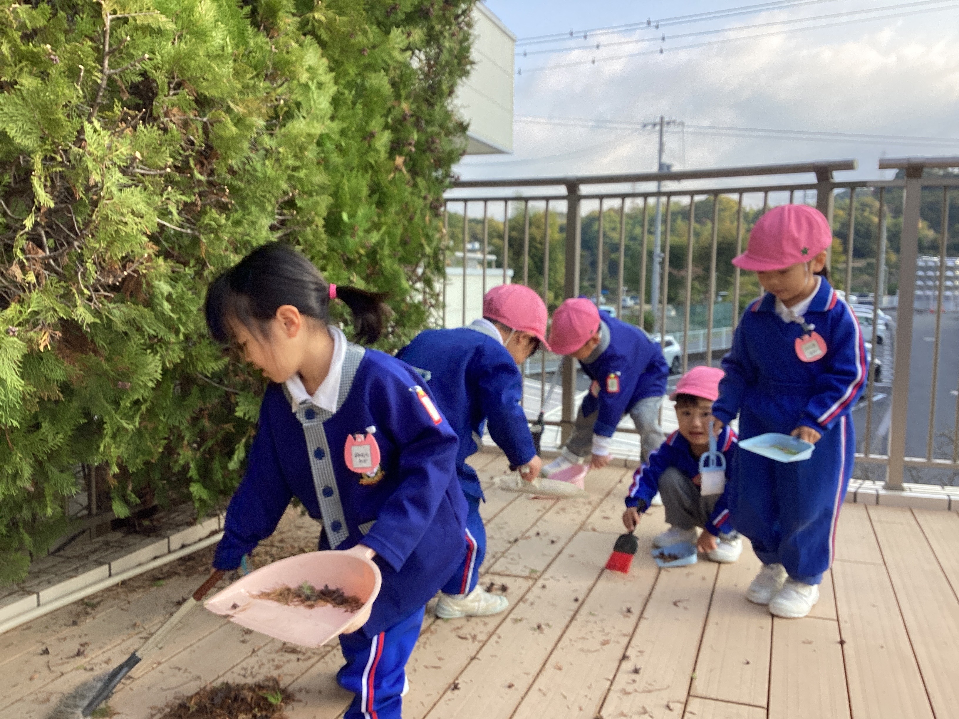 そんな中、今日も戸外でみつばっ子たちは元気いっぱい遊んでいました。登園してきた子どもたちに挨拶をしていると「せんせ~い」とどこからか呼んでいる声がしました。ふと二階に目をやると、さくら組の子どもたちがほうきとちりとりを持って呼んでいたのでした。子どもたちにテラスで何しているの?と聞くと、「お掃除しよんよ!いっぱいゴミがあるんけん!」というのでテラスに上がってみると、昨日の雨で二階のテラスまで伸びている枝葉や木の実がたくさん落ちていました。そのことに気がついた子どもたちが自らほうきやちりとりを持ってきて掃除を始めていたのでした。掃除が終盤になり「みんながお掃除してくれたから綺麗になった」と言うと、Rちゃんが「Rはねお家で洗濯たたんだりするし、掃除もお母さんと一緒にしよるけんね上手なんよ」と教えてくれました。散らかっていたり、汚れていたりすると掃除をすることを、日々の生活の中で経験していて子どもたちが自然とできるようになっていることに感心しました。