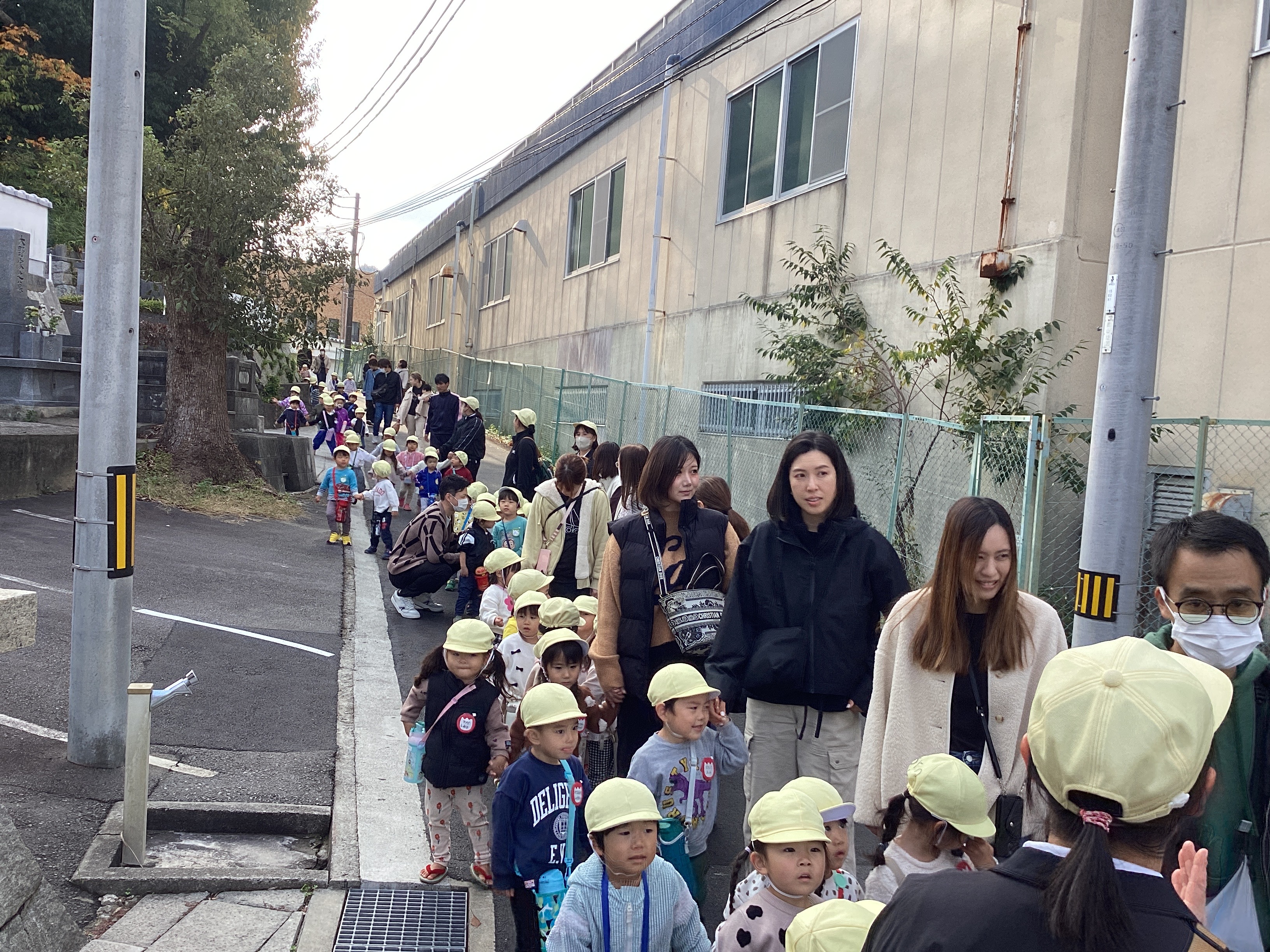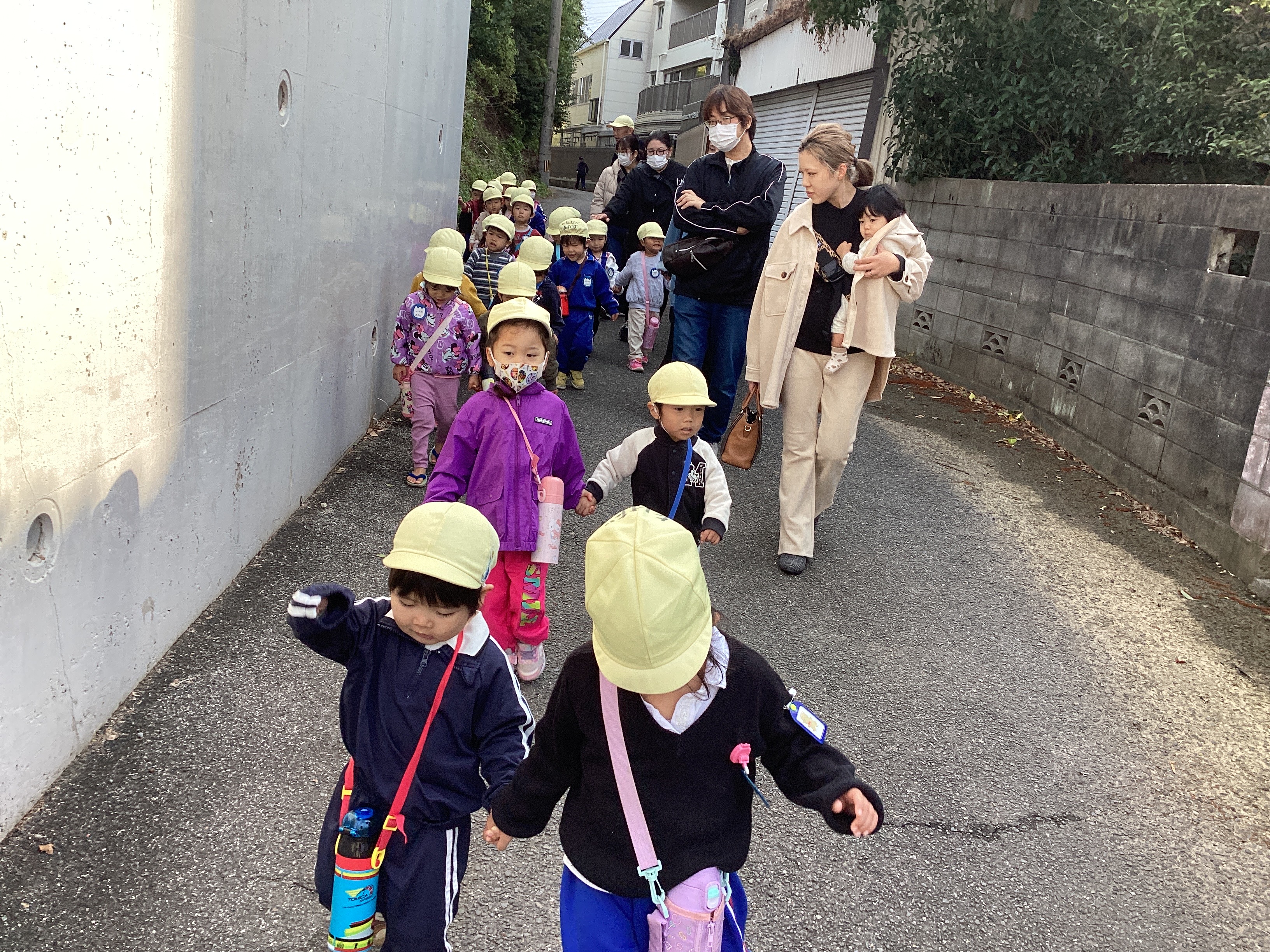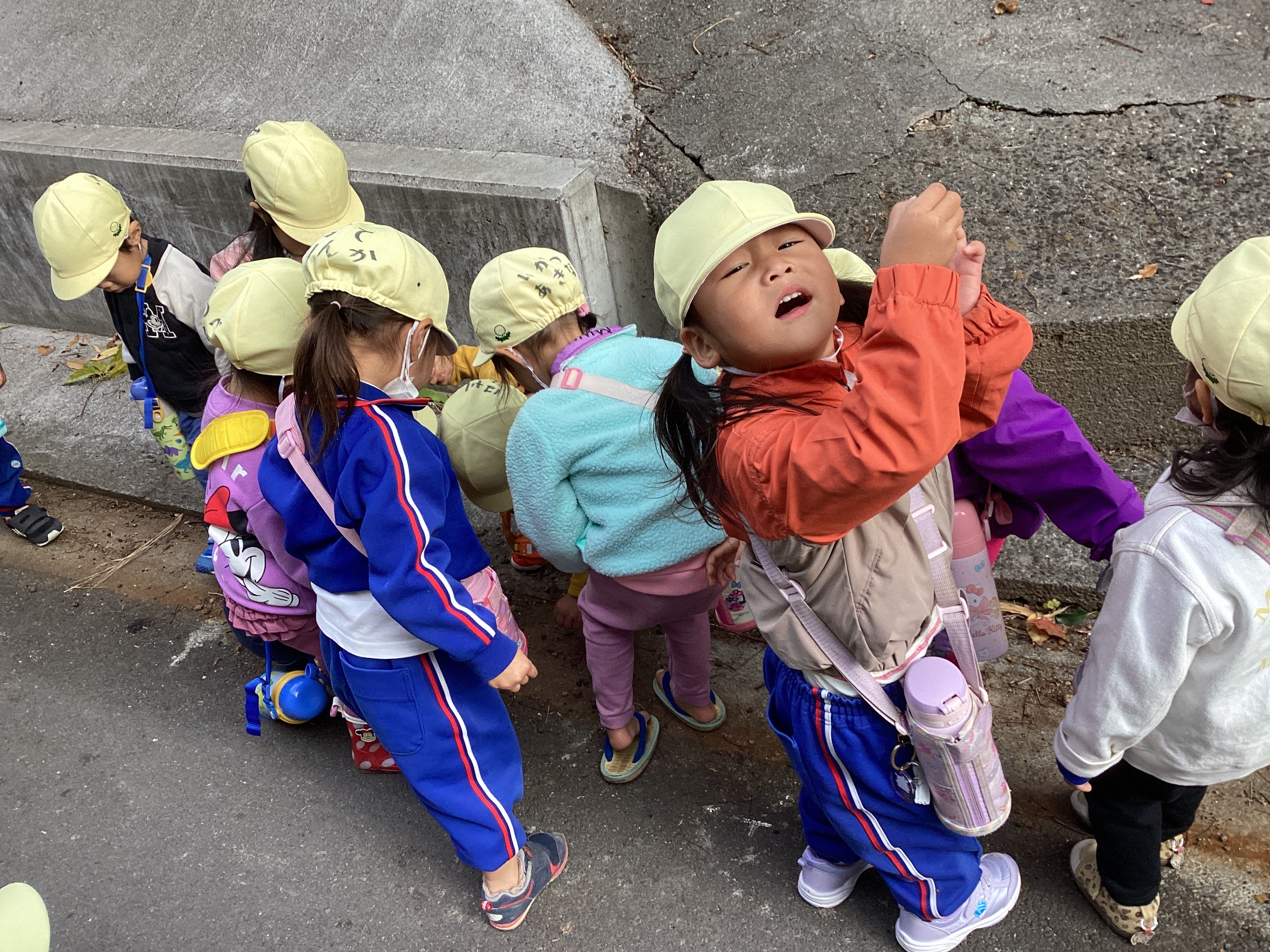 たくさん遊んだ帰り道では、前回どんぐり拾いに行った常福寺さんの前を通ると小さなどんぐりが落ちていることに気が付いたIちゃん。「どんぐりある!!」と言うと、それを聞いた子どもたちが「どんぐりどこ?」と探し始めました。落ちていたどんぐりを友だちと協力して見つけて拾うとどんぐりを大事に握りしめ幼稚園帰っていました。部屋に戻っても拾ったどんぐりを嬉しそうに見ている姿がとても可愛かったです。