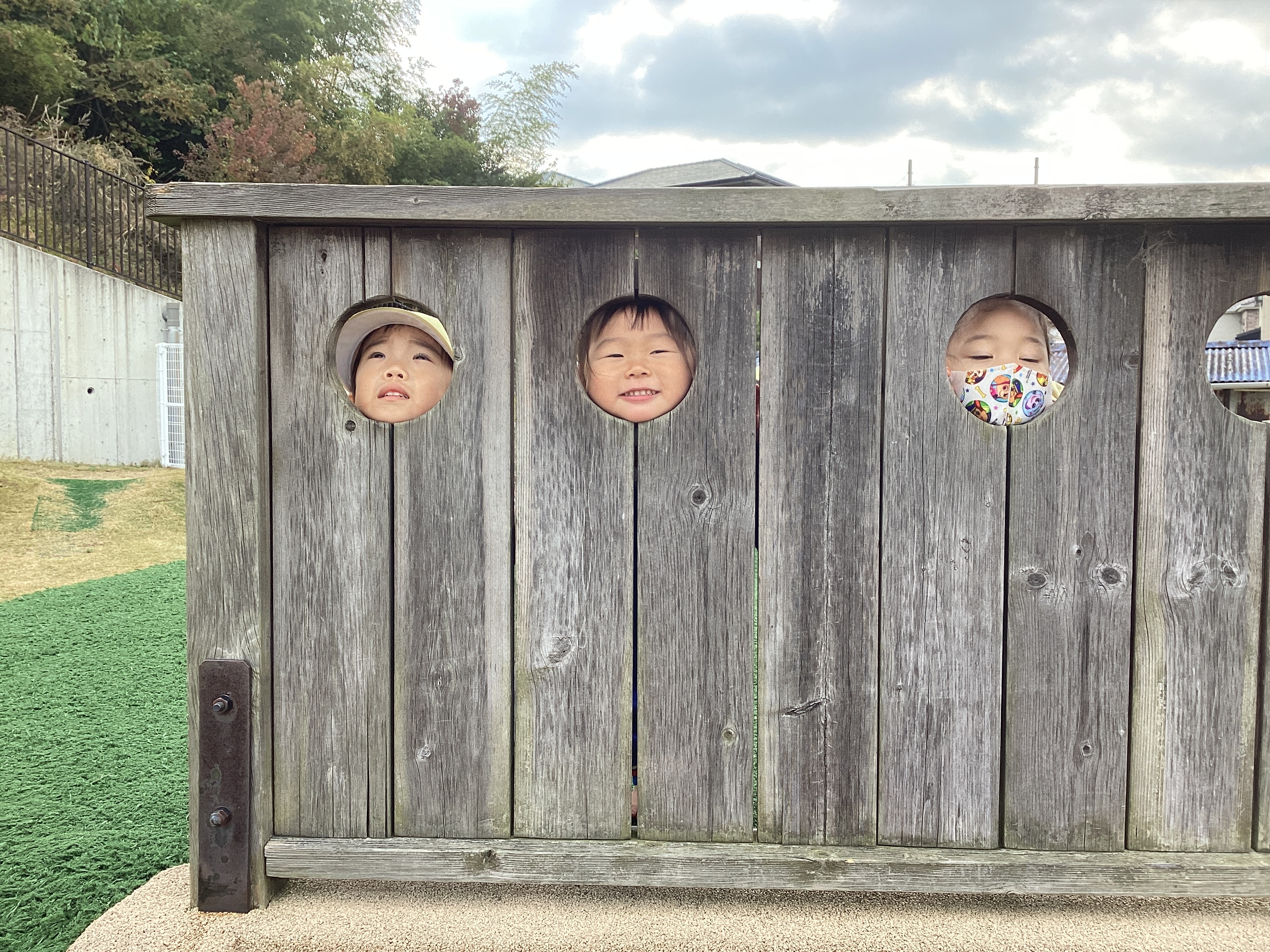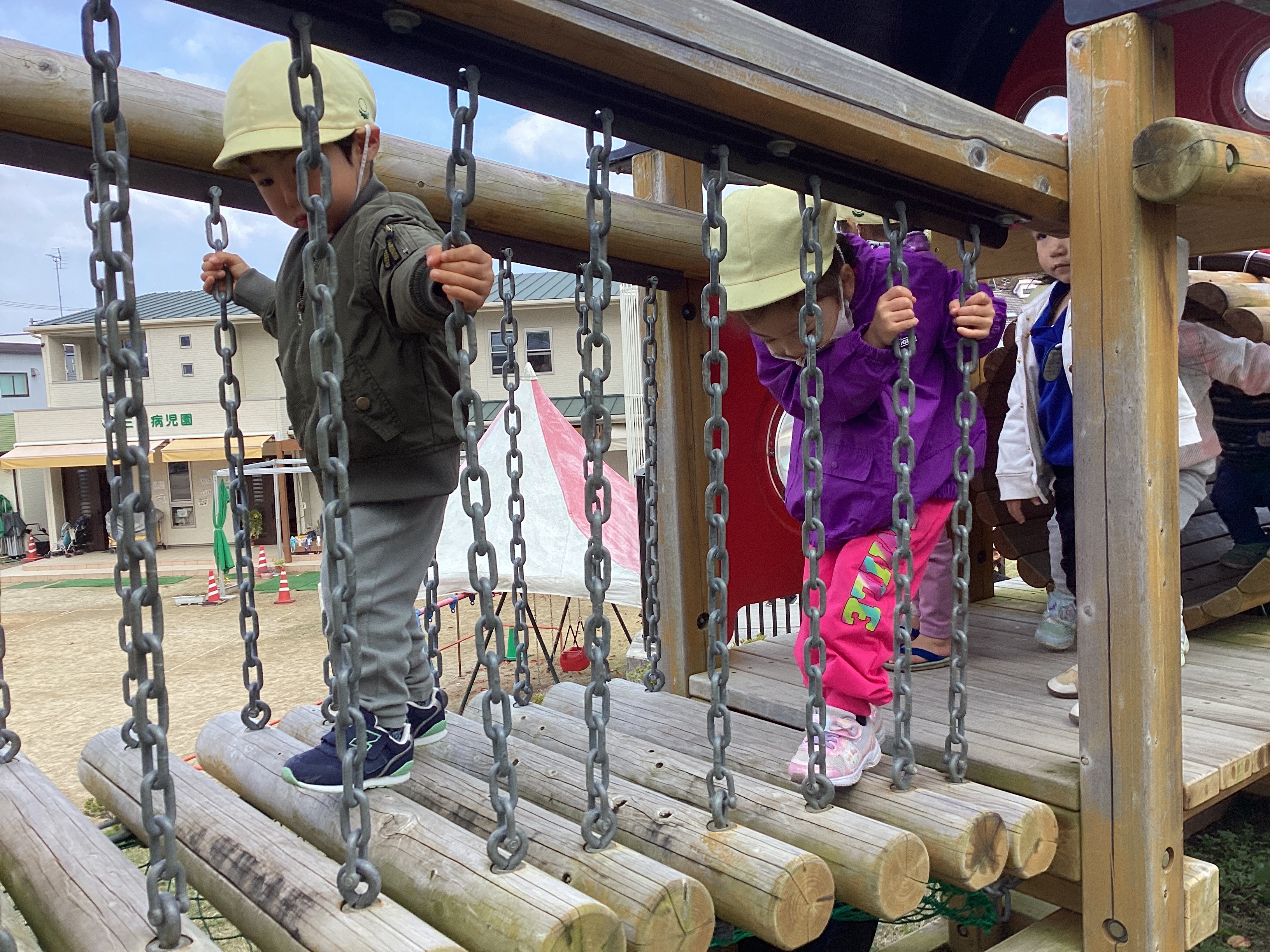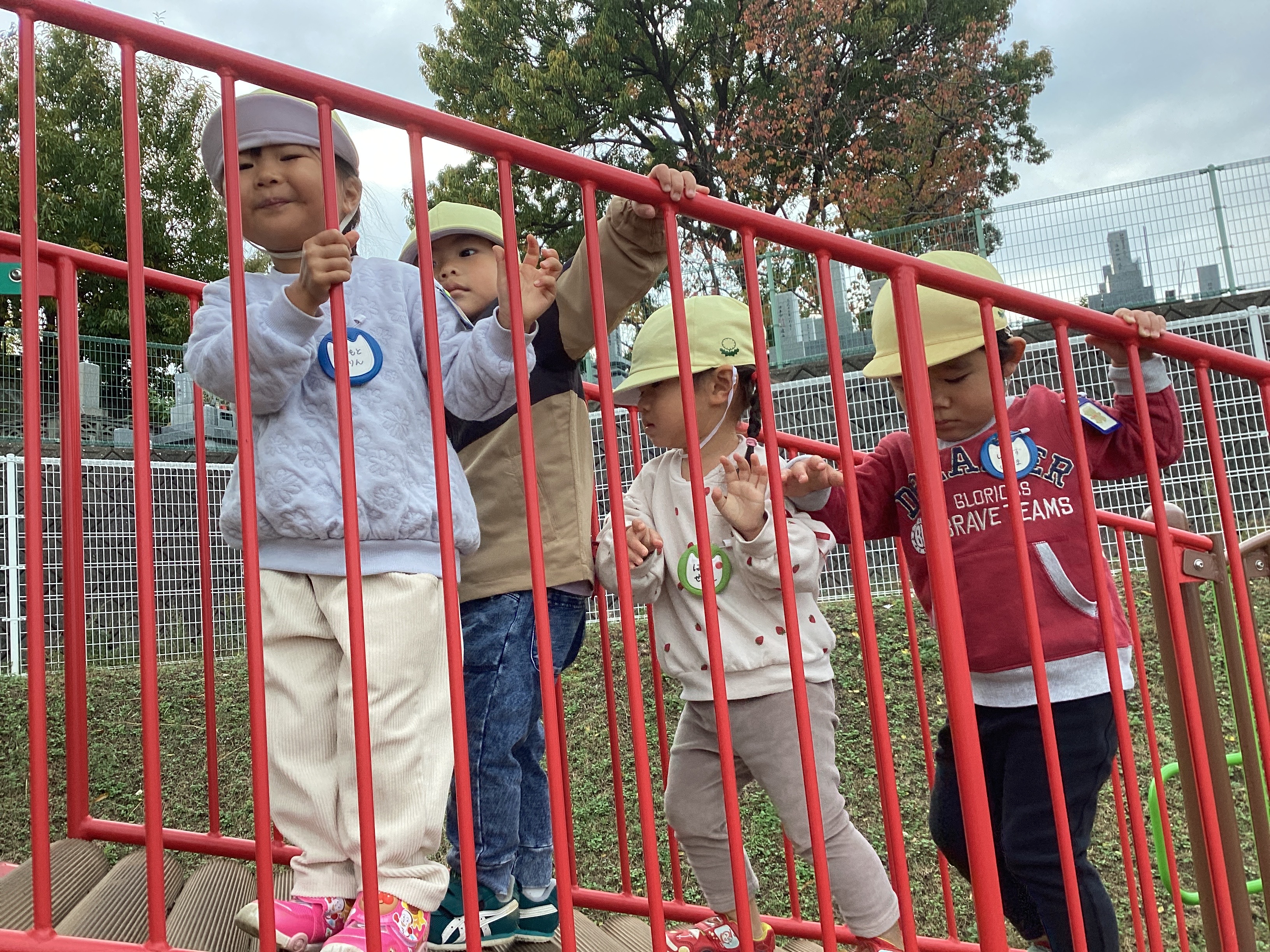 たくさん遊んだ帰り道では、前回どんぐり拾いに行った常福寺さんの前を通ると小さなどんぐりが落ちていることに気が付いたIちゃん。「どんぐりある!!」と言うと、それを聞いた子どもたちが「どんぐりどこ?」と探し始めました。落ちていたどんぐりを友だちと協力して見つけて拾うとどんぐりを大事に握りしめ幼稚園帰っていました。部屋に戻っても拾ったどんぐりを嬉しそうに見ている姿がとても可愛かったです。