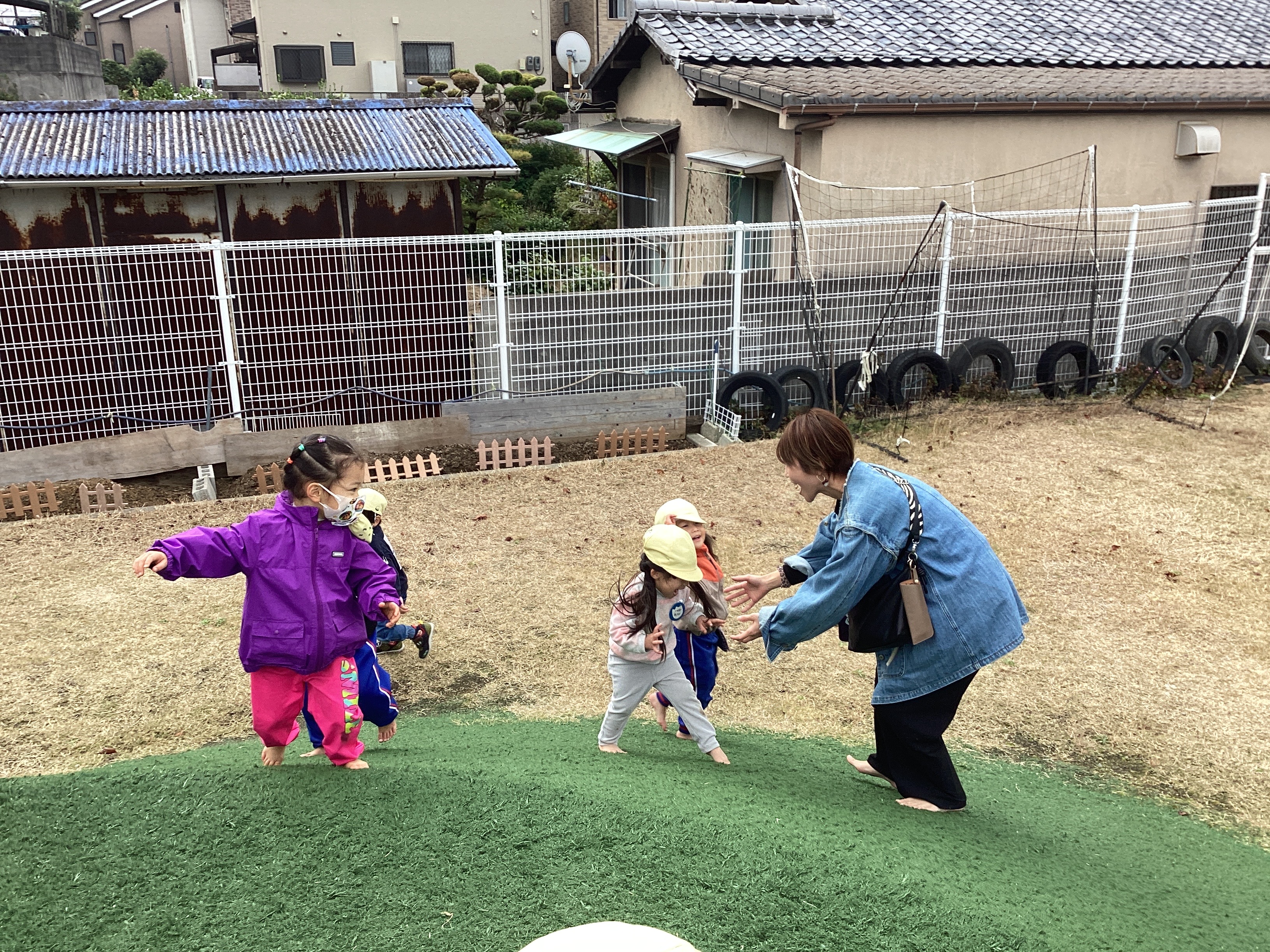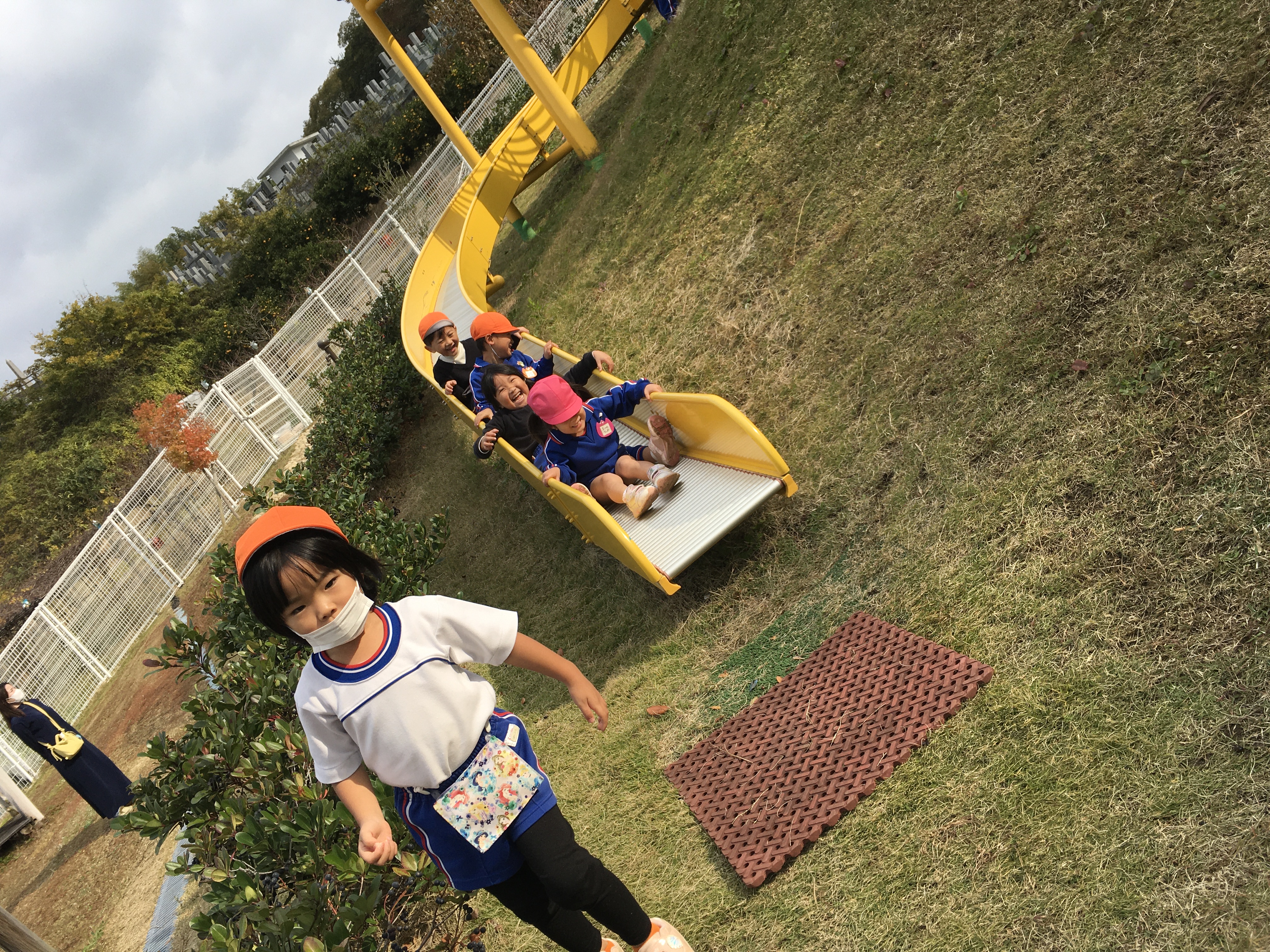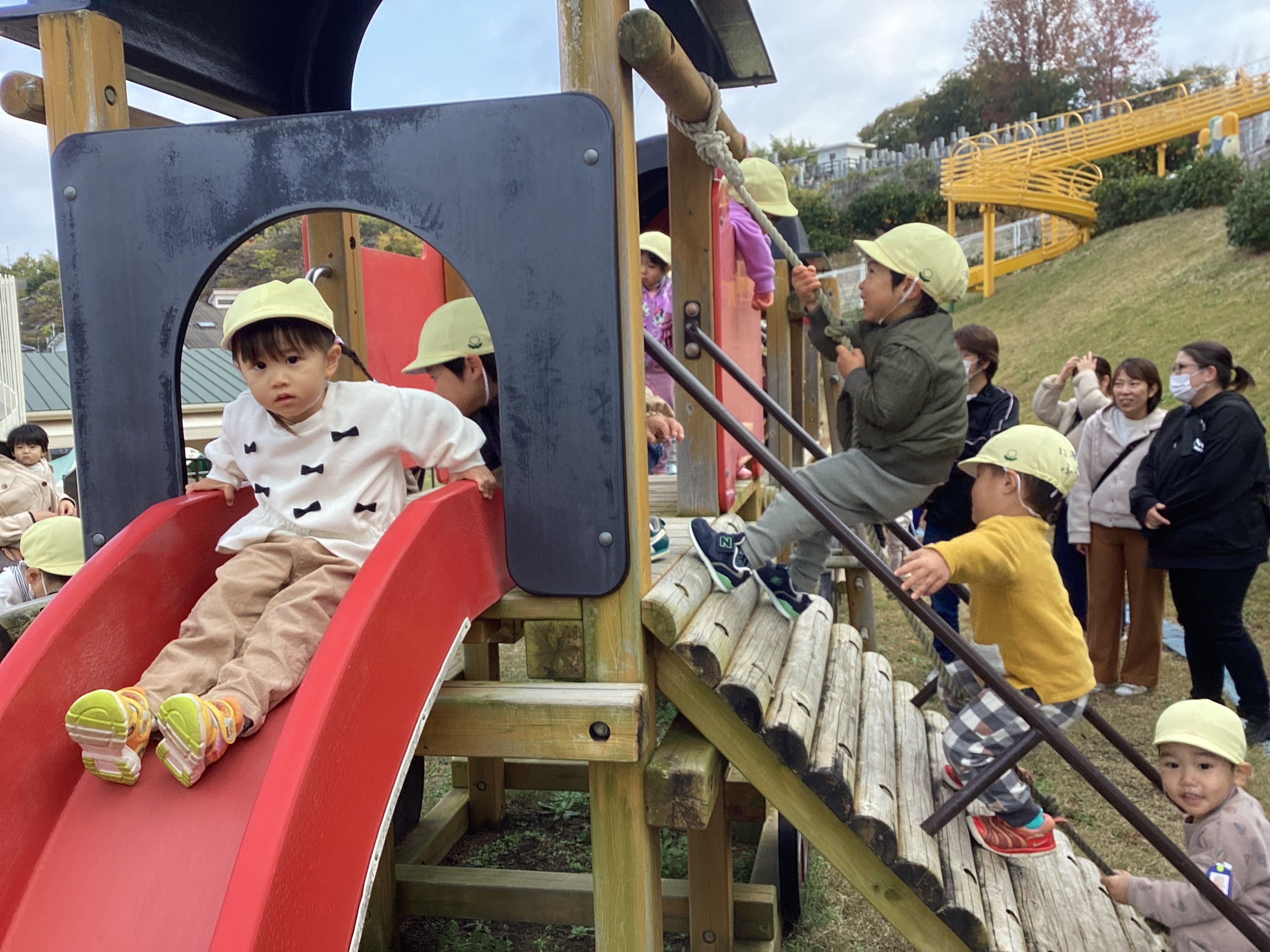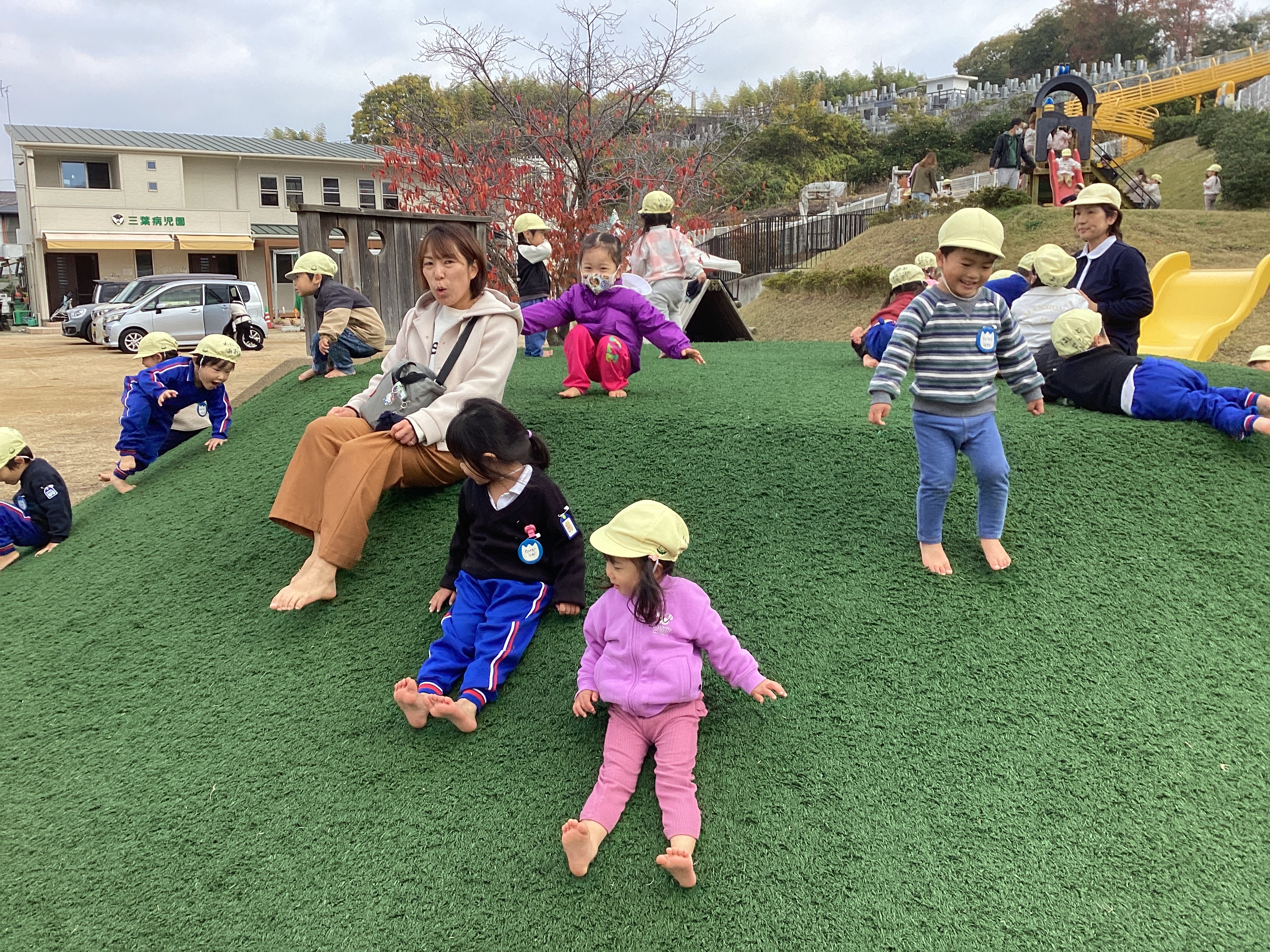 さんさんらんどに到着すると、それぞれ大型遊具や築山に分かれて遊びました。しばらく遊んだあとたんぽぽ青組は、皆でローラー滑り台で遊ぶことにしました。青組の子どもたち集まるように声をかけていくと「先生どこ行くん?」「あっ、Aちゃん長い滑り台に行くんやない!!」とニコニコ笑顔で集まってきまた。滑り台に行くことを聞くと駆け足で坂や階段を上がったり、保護者の手を引っ張って早く滑ろうとしていました。滑り台に着くと次々に滑り始める子どもたち、Mちゃんは頂上に着くと手を繋いでいたお母さんの手を振り放して、友だちの後に行き一緒に走って滑っていました。築山では保護者と子どもたちがおいかけっこや、一緒に滑るなどをして楽しんでいる様子もありました。
