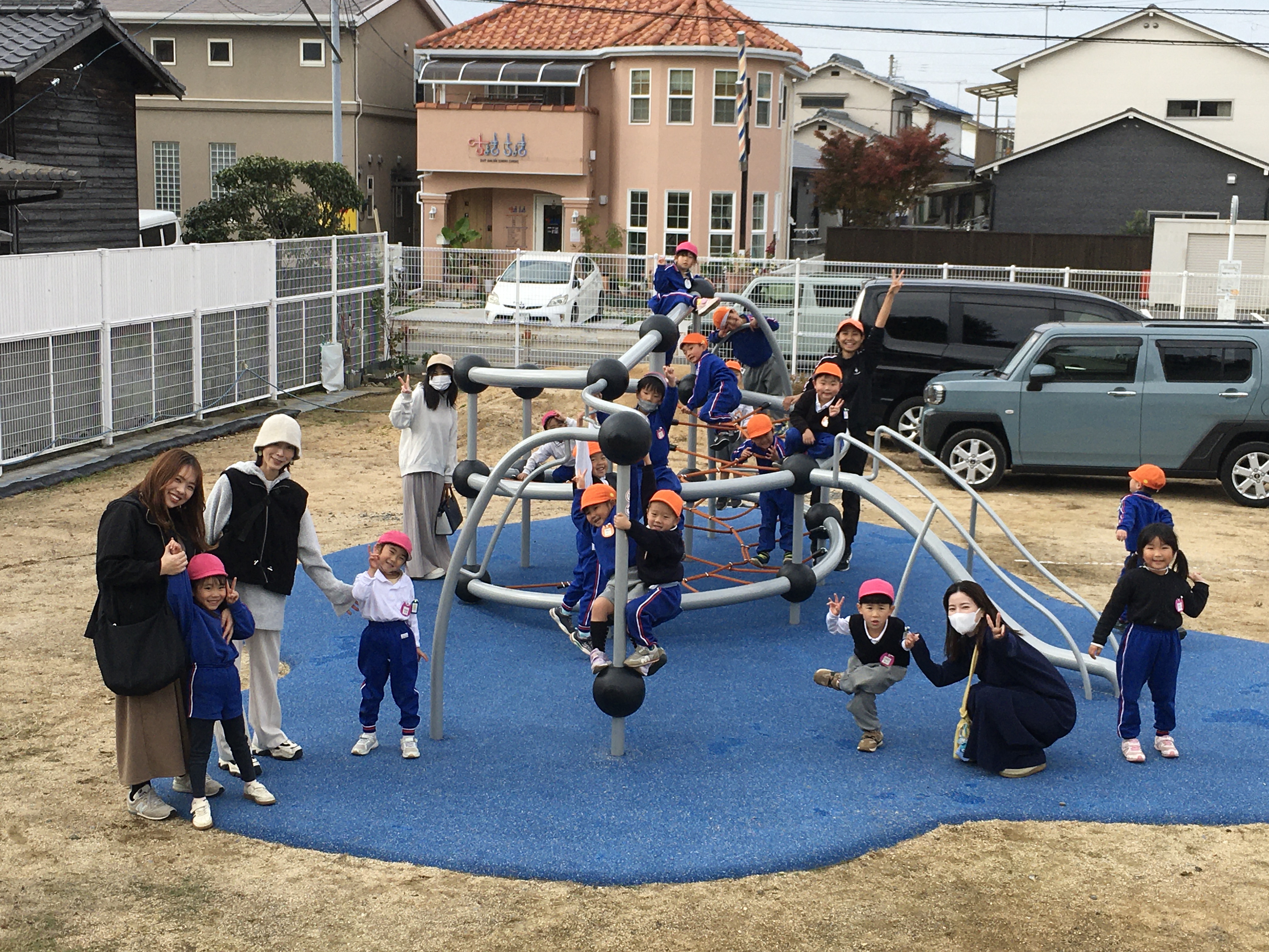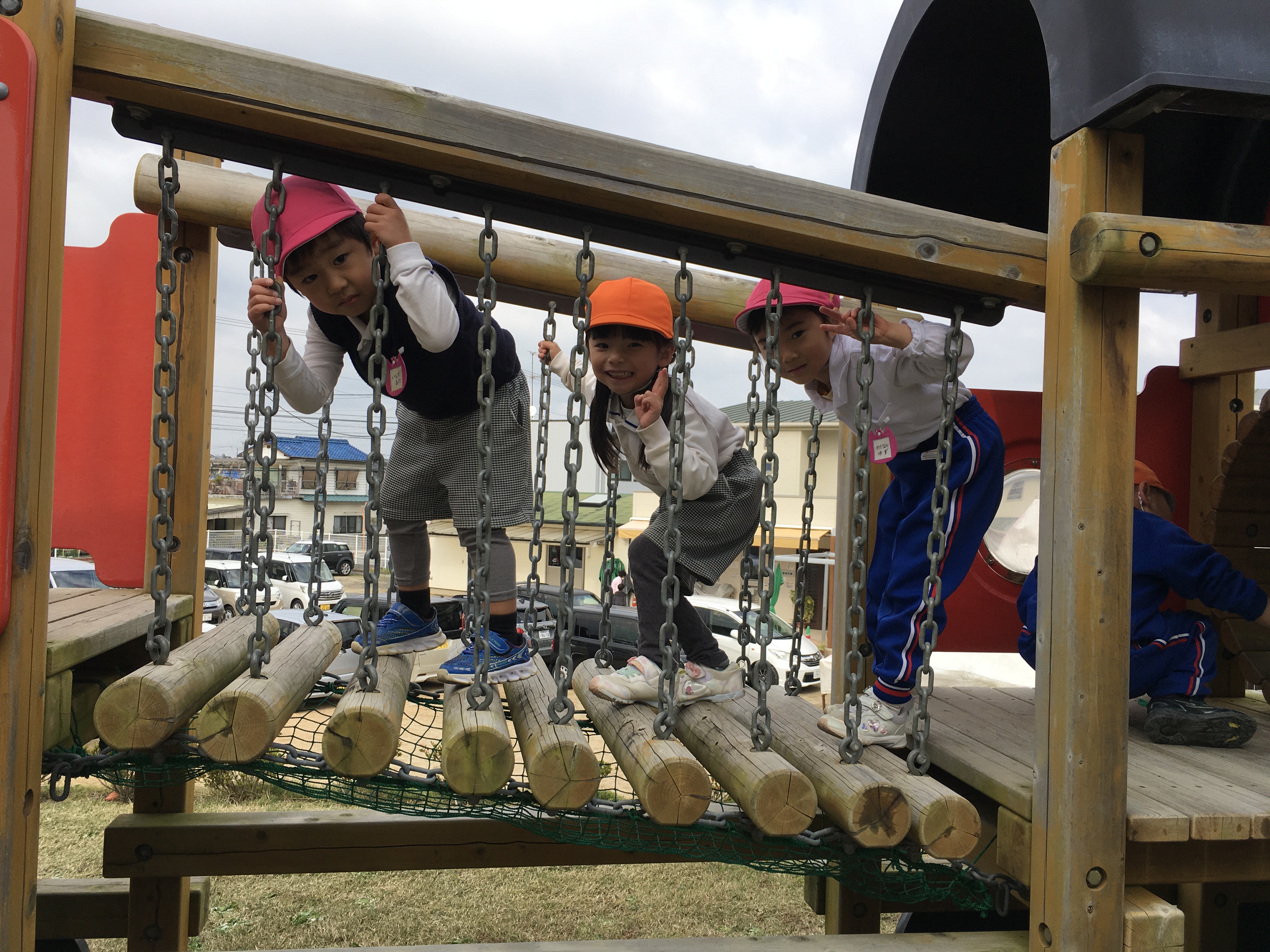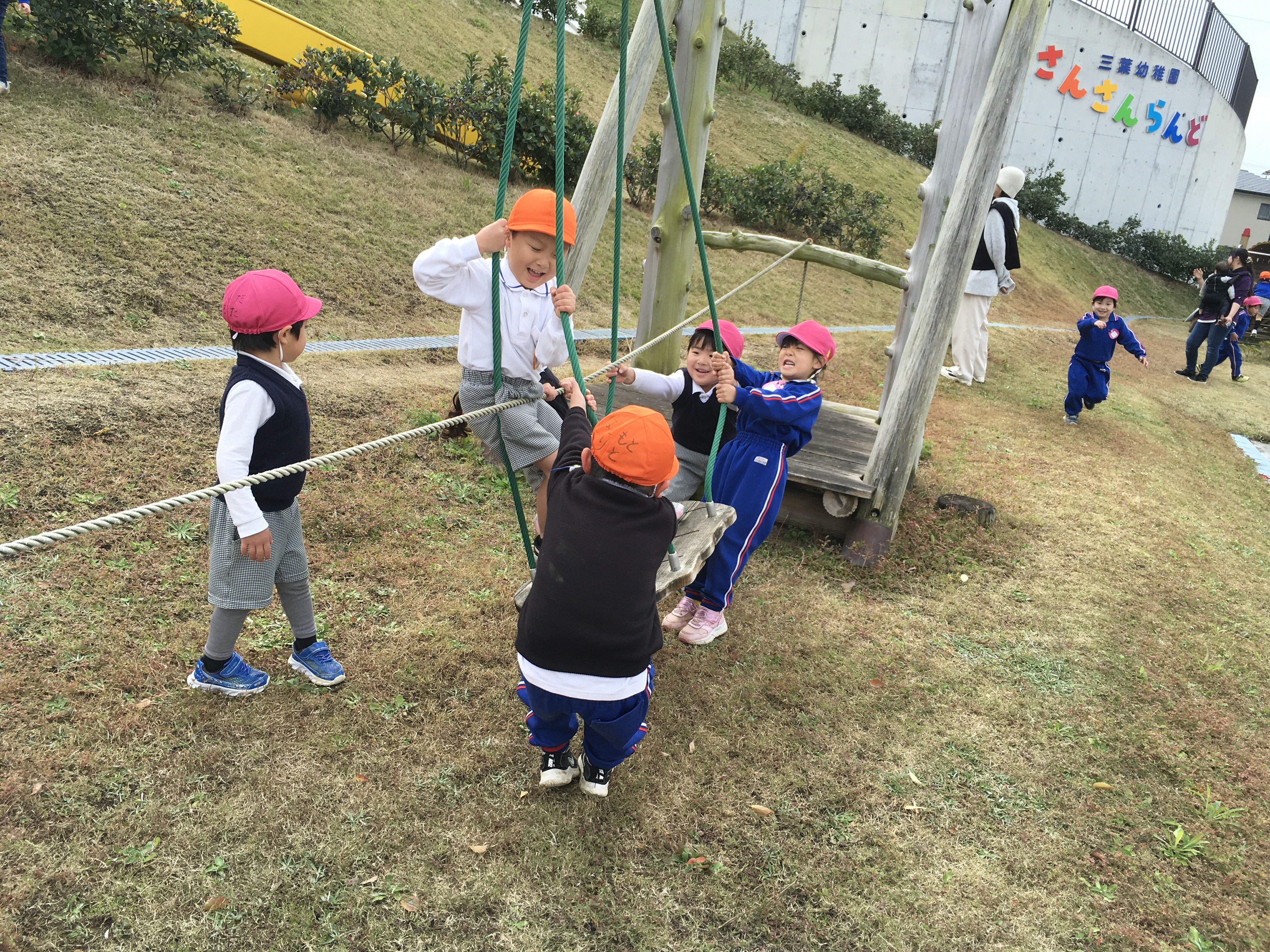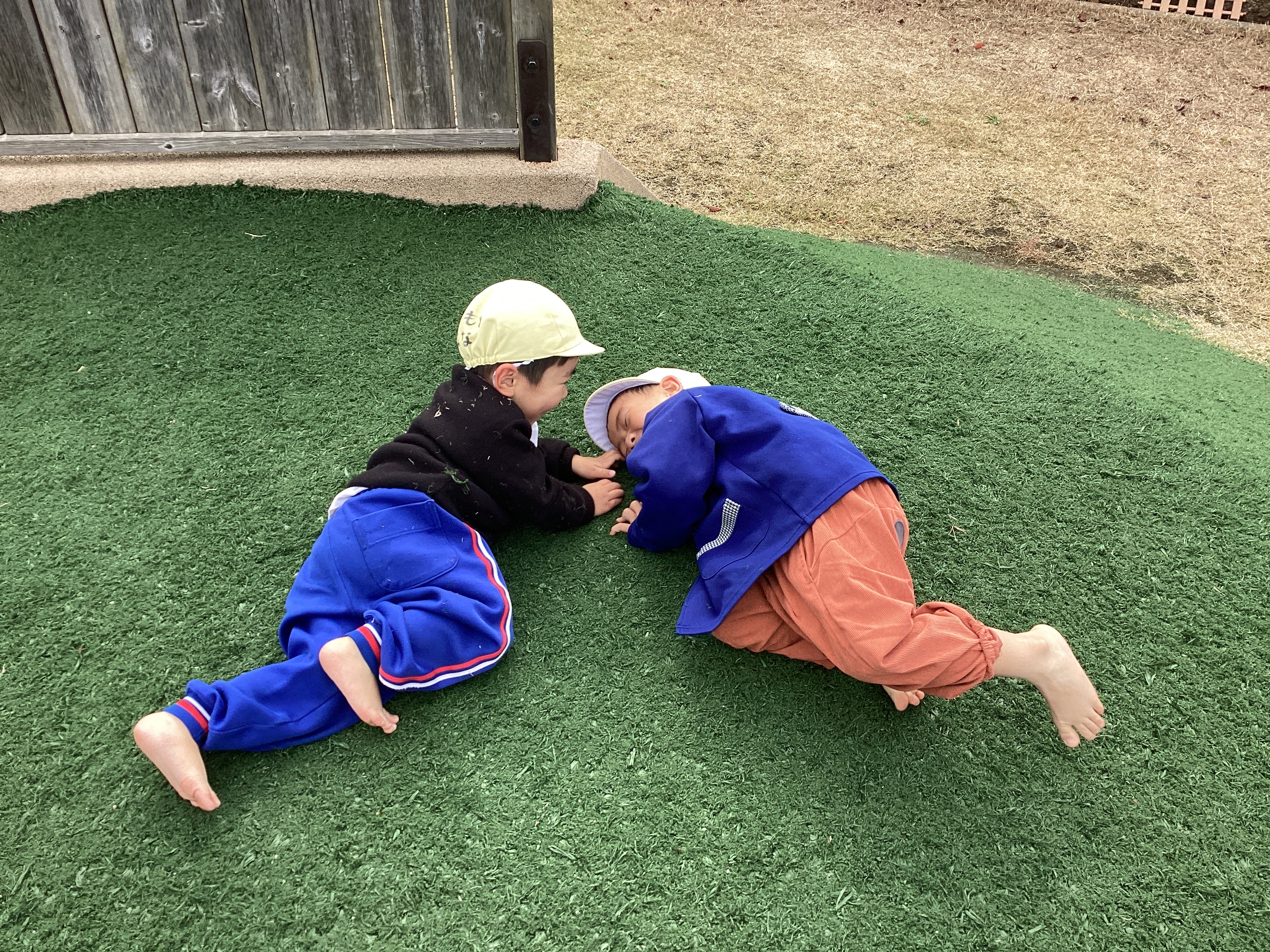 さんさんらんどに到着すると、それぞれ大型遊具や築山に分かれて遊びました。しばらく遊んだあとたんぽぽ青組は、皆でローラー滑り台で遊ぶことにしました。青組の子どもたち集まるように声をかけていくと「先生どこ行くん?」「あっ、Aちゃん長い滑り台に行くんやない!!」とニコニコ笑顔で集まってきまた。滑り台に行くことを聞くと駆け足で坂や階段を上がったり、保護者の手を引っ張って早く滑ろうとしていました。滑り台に着くと次々に滑り始める子どもたち、Mちゃんは頂上に着くと手を繋いでいたお母さんの手を振り放して、友だちの後に行き一緒に走って滑っていました。築山では保護者と子どもたちがおいかけっこや、一緒に滑るなどをして楽しんでいる様子もありました。