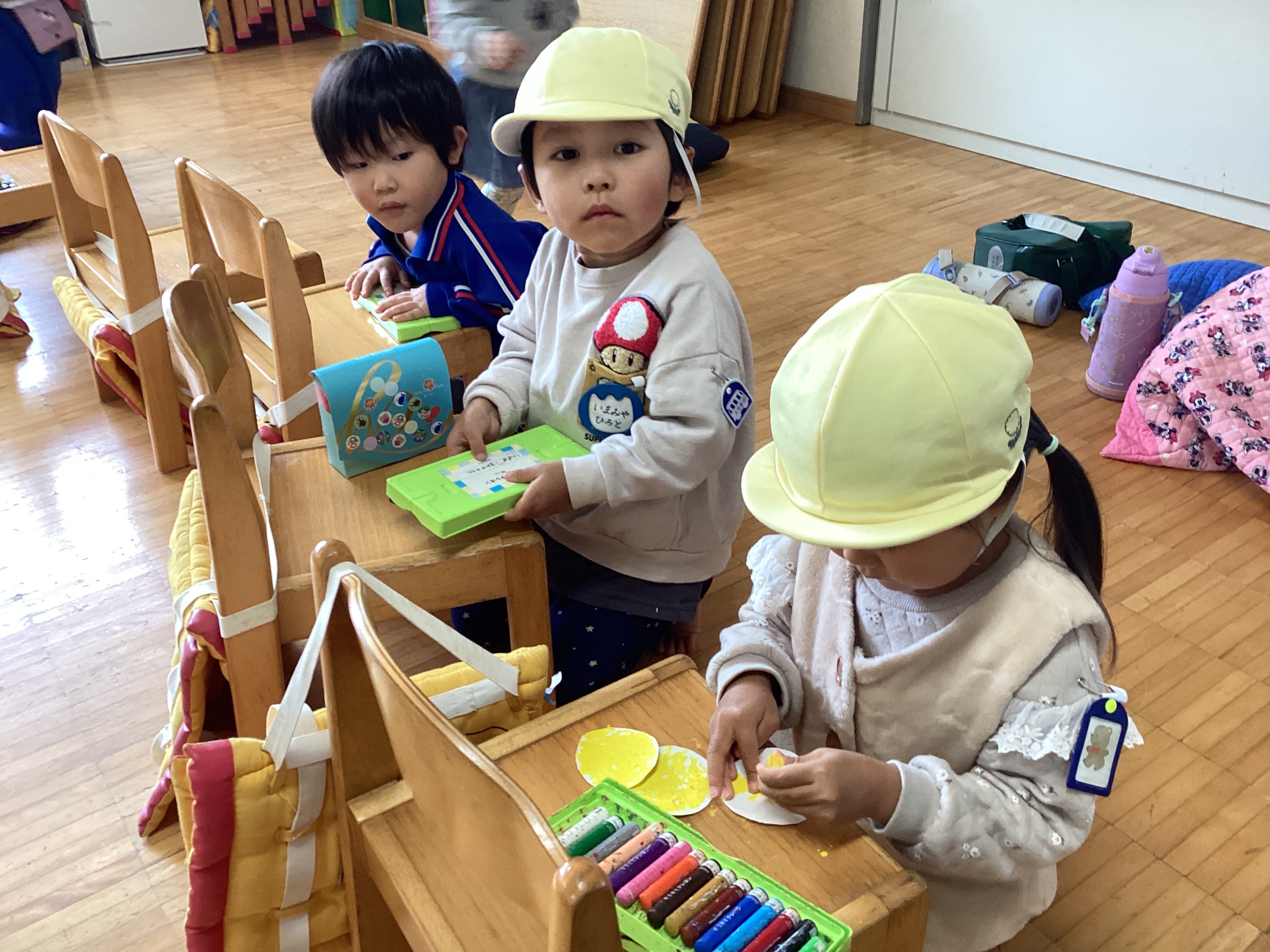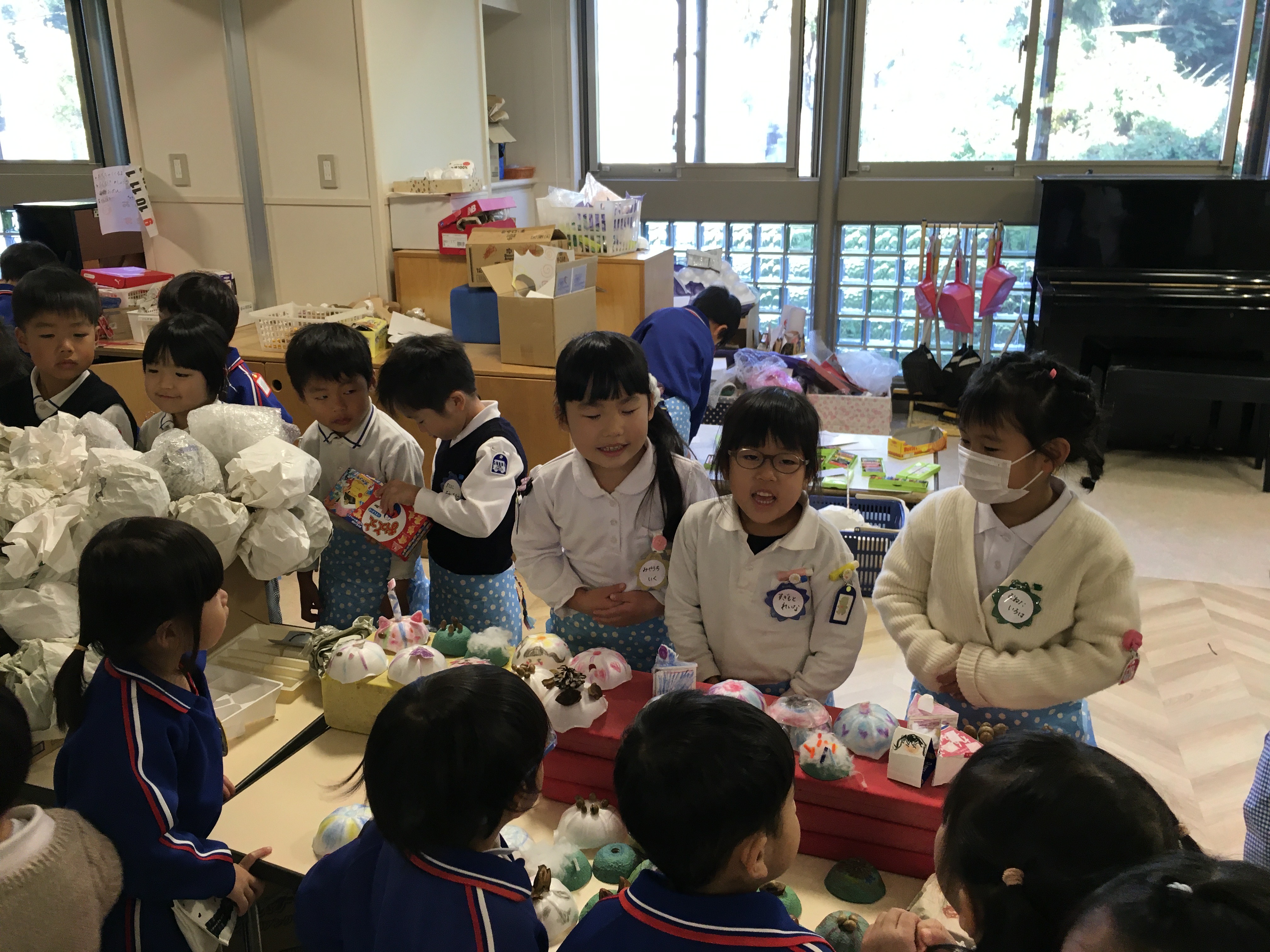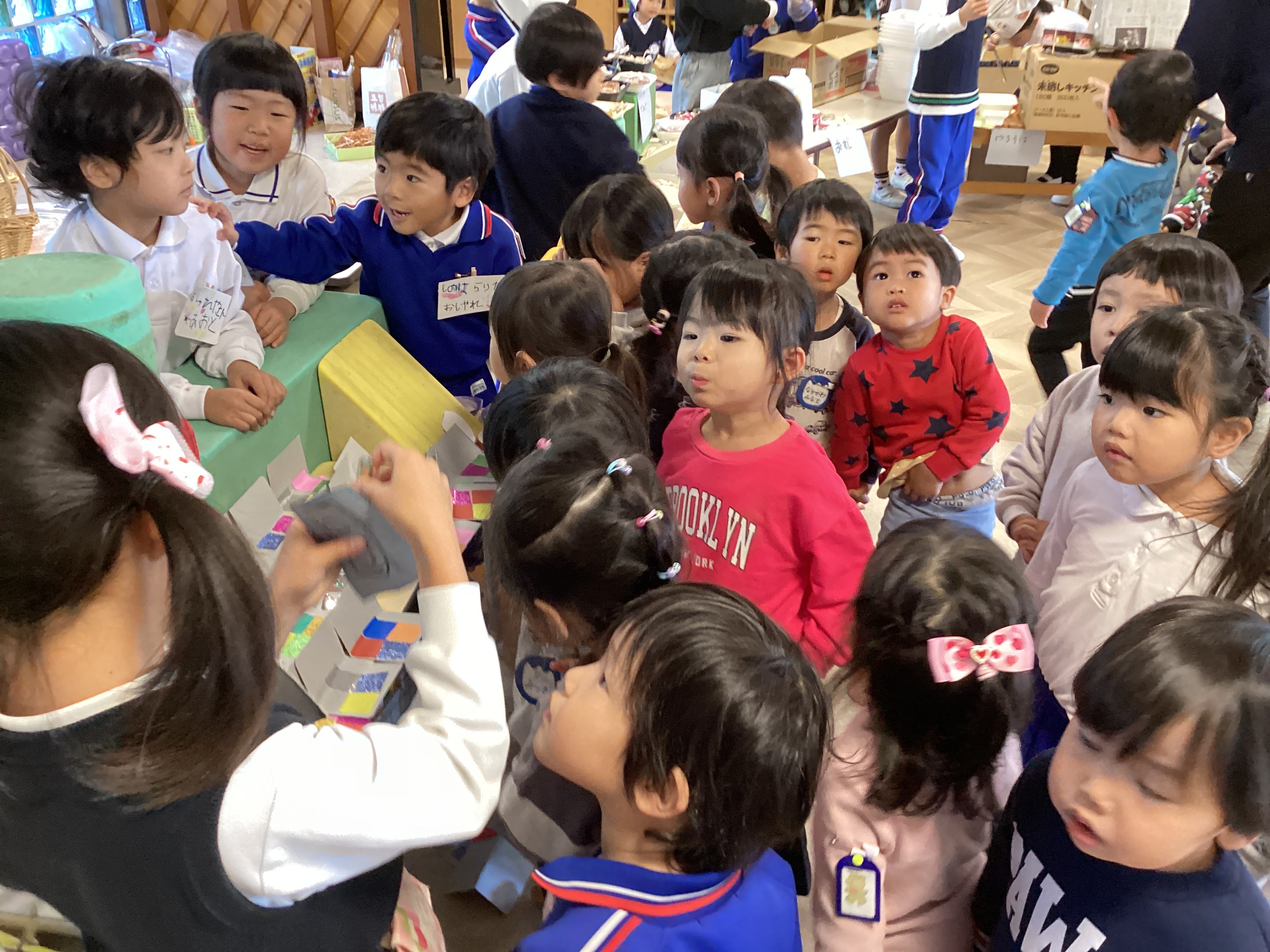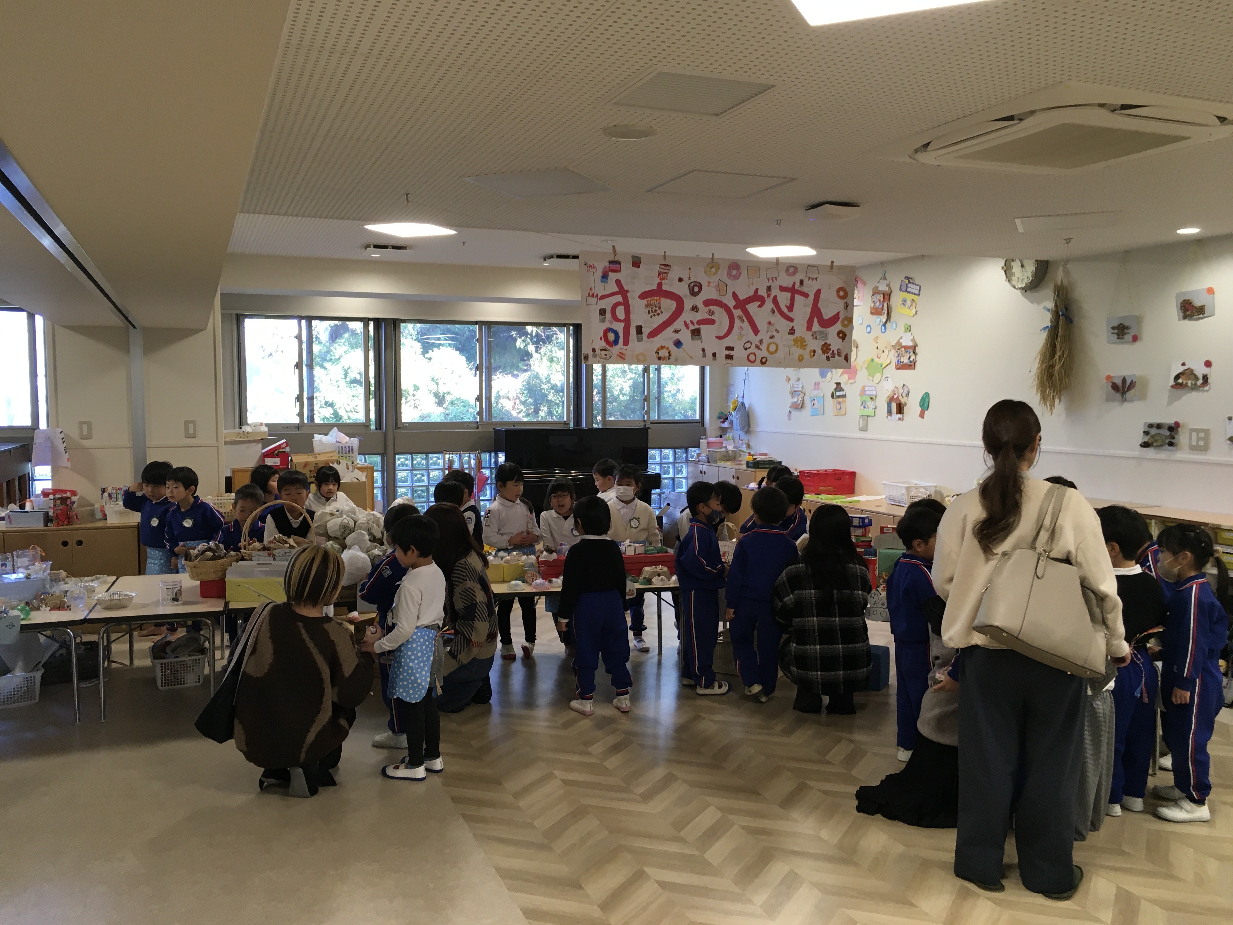 園庭の片付けが終わる頃、年長児からお知らせのアナウンスが流れました。先週から準備を始めていた『年長さんのお店』がプレオープンするとの事で、子どもや参観に来られていた保護者は、そのアナウンスに耳を傾けました。プレオープンは大人だけ買い物ができるとの事。プレ年少、年少、年中の子ども達は見学のみできるので各クラス見学の予約をして下さいとの事でした。すると、古森先生から「見学って?予約ってどういう意味ですか?」との質問がありました。その質問に年長児が「見学は見に来ていいよって事です。」「予約は来る時間を約束する事です。」とわかりやすく答えてくれました。私達教師は、「はい。」と返事をしたものの、子どもの立場からすると確かに意味のわからない言葉です。古森先生のとっさの質問で小さい子どもにも理解する事ができたようで、部屋に戻る途中、お店やさん前に貼っていた予約表に早速予約をしました。あのまま流していたら子どもにとって意味がなく、教師目線で進めてしまうところだったと反省し、学ぶ事ができました。予約時間までお部屋でいくつか約束事を話し合い、ワクワク、ドキドキしながら、お店やさんに入りました。すると、「いらっしゃいませ!!」と元気な掛け声が響き、子ども達は圧倒されながらも色々な商品に目が釘付けです。『おしゃれションプクローバー』では、リップを欲しがっていたKちゃんが、お姉ちゃんの参観に来て買い物をしていたお母さんにリップを買ってもらっていました。すると、それを見ていたR君は一緒に見学に回っていた自分のお母さんに「買って。」と、こっそりおねだり。お店やさんの案内で、『みつばぎんこう』でお金を受け取り買い物をしていました。部屋に戻って買い物をしたお母さん達から品物を見せてもらい話を聞くと、子ども達の期待もグンと高まり、給食を終えた子から、次々とバックや財布作りが始まりました。「リップが買いたいけどお金がわからん。」と困っていたIちゃんは、お店やさんに聞きに行き、1000円だとわかると、「〇が何個?」と教師に尋ねながらお金を作っていました。すぐにでも買い物に行きたい気持ちをグッとこらえ、「いつ買えるん?」と心待ちにしています。『年長さんのお店』のオープン、みんなで待ってま~す♪