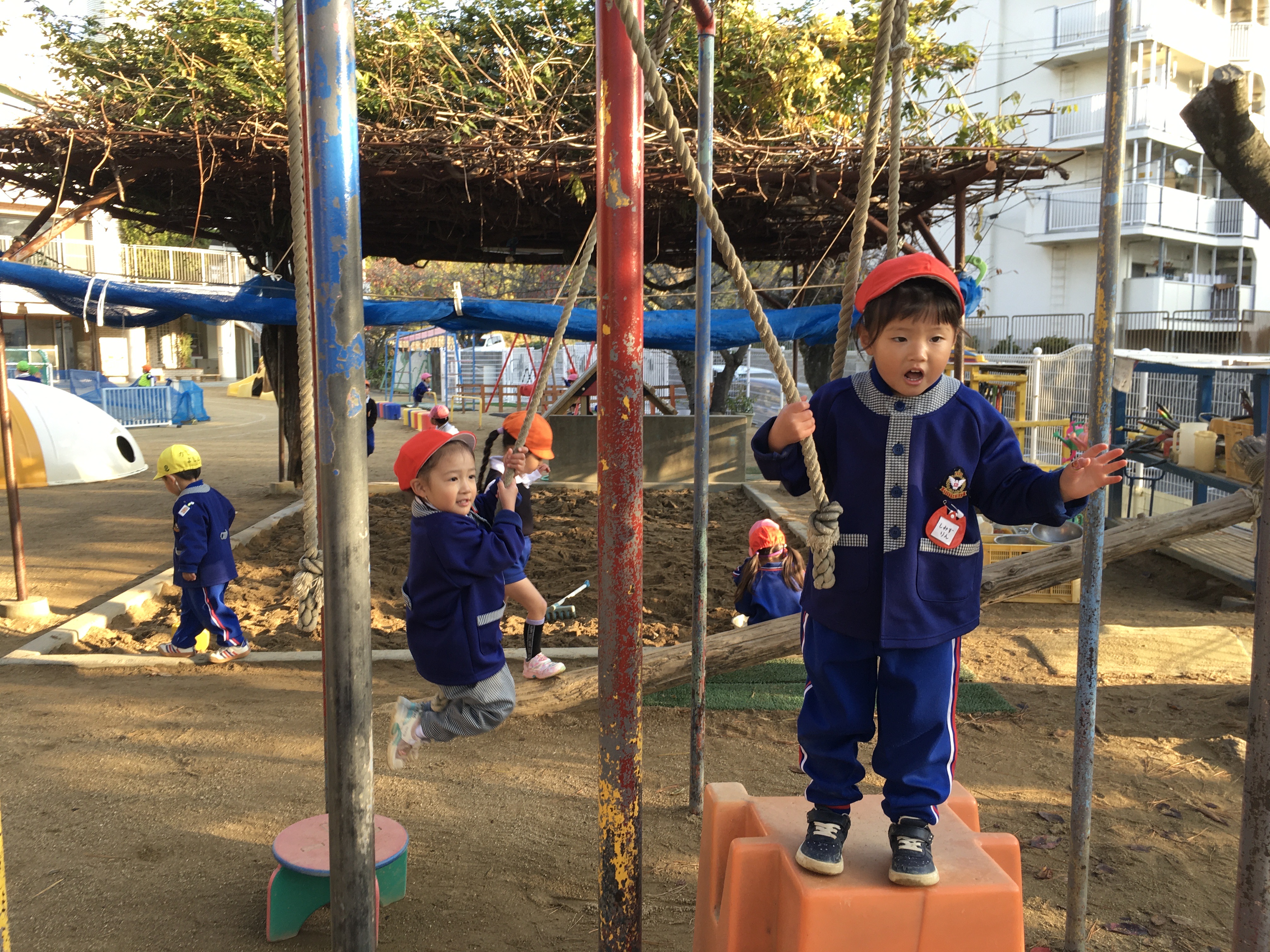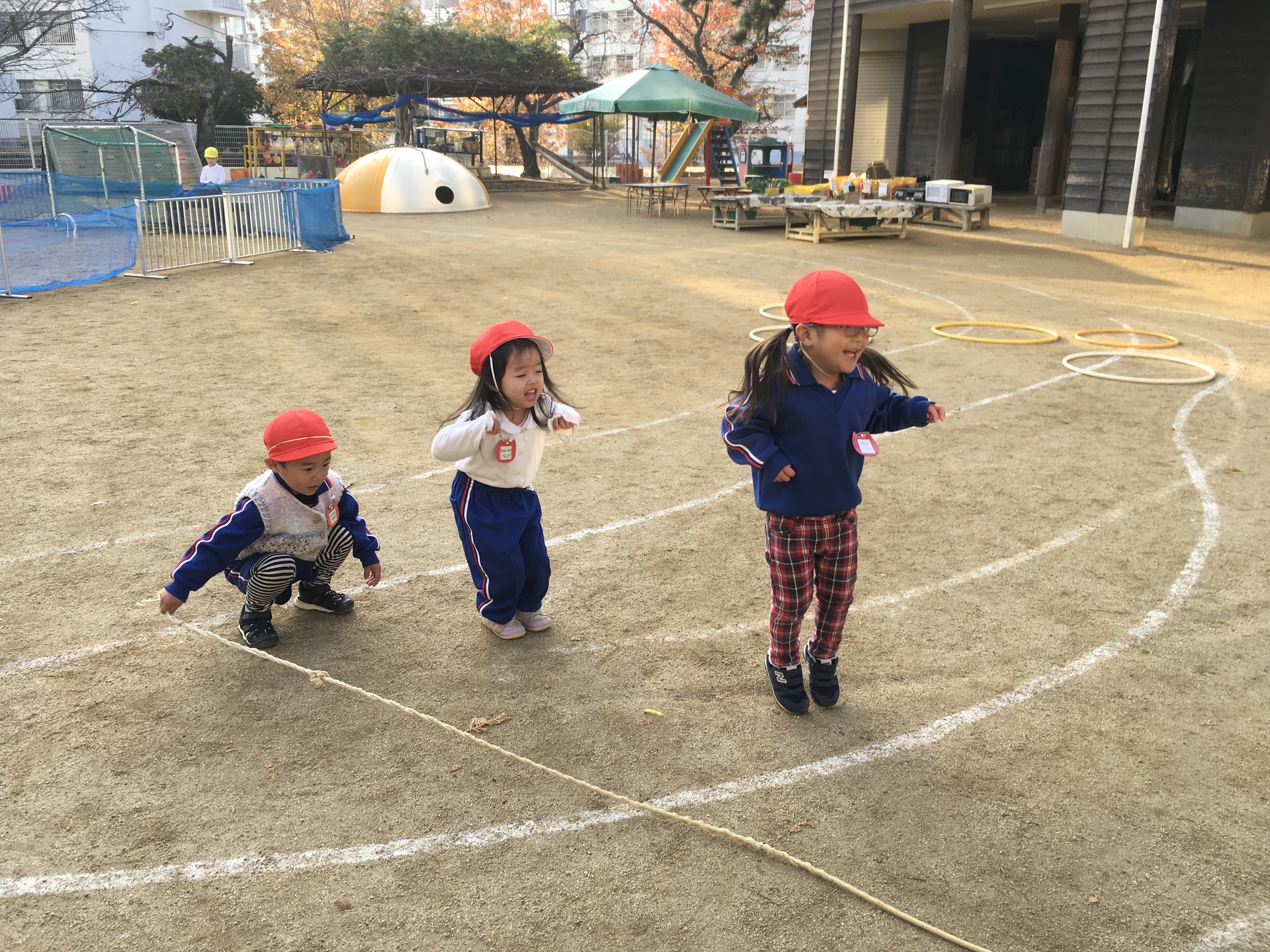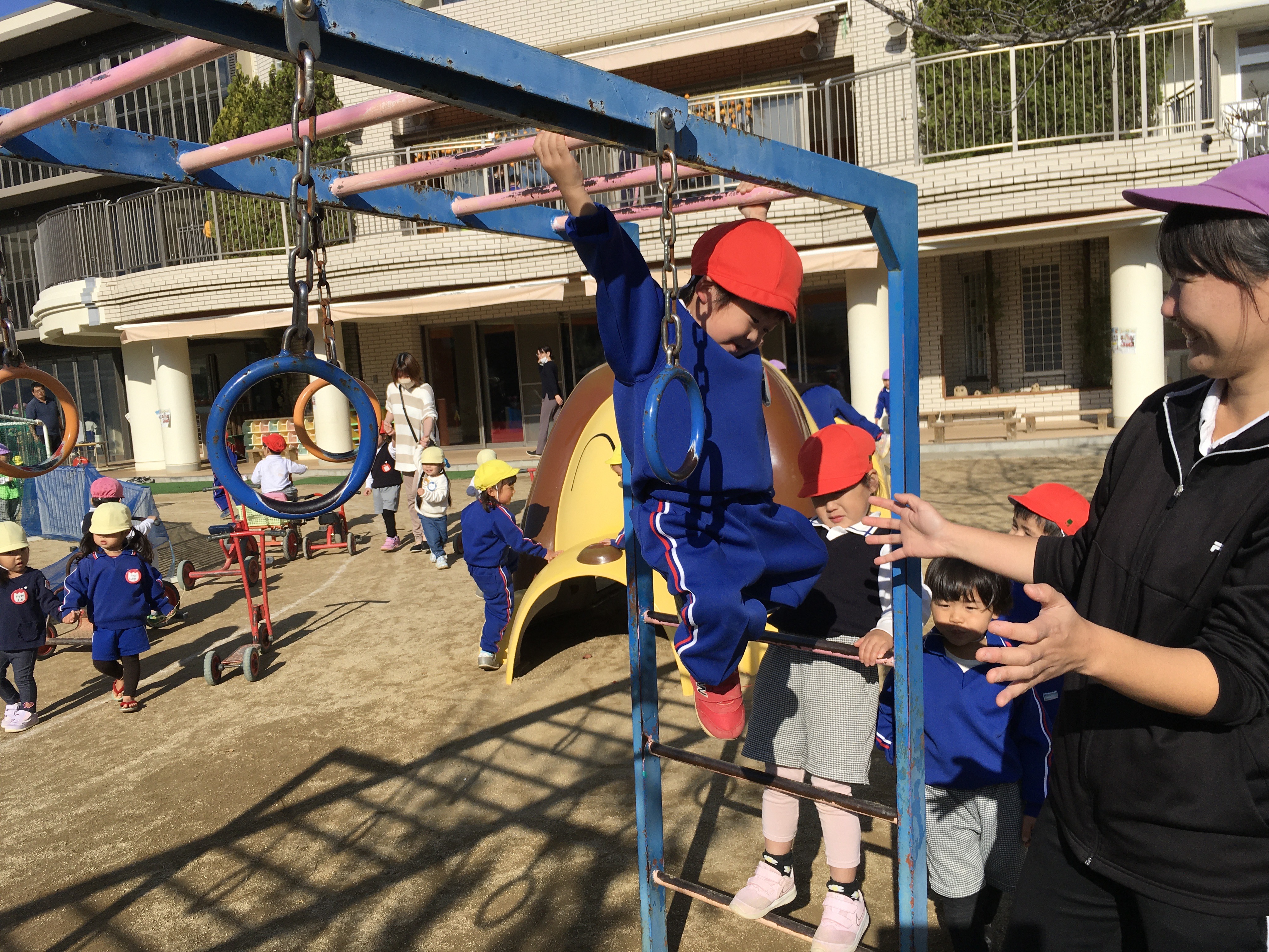気温が低く寒い朝でしたが日差しが強まるにつれ温かく雲一つない晴天に恵まれた一日となりました。早くから登園したこども達はまだ誰もいない園庭に飛びだすとフラフープの輪投げや長縄跳びを始め、中央のサッカーコートでは、次々と子ども達が集まりかっこよくビブスを着てボールを追いかけ、寒さに負けず元気いっぱい身体を動かして遊んでいました。最近、年少児達はつりかんや太鼓橋、鉄棒など色々な固定遊具に挑戦する姿が見られるようになりました。園庭の隅にあるのぼり棒の所ではちゅうりっぷ組のMちゃんが上からぶら下がっているロープを掴み、足に挟んで上手に揺れていました。すると、その近くでRちゃんが「できん」と一言。それを聞いたひつじ組のTちゃんがお手本を見せてくれてみんな憧れの眼差しでじっと見ている姿が何とも微笑ましいかったです。園庭では異年齢児達が入り交じって遊んでいます。沢山の刺激を受けて影響し合いながら遊んでいる子ども達を見て楽しみながら挑戦できる環境作りをしていくことの大切さを感じています。