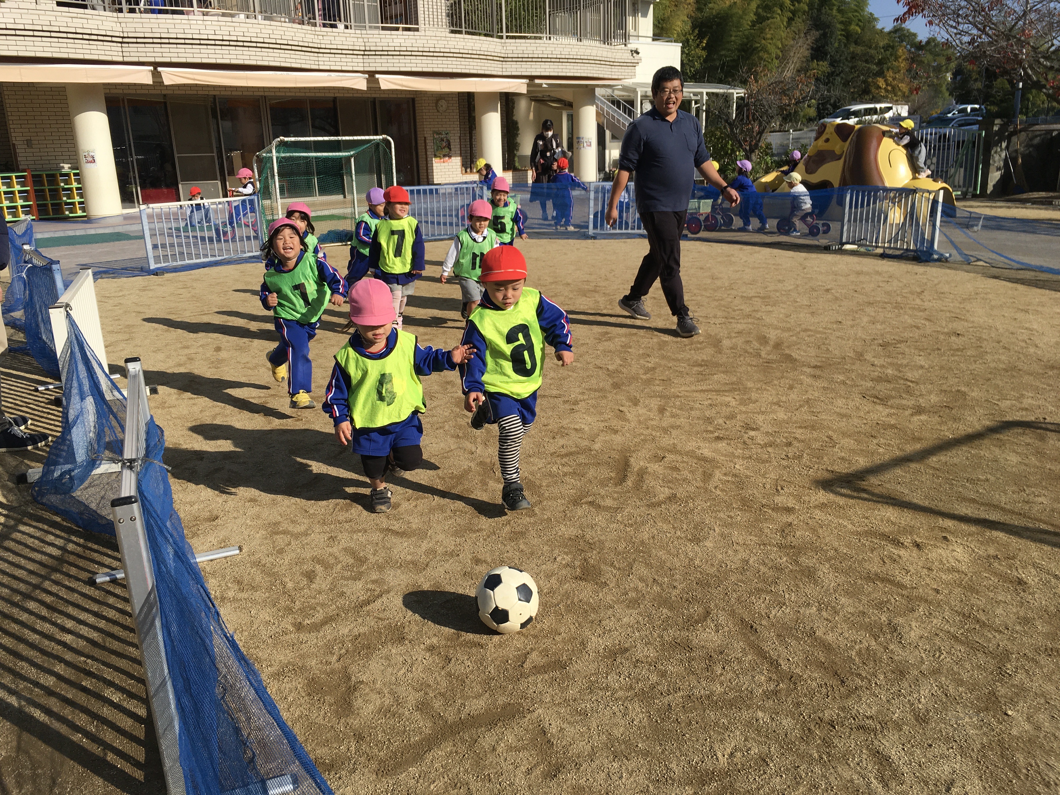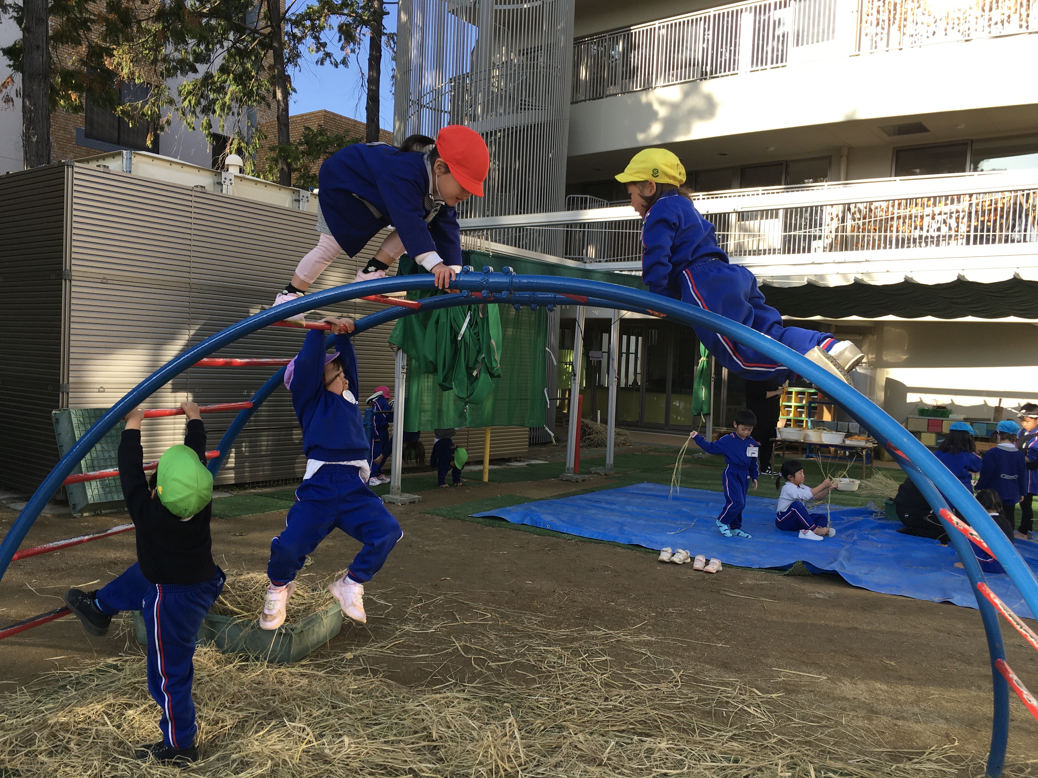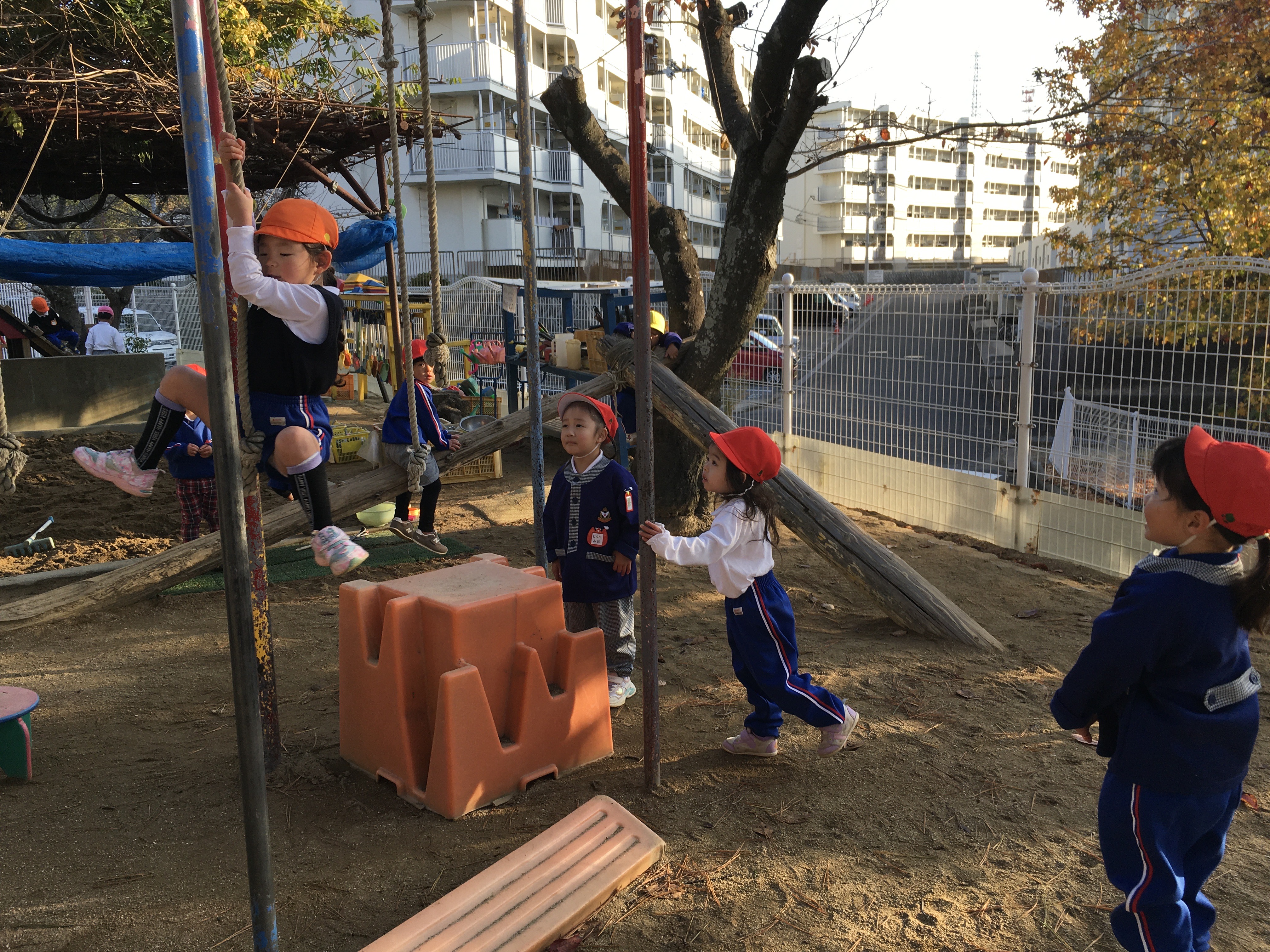 気温が低く寒い朝でしたが日差しが強まるにつれ温かく雲一つない晴天に恵まれた一日となりました。早くから登園したこども達はまだ誰もいない園庭に飛びだすとフラフープの輪投げや長縄跳びを始め、中央のサッカーコートでは、次々と子ども達が集まりかっこよくビブスを着てボールを追いかけ、寒さに負けず元気いっぱい身体を動かして遊んでいました。最近、年少児達はつりかんや太鼓橋、鉄棒など色々な固定遊具に挑戦する姿が見られるようになりました。園庭の隅にあるのぼり棒の所ではちゅうりっぷ組のMちゃんが上からぶら下がっているロープを掴み、足に挟んで上手に揺れていました。すると、その近くでRちゃんが「できん」と一言。それを聞いたひつじ組のTちゃんがお手本を見せてくれてみんな憧れの眼差しでじっと見ている姿が何とも微笑ましいかったです。園庭では異年齢児達が入り交じって遊んでいます。沢山の刺激を受けて影響し合いながら遊んでいる子ども達を見て楽しみながら挑戦できる環境作りをしていくことの大切さを感じています。