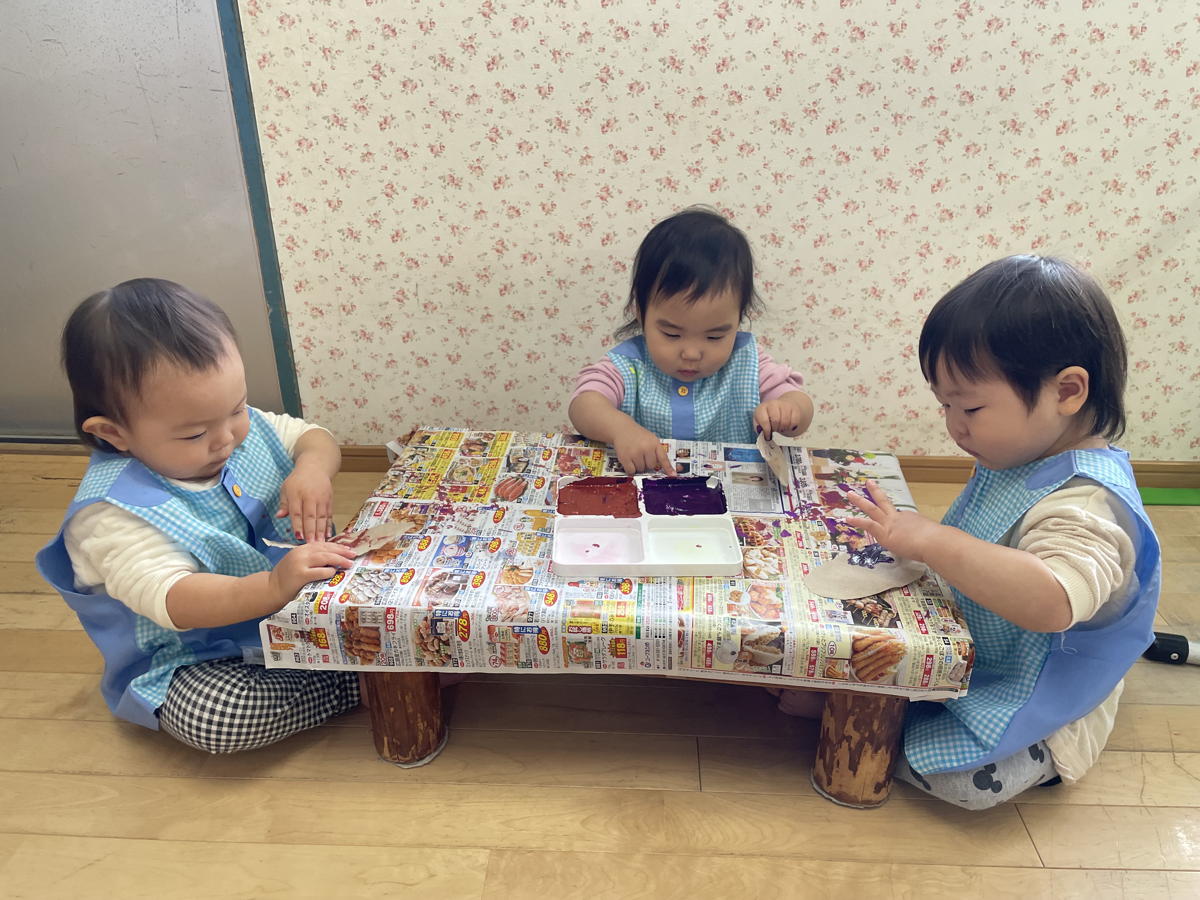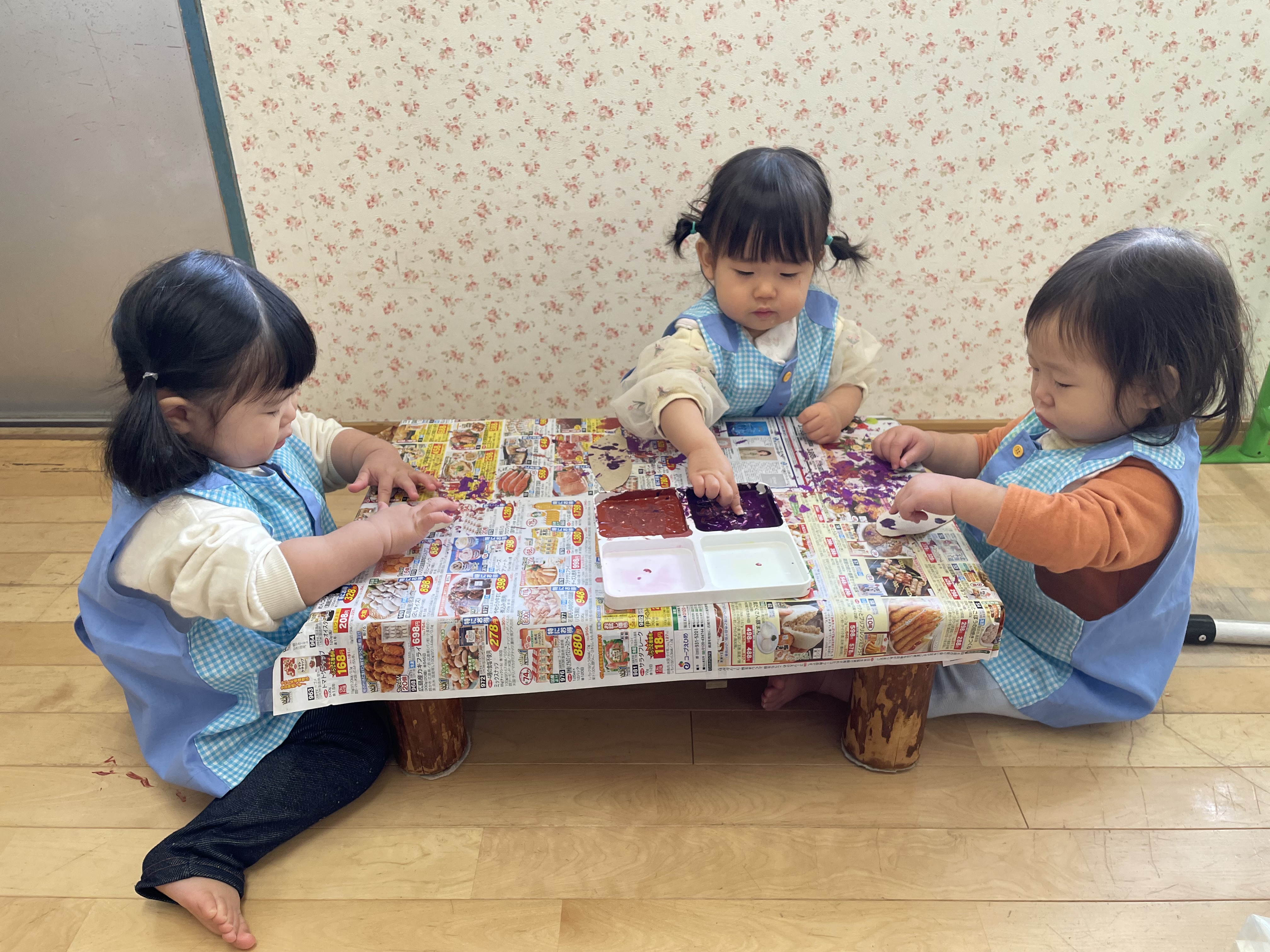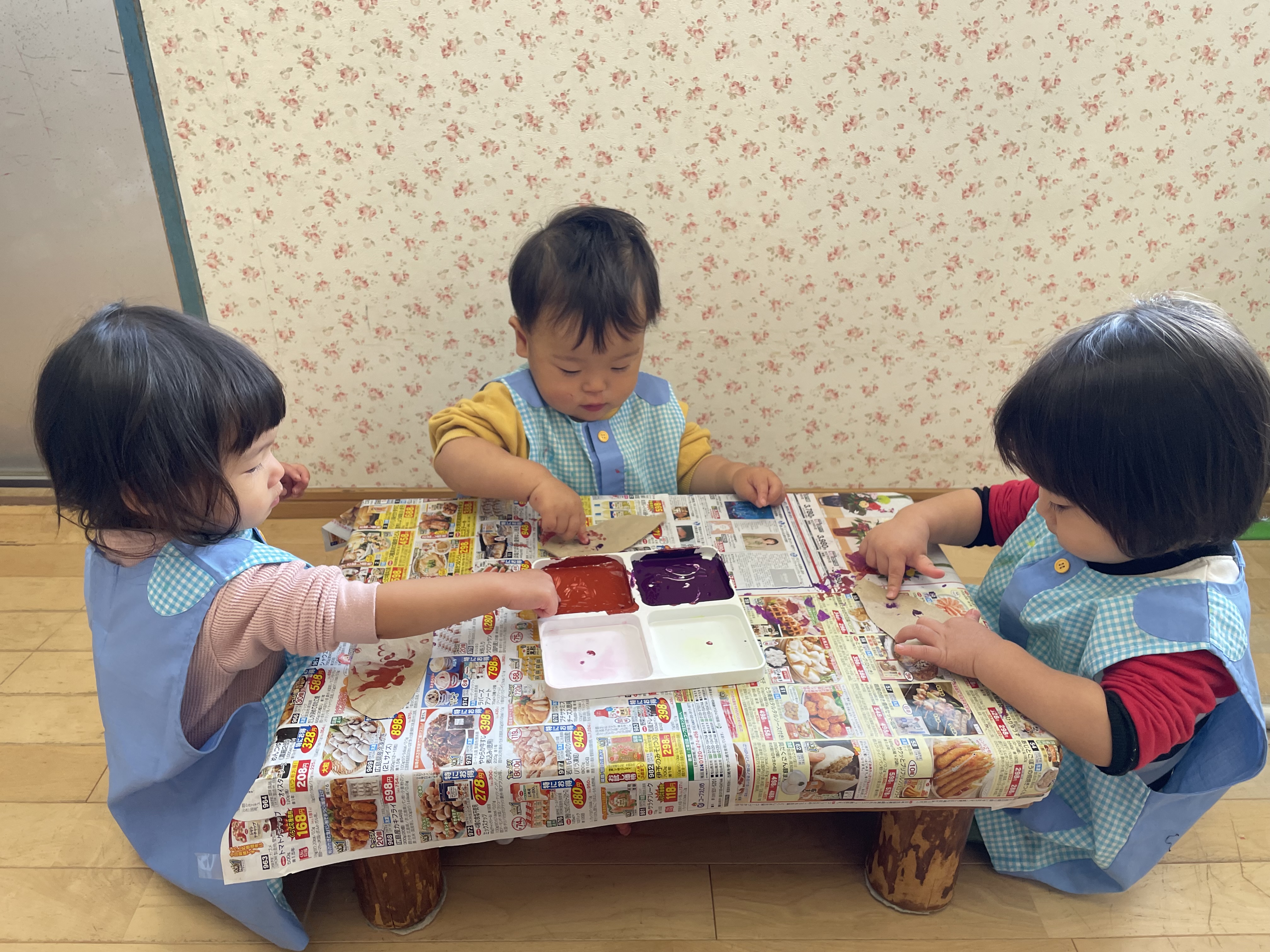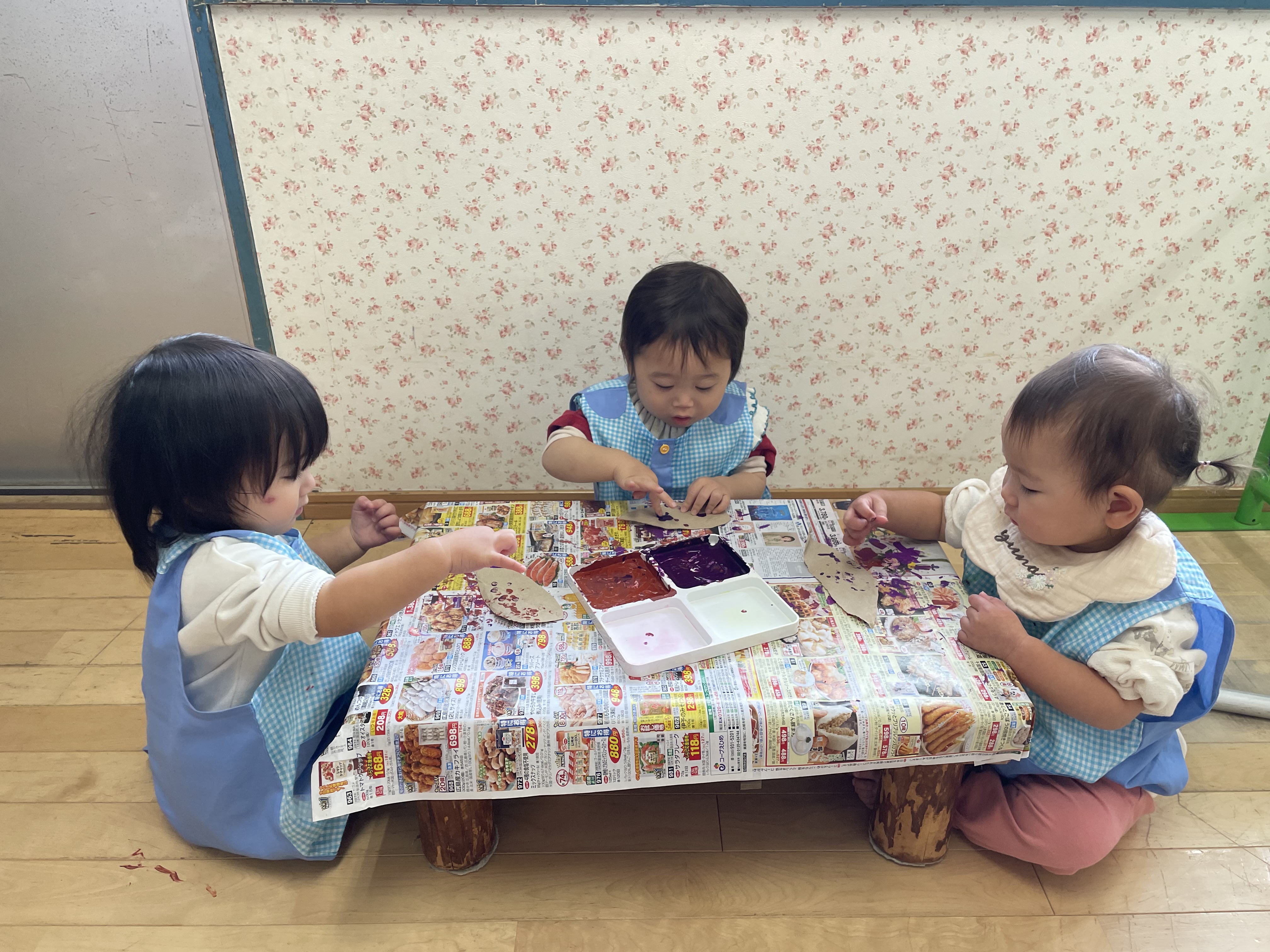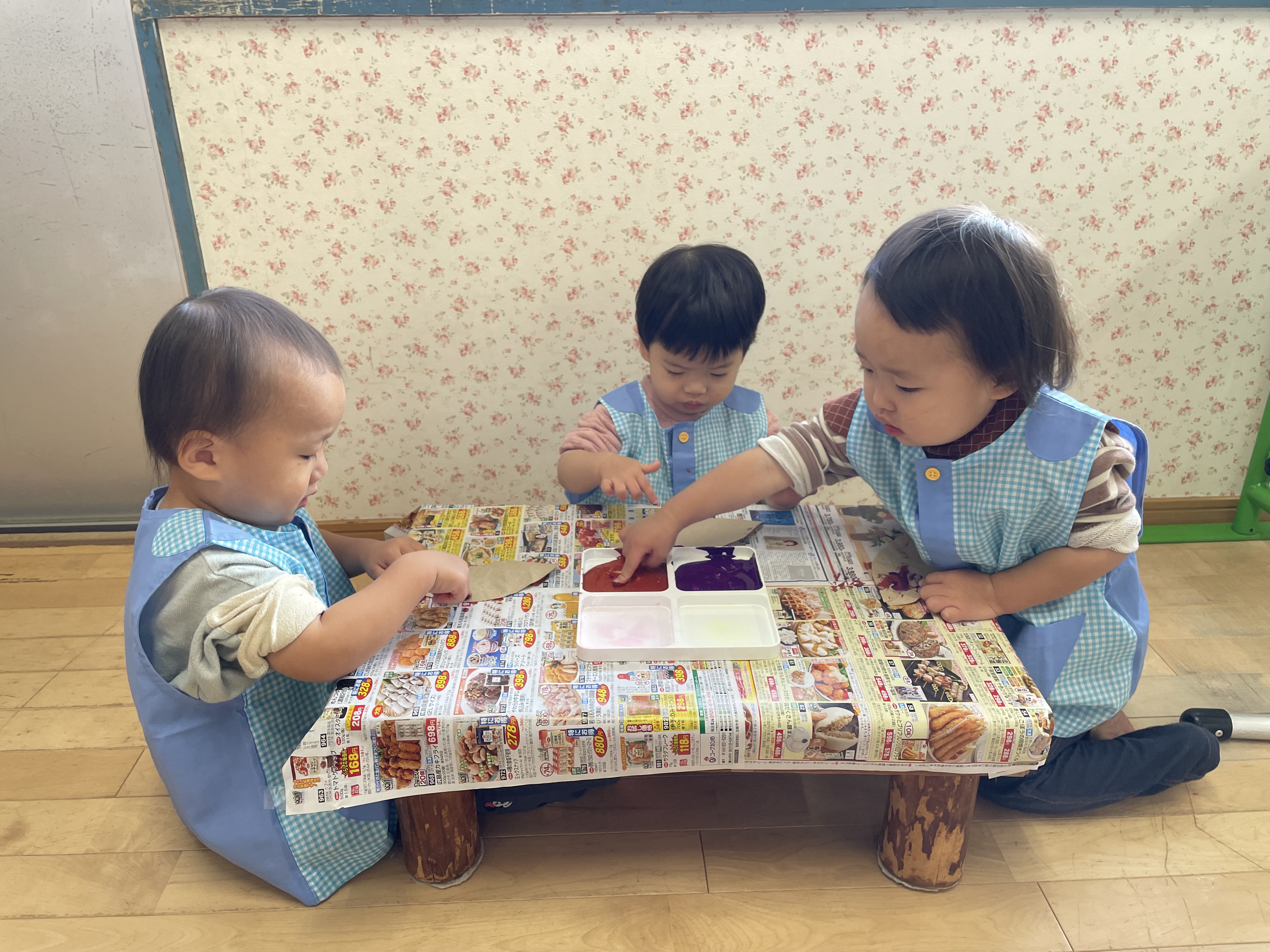 朝晩は寒くなってきましたが、子どもたちは元気いっぱい、笑顔いっぱいで毎日登園しています。いろんな事が出来るようになったもも組の子どもたちは、今自分でズボンを履く事を頑張っています。出来なくてもやろうとしている子、片足だけ入る子、おしりの部分だけが上がらない子、さまざまですが、少しずつ出来るようになっています。やろうとしている時の真剣な顔、出来た時の笑顔はとても誇らしげです。作品展の作品作りで絵の具遊びを楽しんだ子どもたちにアルバムで使用する部品に絵の具で色を付けさせる事にしました。スモックを着ると絵の具遊びに繋がるようで、絵の具コーナーに笑顔で集まって来ます。保育教諭の「ちょっとまってね~」の言葉は耳に入らない様子で、すぐ指に絵の具を付けて我先にと台紙の前に座ります。他の友達の様子を見ていて、ダイナミックにしていると同じようにダイナミックにしたり、点々を描いていると点を描いたり、色付け遊びを楽しんでいました。触る事を躊躇していた子も他の子たちが楽しそうにやっているのを見て触ってみたりと、少しずつですが周りを真似ながら一緒にする楽しさを感じる事が出来ているんだなと思います。