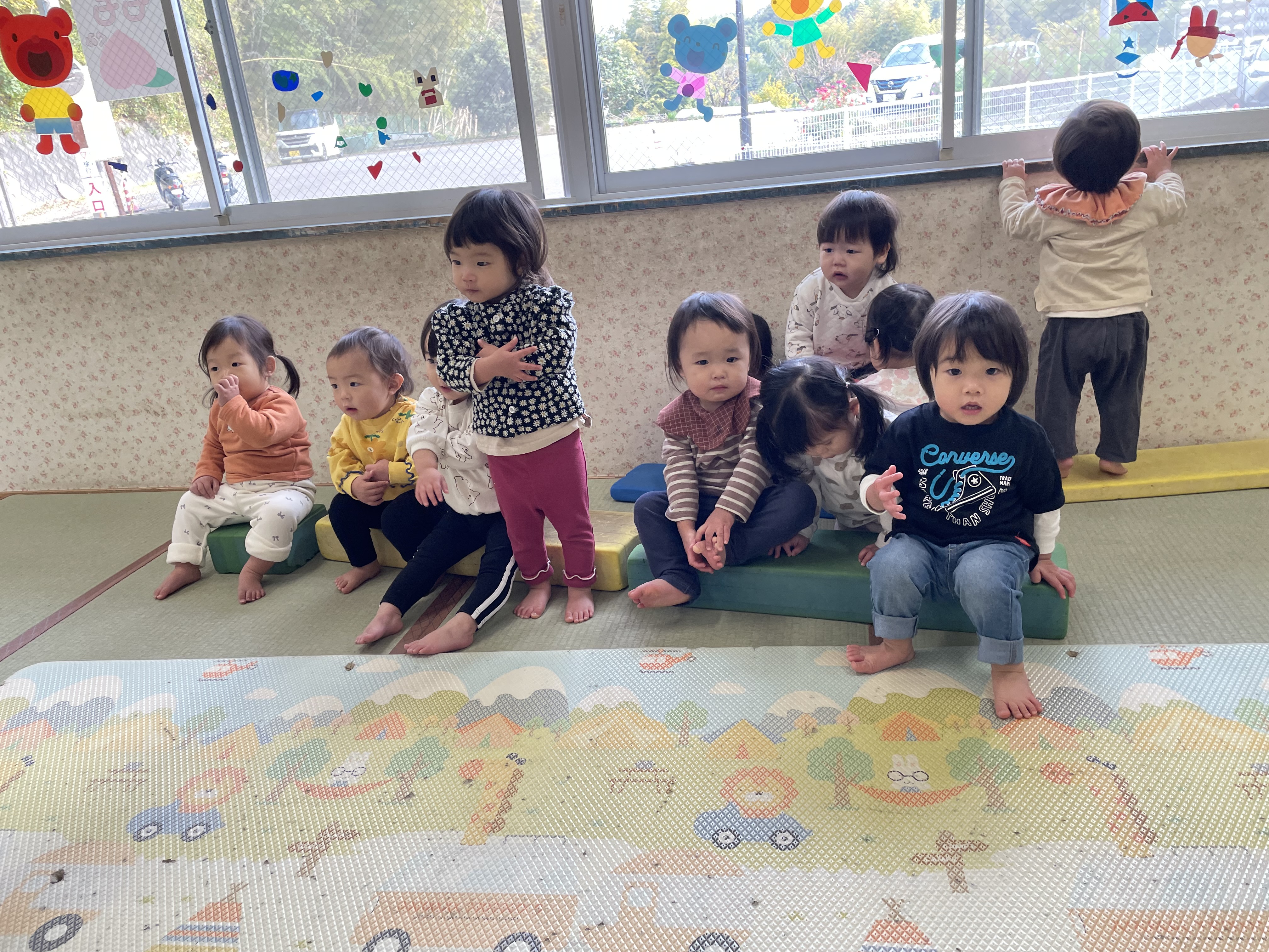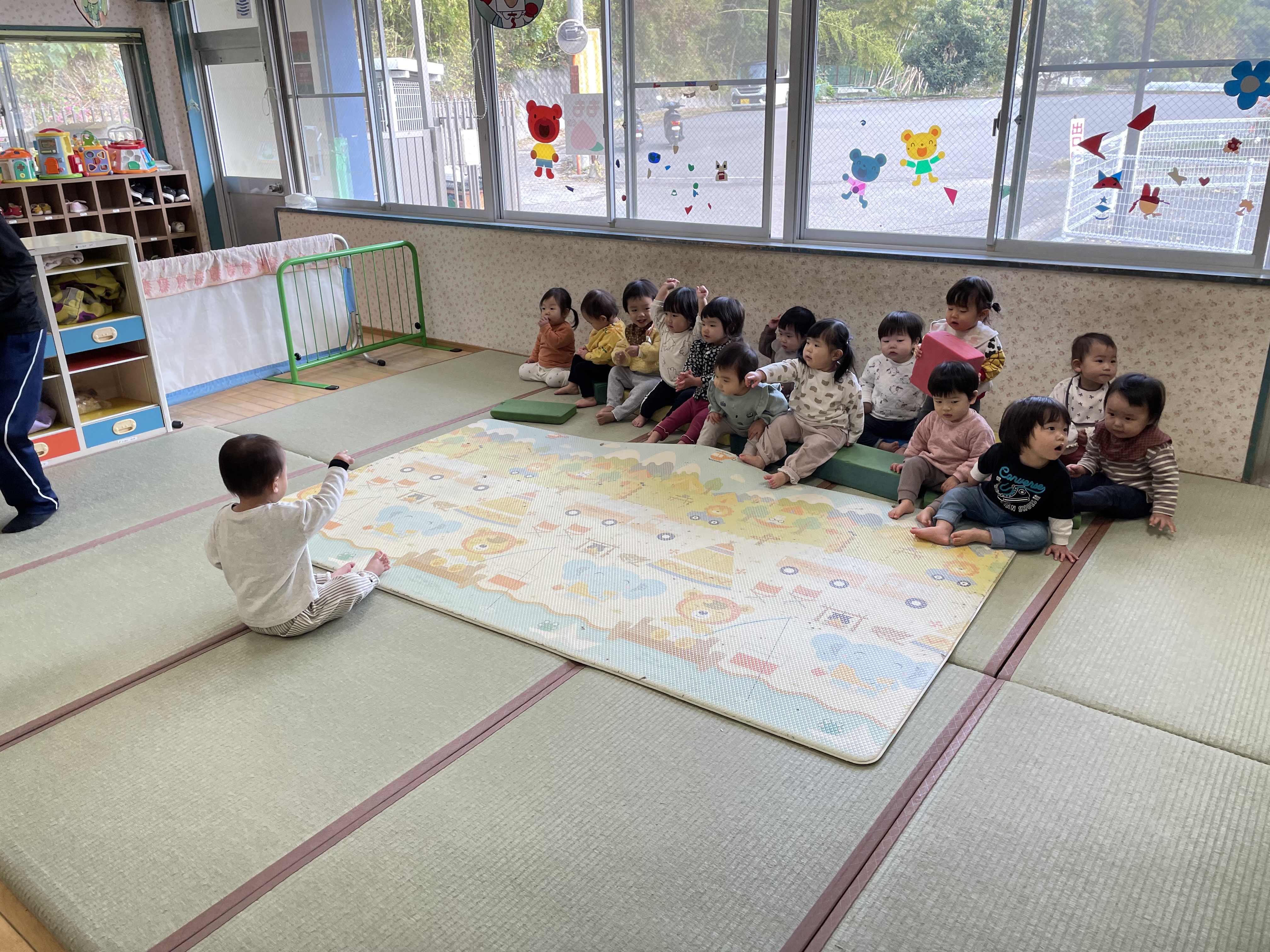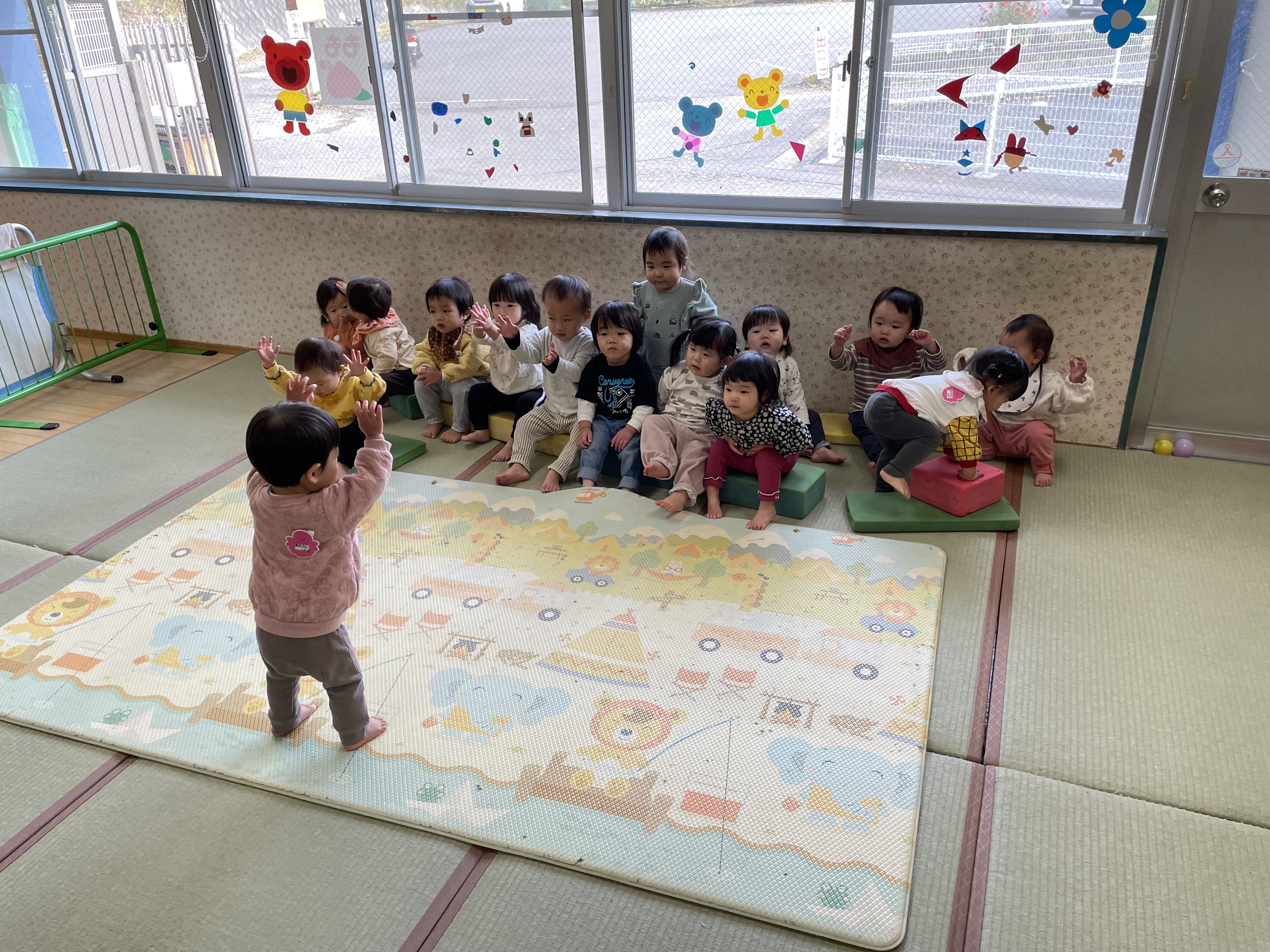 体を動かす事が好きな子どもたちに大型積み木を平均台の様に歩いてもらおうと部屋の隅に積み上げていると、それに気が付いた子が1個づつ運び始めました。それを見た他の子たちも運んできて並べていきます。そして、チョコンと並ぶように座ったので手遊びの曲をかけてみると、立っていた子もどうにか座り、手遊びを一緒にし始めました。気が付くと、どうやら先生役らしい子も出てきて、保育園ごっこになっていて微笑ましい場面を見る事が出来ました。言葉がはっきり出るようになった子もたくさんいて、上手に歌を歌いながら手遊びをしている姿を見ていると、自然と笑顔になります。やっと1歳になった子たち、そして2歳のお兄ちゃん・お姉ちゃんになった小さな子どもたちですが、いろいろな事を考えやってみようとして発達していく姿はたくましく思えます。友達と関わりながら遊ぶ事が増えている分、トラブルが沢山見られるようになりますが、その場面場面を見守ったり仲裁に入ったりしながら、友達と関わって遊ぶ事の楽しさを感じさせ、その中でおもちゃの貸し借りやルールの大切さに気付かせて楽しく過ごす事が出来るようにしていきたいと思います。昨日出来なかった事が次の日には出来るようになっている発達、成長が著しいこの時期の子どもですが、その形は様々です。一人一人の発達の姿を大切に過ごしていきたいと思います。