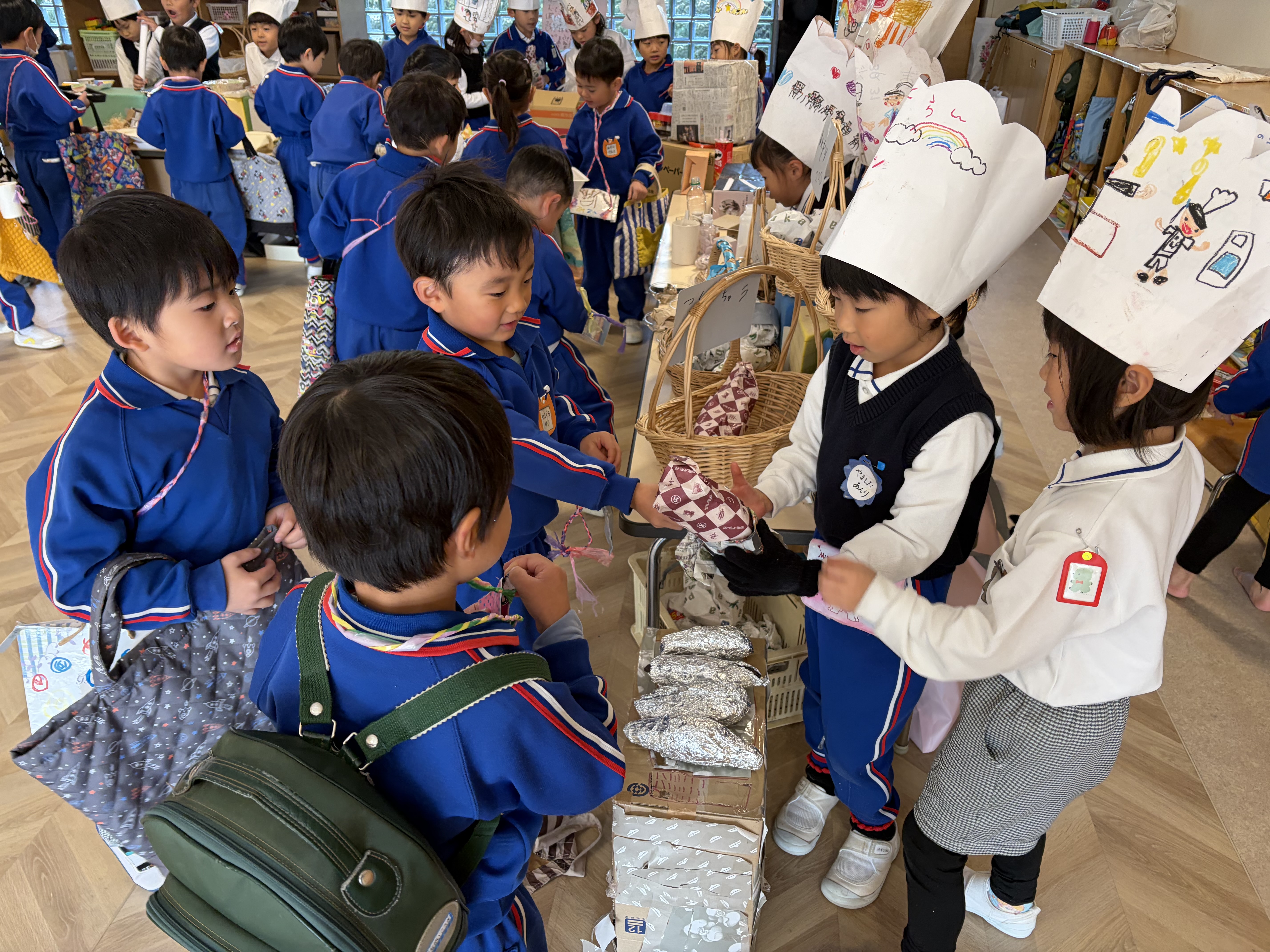 レストランでは、ストーブで焼いたほかほかあま〜い焼き芋が大人気で次々売れています。(ちなみに、これは事務員さんに教わった焼き芋の方法です。)その隣、寂しく並べられているおにぎりはなかなか売れず、悩んでいるときりん組のRくんが「おにぎり買ってほしいけんおすすめって書くね!」と張り紙をしました。ぞう組のAちゃんは「焼き芋買ったらおにぎりが付いてくるよ〜」とお客さんの注目がおにぎりにも行くように呼び込んでいました。ということでおにぎりも無事完売しました!