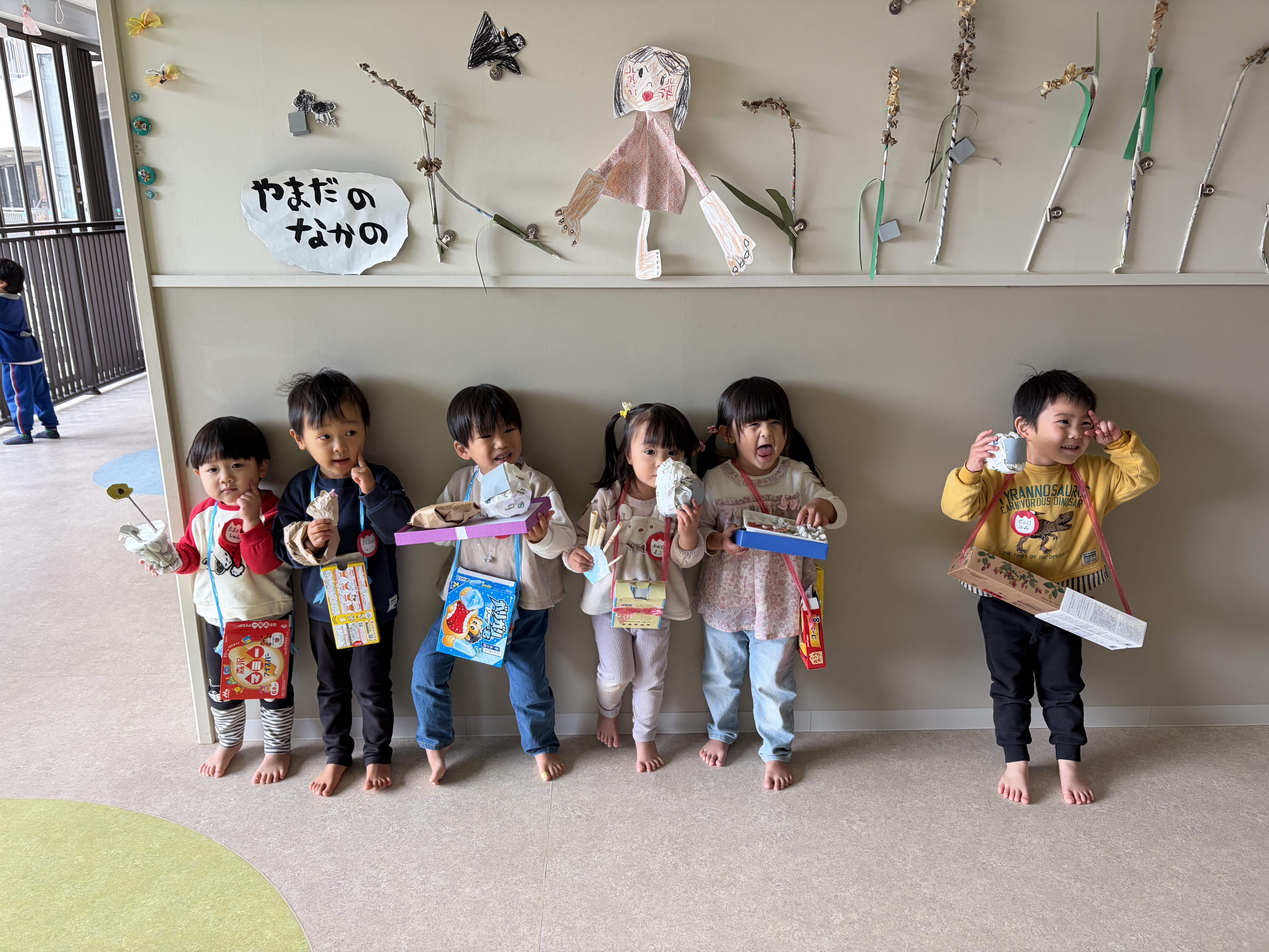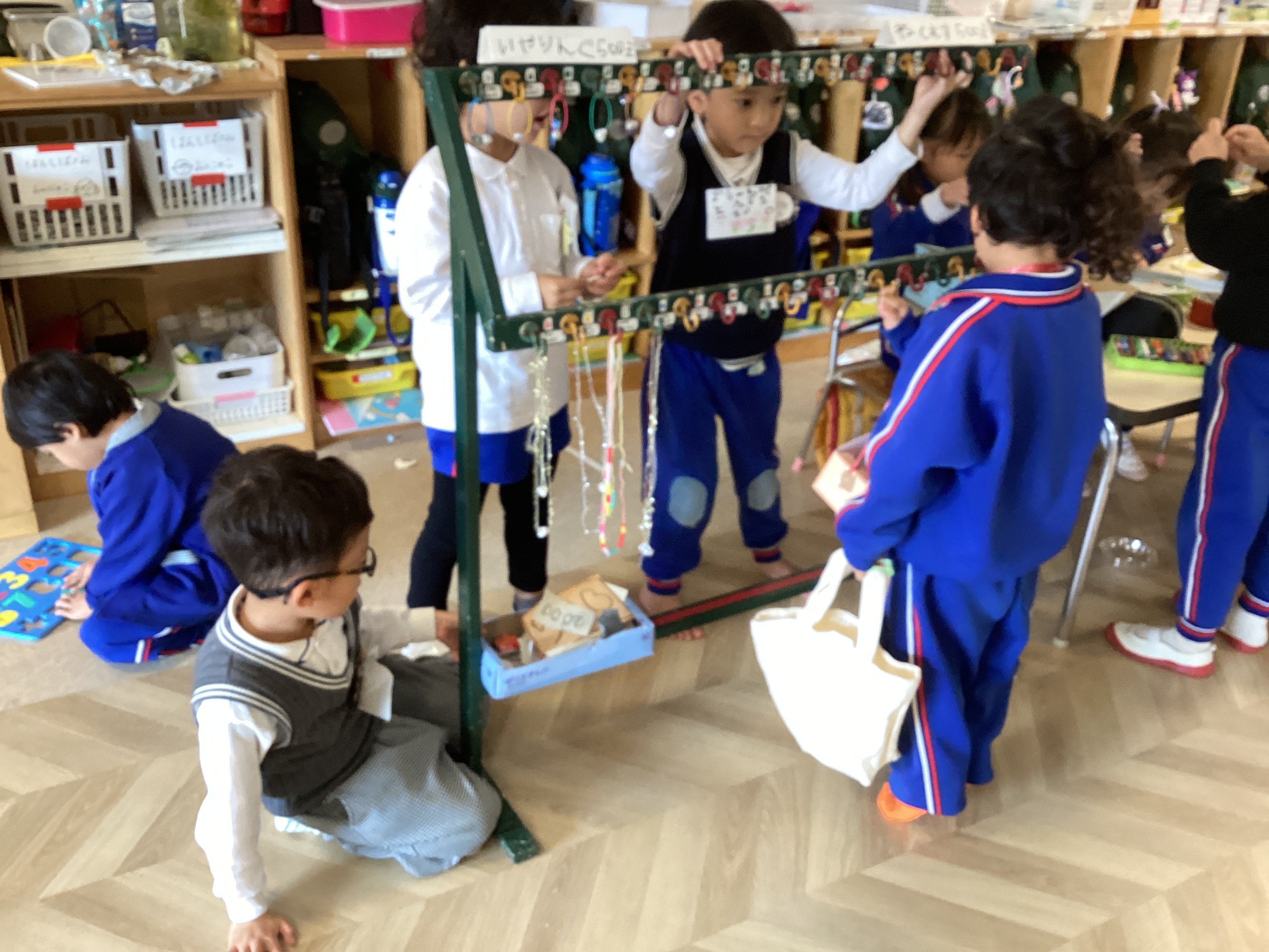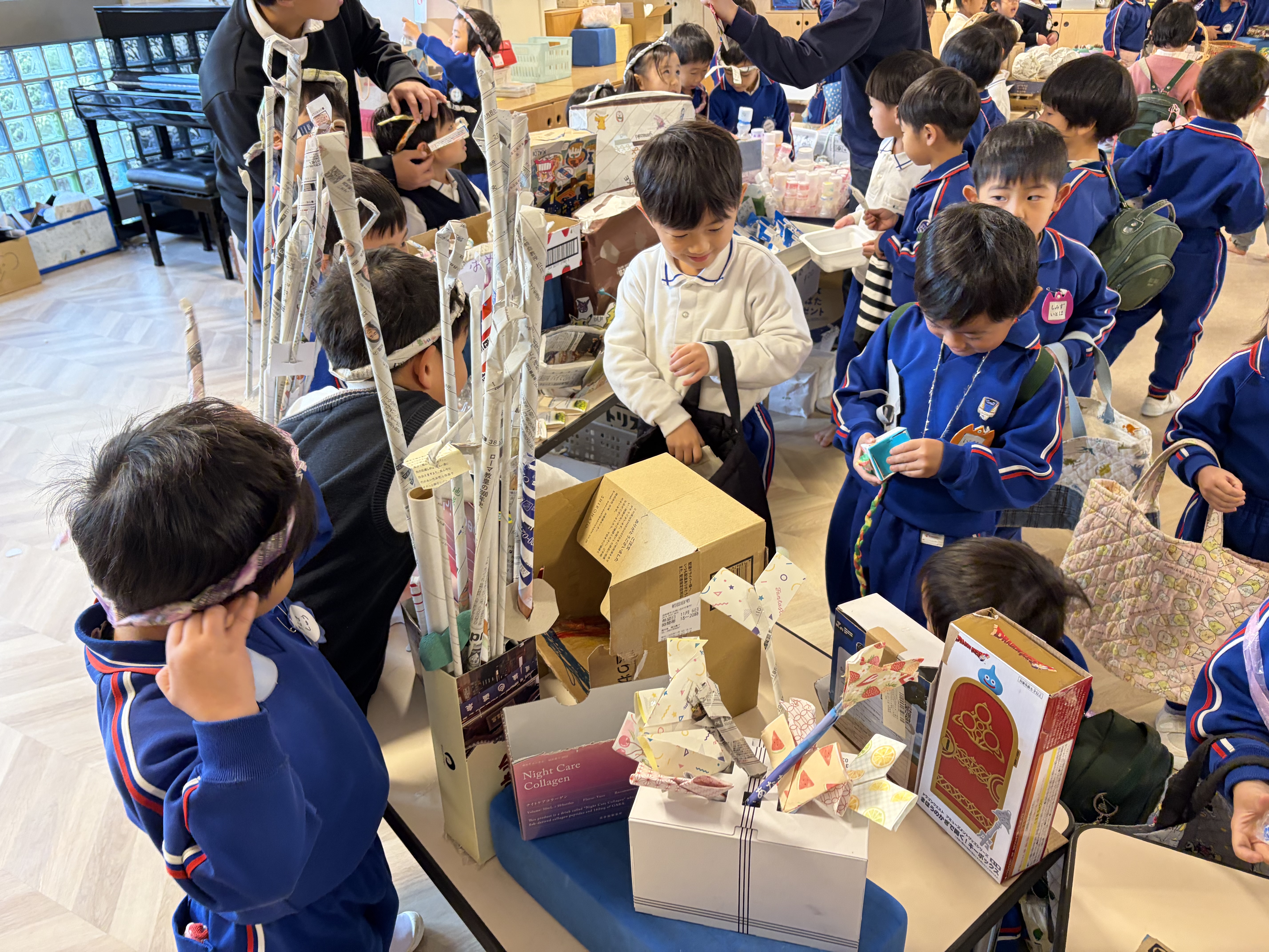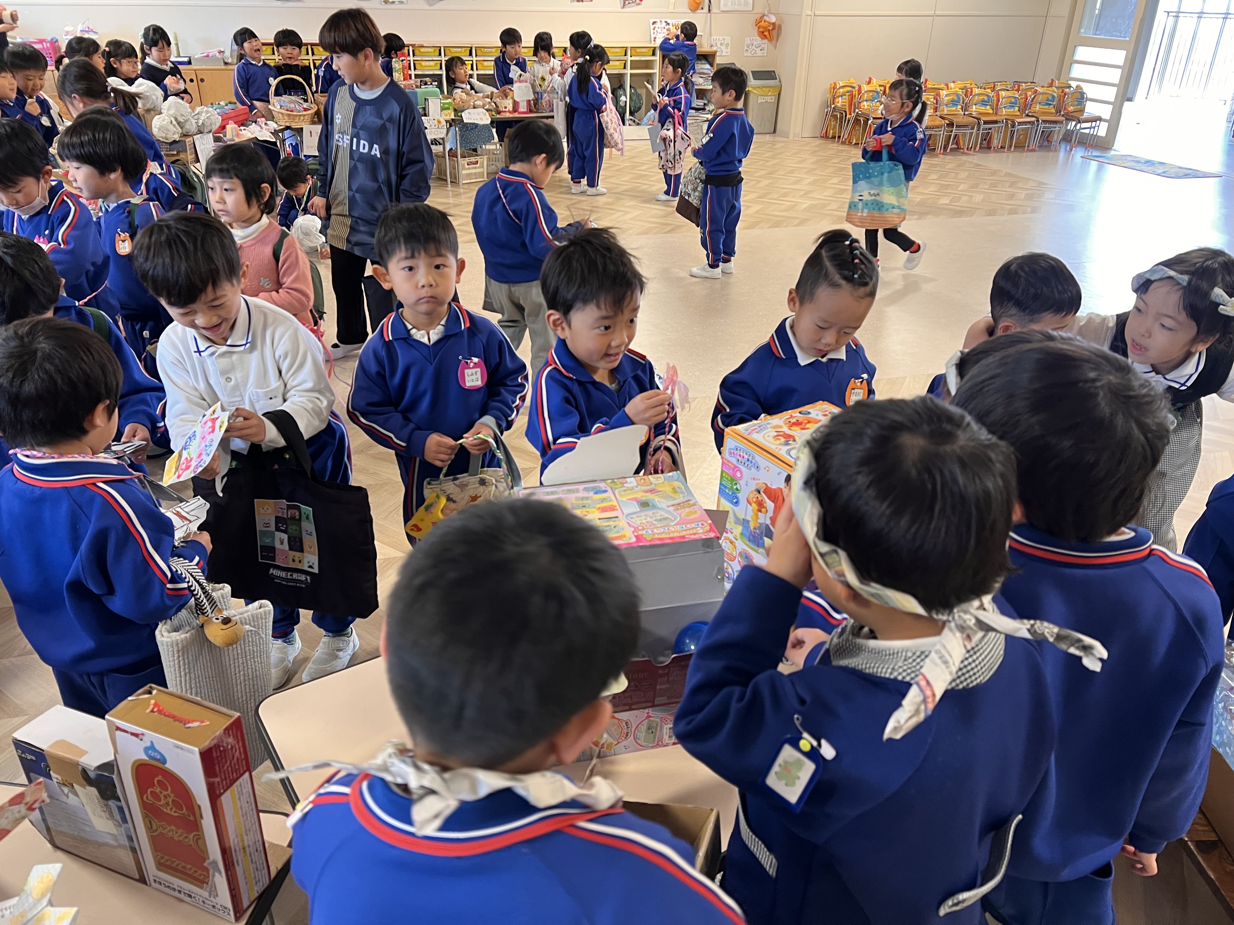 たのしいやさんでは、「小さい子(音が鳴るから)マラカス好きだよね!」「おもしろメガネ、自分も欲しい!」と楽しい!面白い!から考えたおもちゃやゲームがありました。金魚すくいを担当していたらいおん組のIくんは、小さいお客さんがやってくると何も言わず、後ろからすくう手を支えてあげていてそのIくんの自然な優しさに心温かくなりました。他の場面でも優しく分かりやすくルール説明をしたり、小さい子にグイグイ言いすぎると怖がられてしまうかもと少し控えめにしたり、子ども達なりに接客していました。