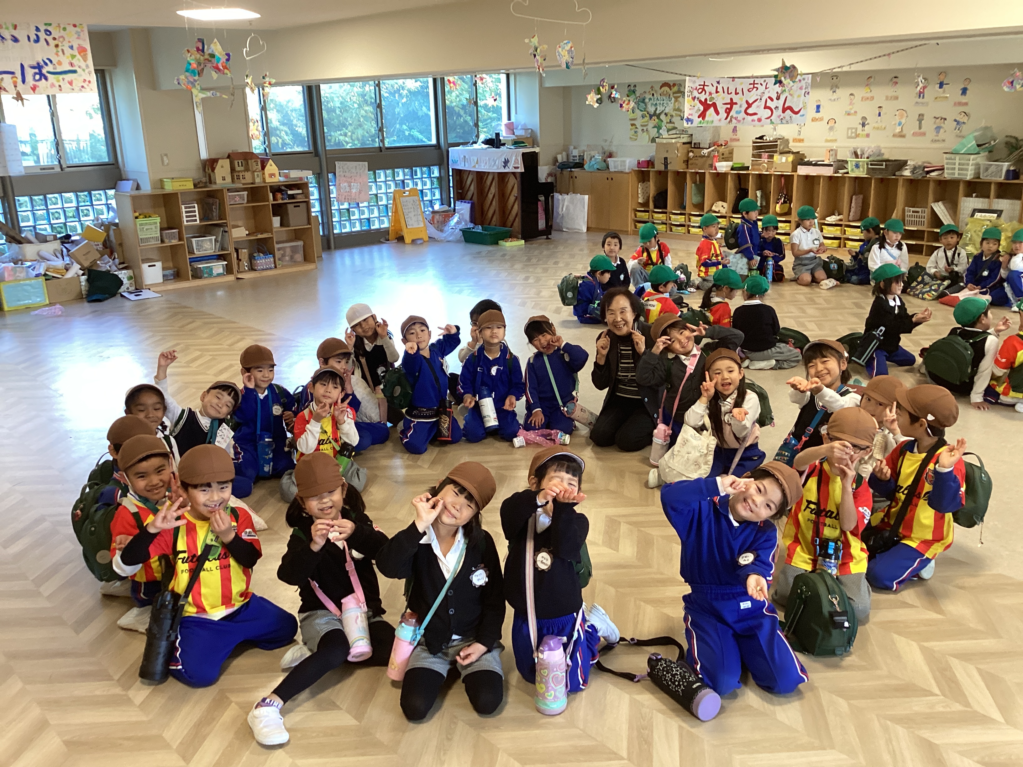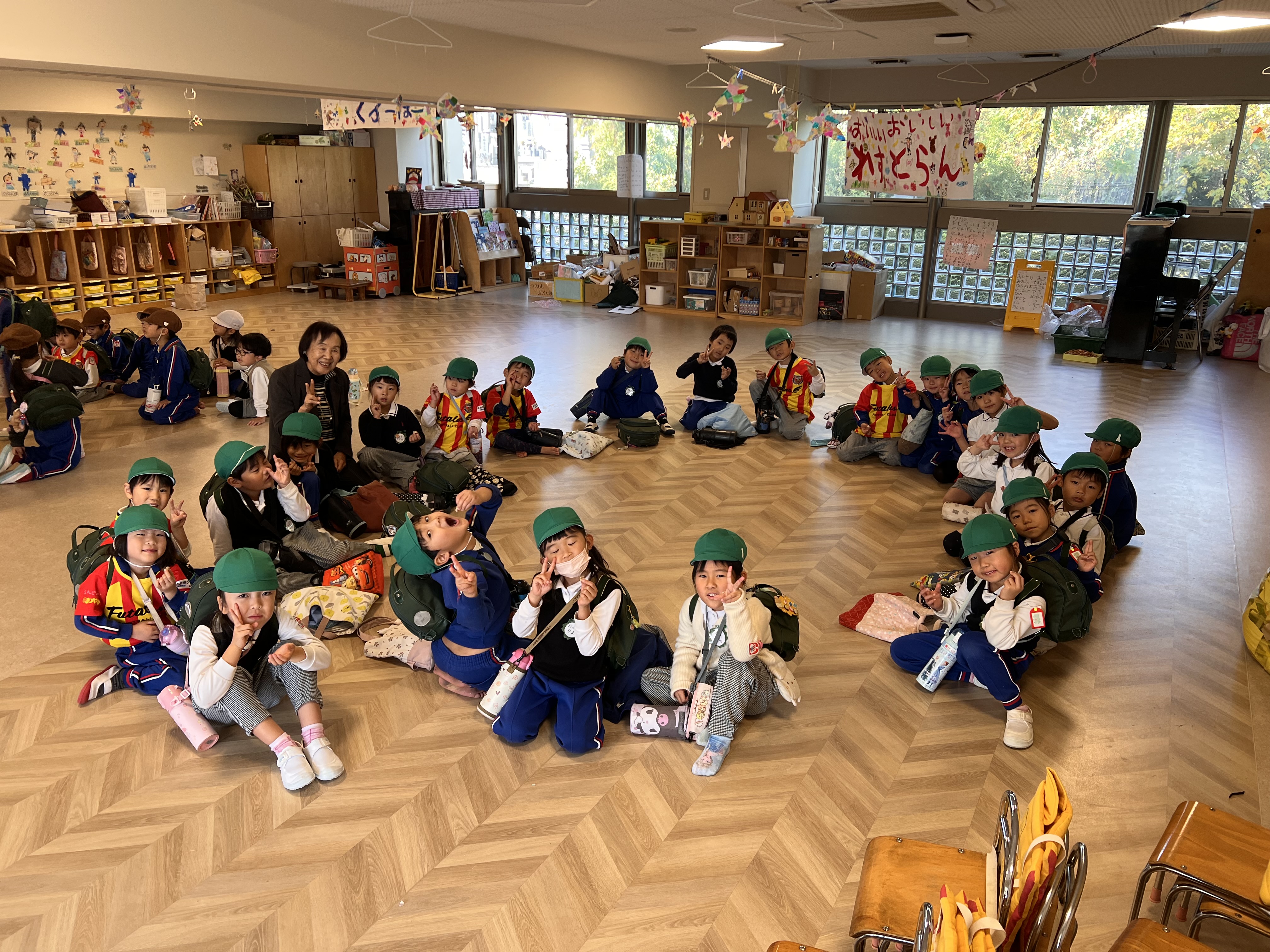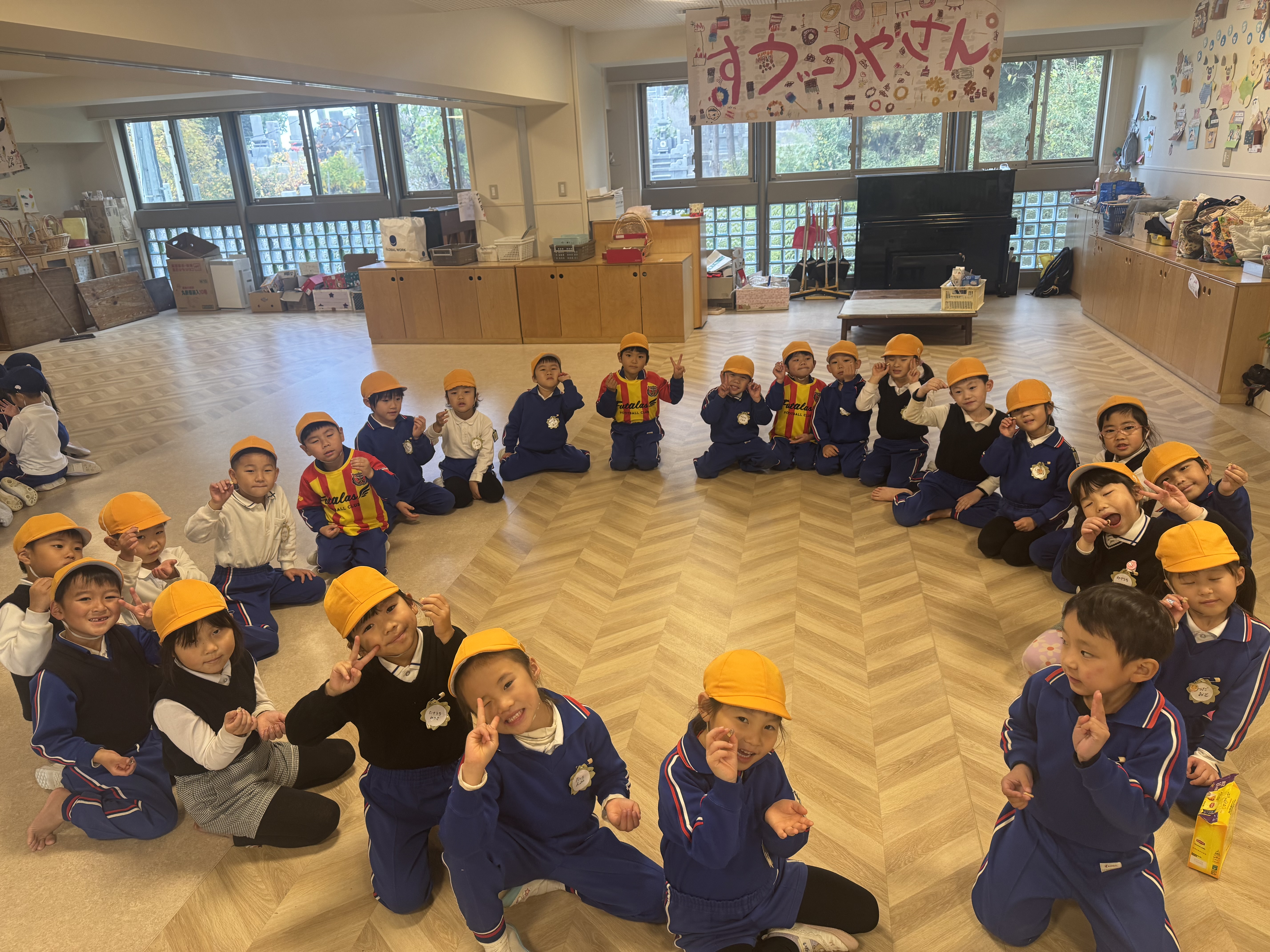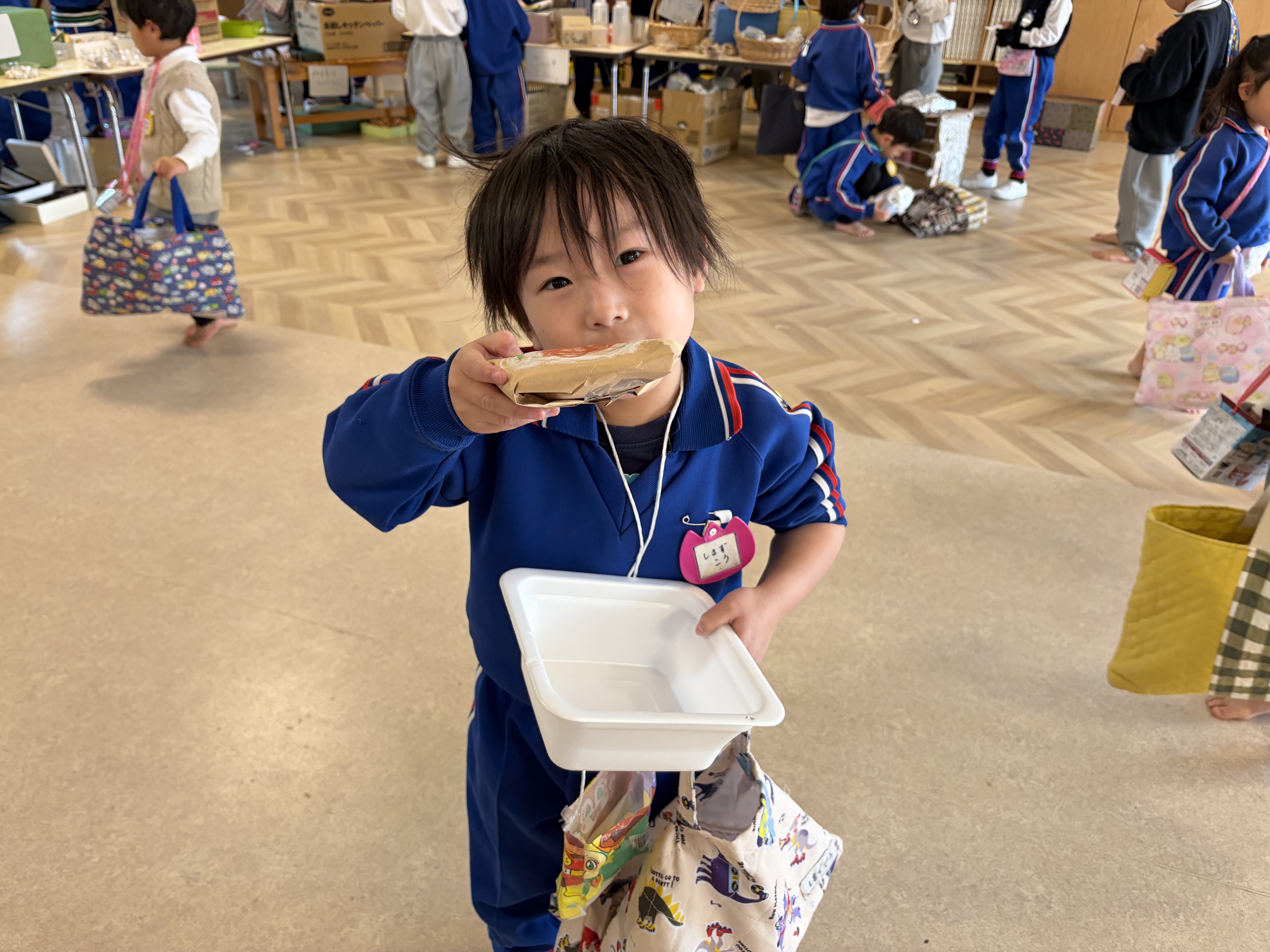 社長からチップの代わりに(本物の)どら焼きを頂きました。「え!こんないいものもらっていいの!?」と思いましたが、貴重な1つのどら焼きを年長100人で分けて頂きました。手のひらに乗った小豆程のどら焼きを口に入れ、ぞう組のSくんは、「こんなに美味しいどら焼き初めて食べた〜!」と声をあげ、他の子も今日の達成感と喜びをこの一口のどら焼きで満たされたようでした。