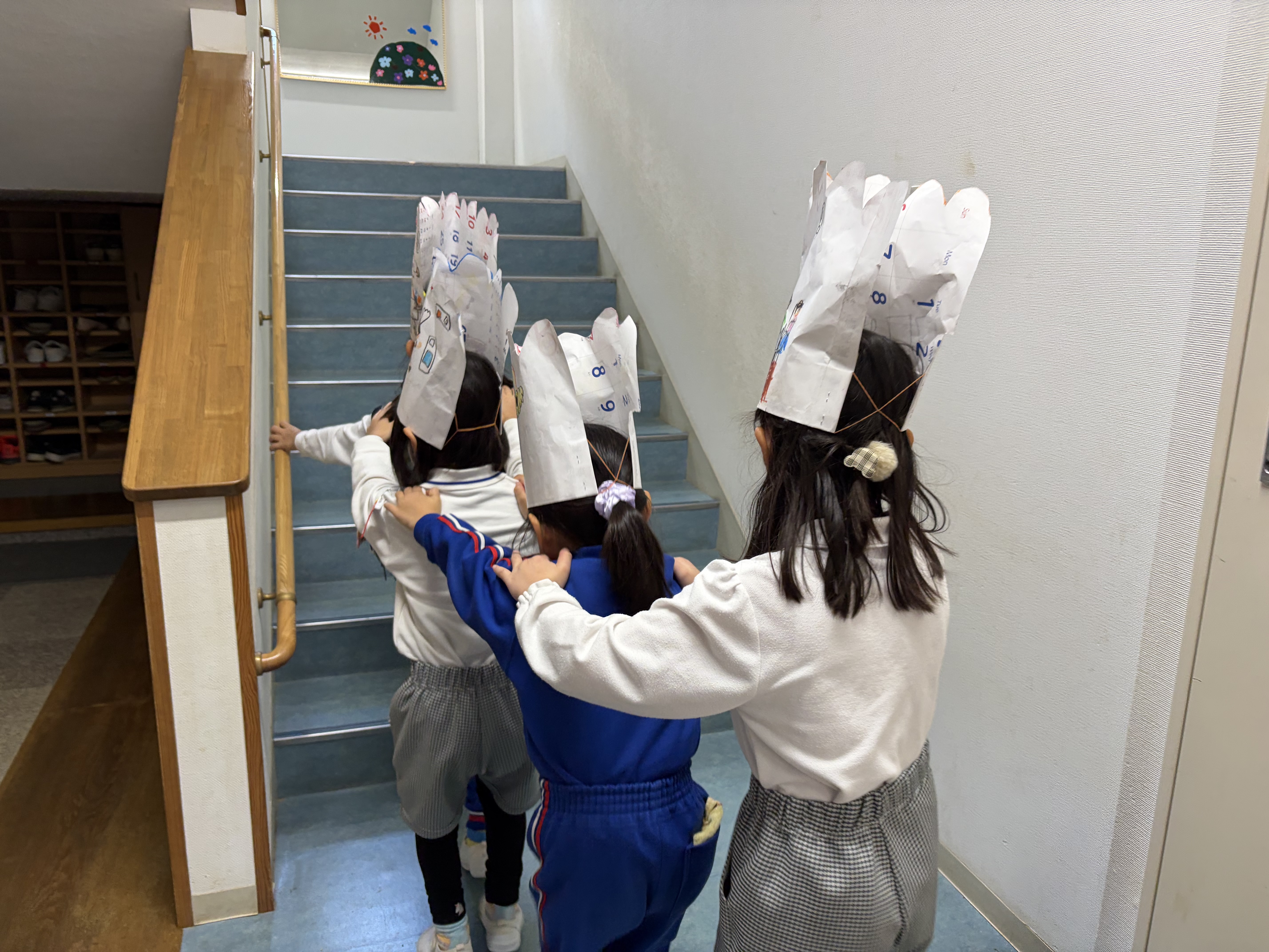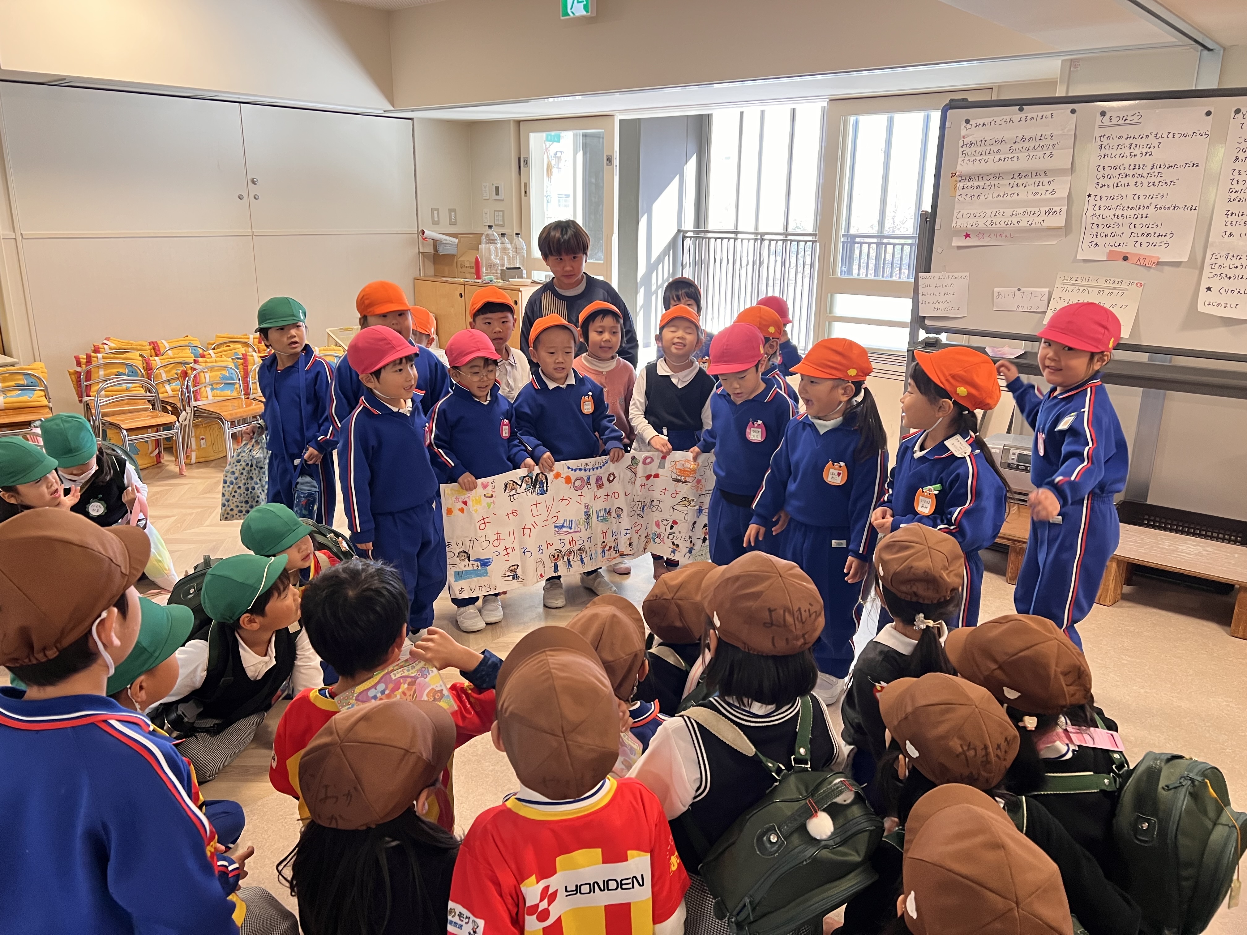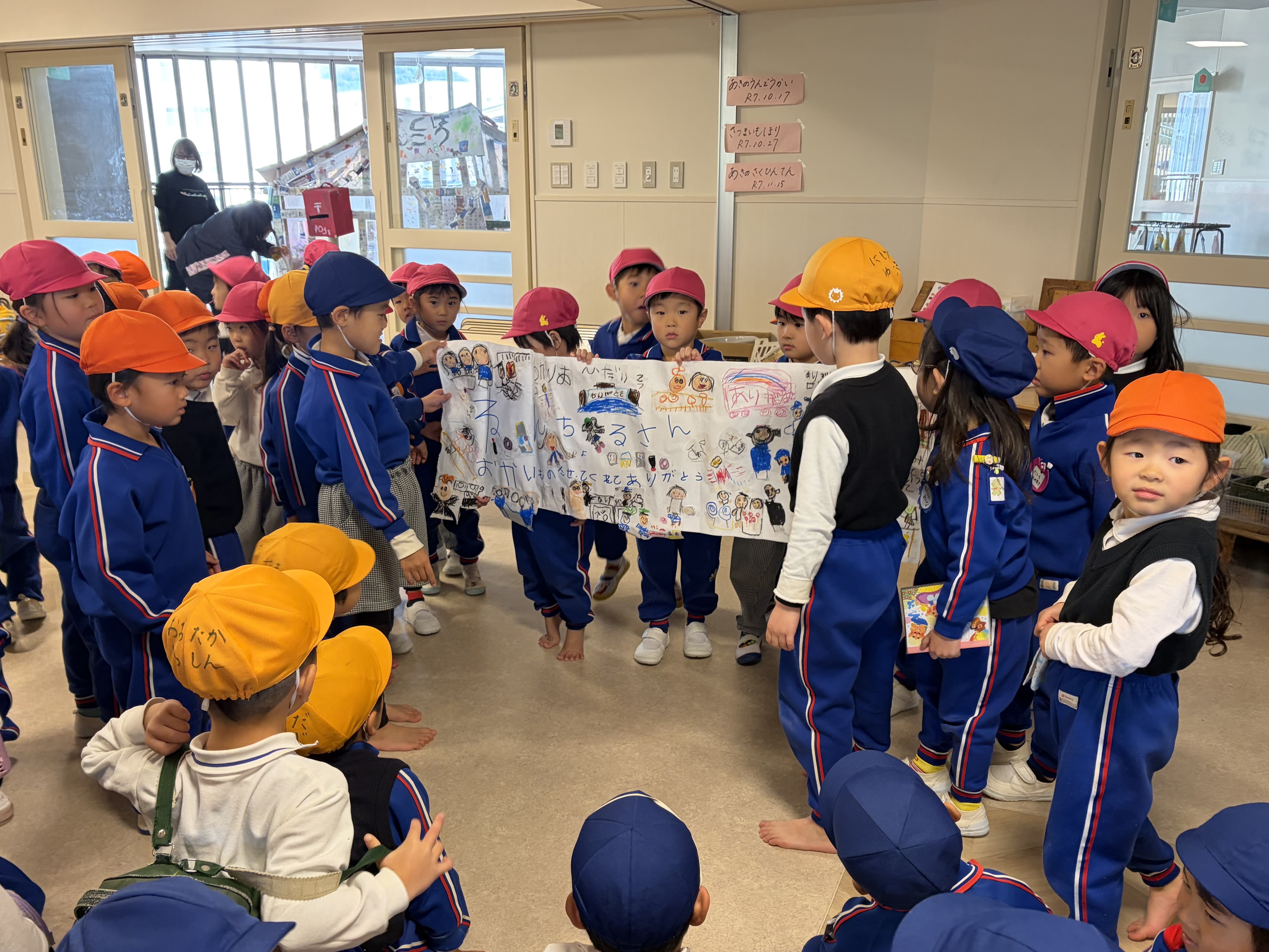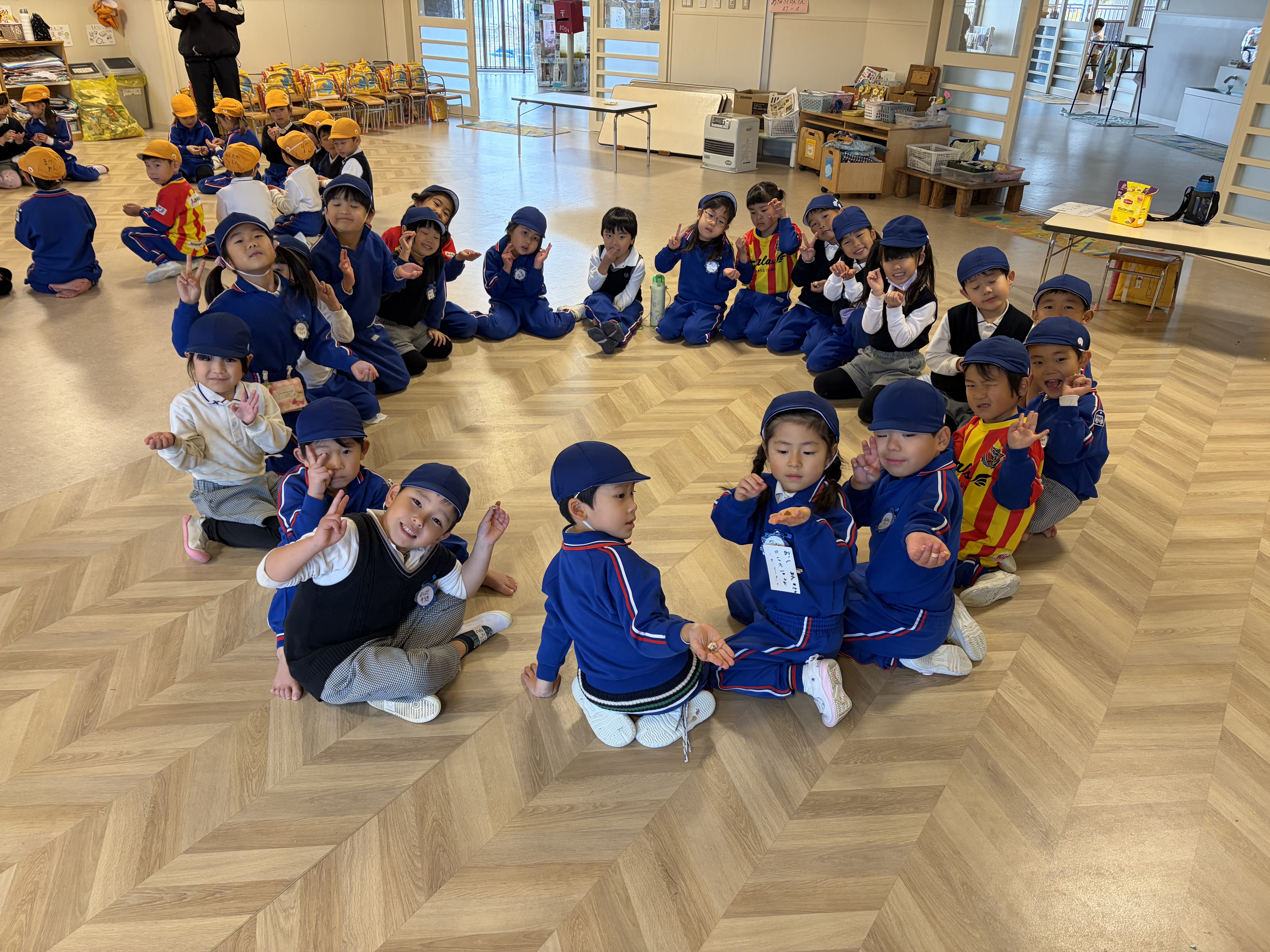 社長からチップの代わりに(本物の)どら焼きを頂きました。「え!こんないいものもらっていいの!?」と思いましたが、貴重な1つのどら焼きを年長100人で分けて頂きました。手のひらに乗った小豆程のどら焼きを口に入れ、ぞう組のSくんは、「こんなに美味しいどら焼き初めて食べた〜!」と声をあげ、他の子も今日の達成感と喜びをこの一口のどら焼きで満たされたようでした。