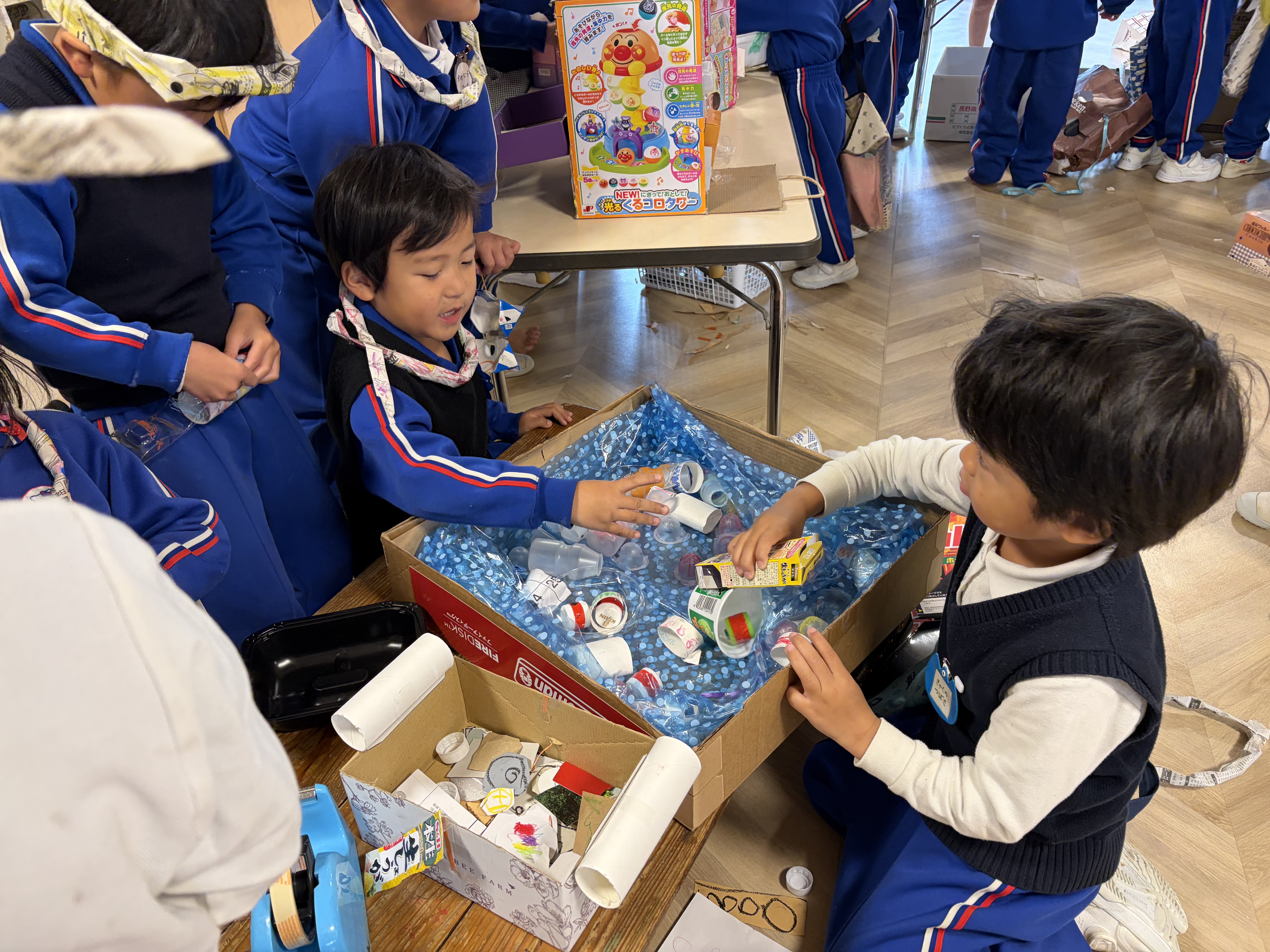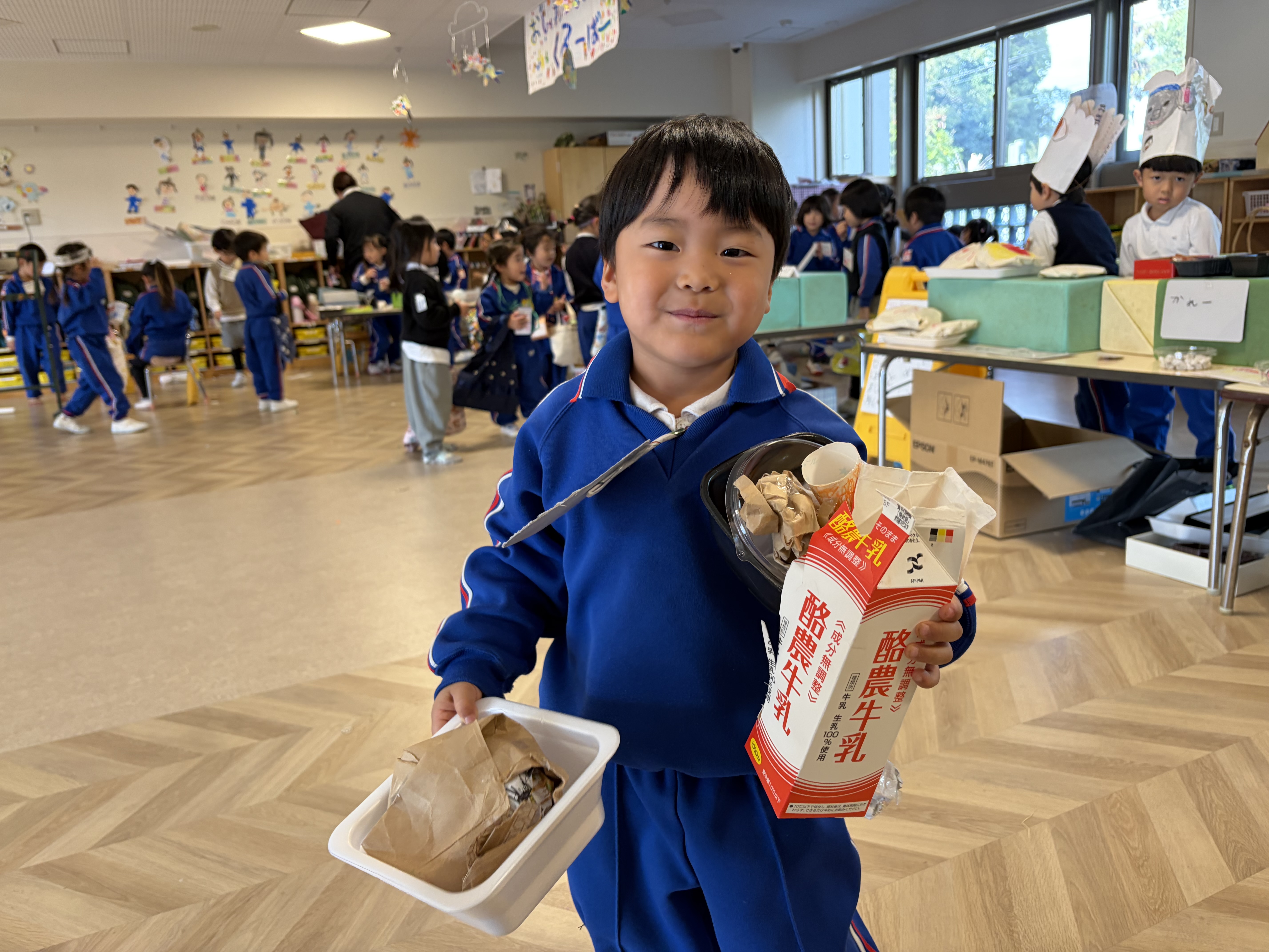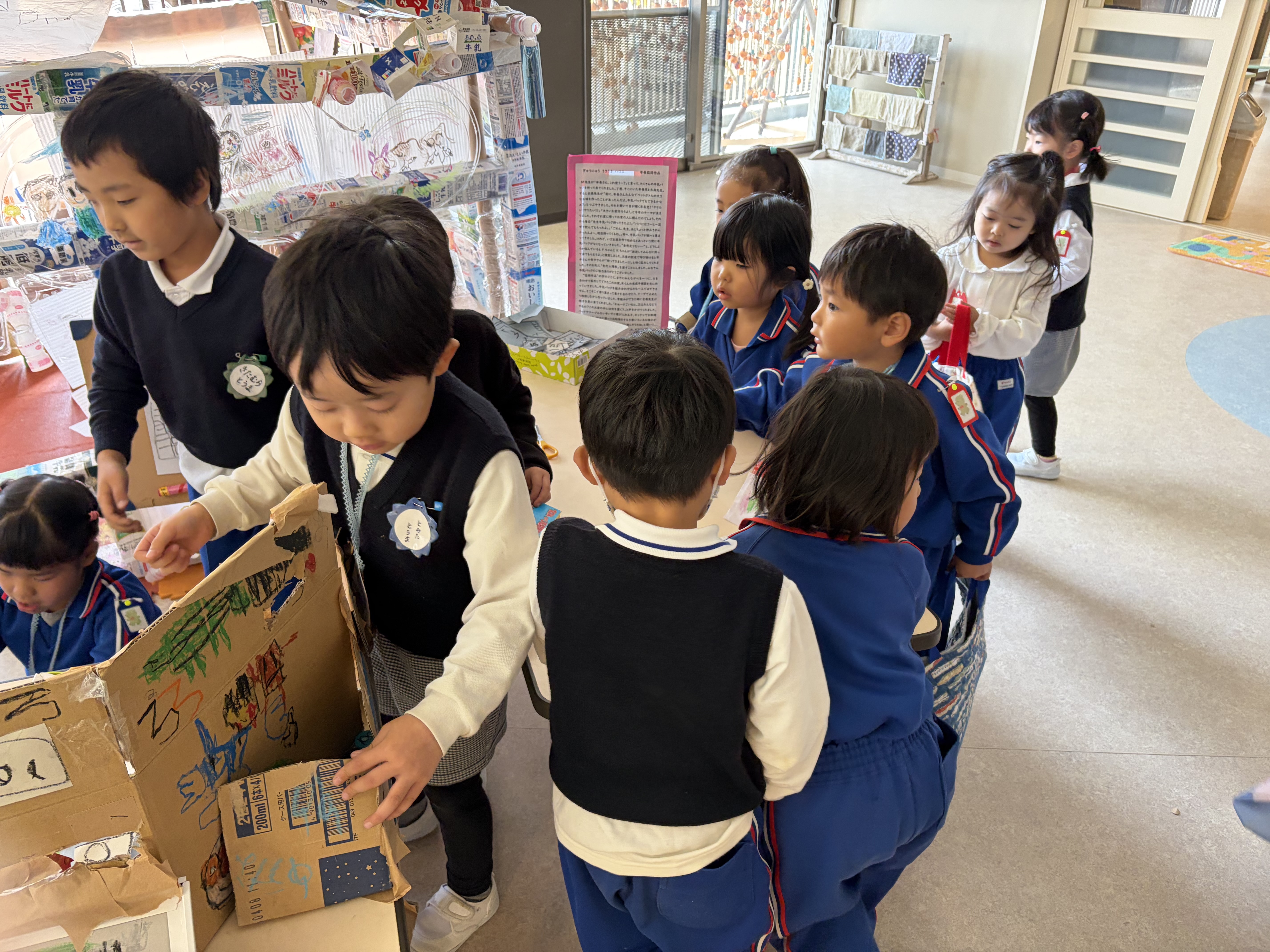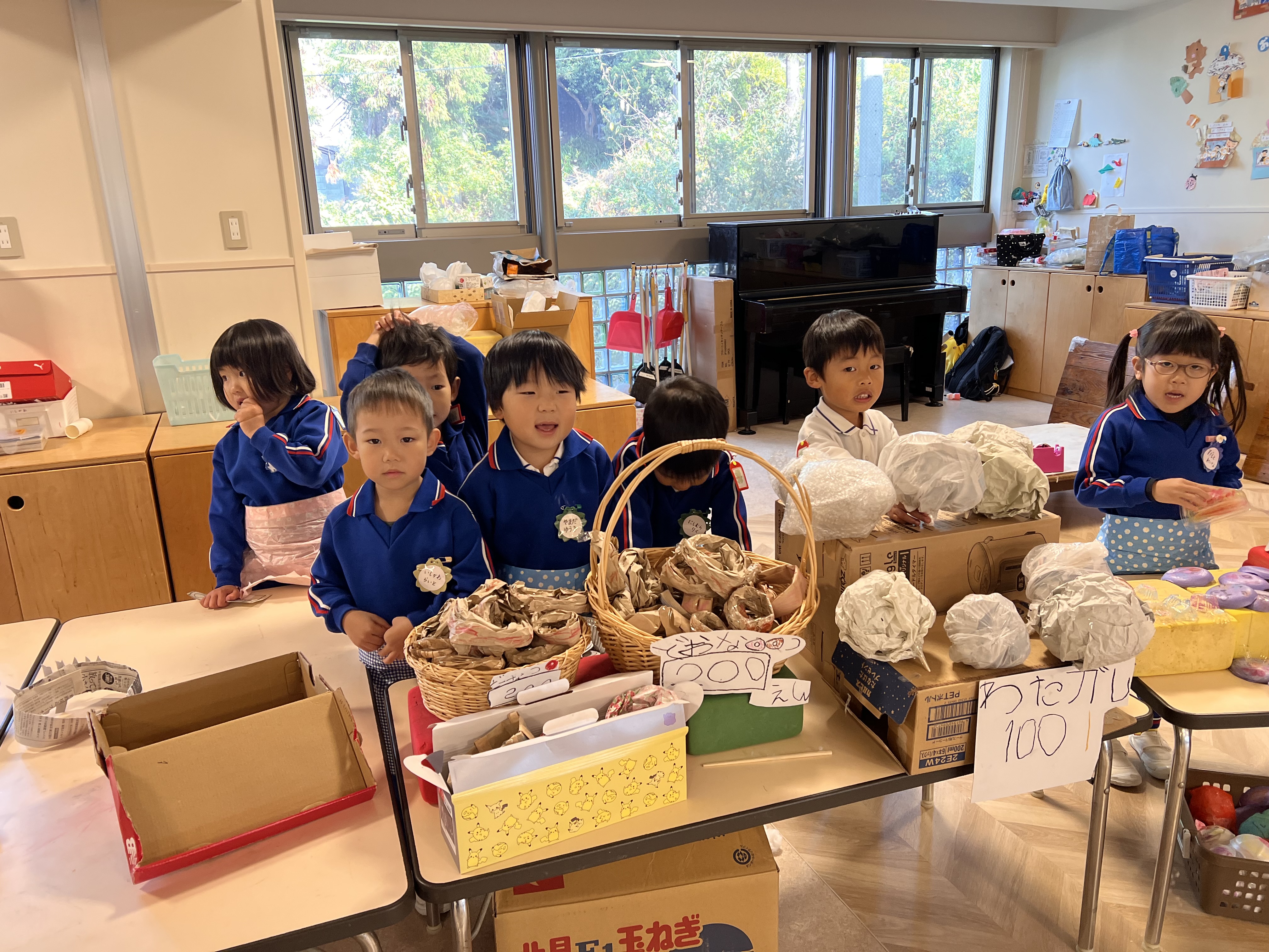 今日は、年長児のお店やさんの閉店セールの日でした。朝から「今日は忙しい日になるぞ〜」と登園するとすぐ持ち場につき、仕事を始める子ども達。(ここ1.2週間毎朝でした。)今日は、園外保育も無いので全園児が交代で買いに来るということで商品が足りなくならないようにいつもより大忙しの1日になりました。お店の商品の在庫を確認し、少ない商品は声を掛け合って作っていきます。