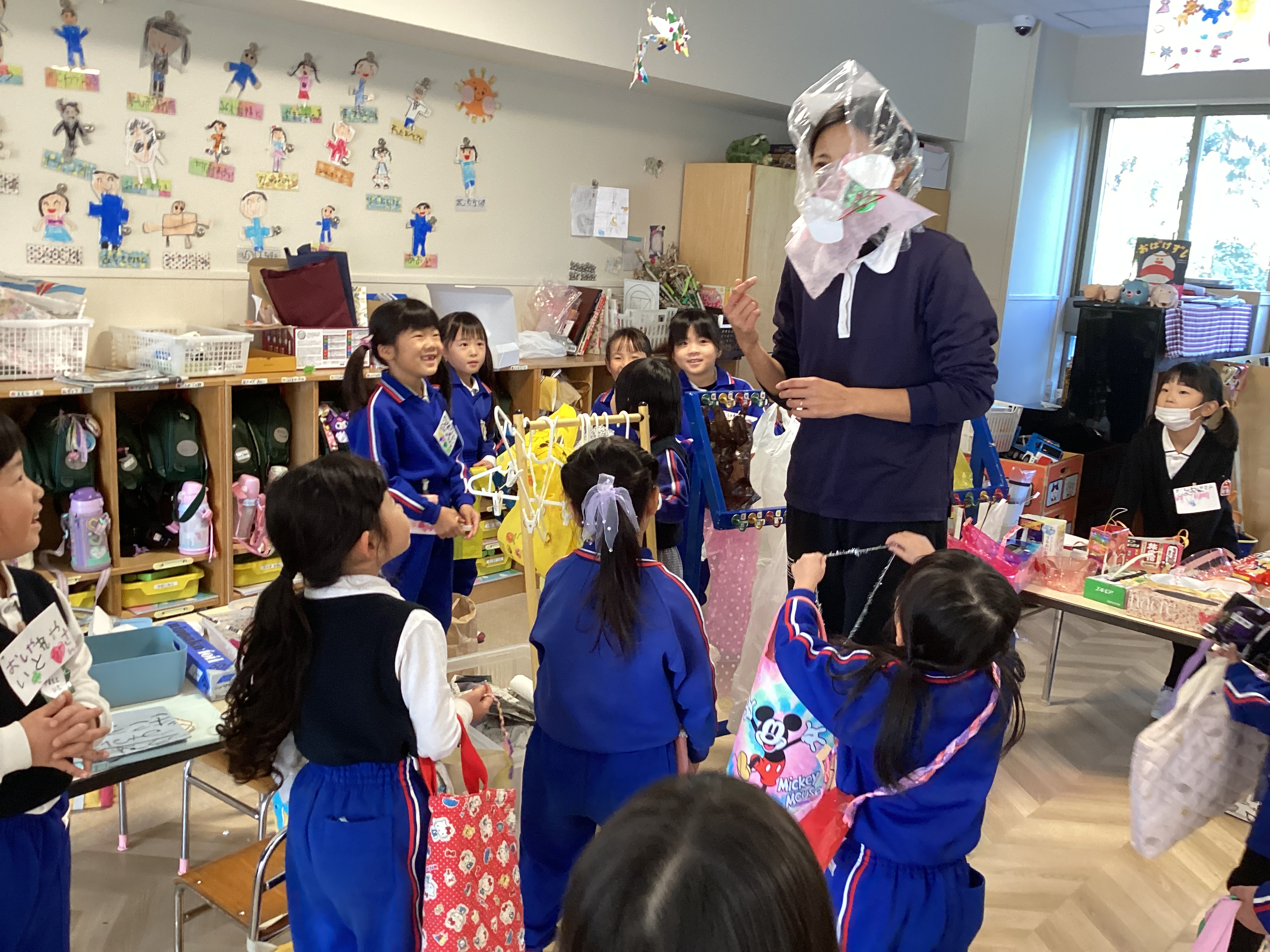 りす組のRちゃんは、お買い物バッグを忘れていたのでおしゃれショップでカバンを購入!したつもりが、そのカバンには2つの穴が、、それはサロペット付きのスボンでした。そこでRちゃんは、カバンが欲しいとぞう組のHちゃんに相談するとHちゃんはズボンの穴を塞いでカバンに変えてくれました。Rちゃんは大満足!お買い物を楽しむことが出来ました。
