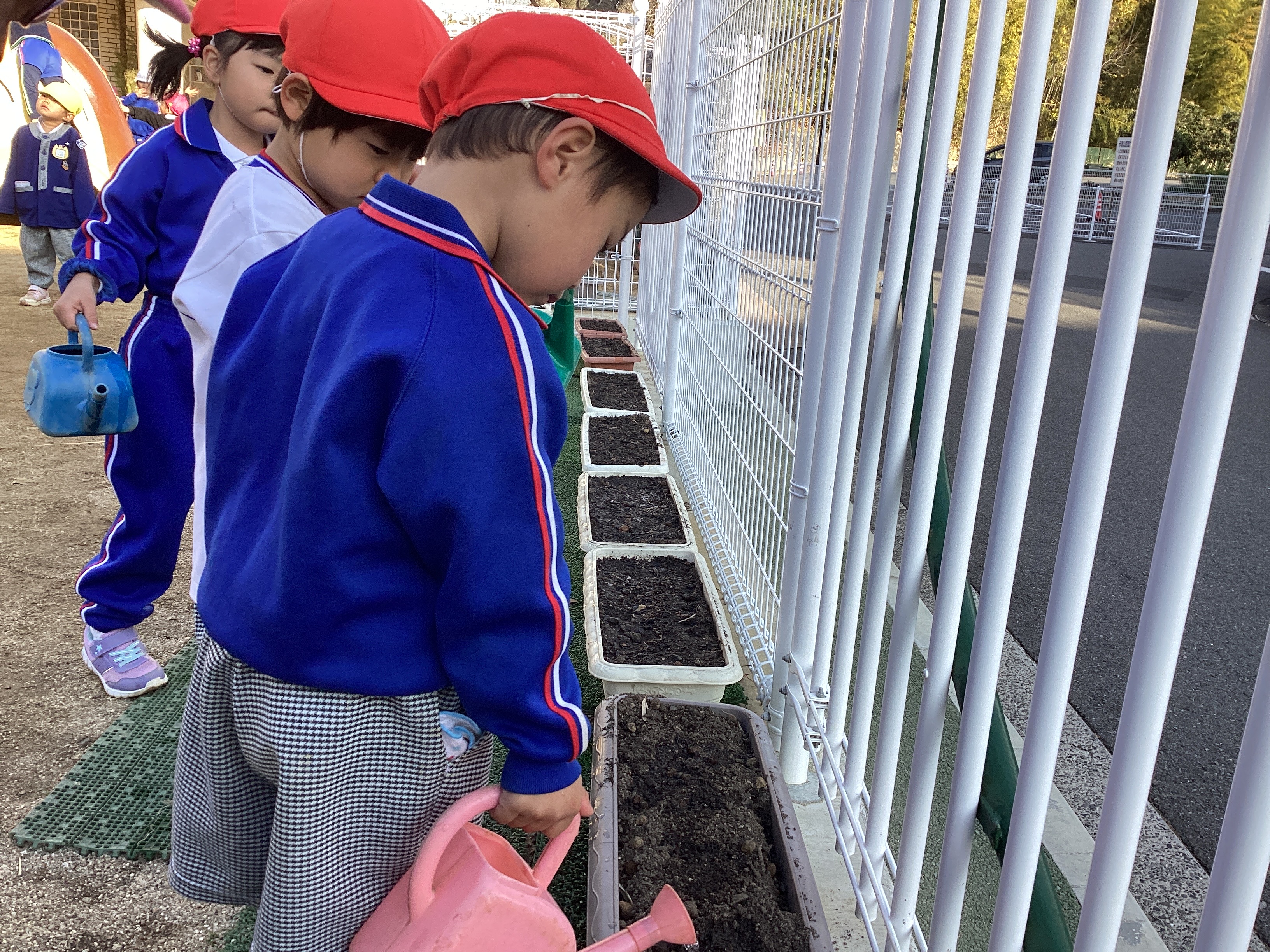 そんな中、園庭のつりかんの近くでちゅうりっぷ組の子ども数人が集まっていました。行ってみると一人一つづつのジョウロを持って一昨日植えたばかりのちゅうりっぷに水をあげてました。近くにいた教師に聞くと、朝園庭に遊びに出たときに子どもたちから「ちゅうりっぷにお水をあげないと」と言って水やりをし始めたそうです。すると他の年少児も水やりに気がつきジョウロを持って集まってきました。たくさん水を入れて嬉しそうにやってきたのですが、昨日のブログにも書いてあったように、ちゅうりっぷの球根に水をやりすぎてしまうと球根が傷んでしまいます。たんぽぽ組に水をたくさんあげなくていいよと教えてくれた年少さんはどうなるのかなと見ていました。水やりを一緒にしていたMちゃんが突然「お水いっぱいしたらちゅうりっぷがしんどくなるよ!」と言いました。すると、その声を聞いた周りの年少児たちが水やりをするのをやめたのでした。教師が「土が乾いたらあげたらいいよ。乾いた土ってどれかわかる?」と聞くと周りにあるプランターを見ていき、まだ自分たちが水をあげてないプランターを指差し「これが乾いてる!」と言っていました。「でもせっかくお水持ってきたから少しあげてもいいよ」言うと、さっきは勢いよく水をあげてたのですが今度はジョウロの水を少しずつ出すよう気を付けながら水やりをしていました。その姿がとても微笑ましく思いました。