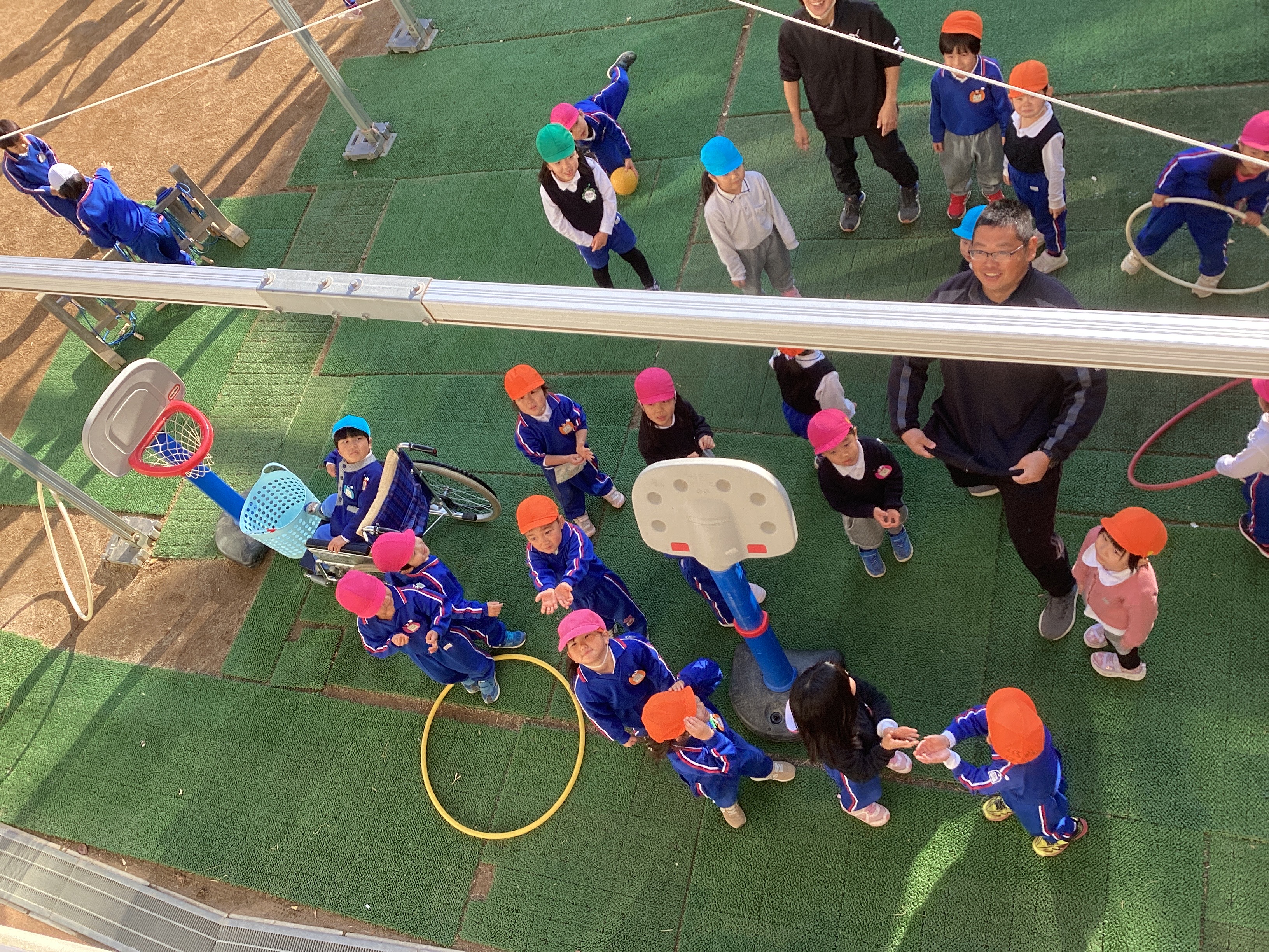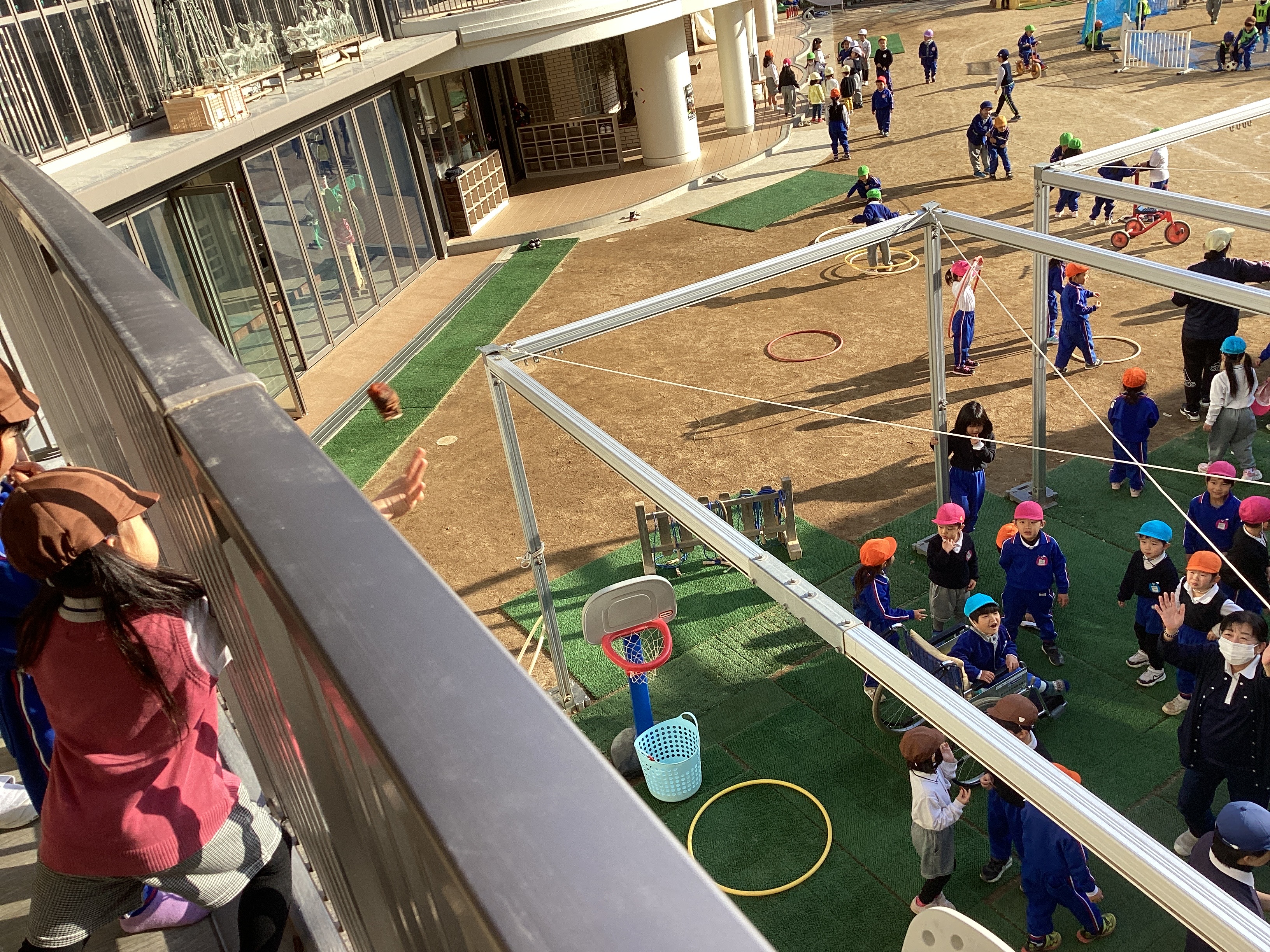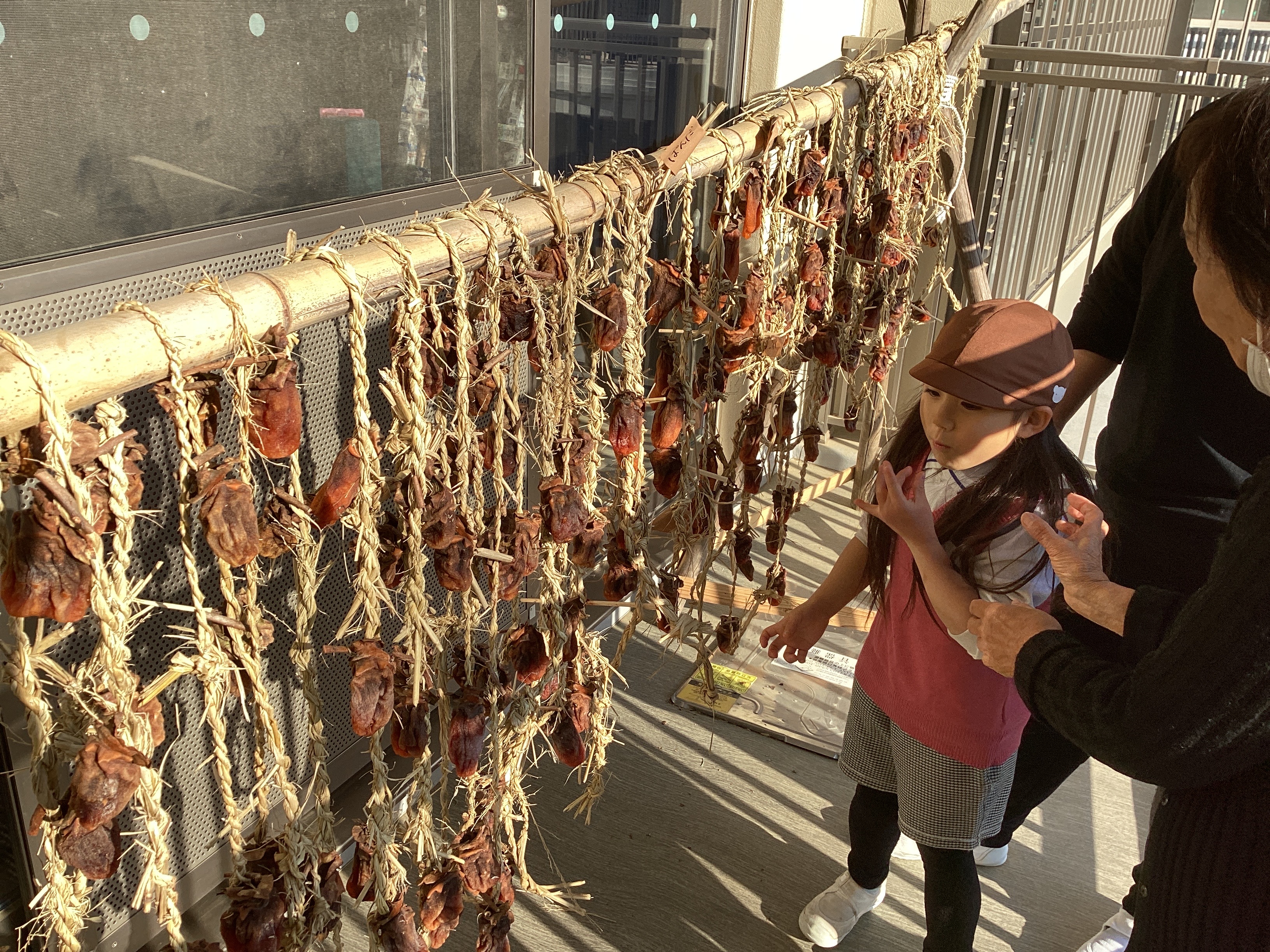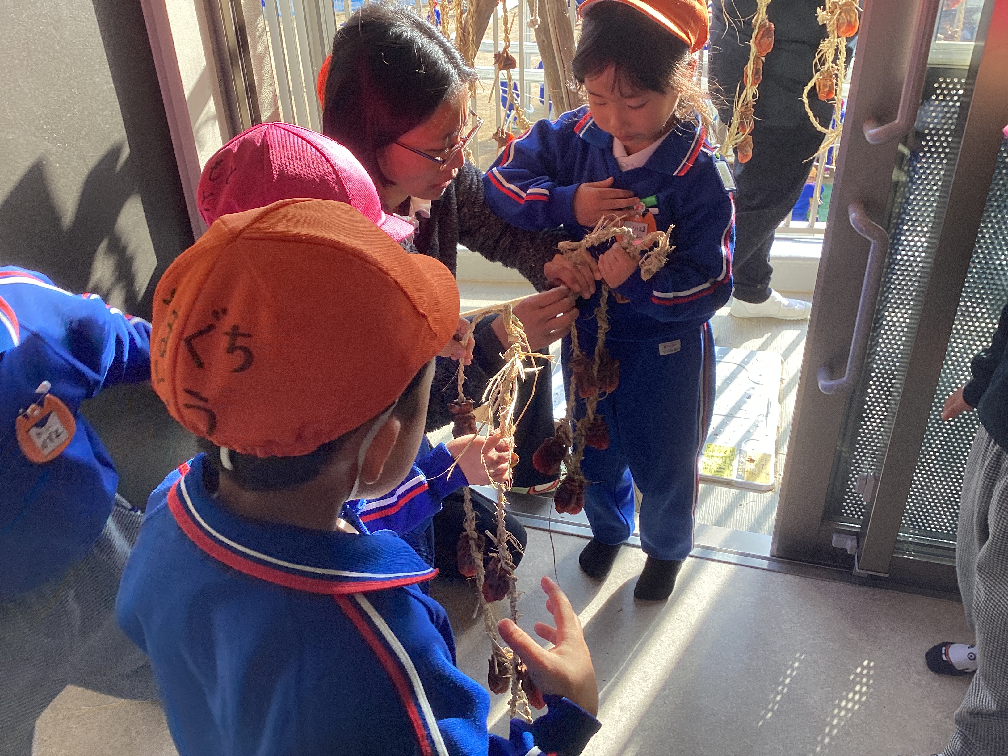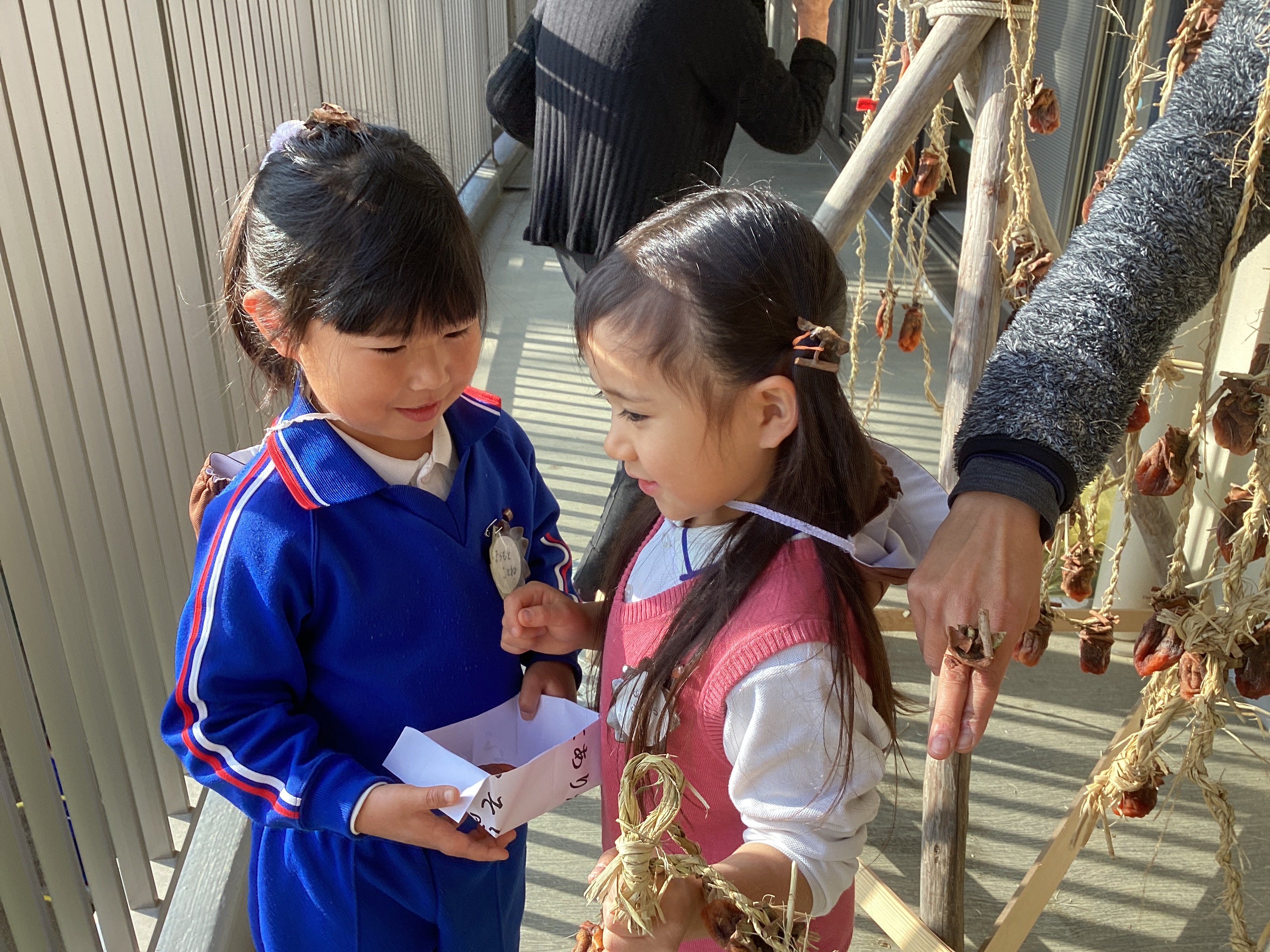 登園してきたたんぽぽの子どもたちとシール帳などの片付けをしていて、ふと新園舎に目を向けるとちゅうりっぷぐみのベランダで古森先生と子どもたちが何やらしていました。気になって様子を見に行ってみると食べごろな干し柿を前に話をしていました。しかし、そこにいた年長児の口がモグモグと動いていたように見えたので、口の動きをよく観察してみると食べた種周りについている実を味わっていたのでした。その様子に気がついたのは自分だけではなく、下の園庭で遊んでいる子どもたちも気が付いていたのです。楽しいことを嗅ぎつける嗅覚はさすがみつばっ子!!園庭の芝生のところで「柿食べたーい」と手を出している子どもたちにも分けようと餅まきならぬ干し柿まきが始まりました。上から落としてくれる干し柿を教師が受け取り、またおいしそうな干し柿を探しては教師に渡しを繰り返しました。そして干し柿を受けった教師の周りにはそれを察した子どもたちが集まり小さな集まりがたくさん出来ていました。その様子を見ていた古森先生から縄ごとクラスに持っていき分けたらと言ってもらったので、各クラスで取りに行くことになりました。教師と一緒に二階のベランダに行った来た子どもたちは、すぐに干し柿を数え「八個あるよ!」「こっちは九個ついてる!!」と一つでも多くそして大きくて美味しそうな干し柿を見つけては嬉しそうに各クラスへ持って帰っていきました。部屋に戻り青組の子どもたちに伝えに行くと「干し柿いるー!」「いっぱい食べる!!」と大喜びしていました。代表の子どもと選んだ干し柿を持ち帰ると「Aちゃんこれがいいな」「僕これやけんね!」と早速自分が食べたい干し柿を選んでいました。昨日食べた干し柿がよっぽど美味しかったようです。