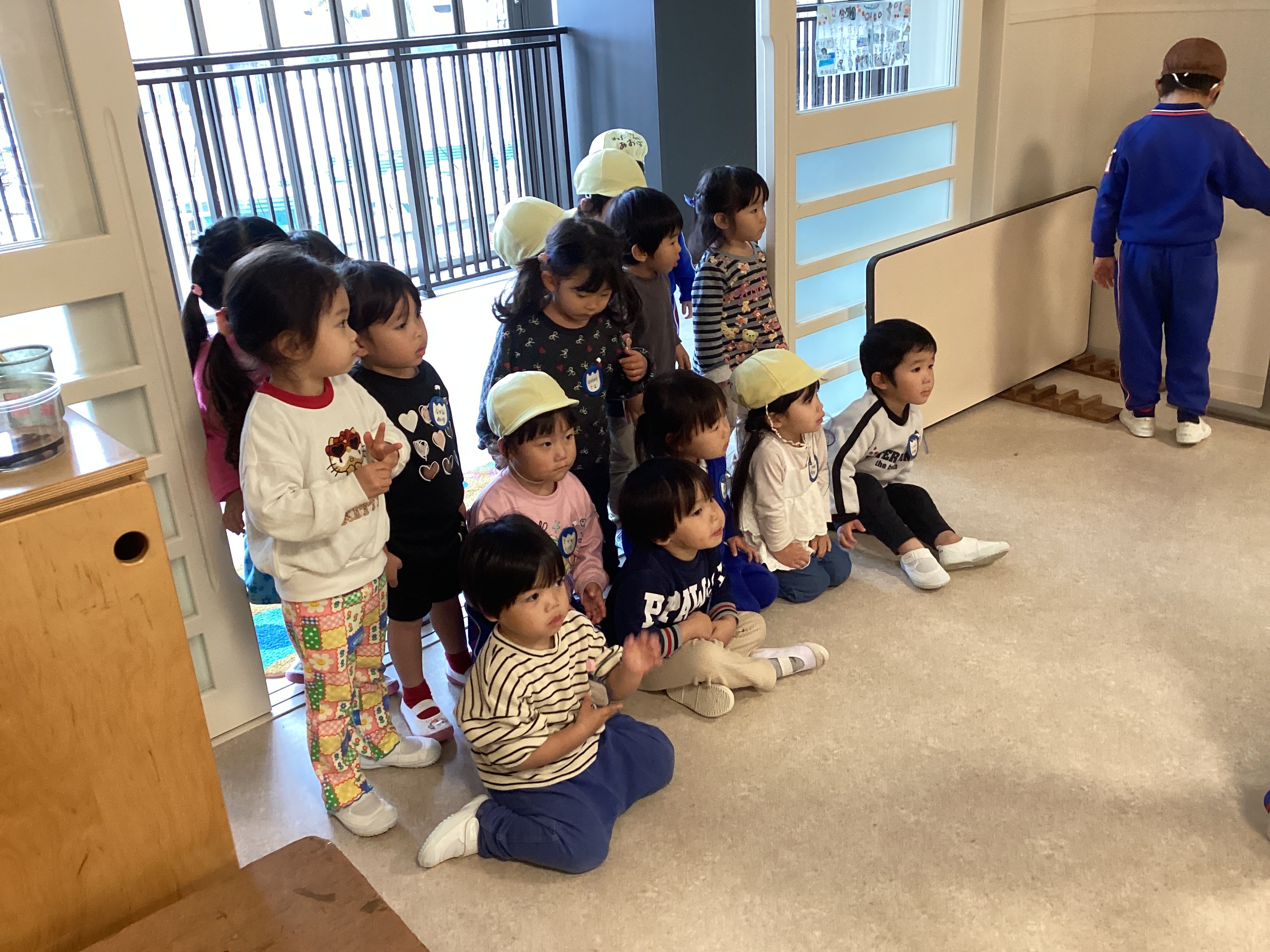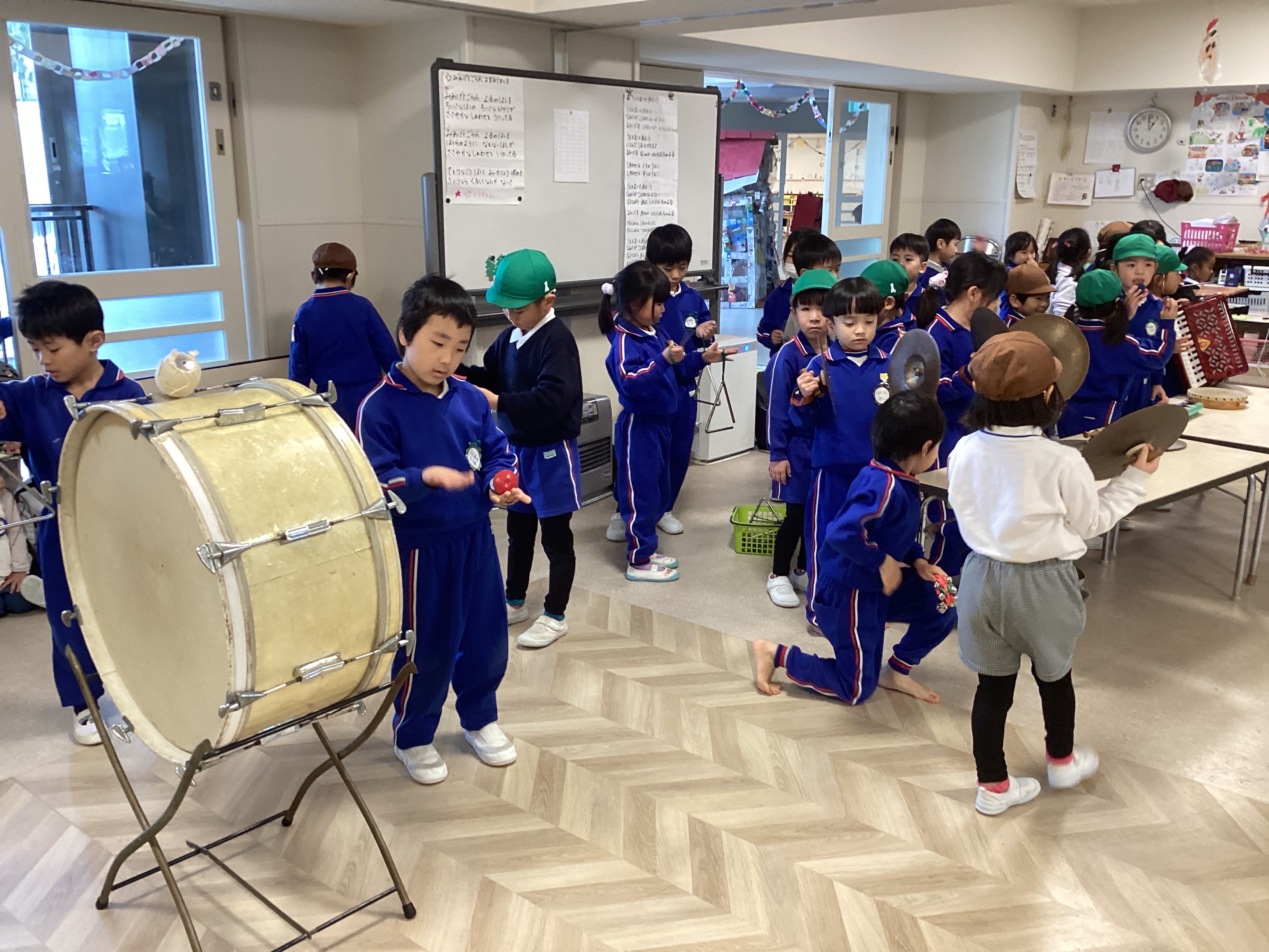 昼食後歯磨きをしに行くと、年長さんたちの方からドーンドーンと音がしていました。青組の子どもたちもすぐに気がついて「なんか音するね?」と恐る恐る年長さんの部屋を覗き込んでいました。部屋では年長さんたちが発表会の大太鼓やシンバルなどを試しで叩いているようでした。青組の子どもたちは歯磨きを終えてもしばらく見ていたので部屋に戻るように声をかけたのですが楽しくて動こうとしませんでした。「一度部屋に戻って帰る準備をしてから見させてもらおう」と説得しやっと一旦戻ることに。準備を終えた子どもたちと年長さんの部屋に行くと、声を掛ける前に自分たちで入口に並んで座っていました。運動会で見た年長さんの鼓笛隊が子どもたちにはとても印象的だったのでしょう。年長さんは演奏はしていなかったのですが、目の前で自由に叩いている年長さんを真剣な眼差しでいつまでも見ていました。これからも残り三か月で卒園する年長さんたちのかっこいい姿を見に子どもたちと行きたいと思います。