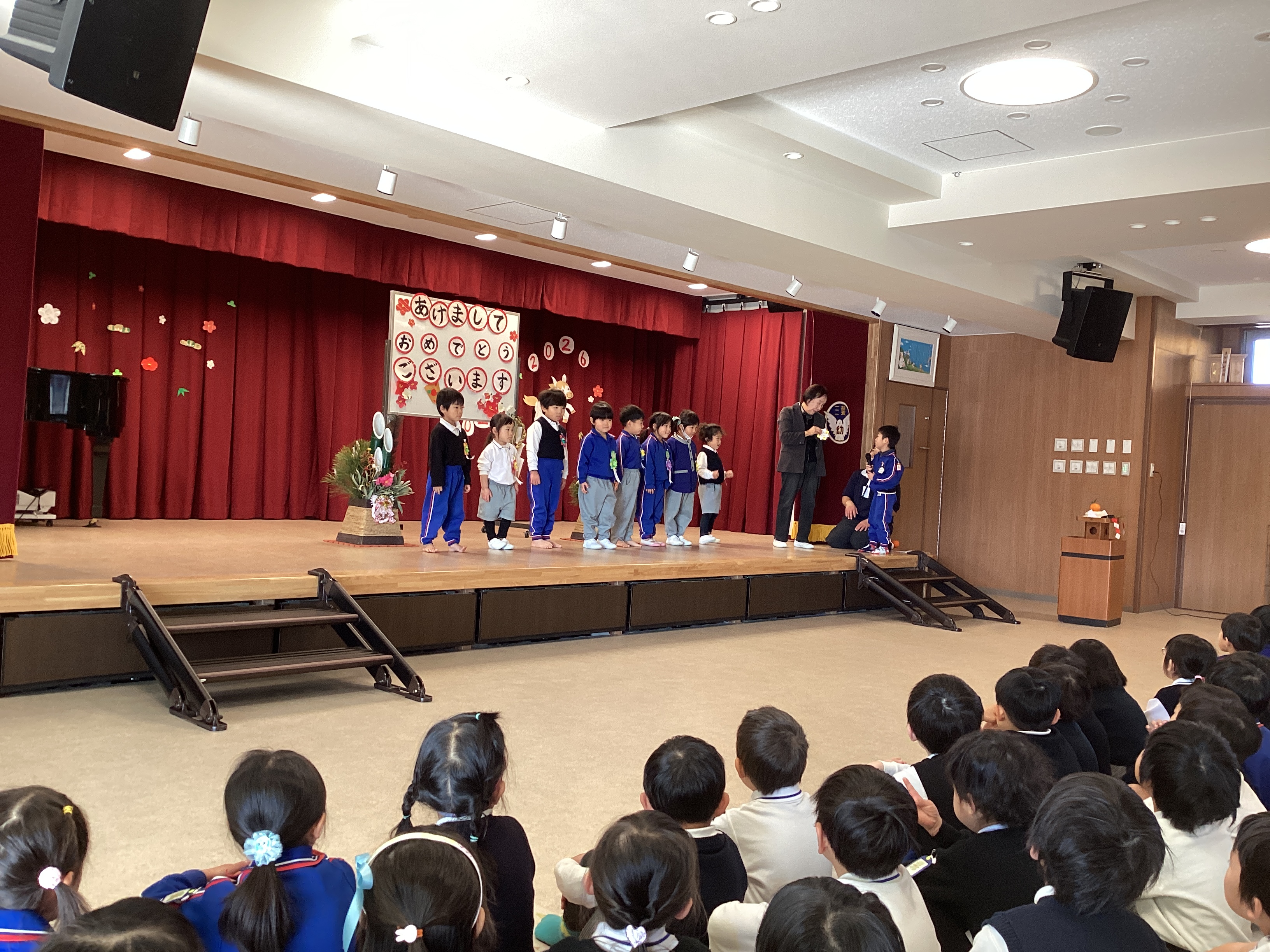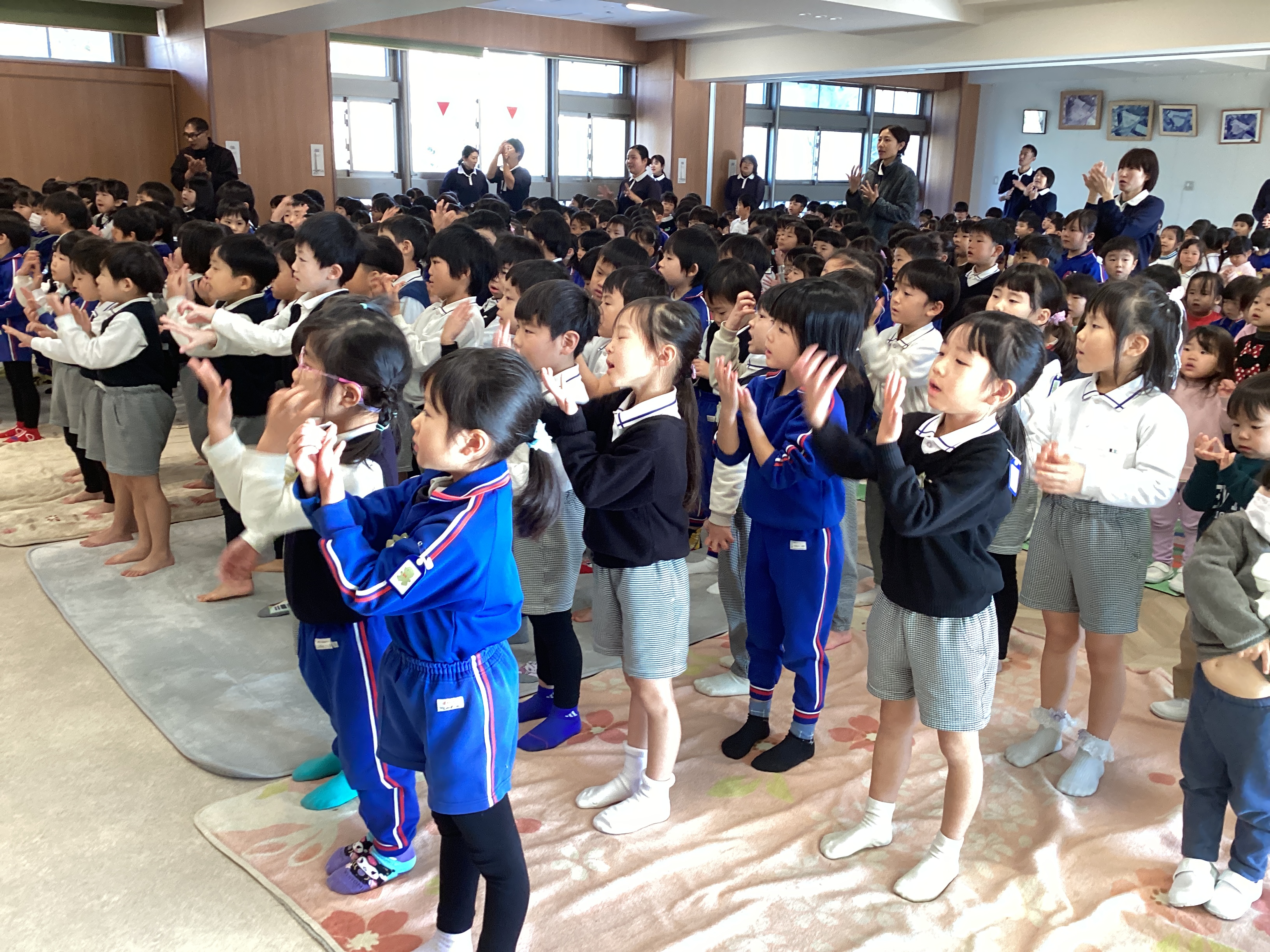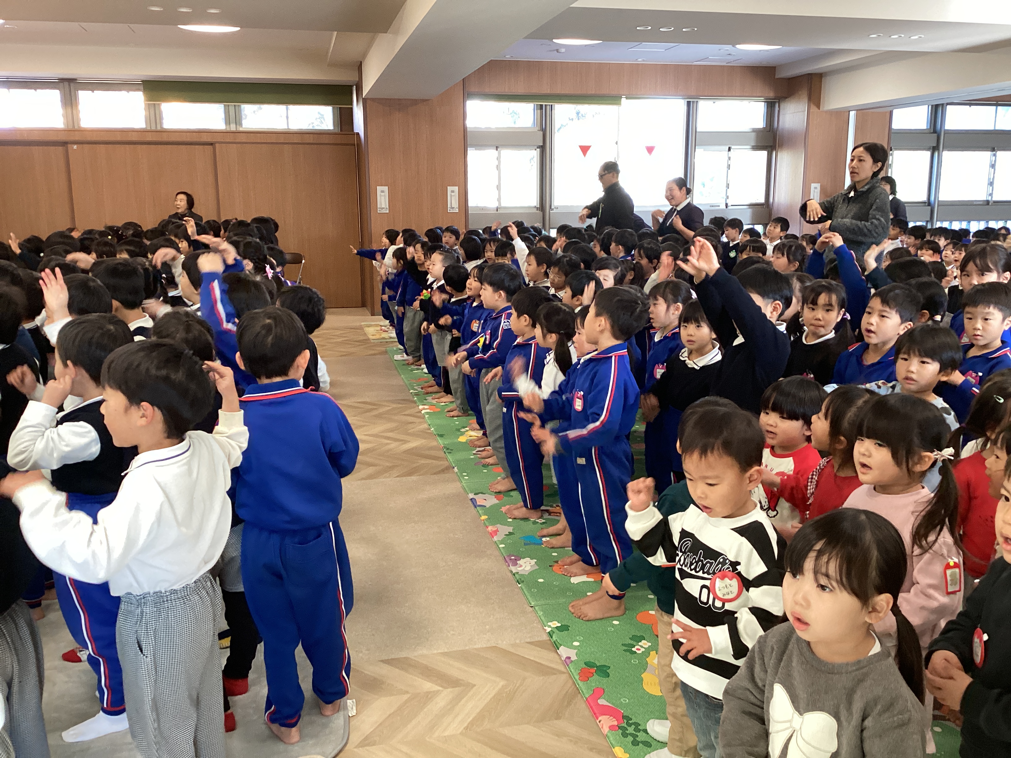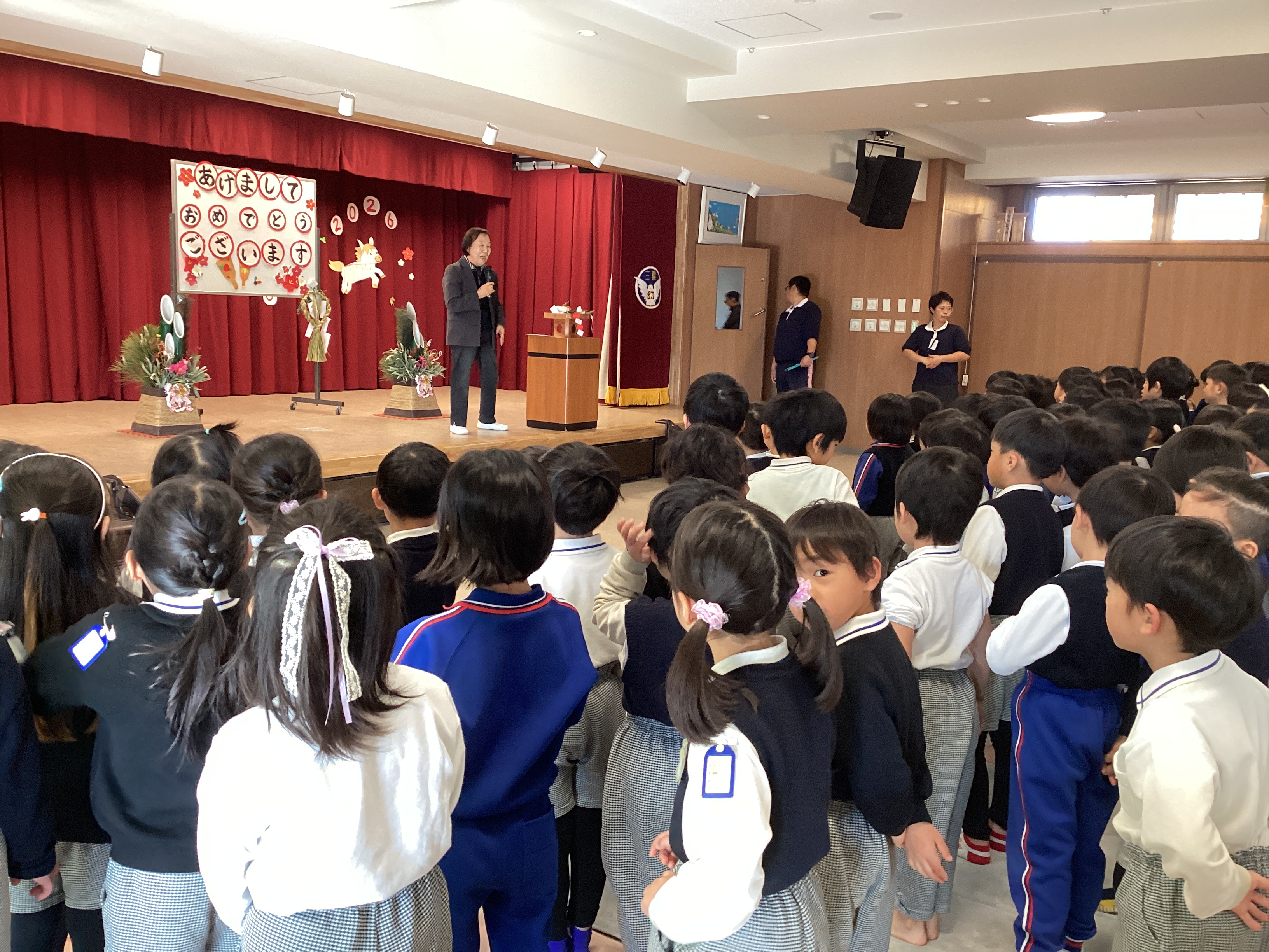 また、今日は3学期初日ということで始園式がありました。たんぽぽ組の子達もホールに上がる時は大切な話がある時ということを理解していて、静かに階段を上がっていました。いつもは朝の挨拶「おはようございます」からはじまるのですが、今日は新年初めての登園日だったので「あけましておめでとうございます」とみんなで挨拶をしました。園長が「1年があけてはじまりました。今年も1年頑張ろう!」と話をしてくれると、残り3ヶ月で卒園、進級をするということでそれぞれの学年で意識をする姿がありました。園長が「赤ちゃんじゃないからね。お兄さん、お姉さんだよ」と話をしてくれると、プレ年少組の子ども達にとってはその言葉はとても効果的で、部屋に帰ってからも「赤ちゃんじゃないから!」と嬉しそうに言っていました。少しずつ出来ることが増えてきて、自分でしたいという気持ちが芽生えてきています。今度年少組になることを楽しみにしているので、少しずつ準備を進めていきたいと思います。3学期には発表会があるということを話していると、前に座っていたきりん組のH君は「発表会?発表会?」と前のめりになって聞いていました。とても楽しみにしている姿が可愛いらしかったです。「今年は何年?」と聞くと、「うま年!走るのが早い!」と答えていました。「うまはいっぱいお仕事をしているんだよ。競争して走るし、昔は田植えの仕事を手伝っていたんだよ!」と園長が話をしてくれると、みんなびっくりしつつ興味深そうに話を聞いていました。