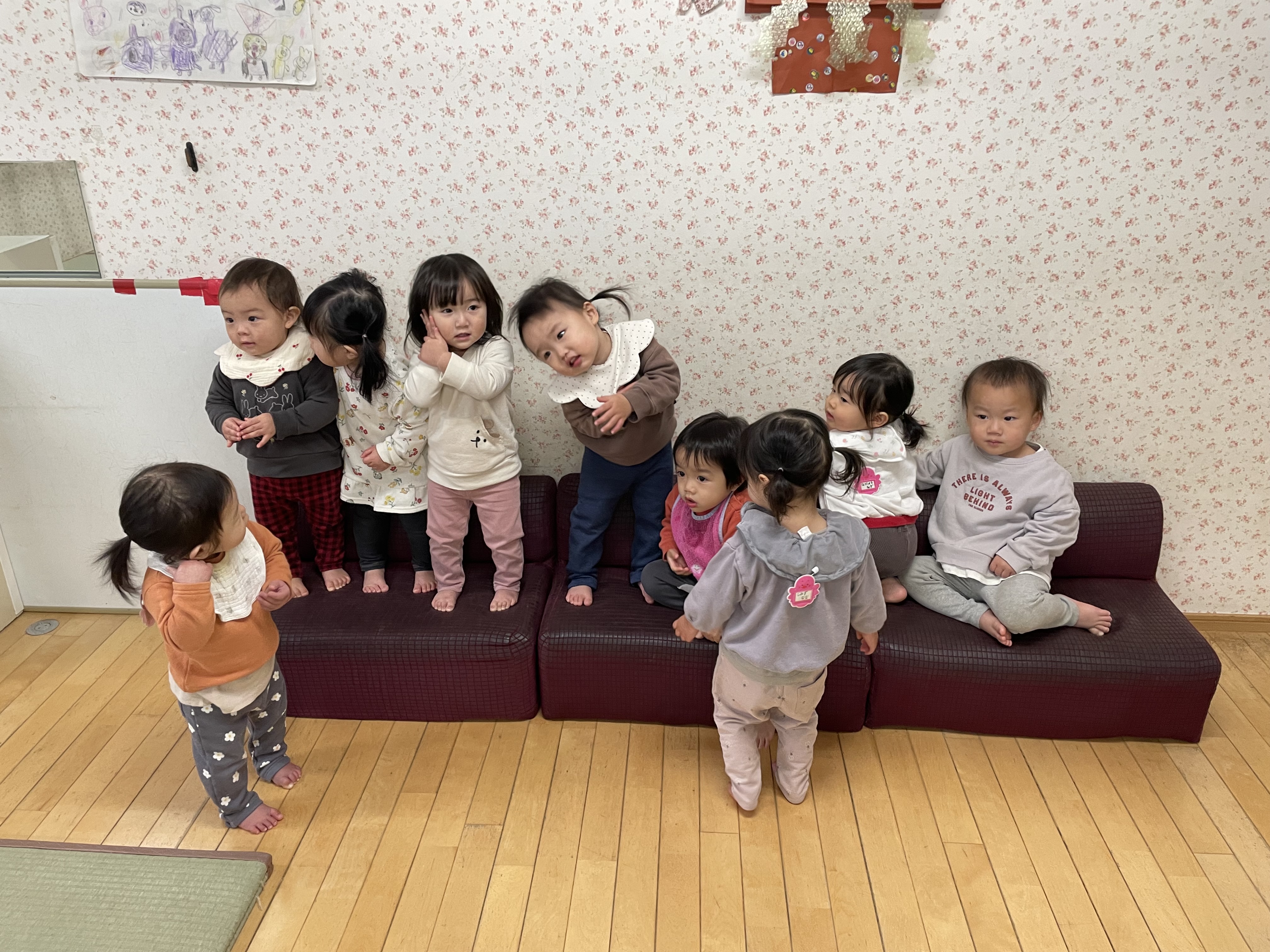 冬休みが終わり、お休みしていた幼稚園児と1部の保育園児達も登園してきました。もも組の子ども達はお正月明けに登園してくると、友達の真似をして遊ぶ姿が多く見られるようになりました。手遊びの曲をかけると1人がソファーを舞台代わりにして手遊びを始め、それを見た子ども達が次々にやって来ていつの間にか大勢集まってきて、方言まじりですが歌いながらしている子、覚えている所だけ歌っている子、それぞれなのですが、どの子も自信満々ですごく可愛い所作が見られます。