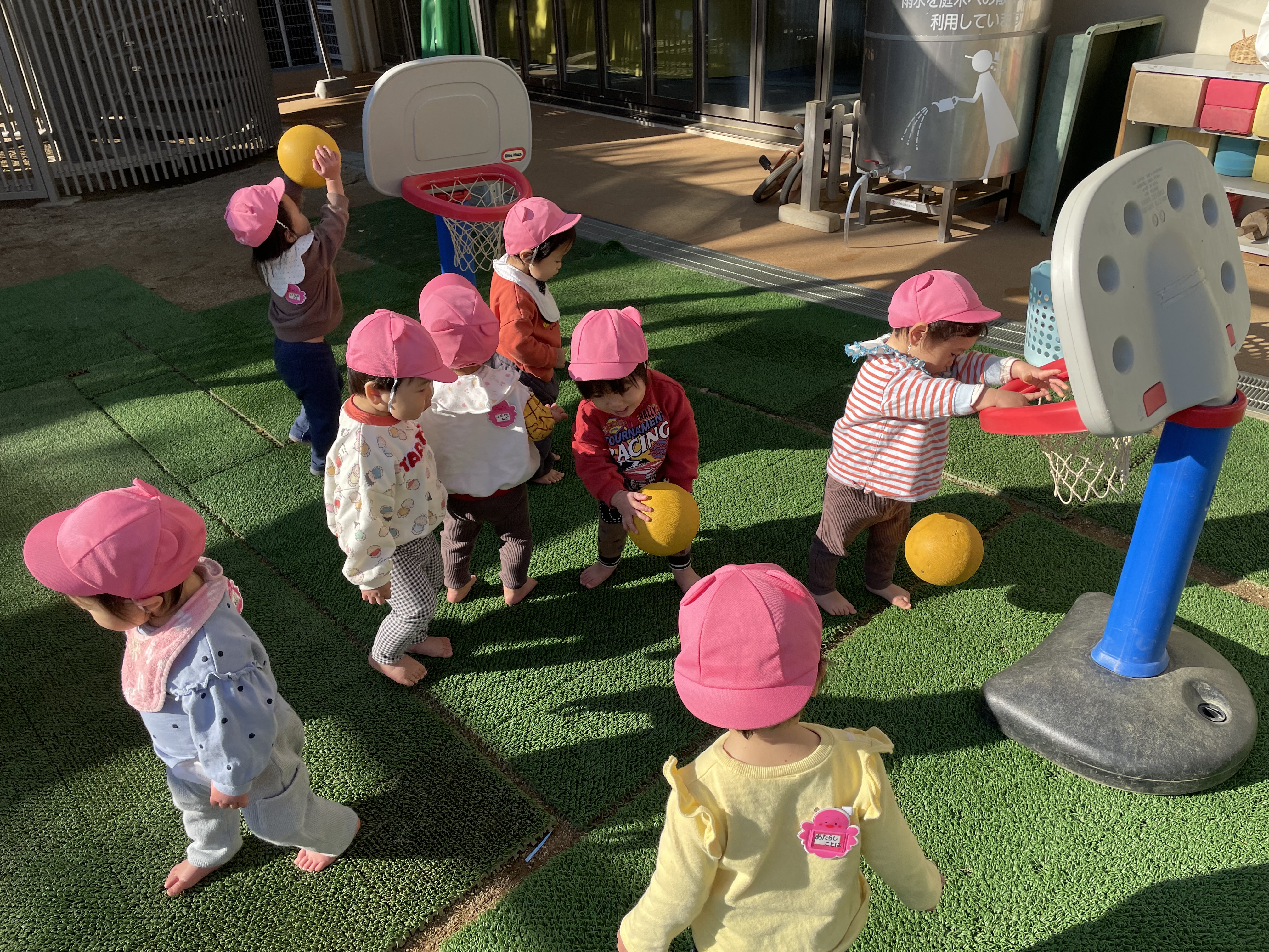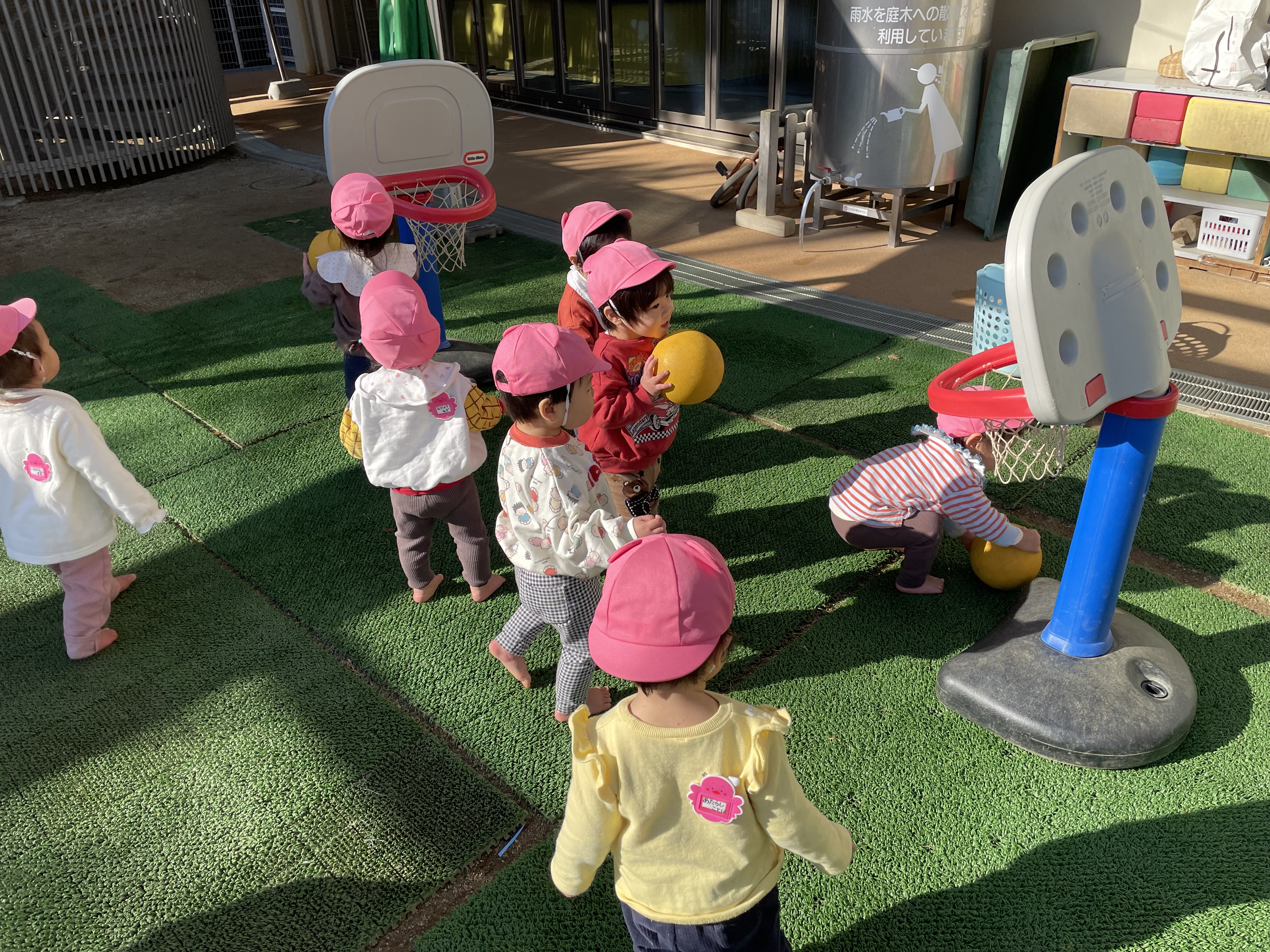 今日も1月とは思えない程、陽だまりは暖かかったので園庭の人工芝の広場へ遊びに行きました。子ども達はチクチクの人工芝を嫌がらないかな?と少し心配しましたが、全く気にする事なく遊び始めました。初めて幼稚園のバスケットゴールで遊びました。みんなが入れられるように高さを調節していたので、ほとんどの子がゴールする事ができ、大喜びしていました。又、しっかり友達にボールを「はい。どーぞ!」と渡してあげている子の姿も見られ、もらった子はペコッと頭を下げたり、「あーと。」とお礼を言ったりしていて、微笑ましいやり取りが見られました。