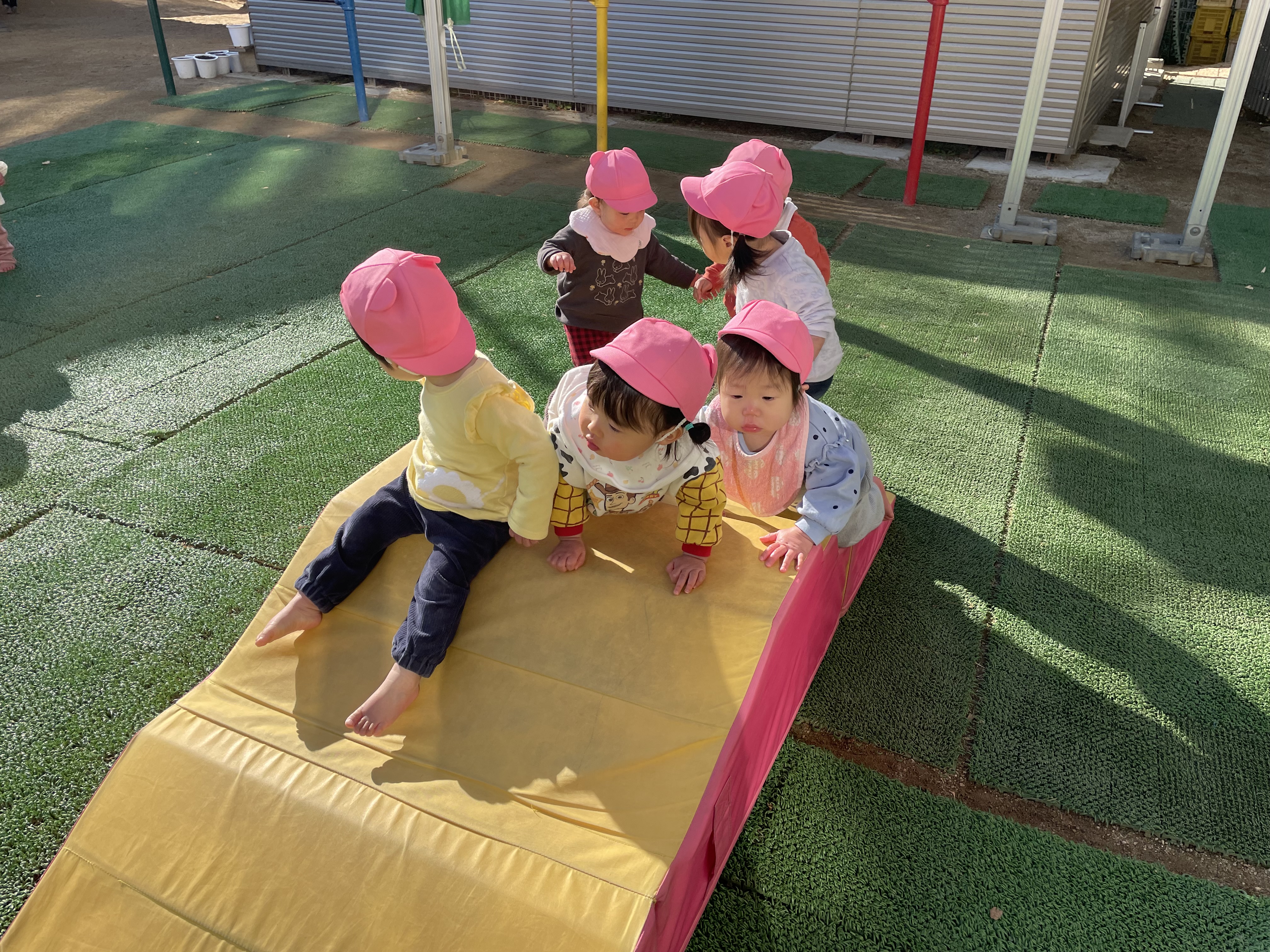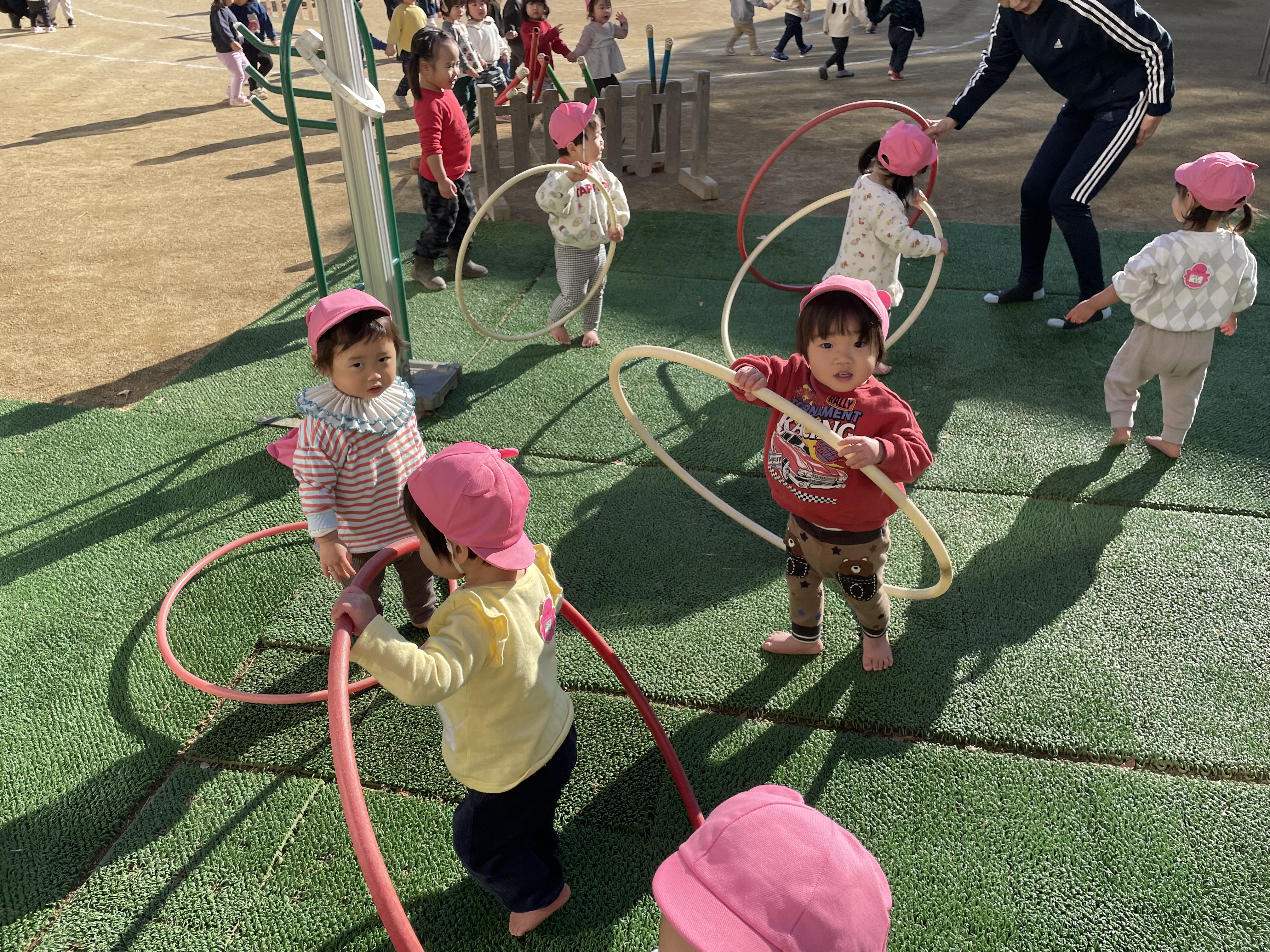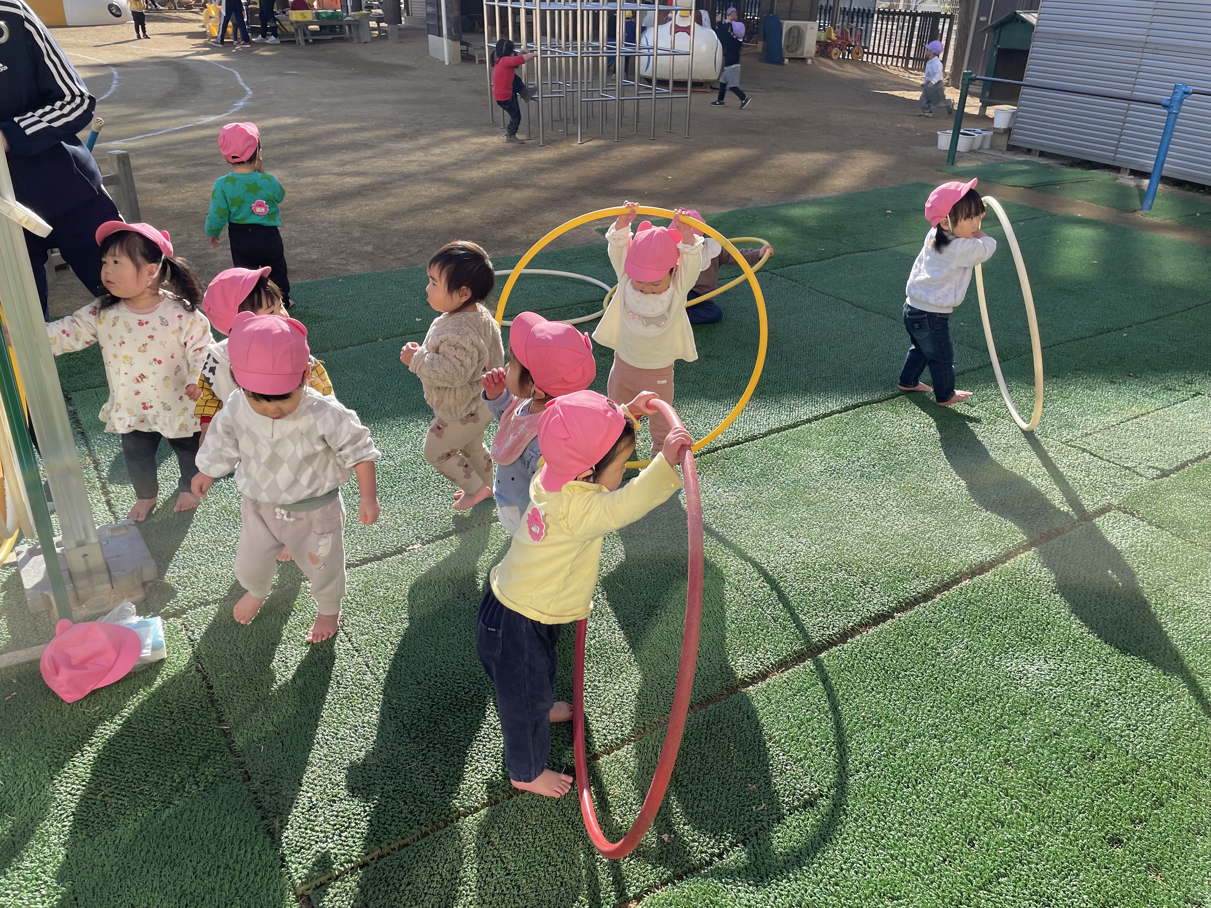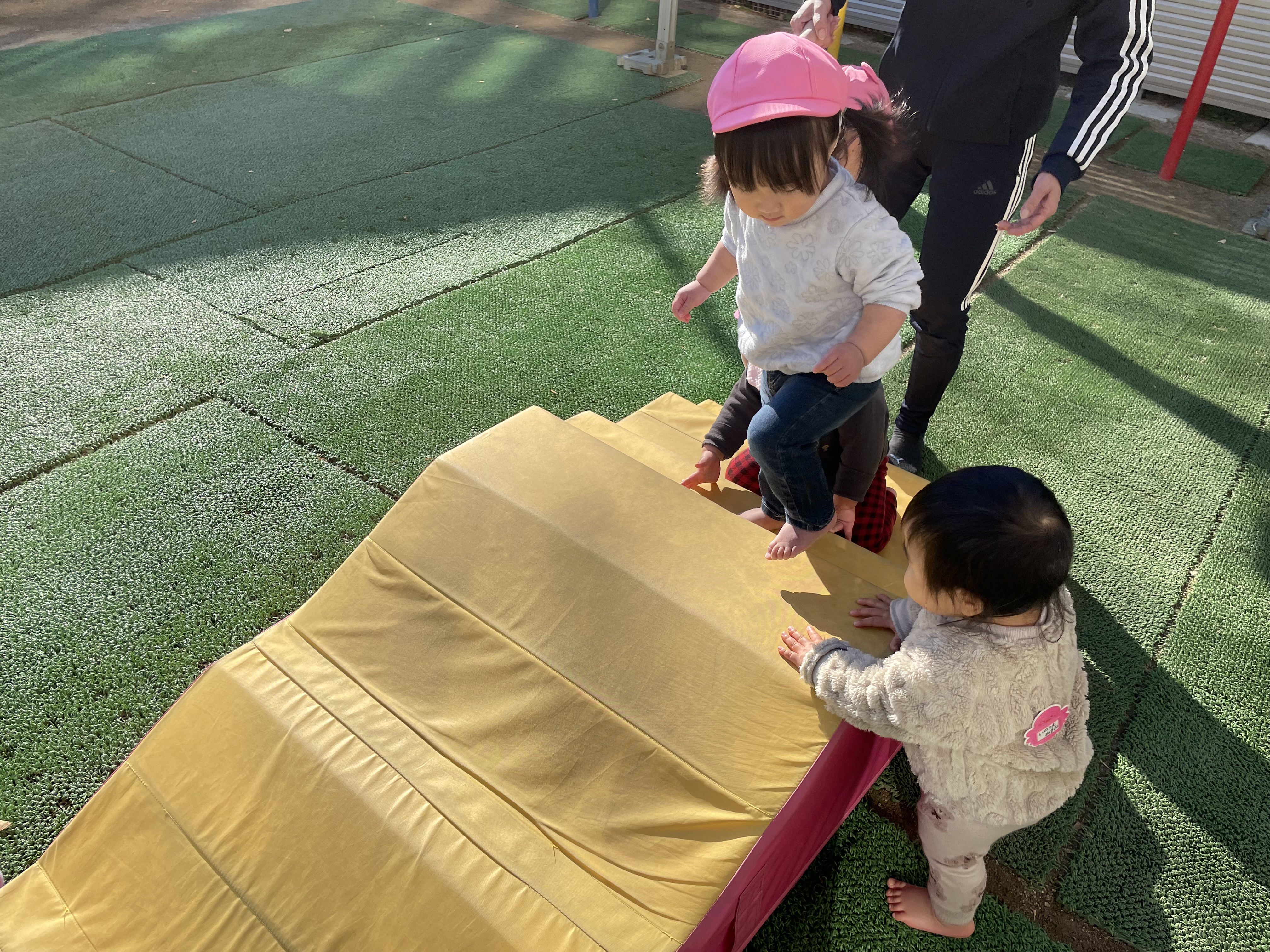 又、フラフープを転がして見せると目をキラキラさせて追いかけたり、転がしてみようとしたり、更にくぐったり、フラフープを置いてその中をジャンプしたりと子ども達なりにたくさん考えて遊んでいました。一方、すべり台ではあっちこっち移動しながら忙しそうにたくさん体を動かして楽しんでいました。まだまだ寒さもこれからですが、暖かい時にはなるべく日光浴をしながら、たくさん体を動かして遊び、心も体も健康に過ごす事ができるようにしたいと思っています。