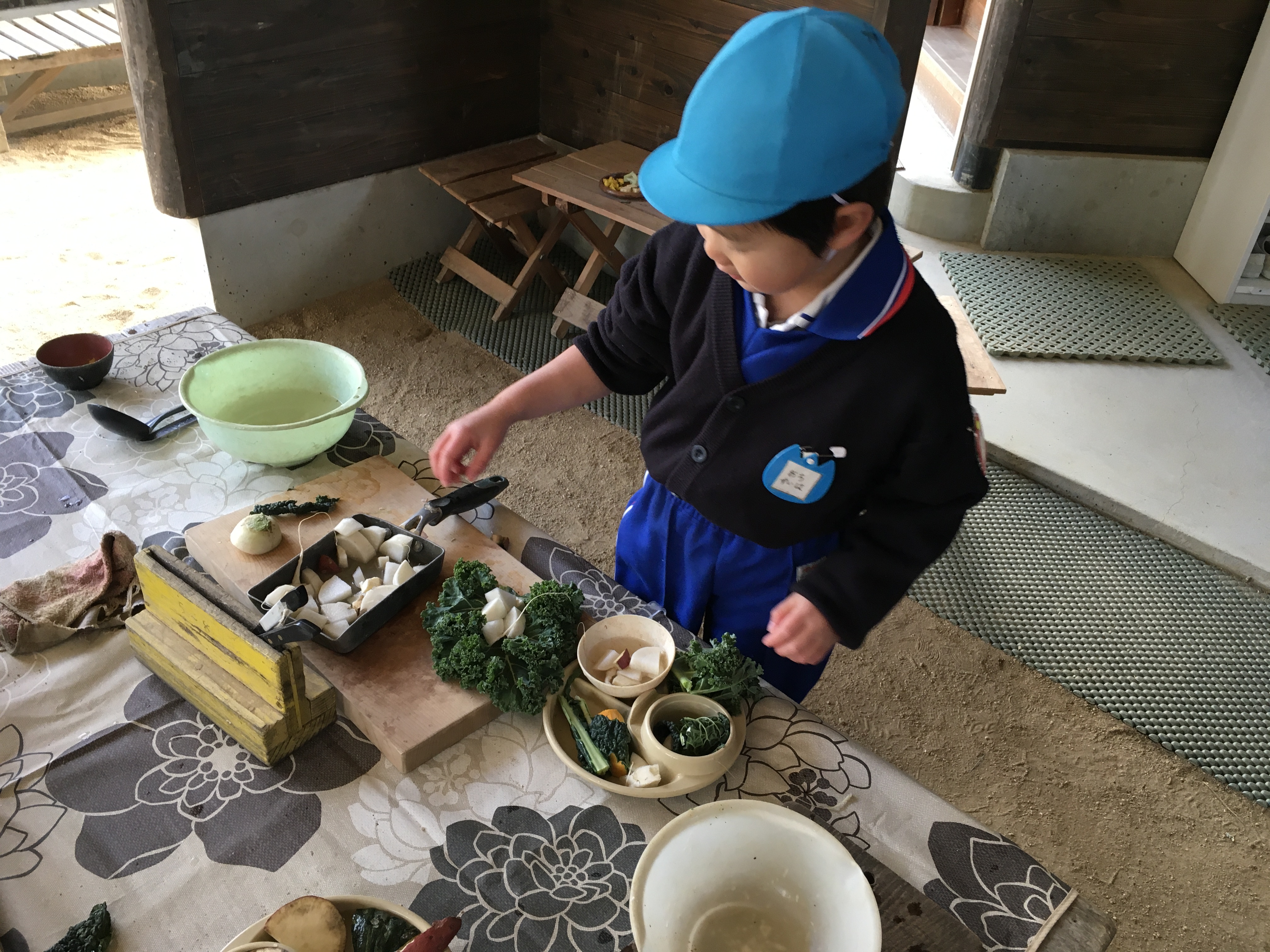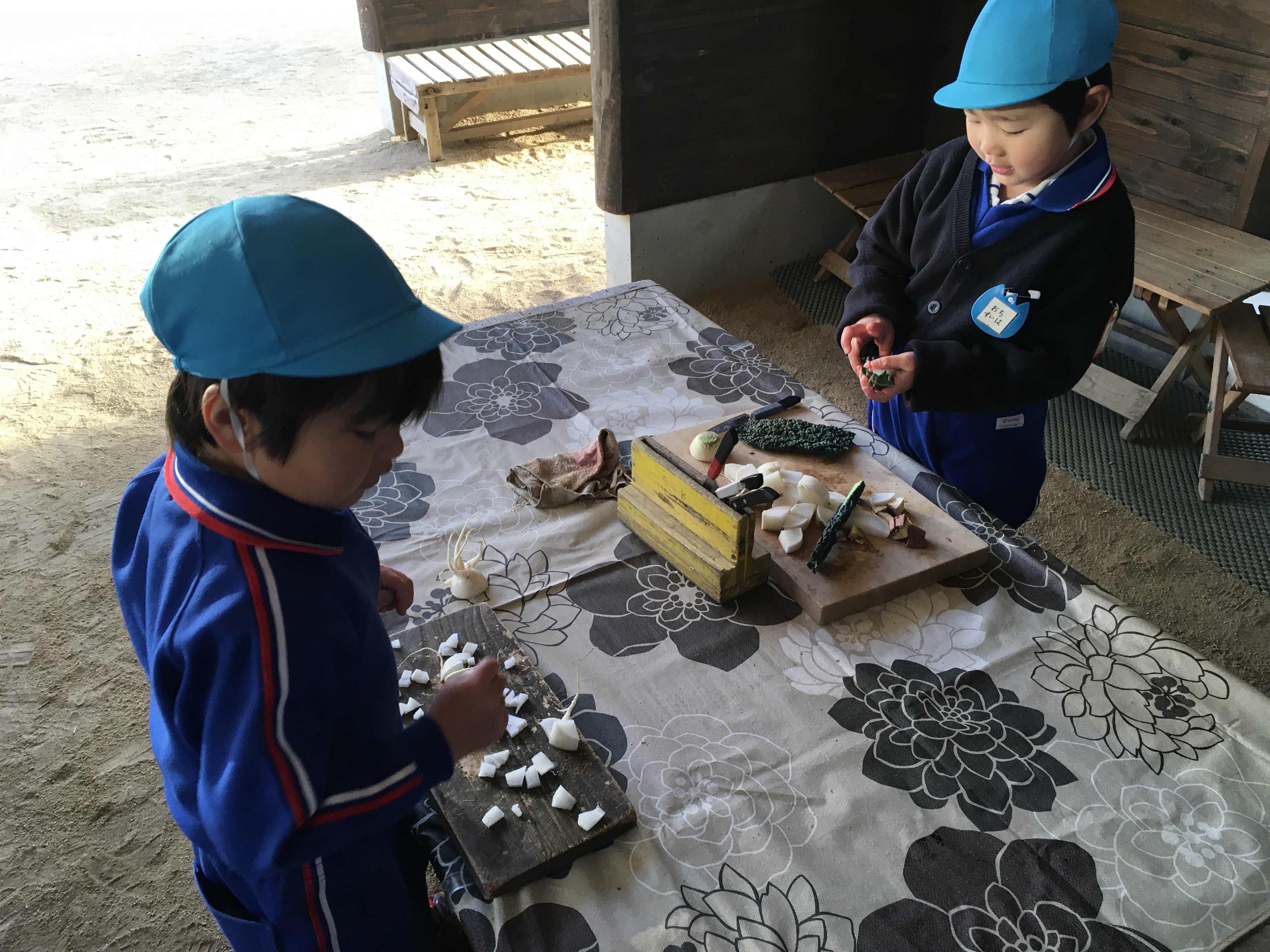 こども館の下のままごとのコーナーでも子どもたちの楽しそうな声が聞こえていました。すみれ組のHちゃんは、かぼちゃを持ってくると皮の部分を上手に切って、みじん切りにしていきました。そして、小さなお皿にのせると「サラダができた!」と嬉しそうに見せてくれました。またその隣では、ぱんだ組のSくんが大根を切っていました。何を作っているのか見ていると、切った大根をくるんと大根の葉っぱで巻いてロールキャベツを作りました。そして、いろいろな野菜を使って、たくさんの料理を作ると、上手にお皿に盛りつけていきました。Sくんは完成すると、「これがさつまいものおしるこ。これが前にママが作ってくれたロールキャベツ。そしてこれが、かぼちゃ揚げパイ。誕生日にパイを作ったの!」と話してくれました。その話を聞きながら、Sくんは鏡開きで食べたおしるこを思い出したり、おうちで作ってもらったおいしい料理を思い出したりしながら、自分がこれまでに経験したことを今日の遊びにつなげているのだと感じました。