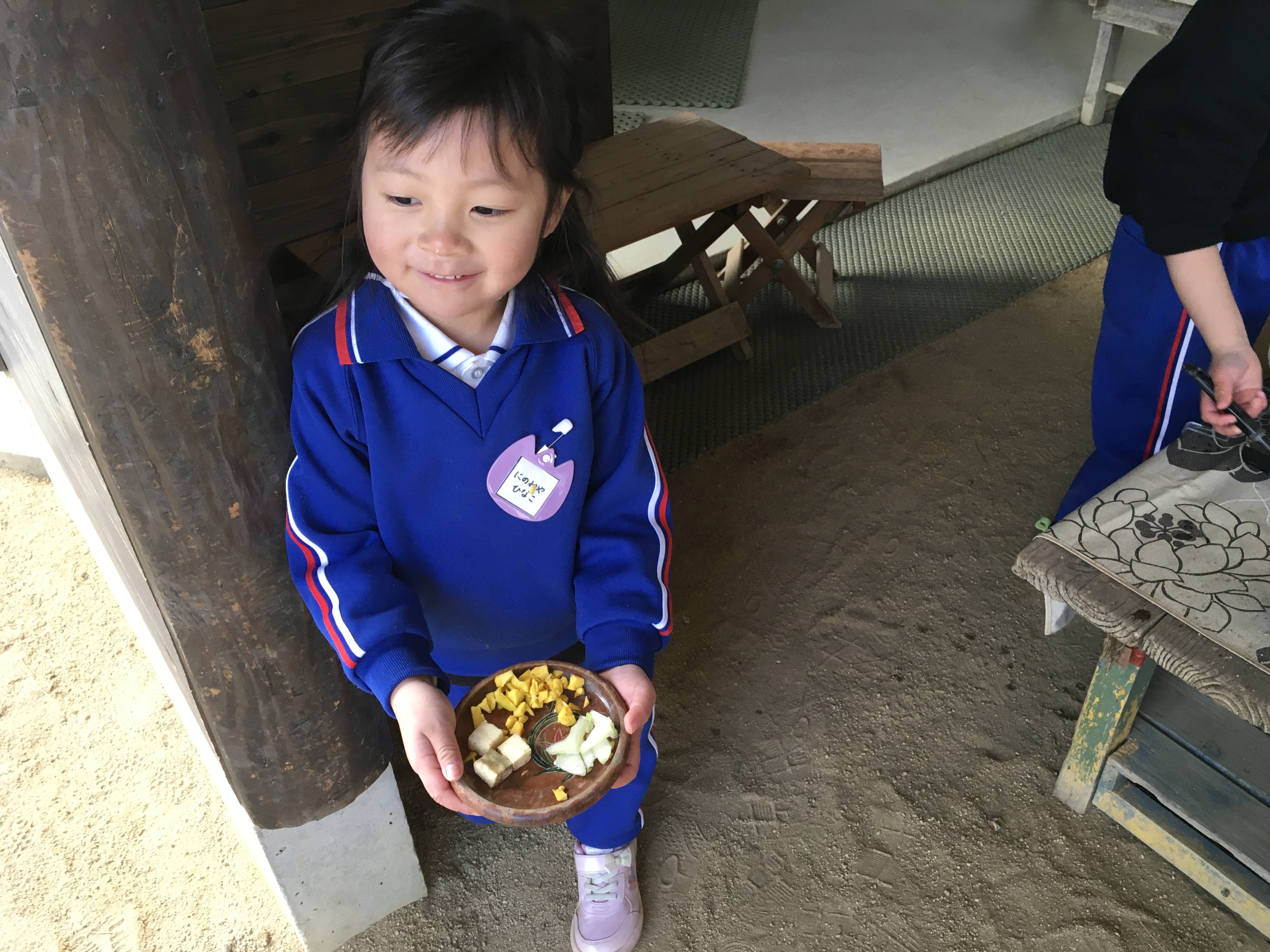 園庭で元気にひとしきり遊んだ後(10:00頃)は、お味噌汁大作戦の時間です。外で遊んでいるときにも、ぱんだ組のAくんが「幼稚園のお味噌汁は、温かくて目が覚める!!」と言ってしまうほど、子どもたちが大好きな時間です。今日の味噌汁の具材は、ちくわと玉ねぎでした。すみれ組の子どもたちも、おいしい味噌汁を飲みながら、「あったか~い!」「元気いっぱいになった!」と口々に言っていました。