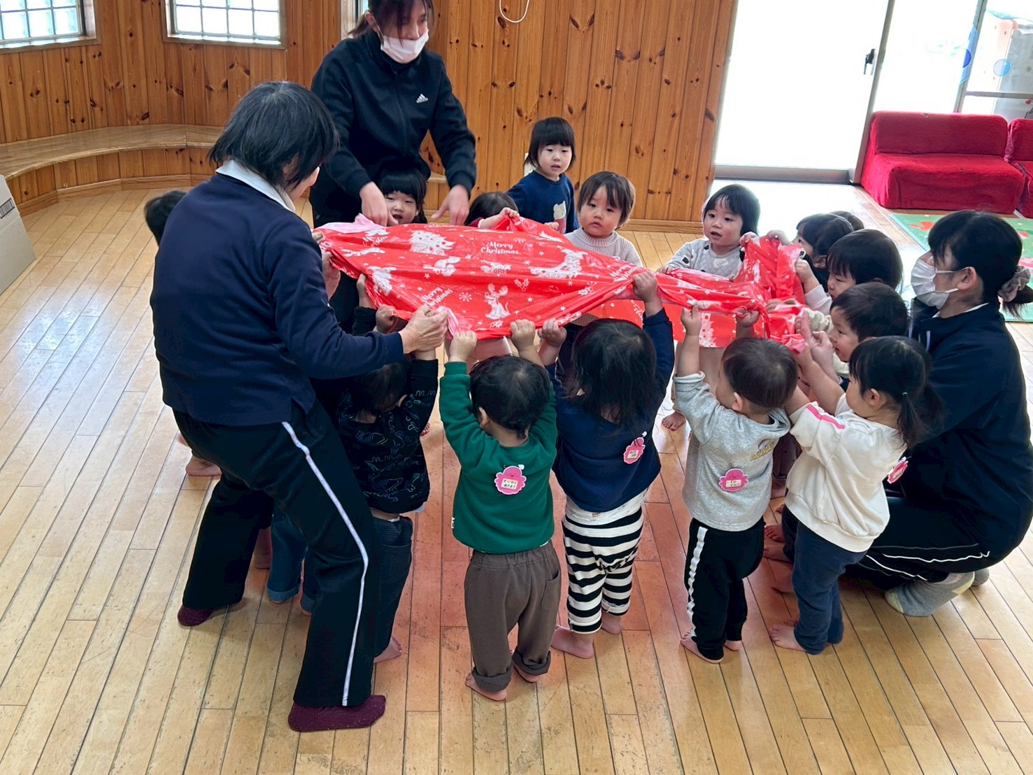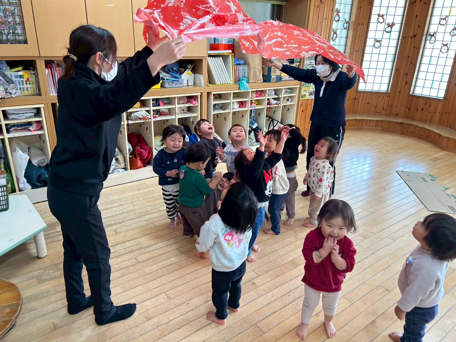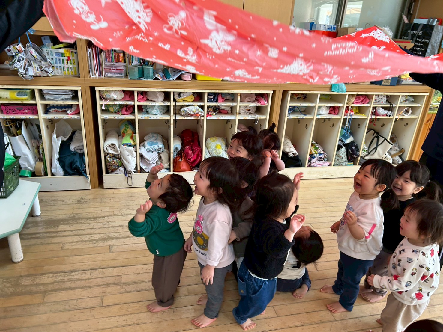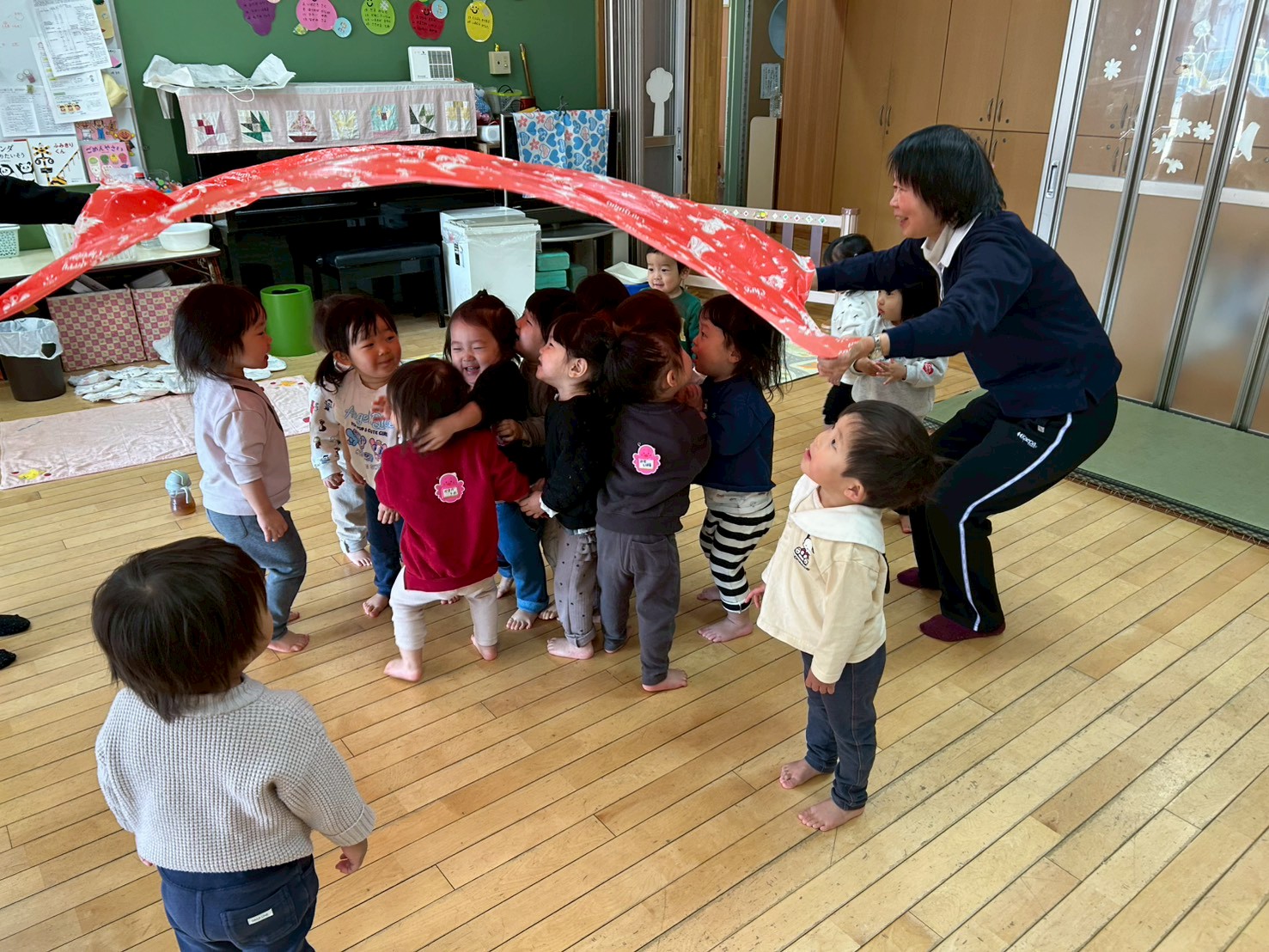 「みどりした。」「ぬりぬりした。」と満足そうに言う子がいる中、使ったビニールシートを拭き干しておこうとすると子どもたちの手が伸びてきて、引っ張り合いになりました。「ひっぱらないでー。」と困り顔の保育教諭をよそに、バサバサと動くシートに大喜びの子どもたちと、いつのまにかバルーン遊びのようになっていました。上下に動かすたびに大歓声!バルーンが逃げるとみんながくっつき合ったまま追いかけてきて、またその姿がとってもおもしろくかわいかったです。大喜びの子どもたちを見ると私たちももっともっと!楽しませたい!と力が入ります。最後はみんなで持って「うえ~、した~。」と上下させて遊び、気付くとシートはすっかり乾いていました。