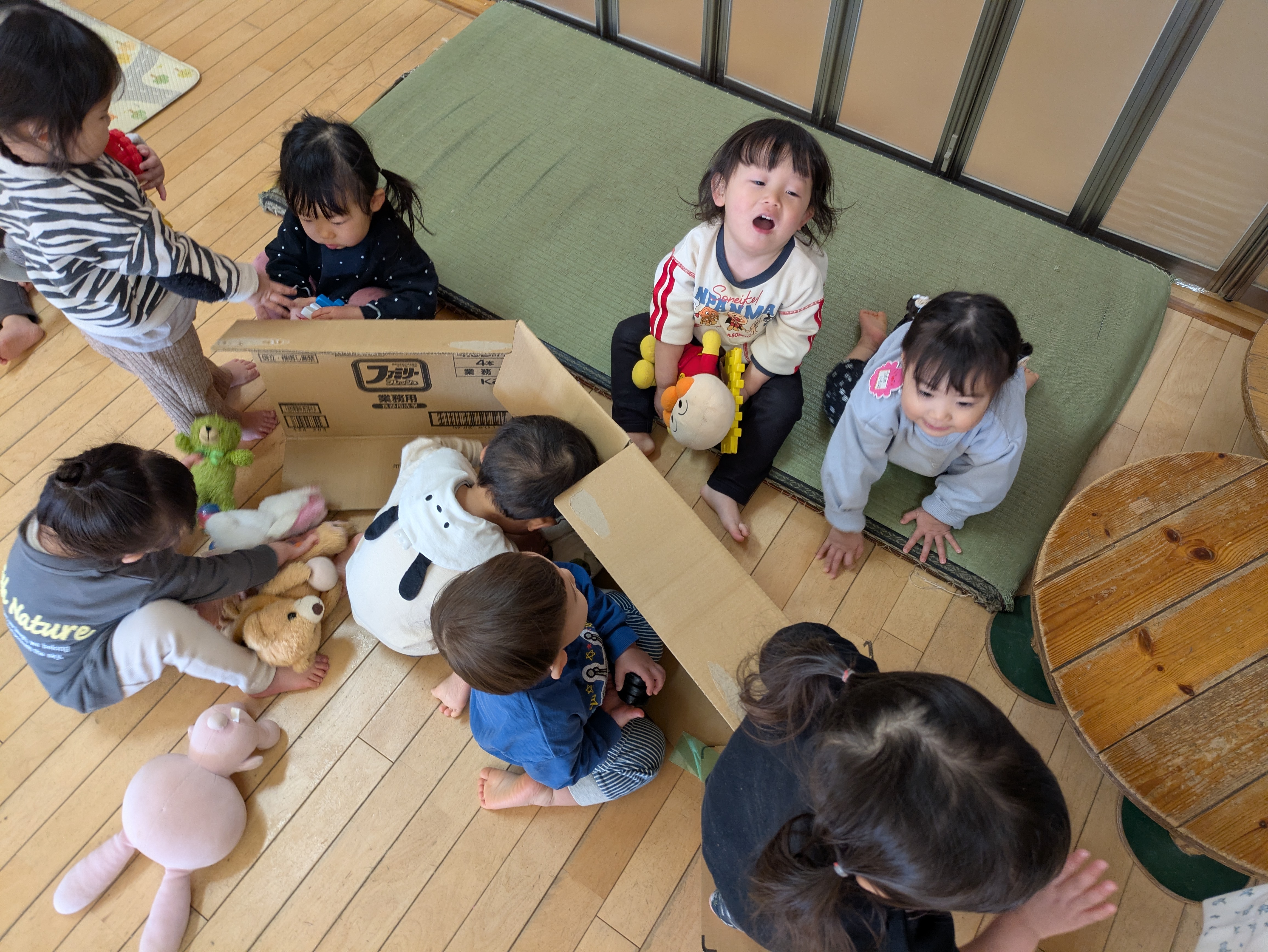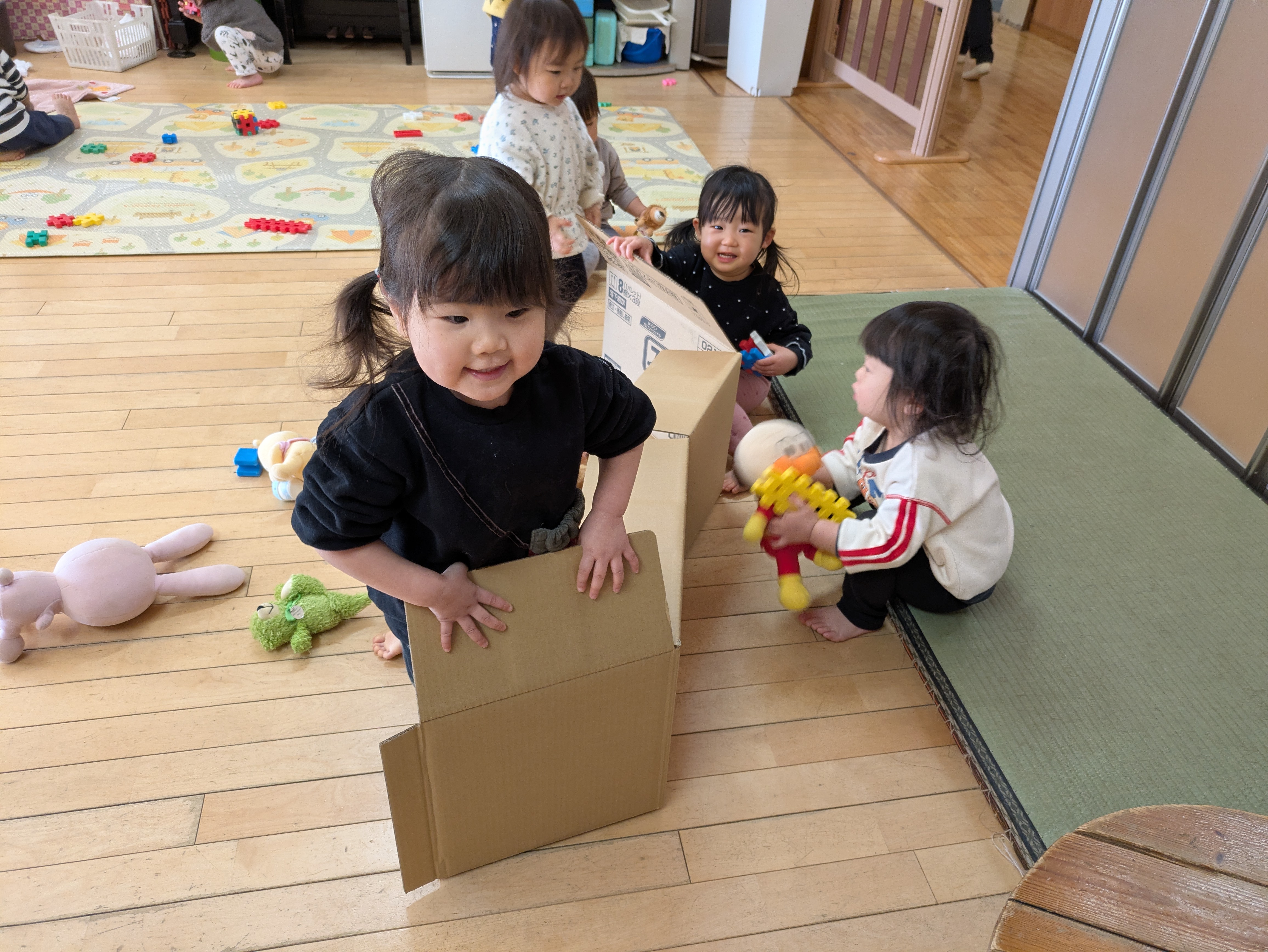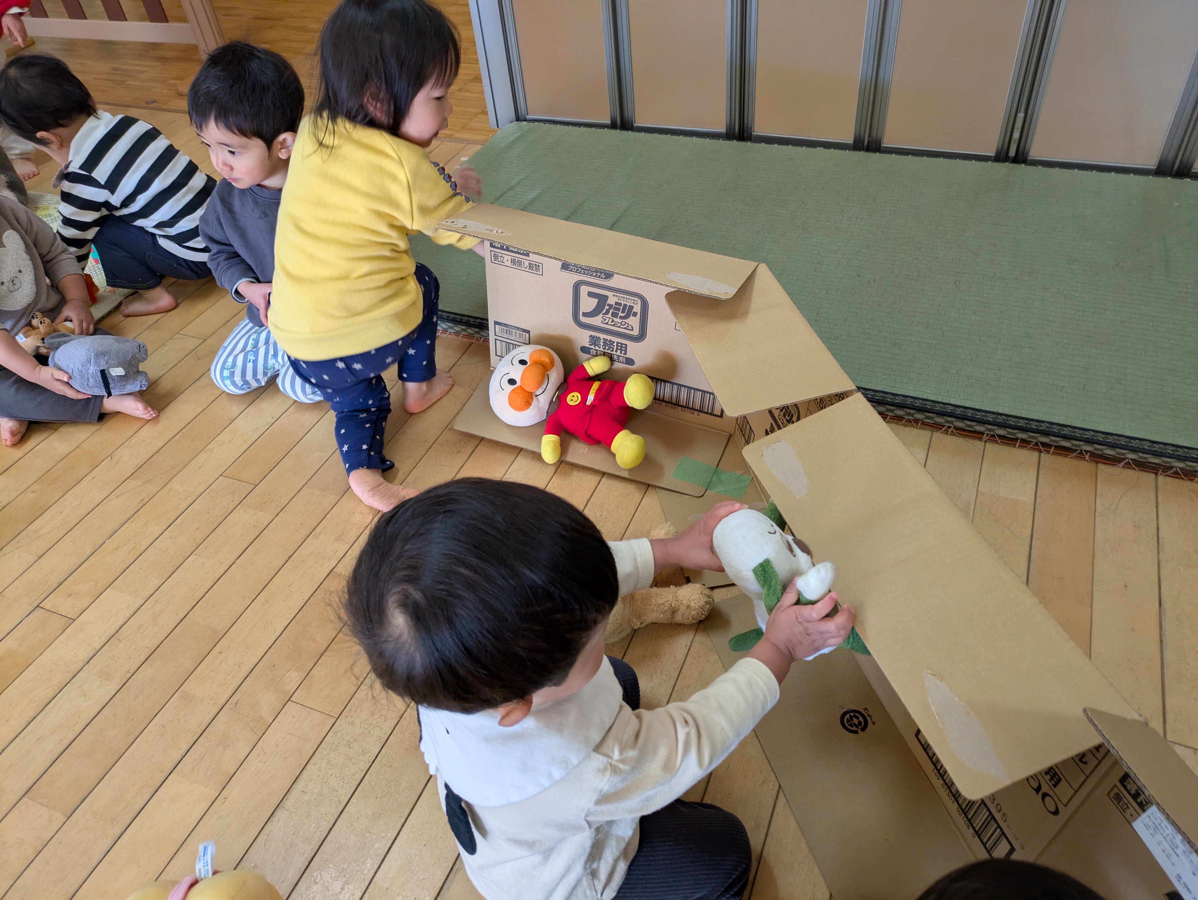 さて1ヵ月後には保育園のおゆうぎ会があります。各クラス、少しずつ遊びの中で準備や練習を進めています。みかん組ではいろいろな動物のお面をつけて踊る予定です。「○○はきつねさん。」「△△はぶたがいい!」としっかり自分のやりたいことを伝えられる子もいれば、毎日なりたい動物が変わっていろんなお面をつけたがる子もいます。無理強いすることなく表現することの楽しさを感じられるよう、遊びや生活の中で少しずつ意識づけをしていきたいと思います。そん中、舞台で使う『草』を作ることにしました。段ボールを広げたものを出し、このくらいの高さかな?などと考えていると、すぐに子どもたちが集まってきました。「これなにー?」と持ち上げてみる子、身体を小さくして隠れると「ばあっ!」と顔を出す子、ぬいぐるみを持ってきて並べたり(隠したり?)する子もいました。