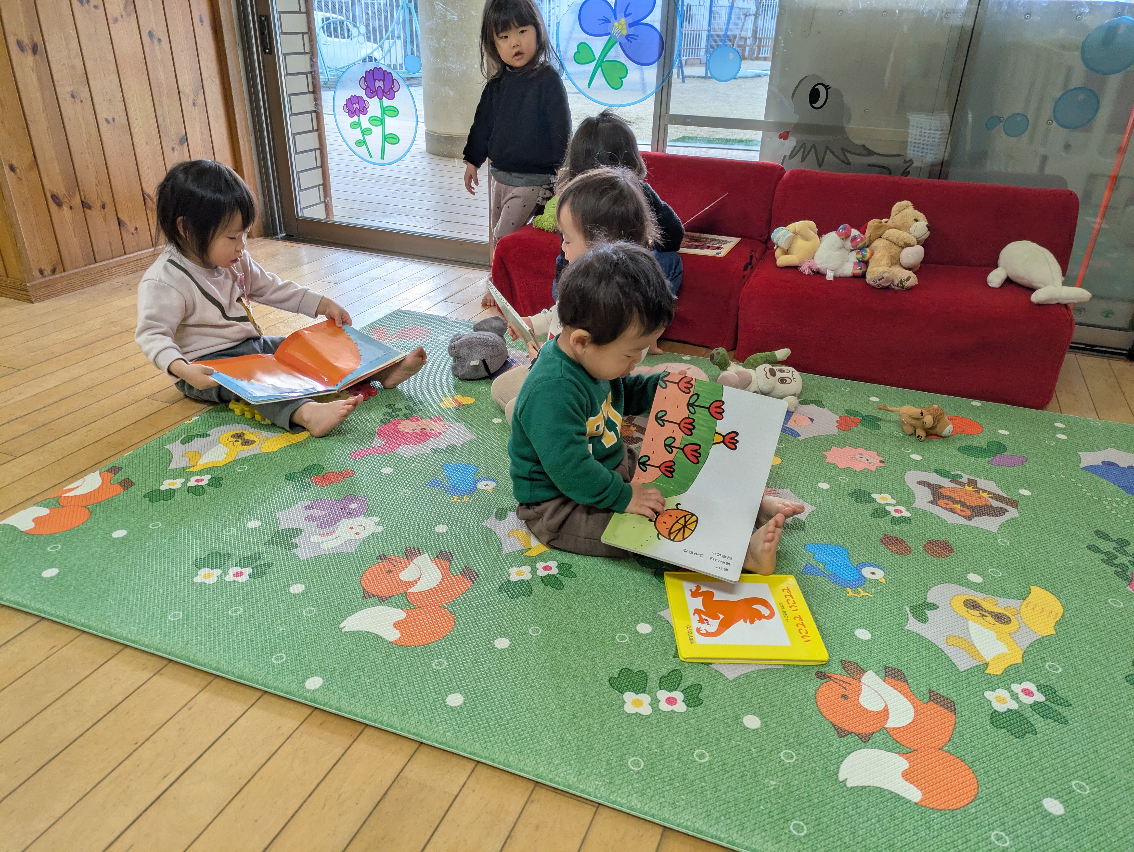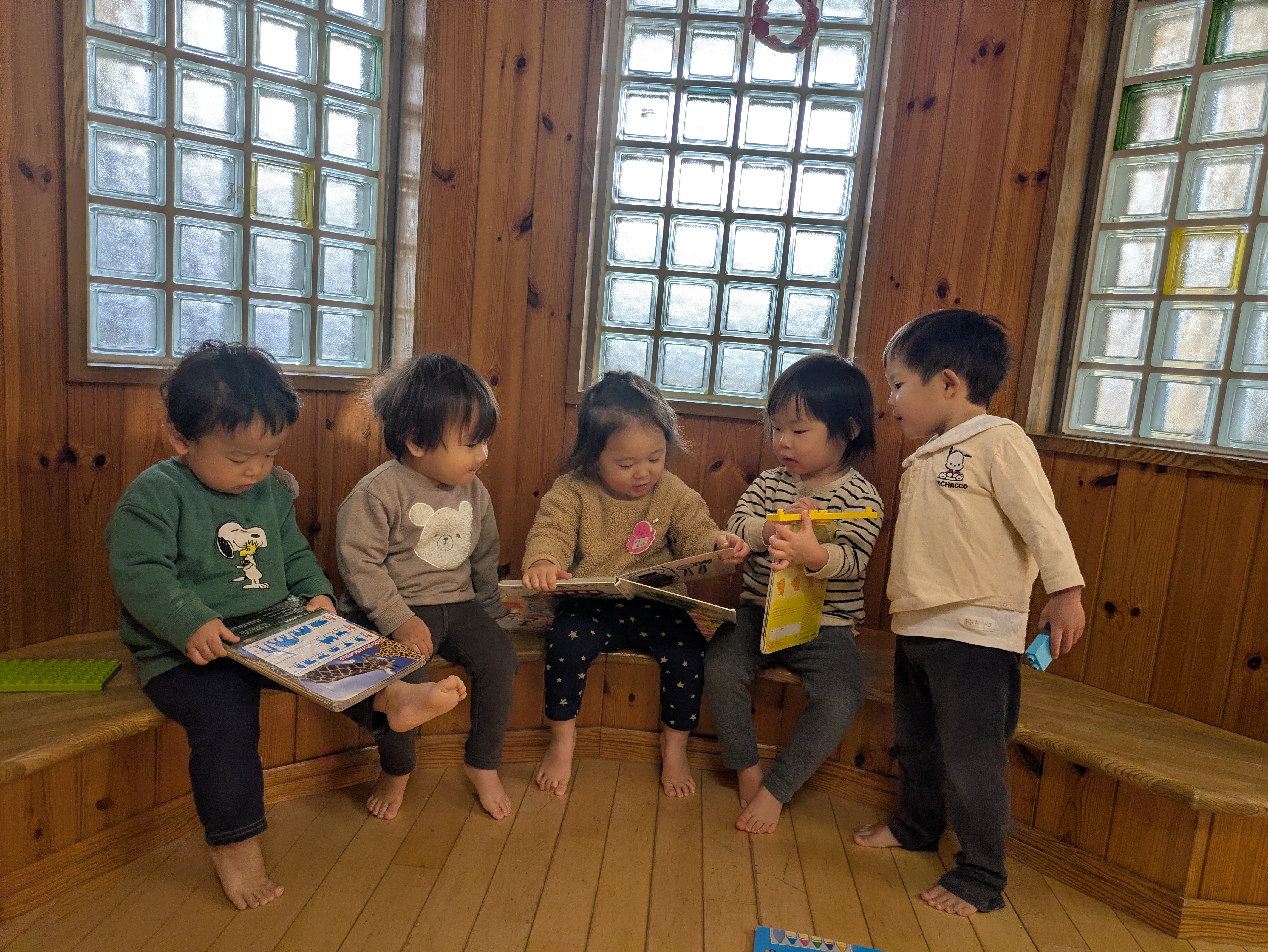 みかん組は毎朝登園してくると、少しの間もも組保育室で過ごしてから、みかん組保育室に移動しています。自分の持ち物を片付けると、好きな遊びを始めるのですが、最近は絵本を見る子が多くなっています。今まで読んでもらった本は内容が分かっていて声に出して読んでいたり友達に向かって絵本を広げ「これは何でしょう?」などと保育教諭の真似をしたりしていて、朝のほっこりしたひとときです。