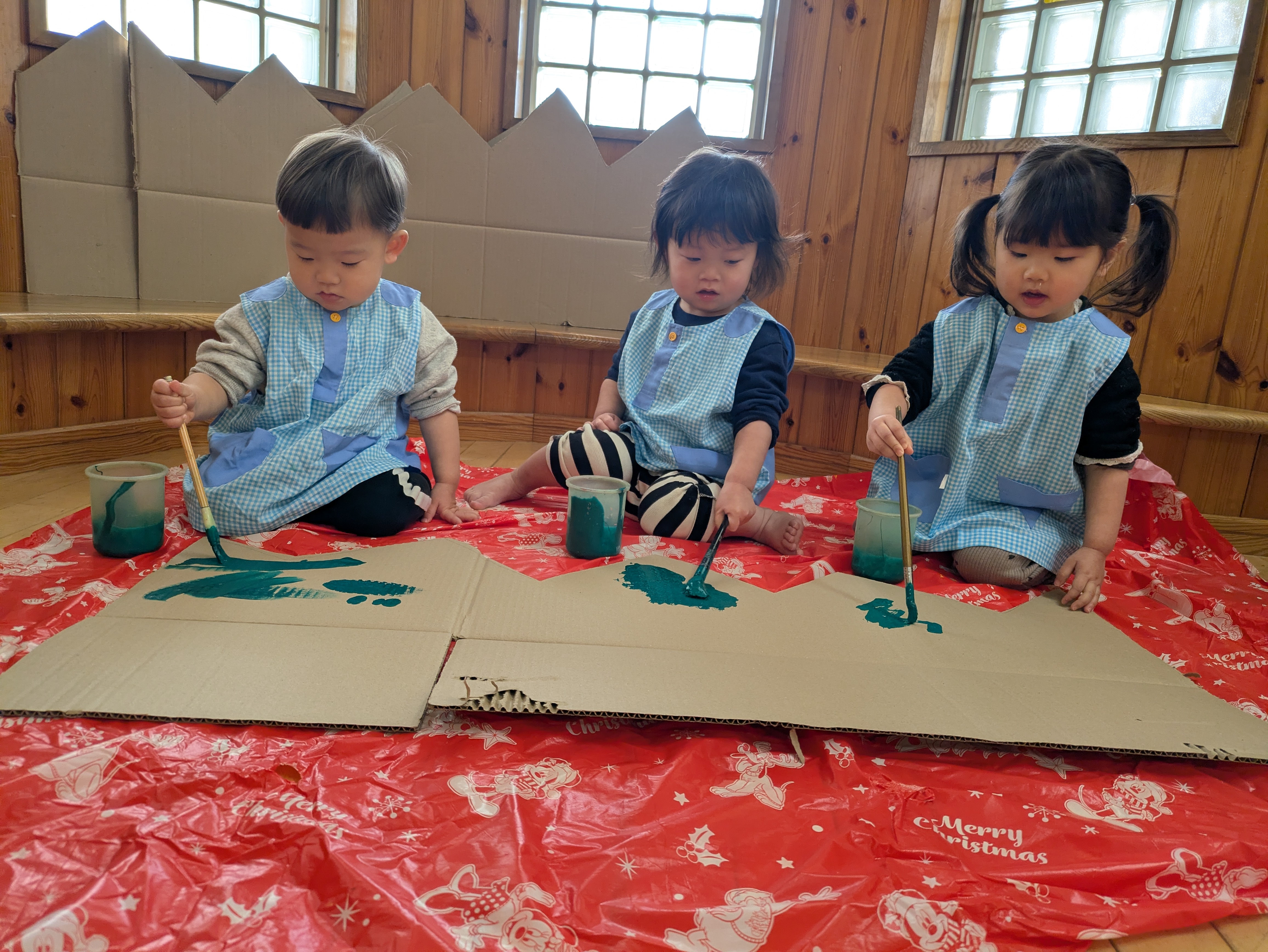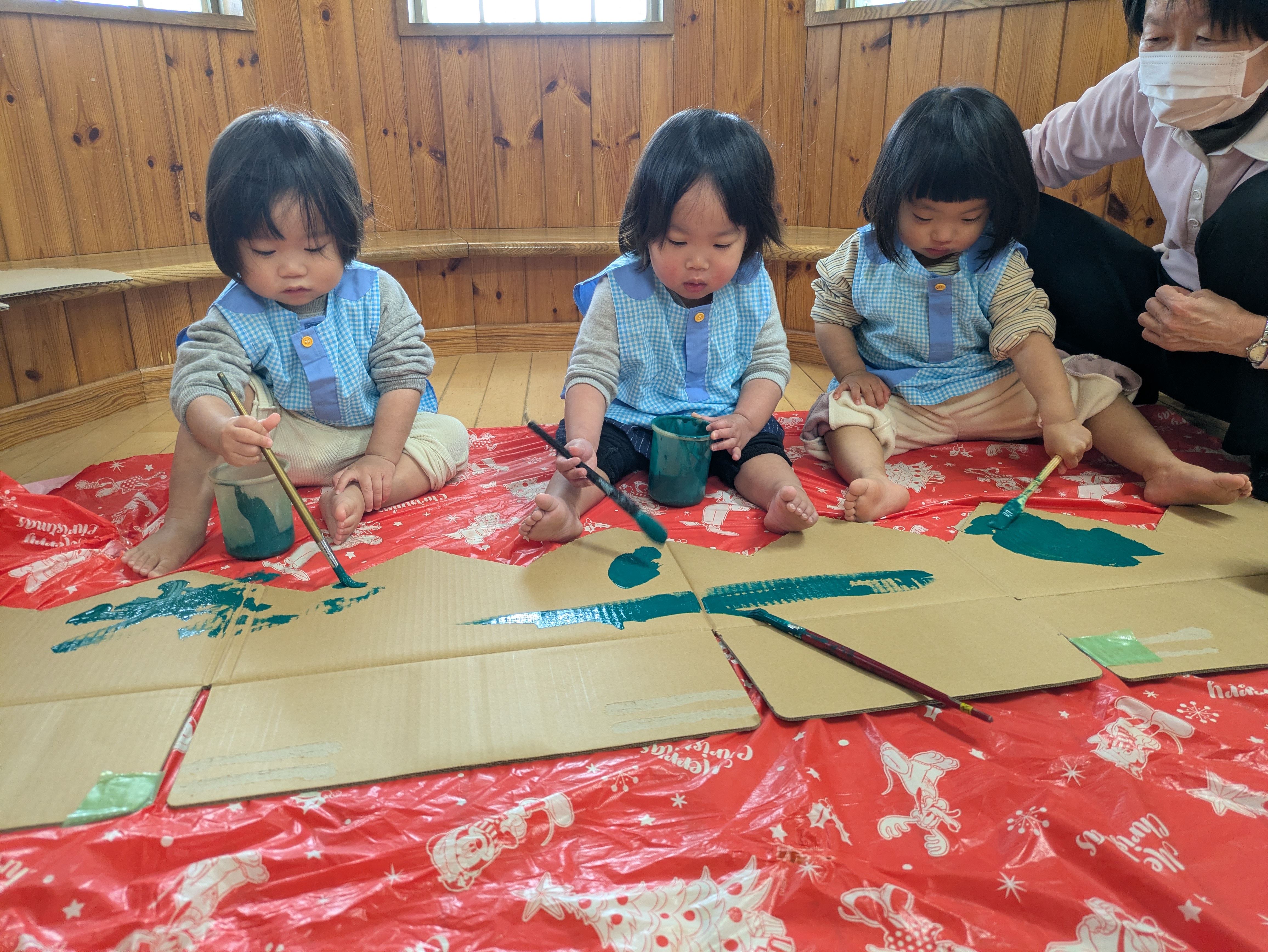 その段ボールを草の形に切り、絵の具で色付けしていきました。絵の具は筆を使いました。保育教諭が塗っていくのを見ながら子どもたちもそっと筆を下ろし、色がついて行くのを「あっ!」と確かめている様子でした。塗り方にも個性が出ます。大きく上下・左右に動かす子、ちょんちょんと少しずつ色を乗せる子。Kちゃんはまるでお絵描きのように丸や線を描いていき、Tくんは友だちが塗った後の空いている隙間を丁寧に塗りつぶしていきました。