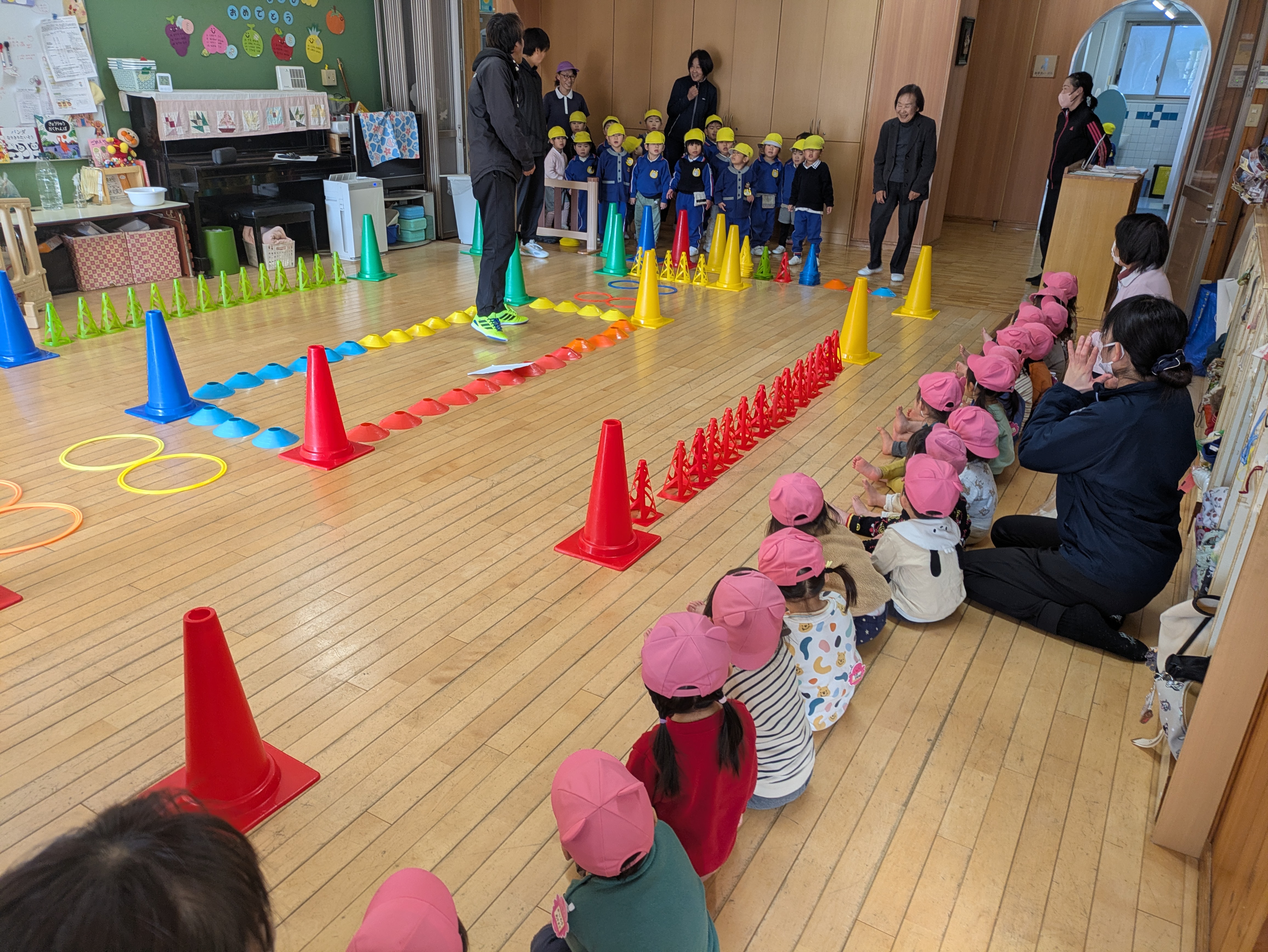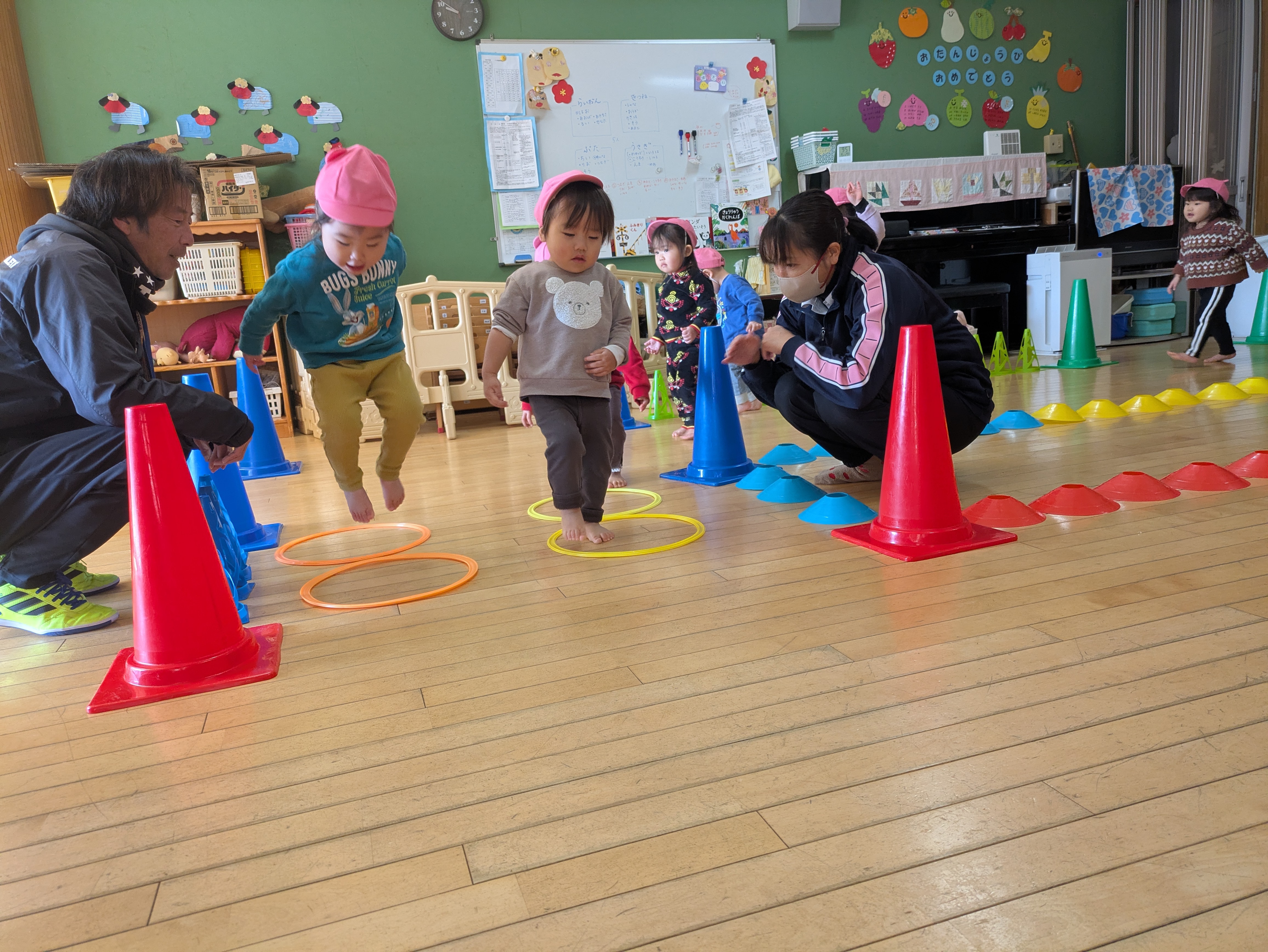 保育室が1階になったことで、幼稚園のお兄さんお姉さんの様子がすぐ近くで見られたり、大好きな古森先生とも顔を合わせてタッチしたりできるようになりました。保育室の前を通ると「こもりせんせー!」と声をかけて寄っていき「いい子ね。」「かわいいね。」と言ってもらいホクホク顔の子どもたち。今週はスポーツダンスも見てもらいました。並んできちんと座っていること、返事ができることを褒めてもらい、名前を呼ばれて返事をすると、ちらっと古森先生の方を見て『ほめて!』とアピールする姿がなんとも可愛らしい子どもたちです。