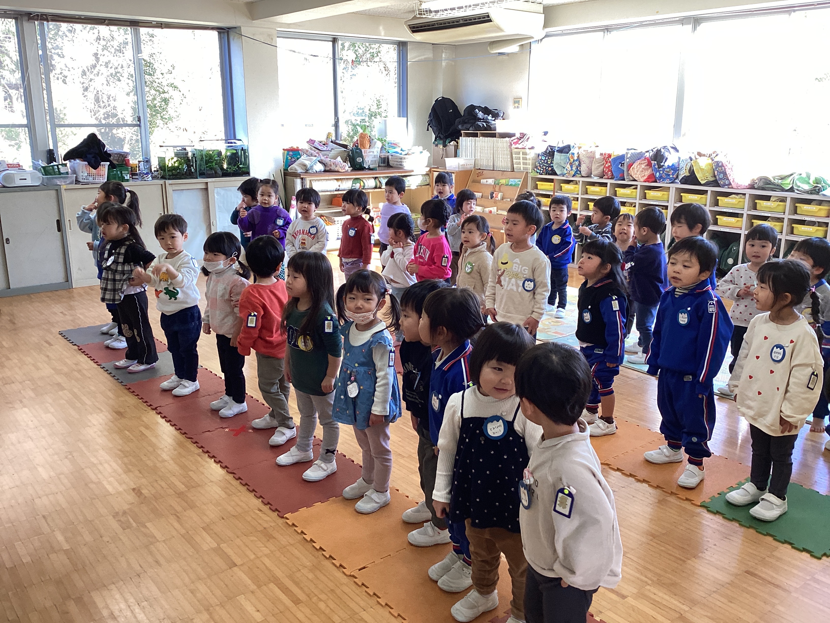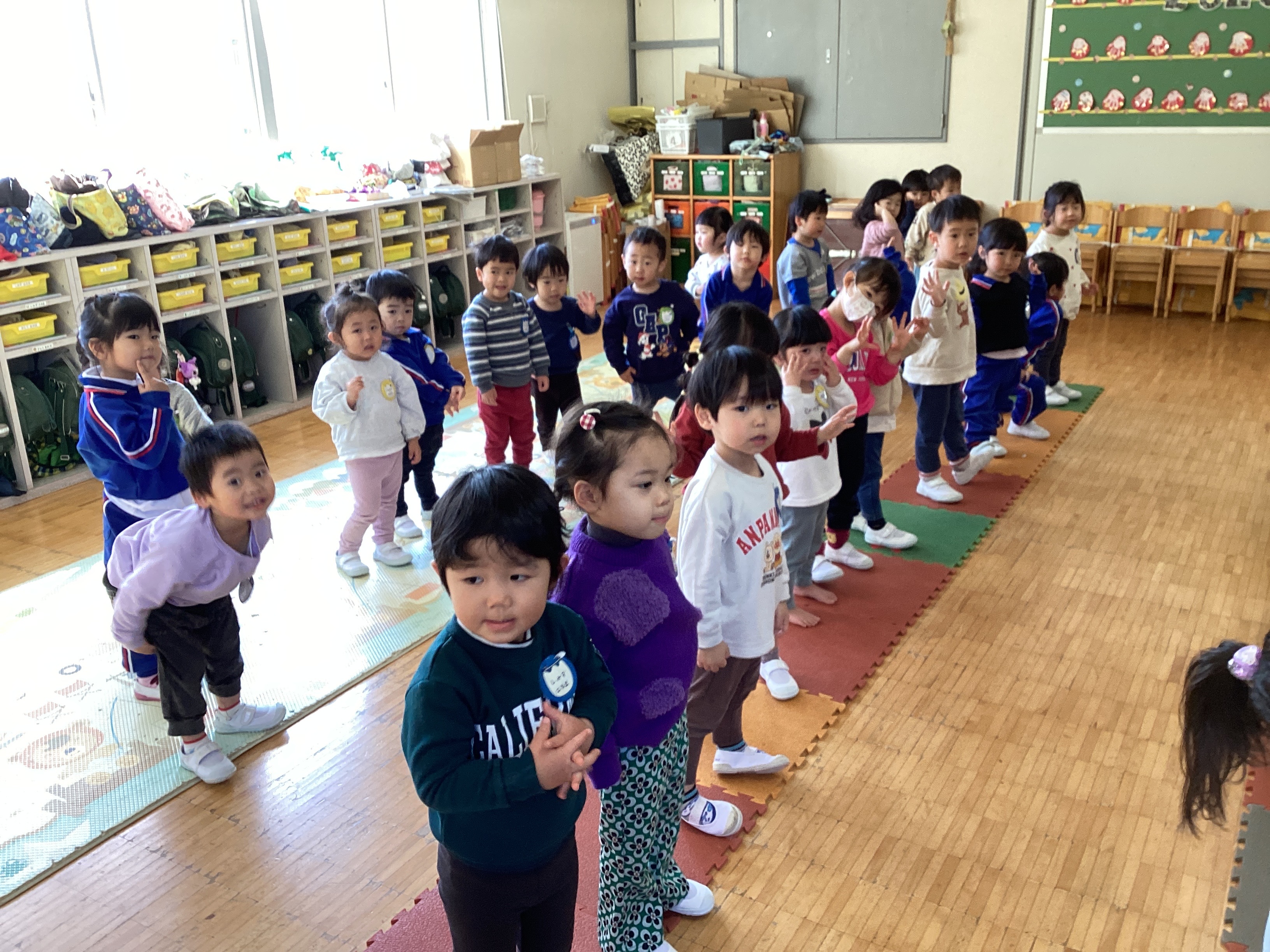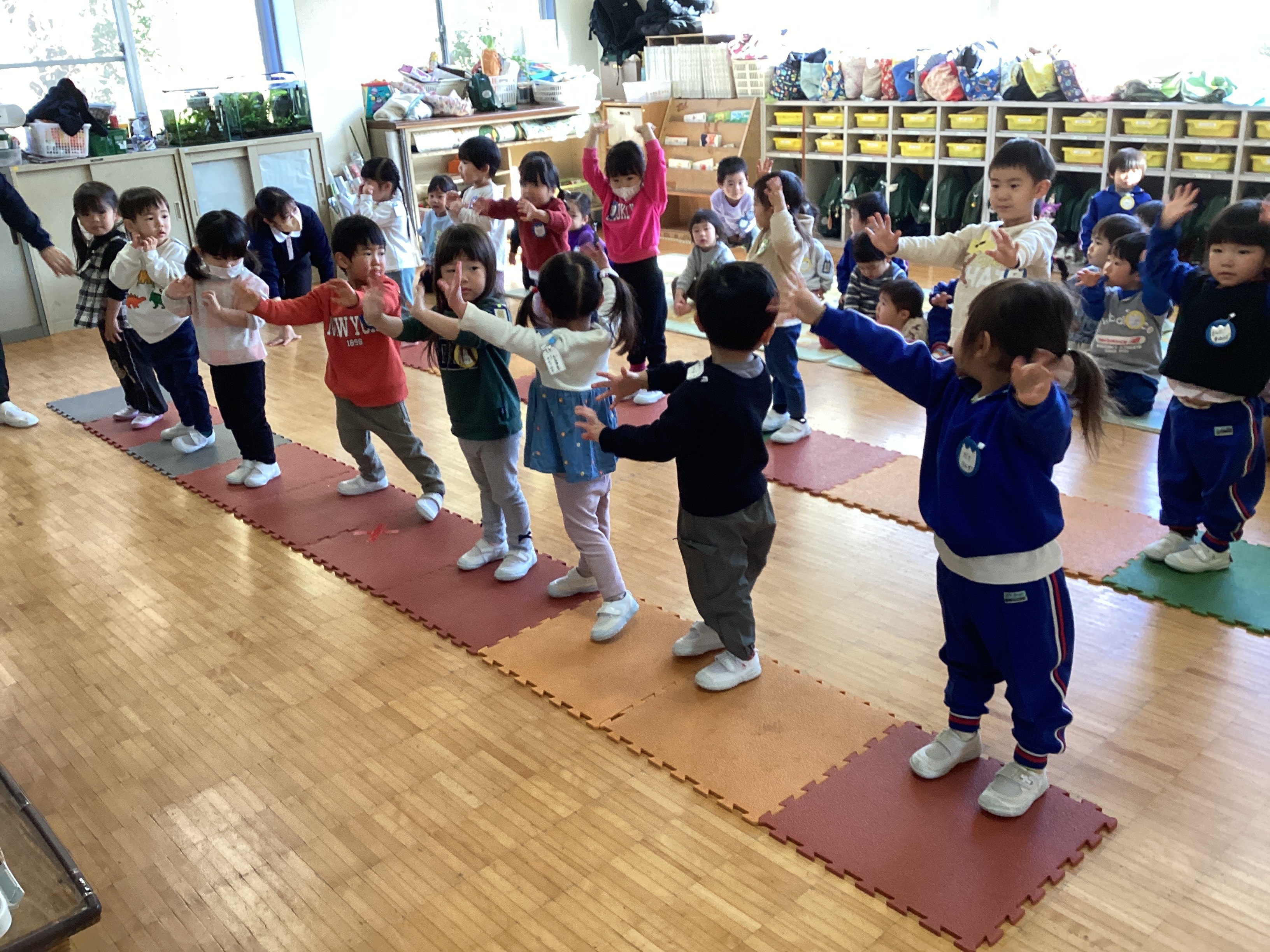 今日はたんぽぽ組の赤コースが古森先生に踊りや歌などを見てもらいアドバイスをもらっている間、青コースは部屋で練習をすることにしました。何度も練習を重ねていくうちに、自分たちで並び順を少しずつ覚えて教師が声を掛けなくても自分の位置に行ける子どもも増えてきました。中には友達の場所も覚えていて「○○ちゃんの次は・・・」と教師が思い出しているより早く、「○○くんだよ先生!!」と教えてもらったりしています。「歌の練習をしよう」と声を掛け本番と同じように電気を消し「おうちの人が見てくれるからね」と声を掛けると手や背筋をピッしと伸ばしていました。練習はじめの頃は恥ずかしそうにしていた子どもが多くいましたが、次第に大きな声で歌を歌い、笑顔で楽しく踊る姿が見られるようになりました。今日オペレッタで前列に移動している時にAくんが後ろを振り返りました。振り返った先には同じ役のMくんが移動することを忘れ座っていたのでした。いつも一緒に踊っているMくんがいないことに教師よりも真っ先に気がつき、Mくんの手を引っ張り移動していました。普段の生活の中でも困っている友だちに気がついて呼びに行く姿がよく見られます。発表会本番でも幼稚園での活動や生活の中で子どもたちがしている、自分たちでしようとしている姿や助け合っている姿を見ていただけたらと思います。