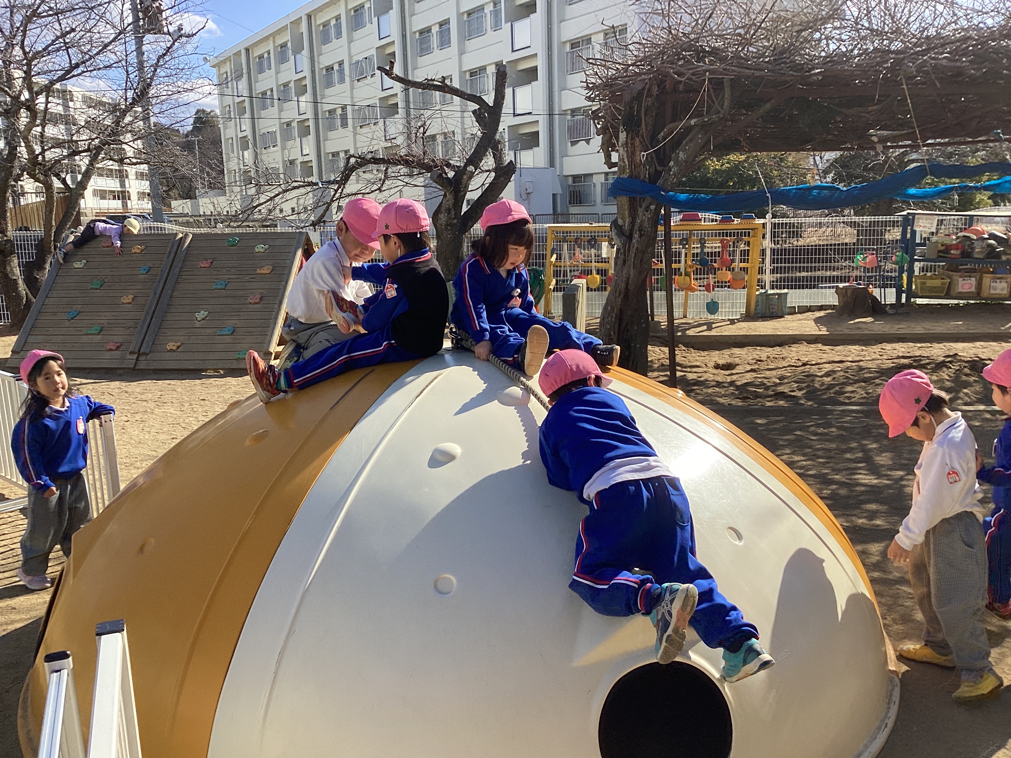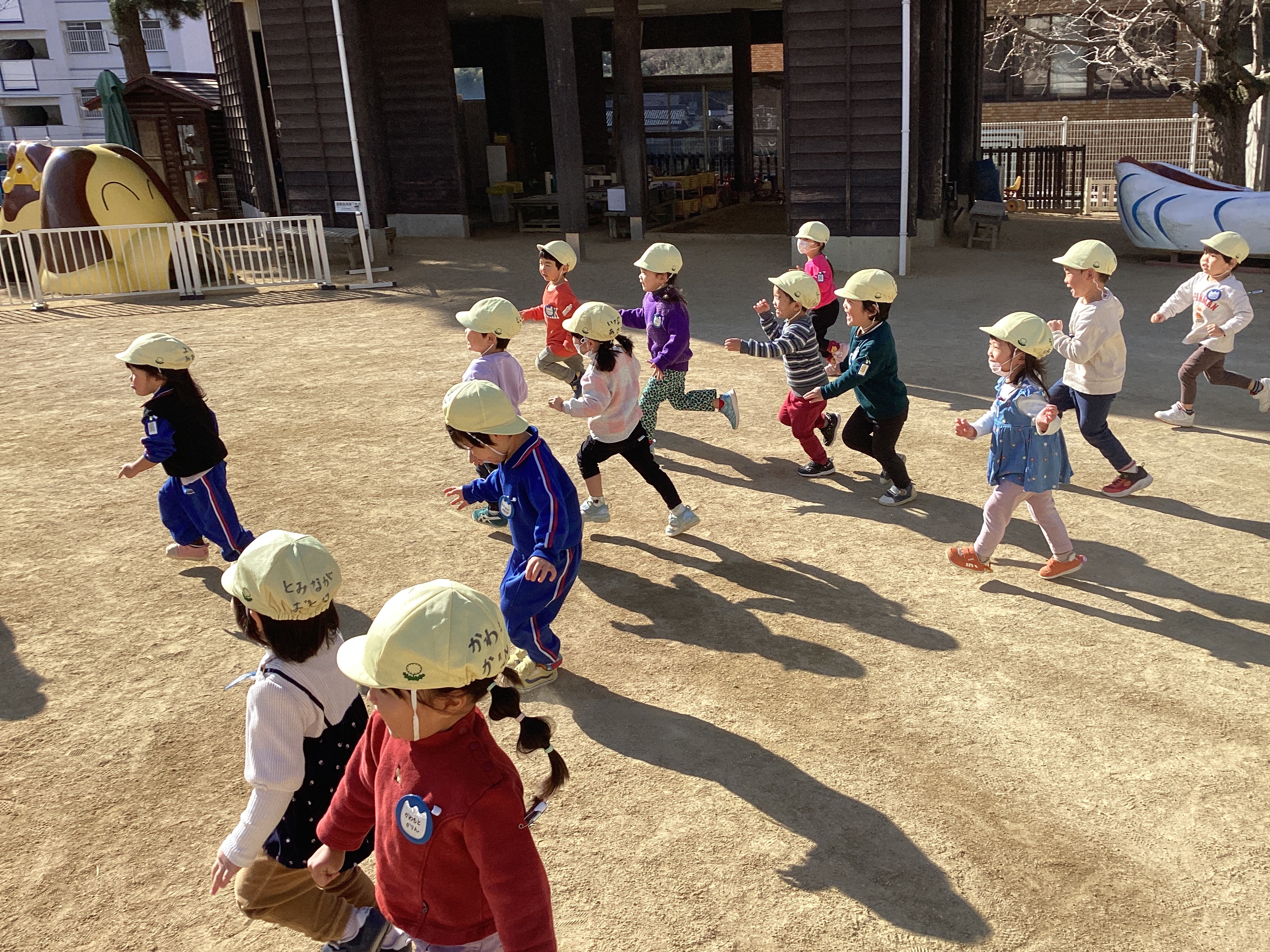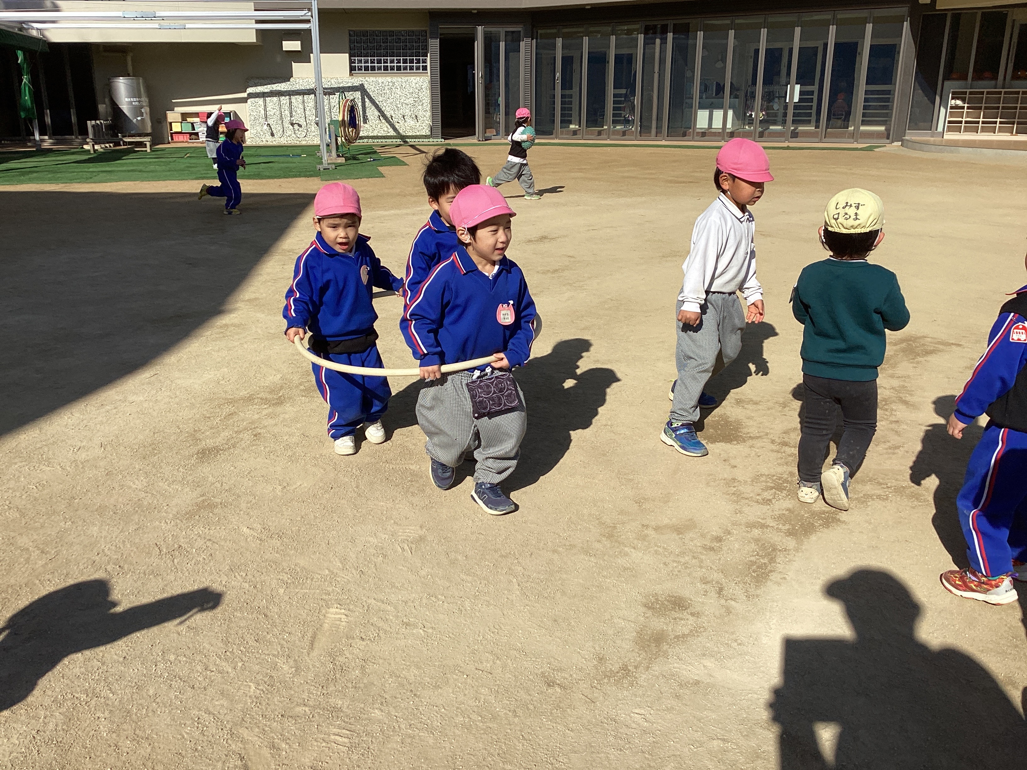 今朝も子どもたちは登園後、身支度をすますと戸外へ出てサッカーやフラフープ、大縄跳びなどいろいろな遊びを楽しんでいました。