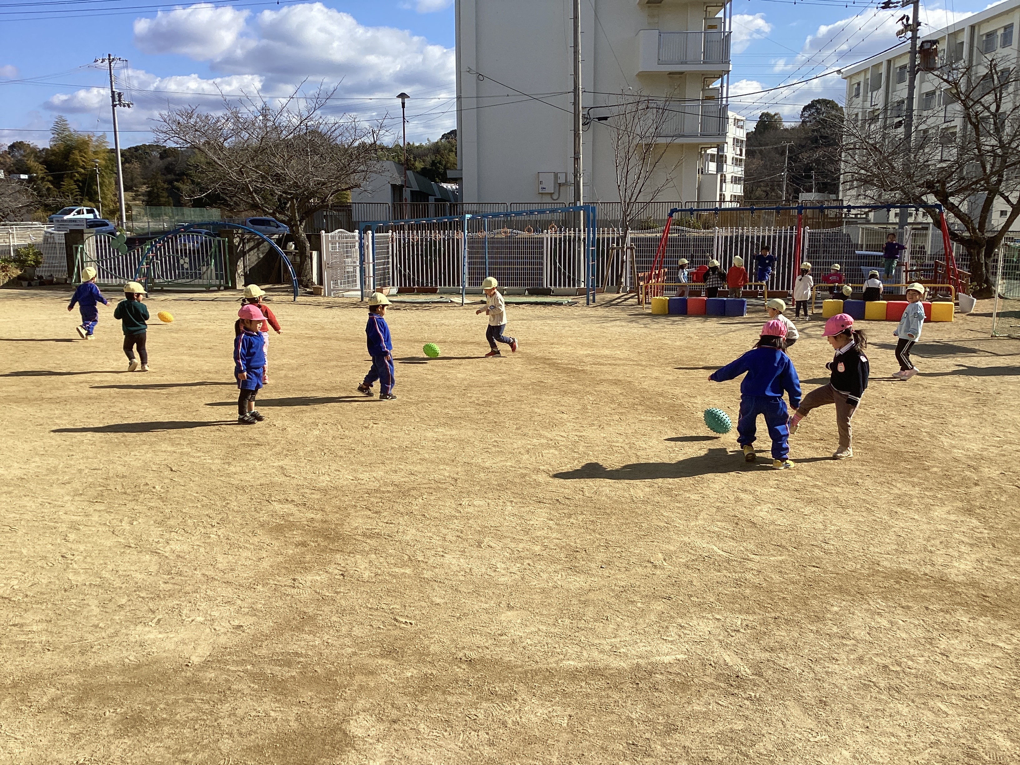 発表会の練習を終え園庭でさくら組さんと一緒にブランコやフラフープなどで遊んでいました。他のクラスが室内の活動をしていて園庭が広く遊べたので、ラグビーボールに似ているボールで遊んでみることにしました。ボールを見た子どもたちは普段遊んでいる丸いボールとは違うことに気付き興味津々。園庭に投げ入れボールが不規則に転がる様子を見て大喜び。ボールを交代で投げ、追いかけ顔を赤らめながら遊んでいました。