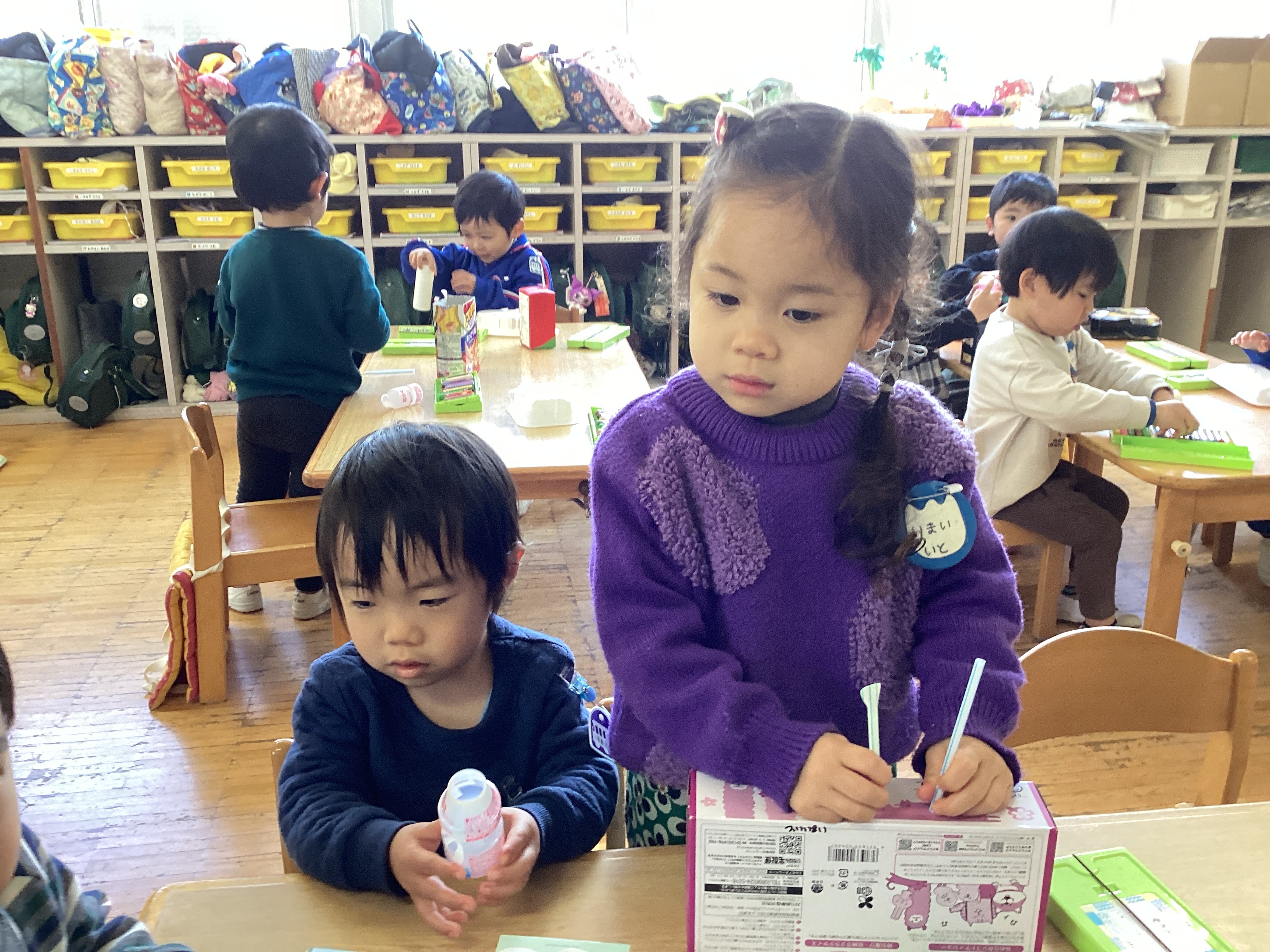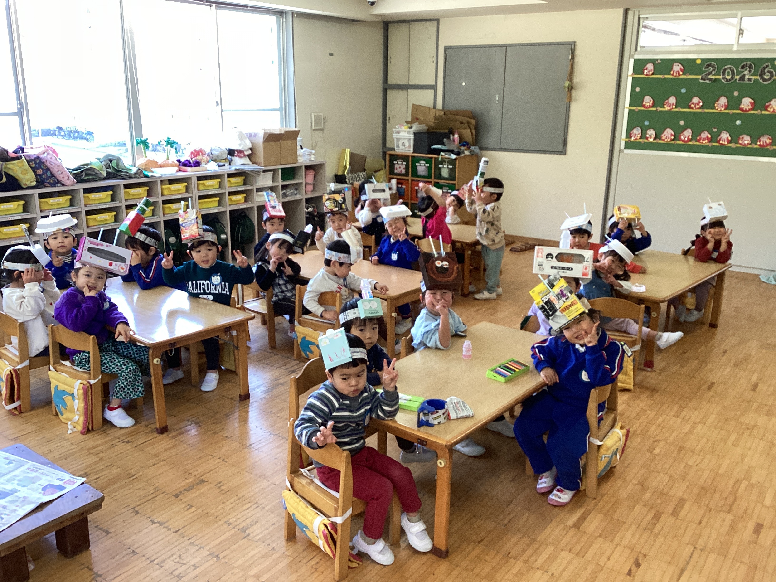 戸外遊びを楽しんだあと部屋で節分に向けて鬼のお面を作りました。紙芝居を読み聞かせるとすぐに作り始めました。自分で面になる箱を選び教師がいろいろな目の形に切った紙に色を塗りました。S君は半円の紙を取り角にし貼っていました。4月の廃材遊びではテープを貼っていた子ども達ですが、普段から廃材遊びをたくさん経験したことで、テープの貼り方や廃材の付け方も上手になり見ているだけでも楽しくなります。完成したお面を付けると「鬼だぞ~。食べちゃうぞ~!」と鬼になりきっていました。子ども達が作った泣き虫鬼や、いじわる鬼を豆まきで退治するのが楽しみです。