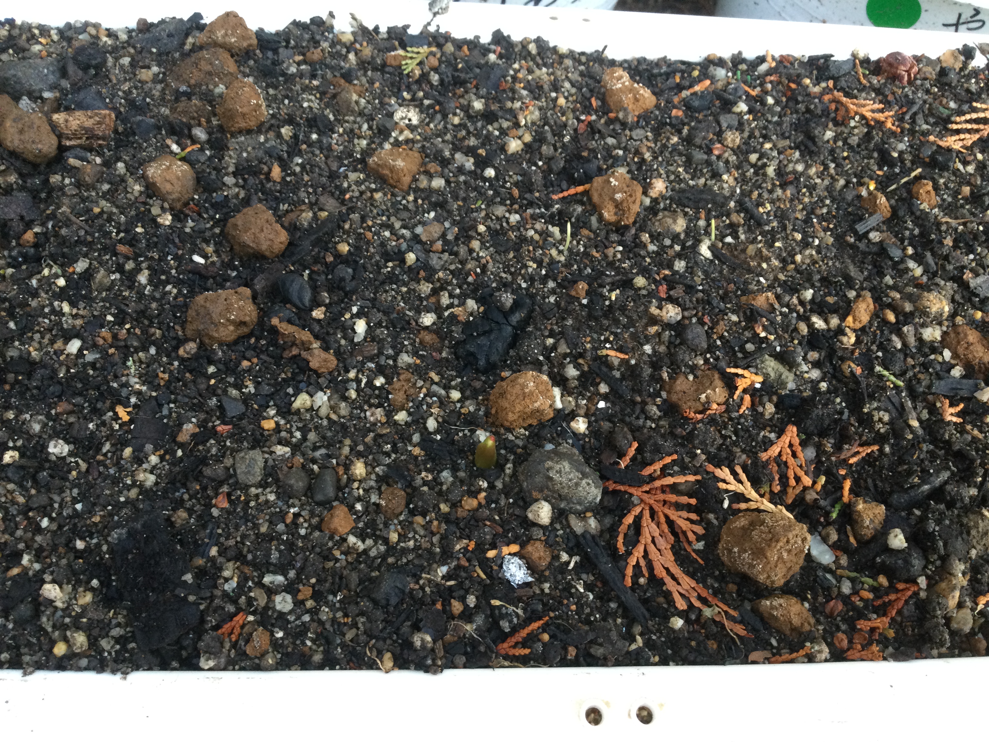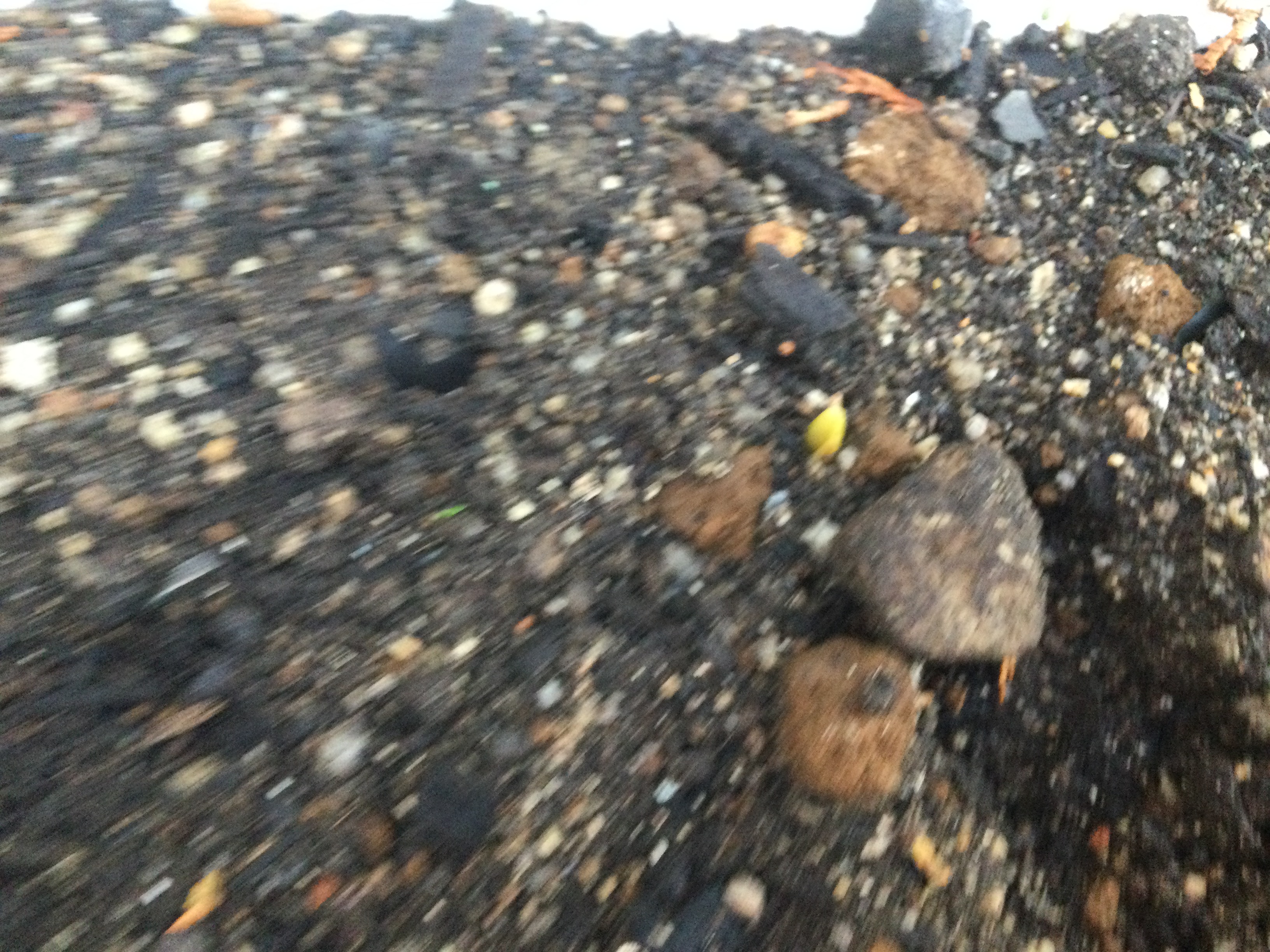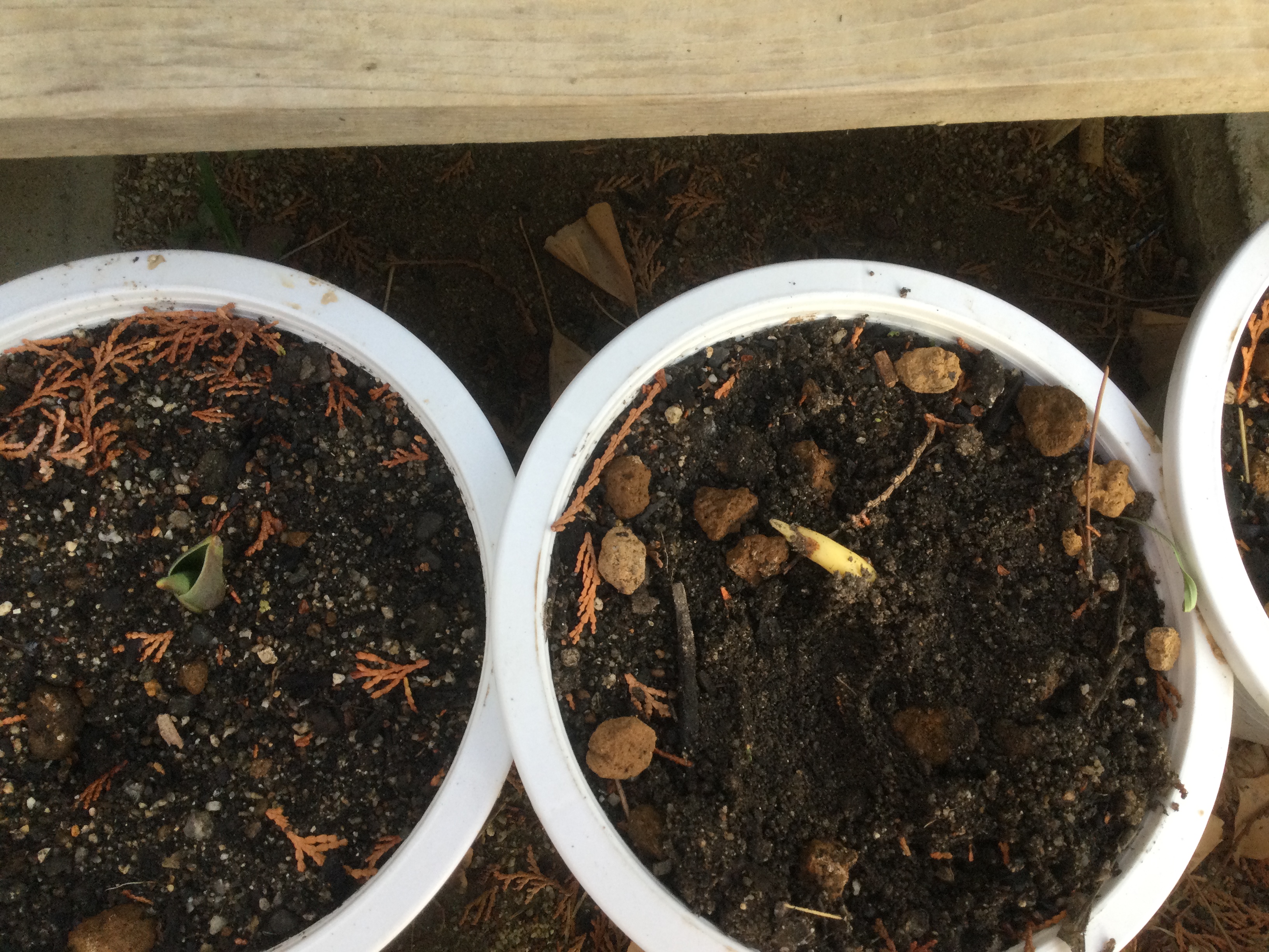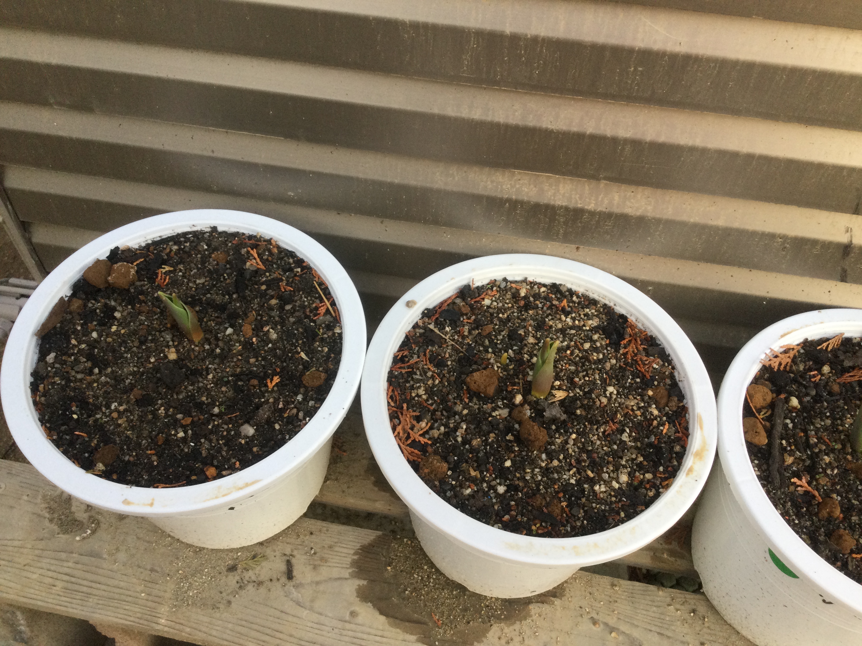 「よく見つけたね 春になったら何色のちゅうりっぷが咲くかなぁ?楽しみだね」と話しました。すると嬉しそうな笑顔でこちらを見て、「先生 変なのがあるんよ」と、今度は不思議な鉢の所に連れて行ってくれました。そして「先生 これ」と指さしている先を見ると、茶色で丸っこいものが土から顔を出していました。(うん なんだかちゅうりっぷのおしり<根っこ>に見えるんだけど・・・)「本当だね 芽ではないね」(それが苦しそうに見えたので その鉢の土を掘ってみました。すると下に向いていた方から白い芽がでて、とても苦しそうに上に向かって伸びようとして、ちゅうりっぷの球根を押し上げていたのでした。「ちゅうりっぷさん 『上に行きたいよ 苦しいよ 助けて!』とMちゃんを呼んでいたのかもしれないね」と言いながら、一緒に植え替え、「元気に大きく育ってね」と声を掛けました。自分達のだけでなく、他のお友だちのものも見て、気付くようになった年少さんの成長にとても嬉しく思いました。