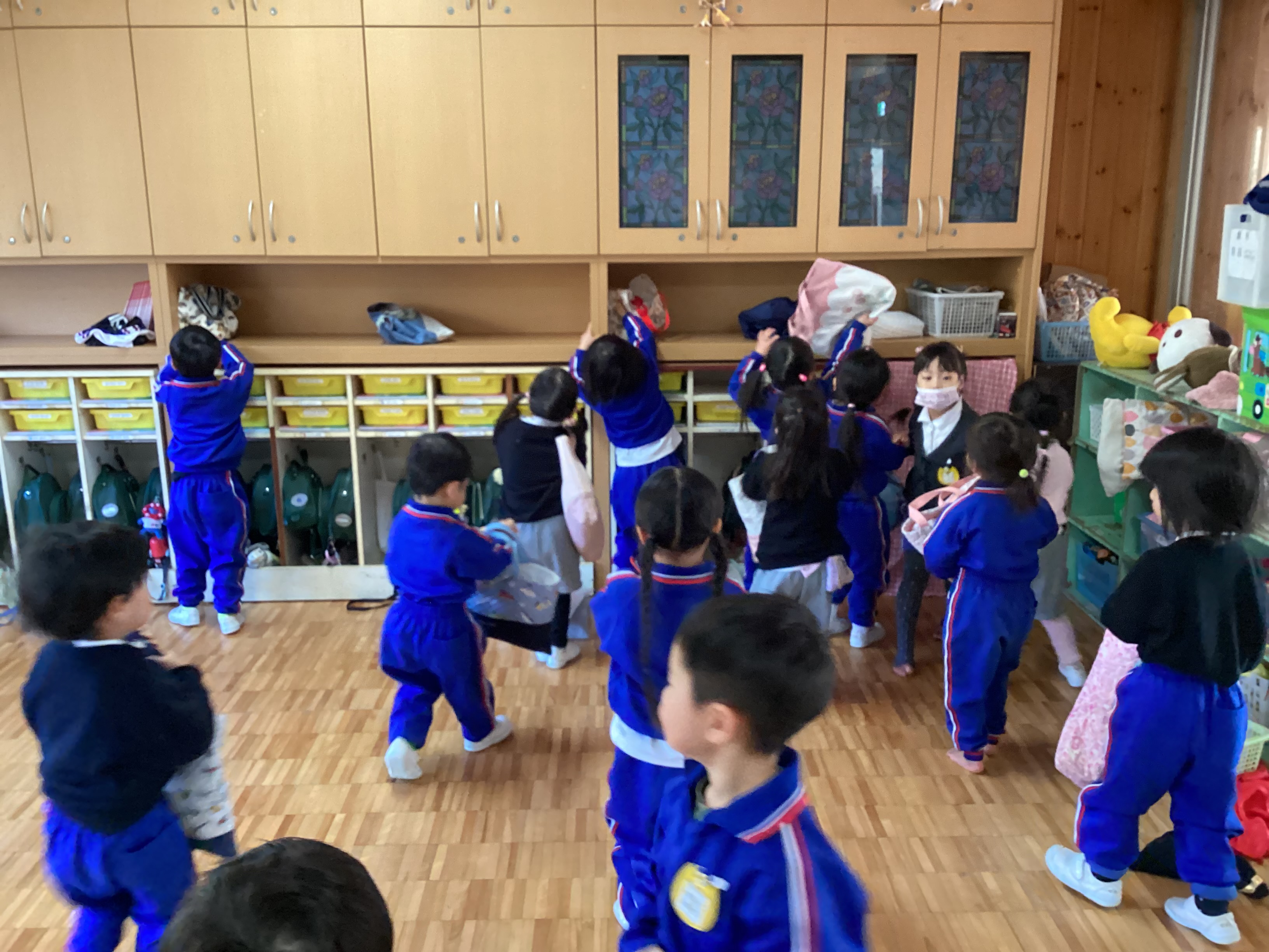 ところで月曜日は、松前文化センターでのリハーサルの日です。練習が最終ということで、朝一番からホールで練習が始まっていました。年少さんもホールに入ることは難しかったけど、会議室を使わさせていただくことができ、先日園長先生に見ていただき、「こうしたらいいよ」と言ってくださったところを練習したり、お互いのコースで見あいこをして、刺激し合ったりしました。そして年少さんも自分達の準備は、自分達でできるようにと持って来てもらった服などの確認したり、自分の役で着る服を通園バックに入れたりなど、準備をしました。