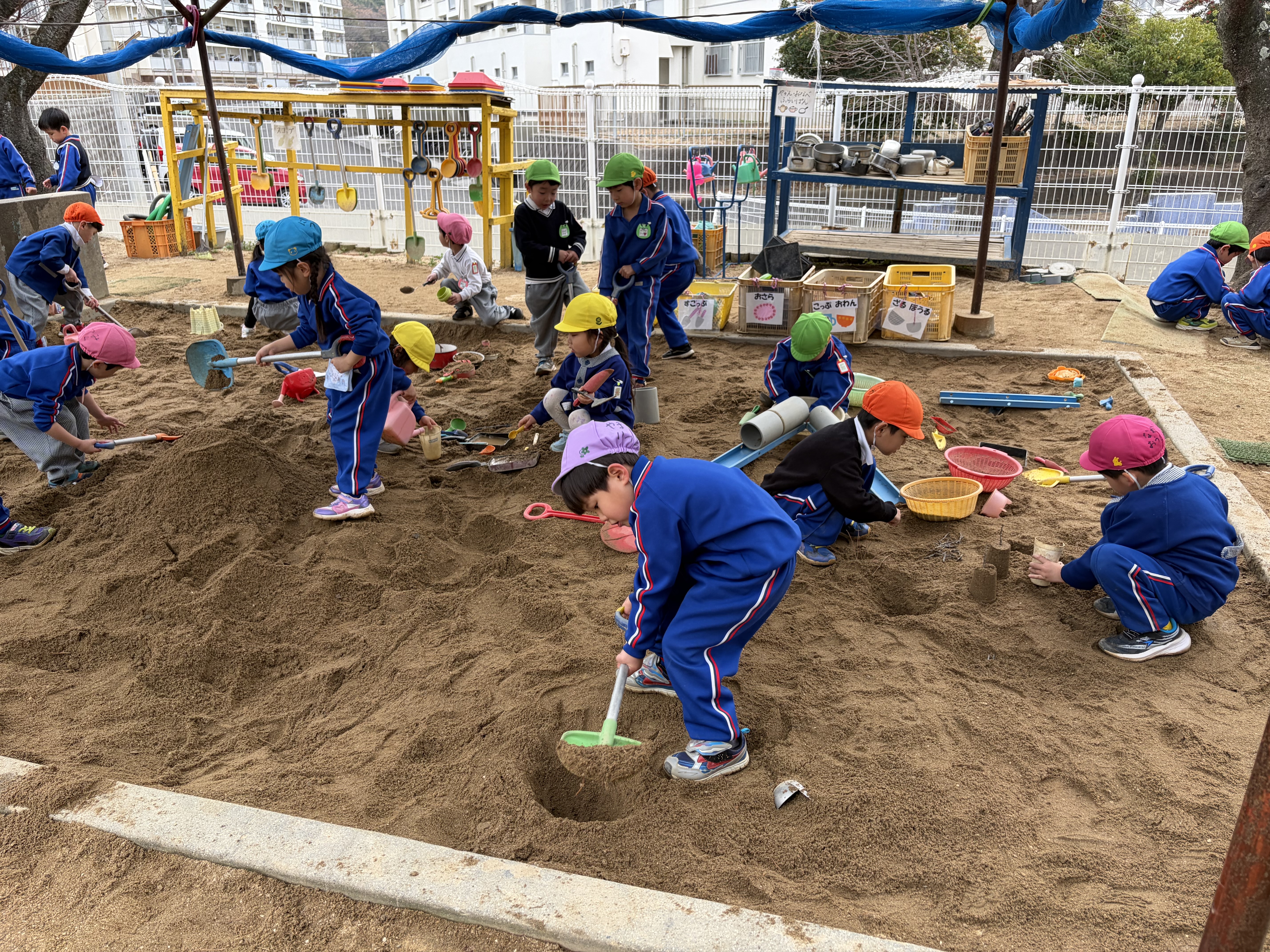 昨日の雨もすっかり止み三葉幼稚園の園庭は子どもたちの元気な声が響いていました。砂場の近くで「先生こっち来てみ」とすみれ組のRくんが手招きをしていたので行ってみると、「ガオー!ガオー!」と砂にスコップを突き刺していました。「先生これ何か知っとる?これは恐竜さんの爪の跡なんよ。大きい爪やけん先生すぐに食べられてしまうで!!」と砂場にできた線を繋げていました。いつもいろいろなことを説明してくれるRくんは、そのあとも恐竜から逃げる方法や、穴を掘り溶岩を入れると逃げられることなど熱心に話してくれました。