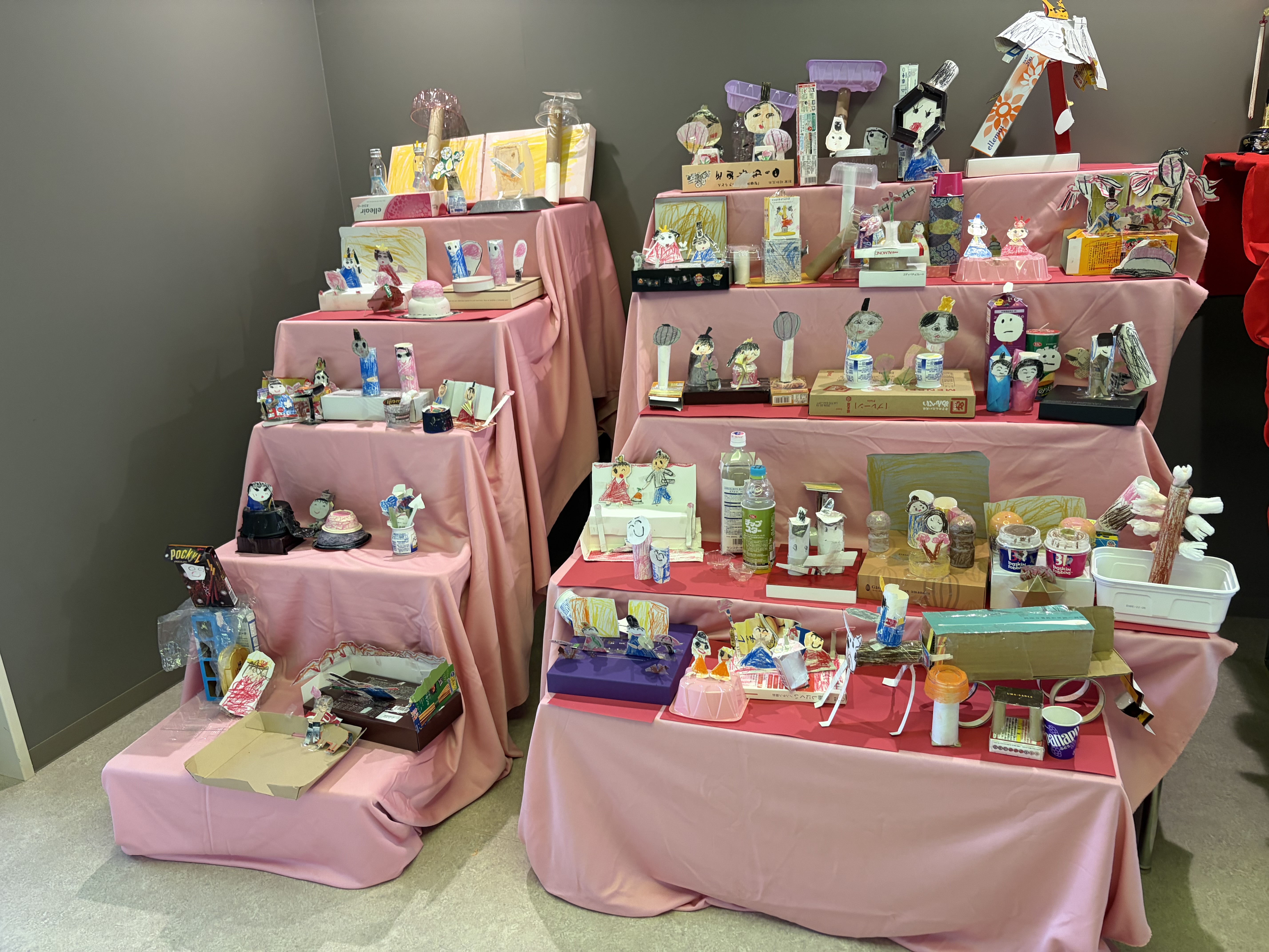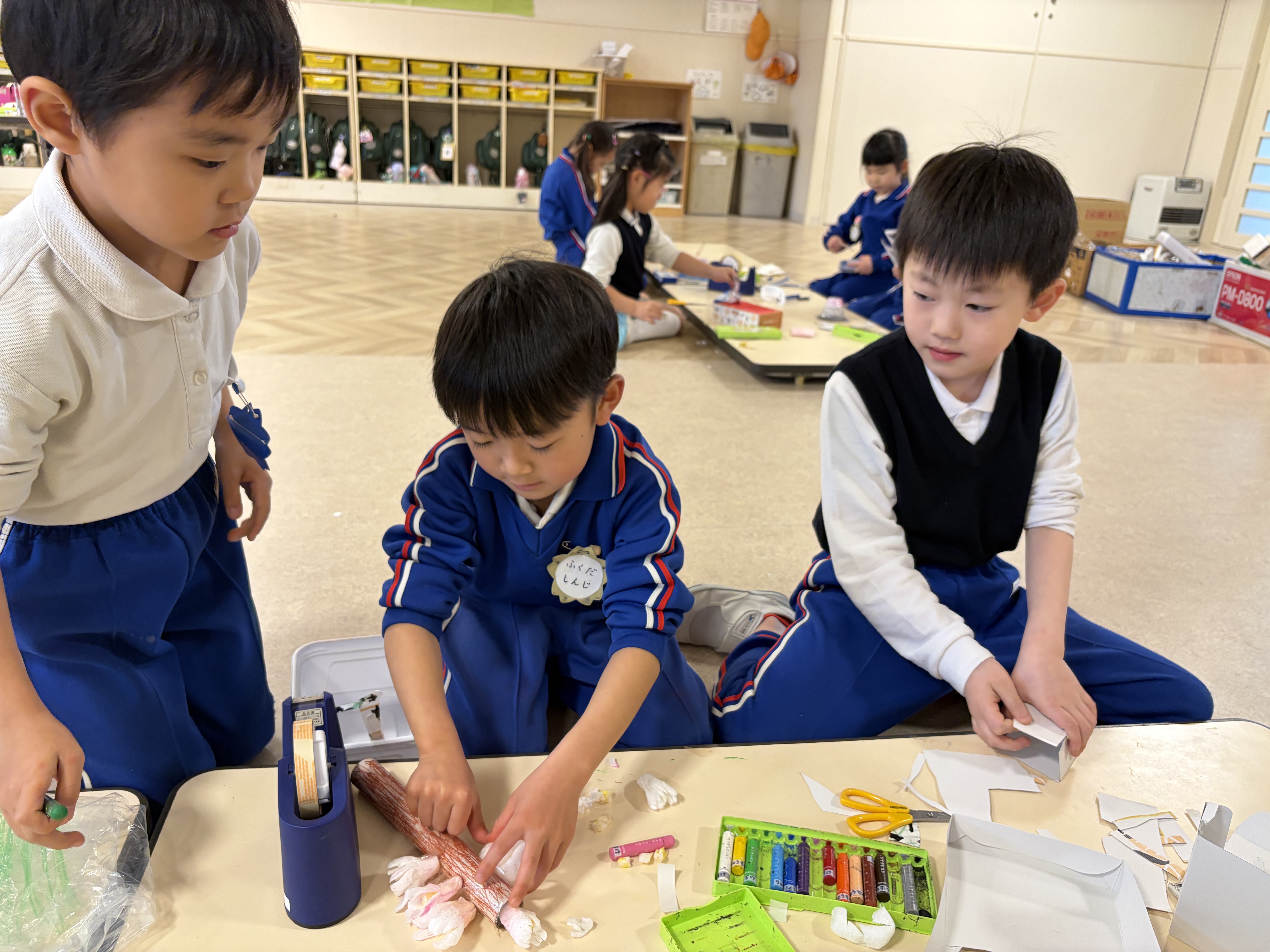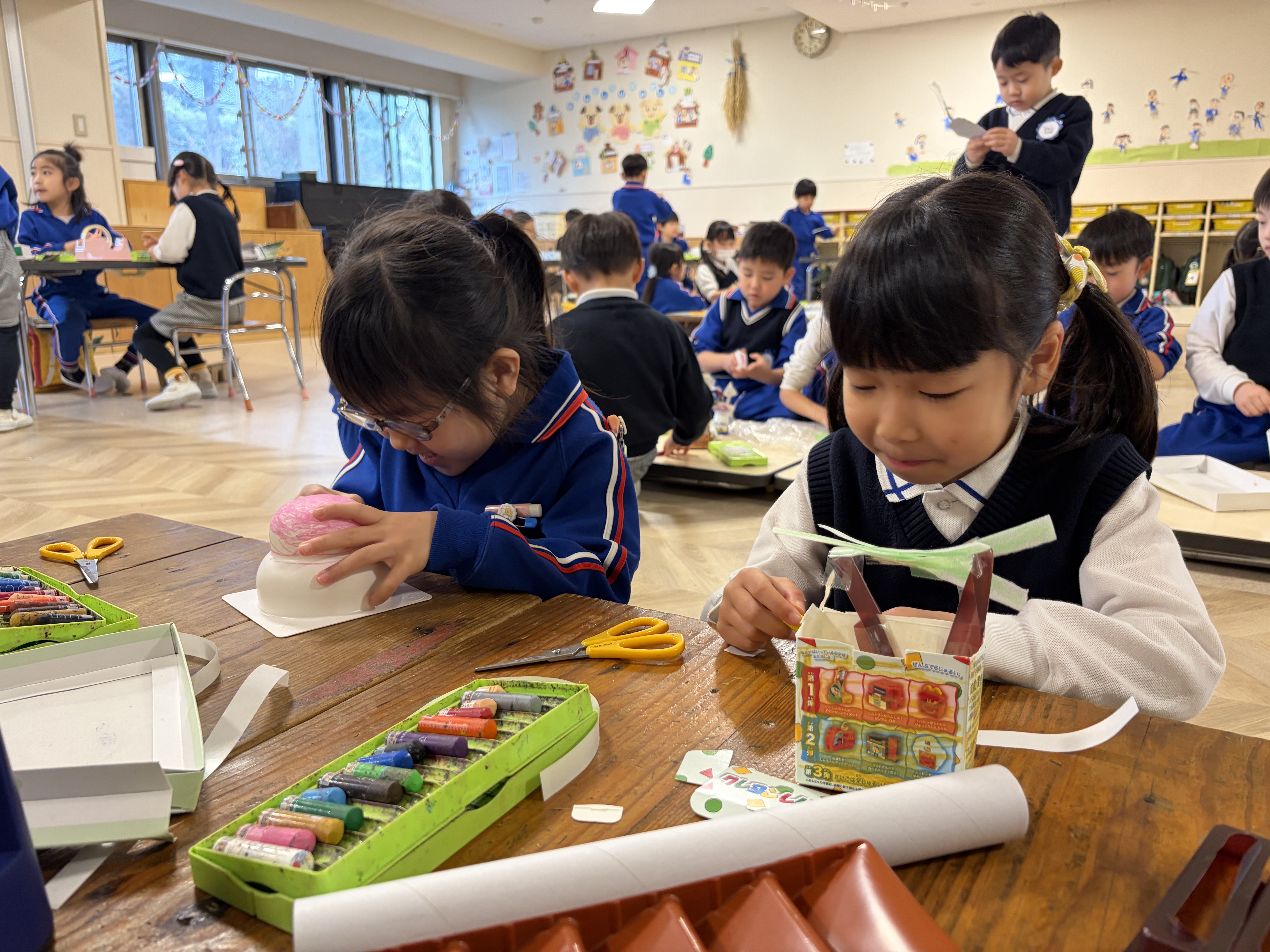 幼稚園に帰った年長さんたちは昨日から計画していたひな祭りのお雛様を作っていきました。友だちと協力して五人囃子やお雛様の嫁入り道具を作っていきました。廃材を見ていたRちゃんは、廃材箱から鏡餅の形をした容器を見つけて桃色で塗っていきました。色を塗るとひな壇に飾られているたかつきと色や形が瓜二つの飾りができました。あまりにも似ていて近くにいた教師や子どもたちも思わず笑ってしましました。Sくんはラップの芯を持ってくるとクレヨンで塗り花びらに見立てテープで貼っていき桃の枝を作っていました。3年、4年と廃材遊びをしてきた年長さんの発想力や着眼点は三葉っ子だなと感心させられました。青組の子どもたちは年長さんのしていることに興味津々です。昨日、歯磨きをしに手洗い場に行くとひな壇を作っている年長さんの姿を食い入るように見ていました。週明けには完成した年長さんたち手作りのひな壇を一緒に見にいき楽しみたいと思います。