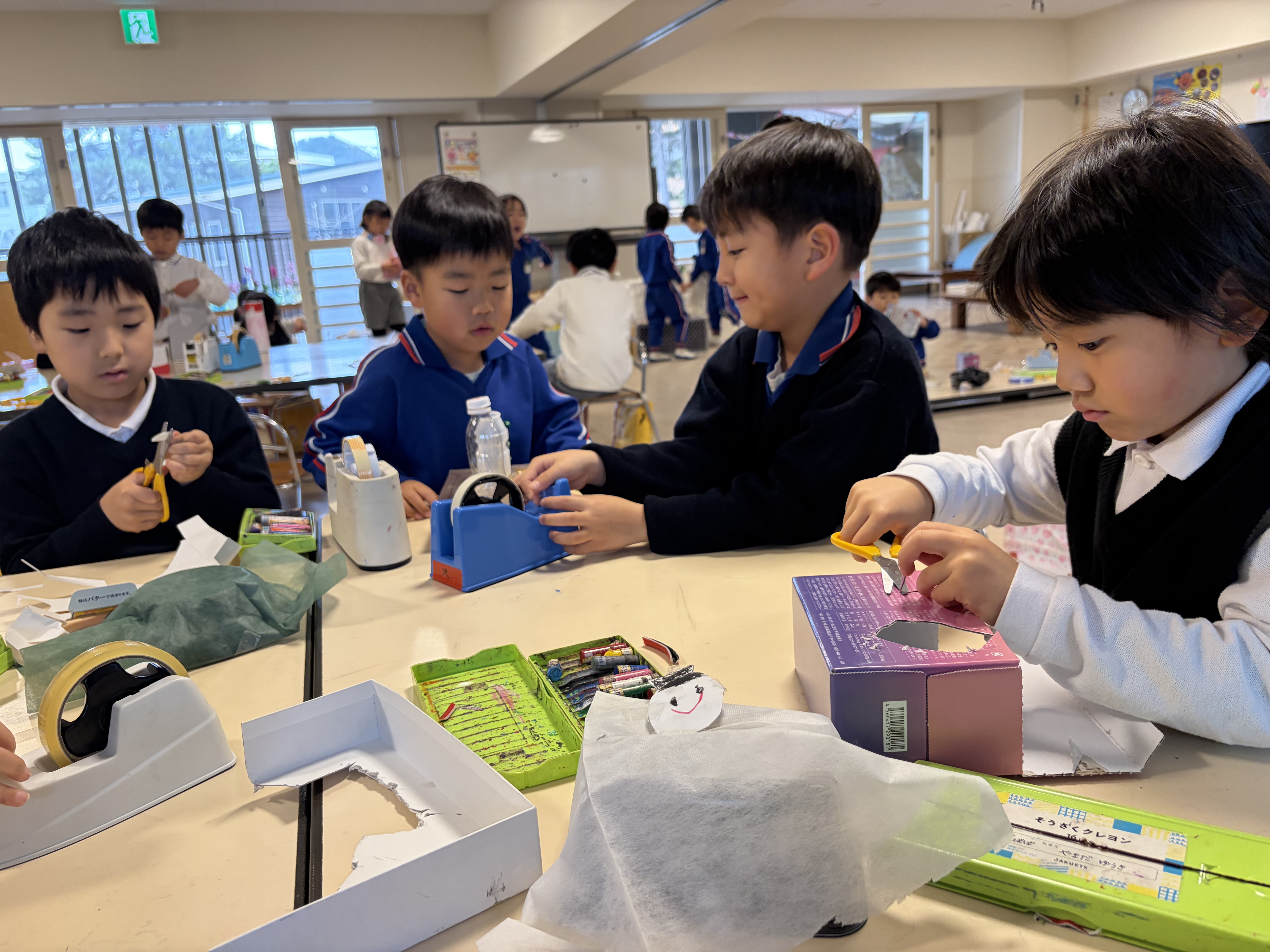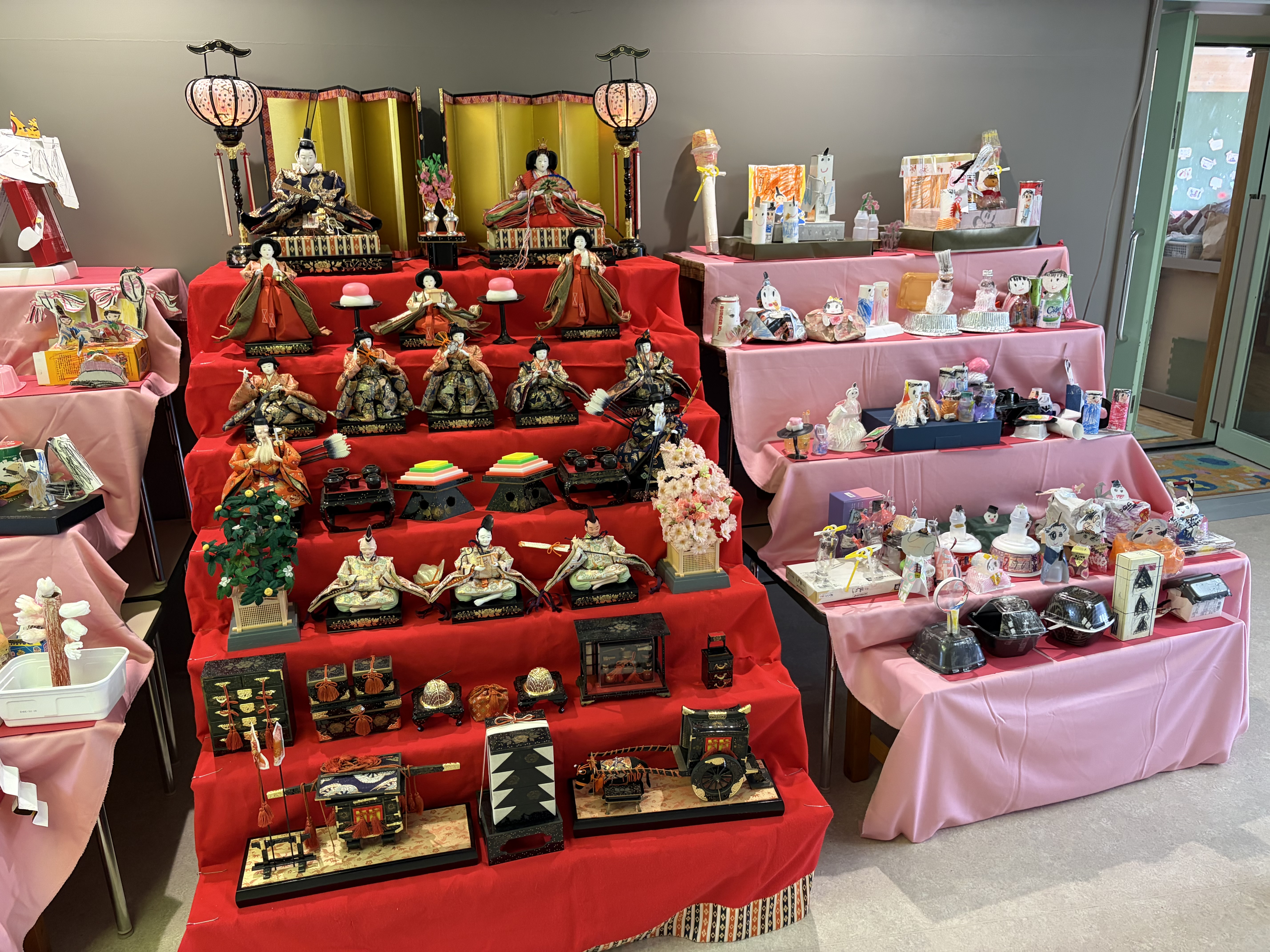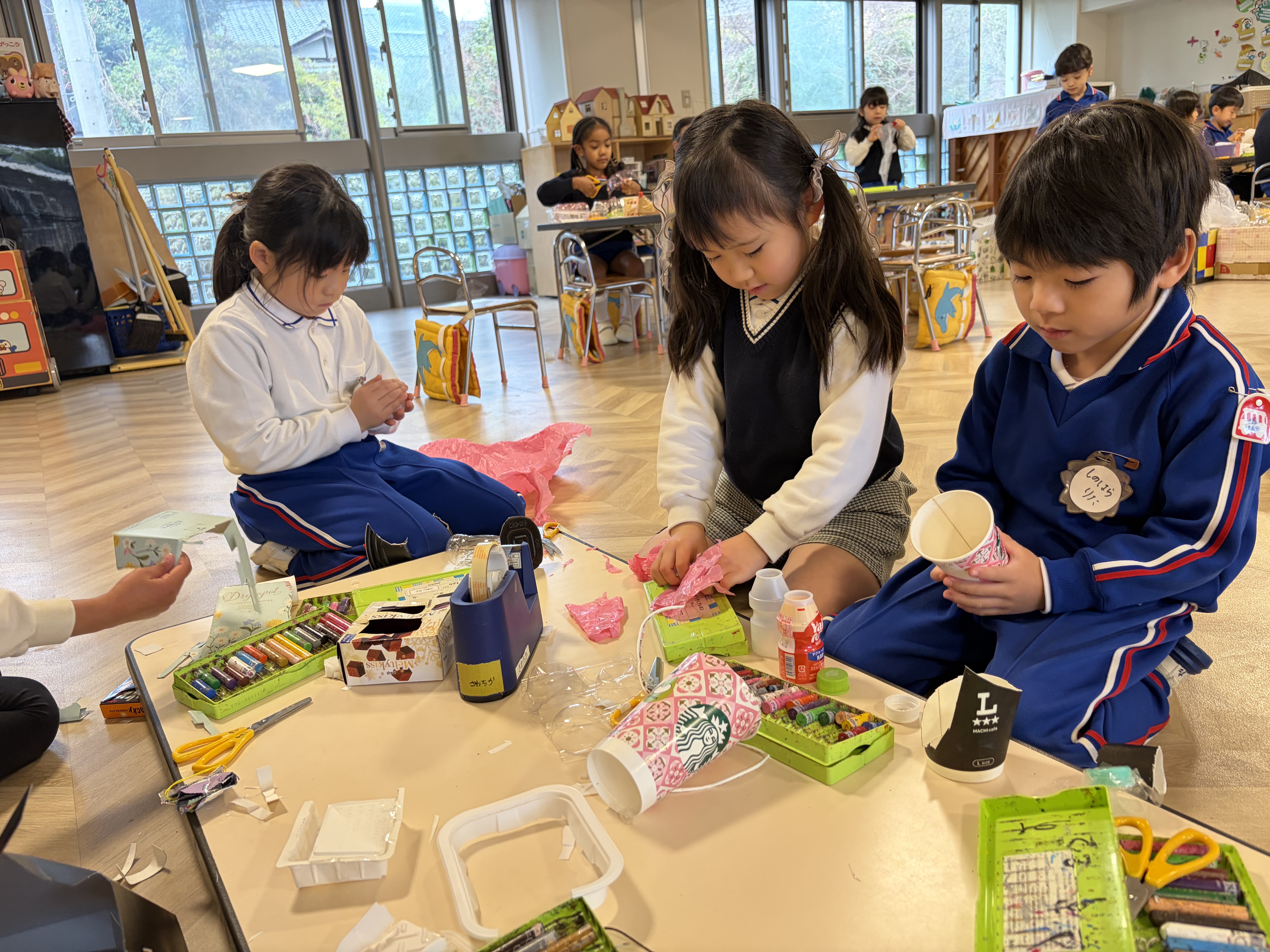 幼稚園に帰った年長さんたちは昨日から計画していたひな祭りのお雛様を作っていきました。友だちと協力して五人囃子やお雛様の嫁入り道具を作っていきました。廃材を見ていたRちゃんは、廃材箱から鏡餅の形をした容器を見つけて桃色で塗っていきました。色を塗るとひな壇に飾られているたかつきと色や形が瓜二つの飾りができました。あまりにも似ていて近くにいた教師や子どもたちも思わず笑ってしましました。Sくんはラップの芯を持ってくるとクレヨンで塗り花びらに見立てテープで貼っていき桃の枝を作っていました。3年、4年と廃材遊びをしてきた年長さんの発想力や着眼点は三葉っ子だなと感心させられました。青組の子どもたちは年長さんのしていることに興味津々です。昨日、歯磨きをしに手洗い場に行くとひな壇を作っている年長さんの姿を食い入るように見ていました。週明けには完成した年長さんたち手作りのひな壇を一緒に見にいき楽しみたいと思います。