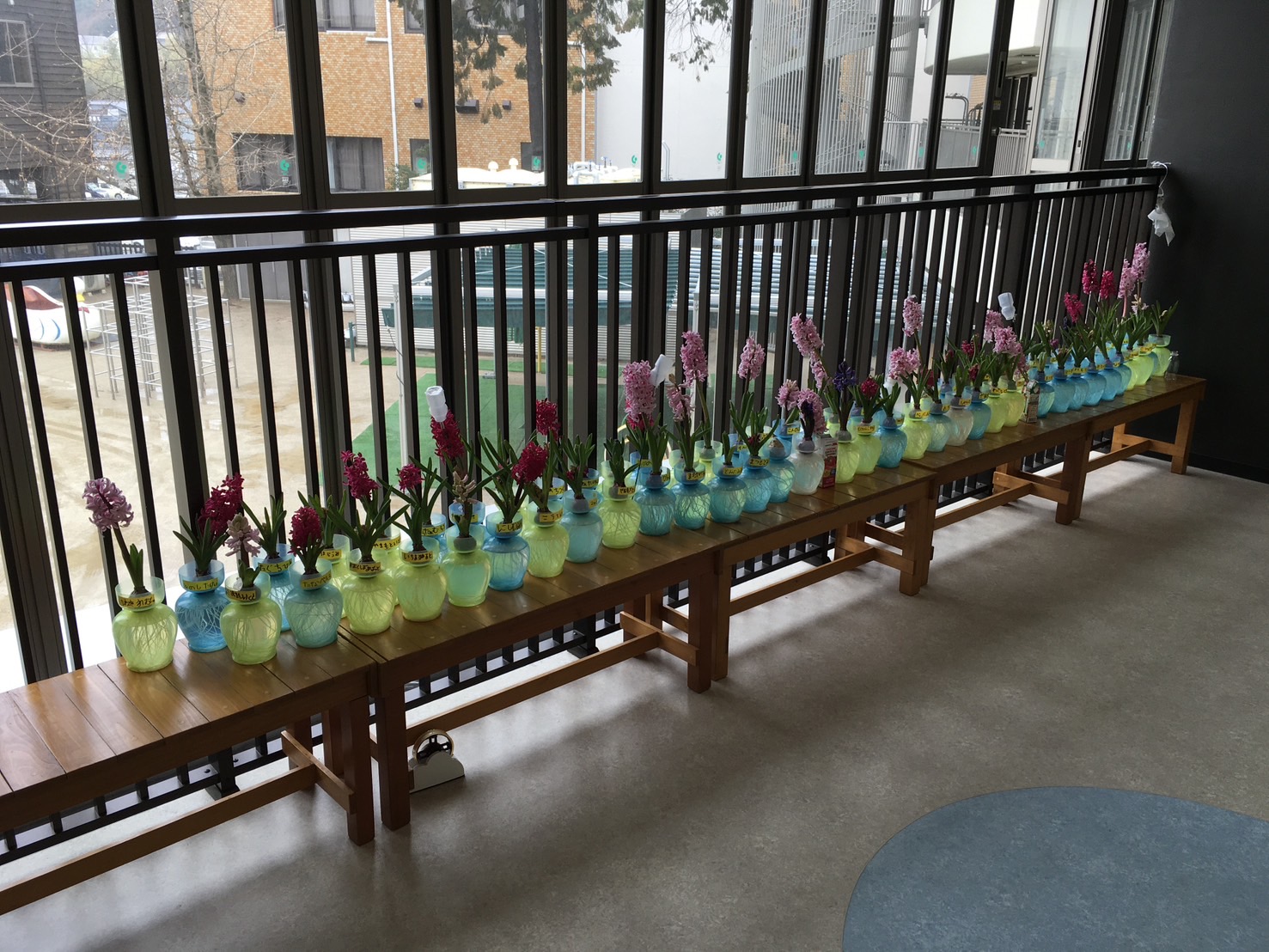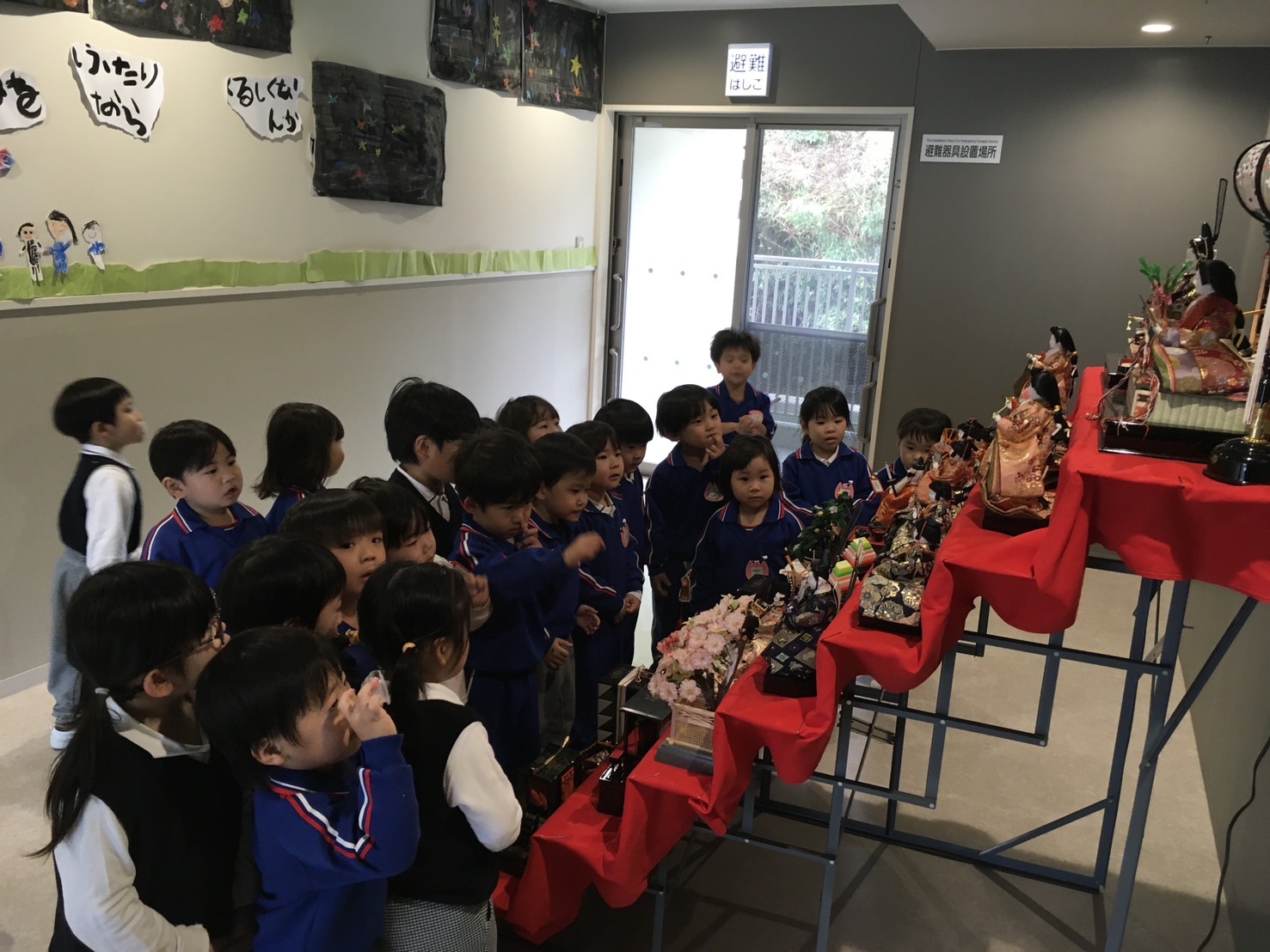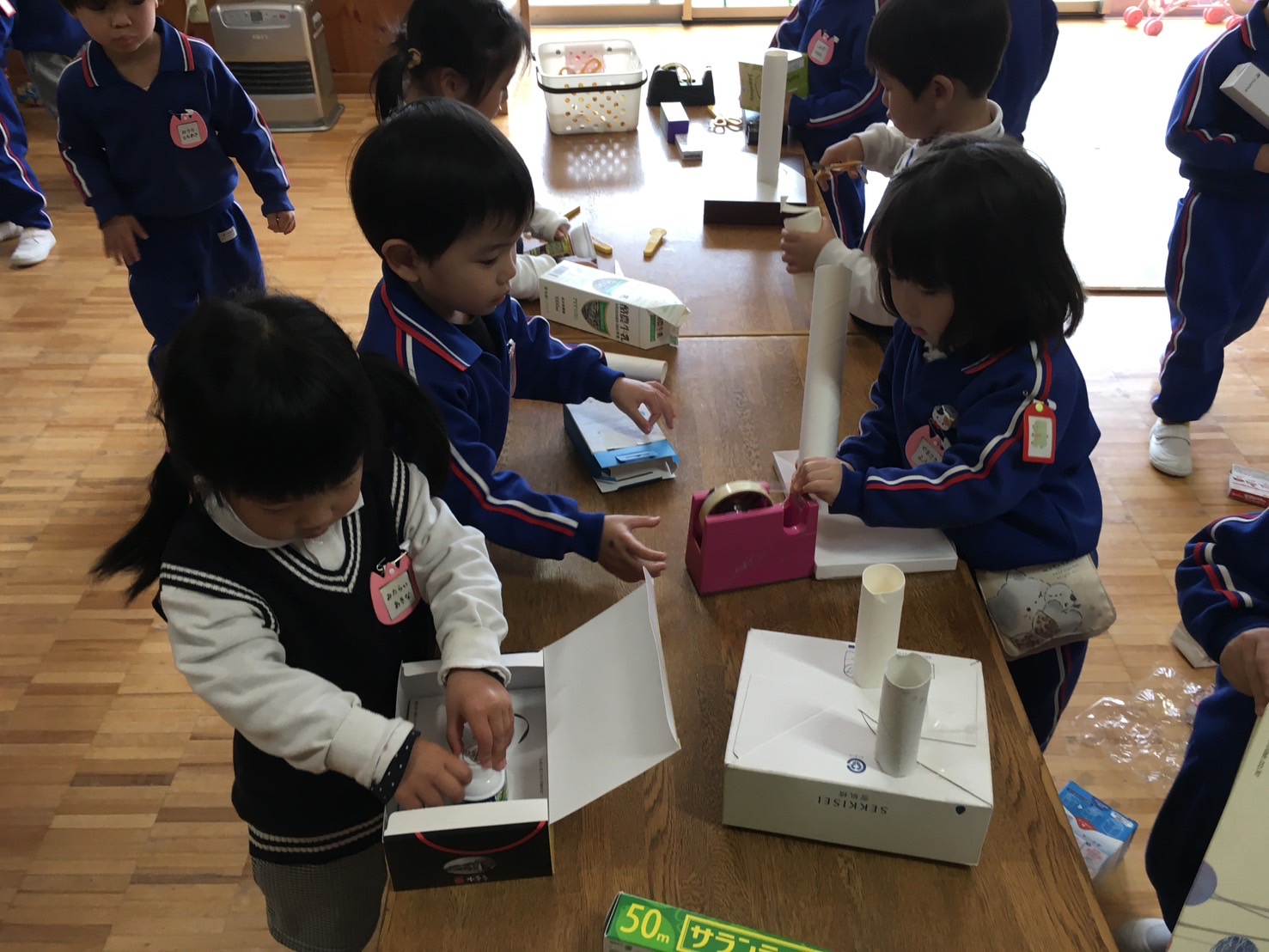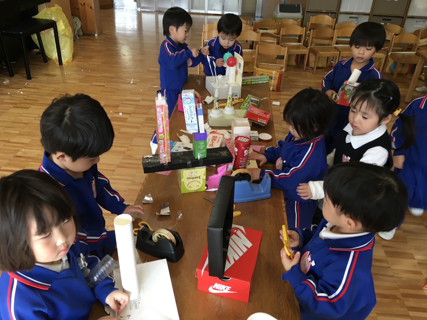 年長フロアに行くと、水栽培していたヒヤシンスの花が徐々に咲き始め、とても良い香りが漂っていました。その近くに、ひな人形が飾ってあることに気付いた子ども達は「わぁ~すごい!!」「きれいだね~!!」と口々に言って、見ていました。来週、3月3日は、ひなまつりという事で、自分だけのひな人形を作ろうと廃材遊びを始めました。たくさん廃材があったおかげで、自分のイメージに近づける事ができたようで、迷うことなく集中して作っている子♪おだいりさーまとおひなさまーと楽しく歌を歌いながら作っている子、様々な姿が見られました。作っている途中「ぼんぼりってどんなのだったっけ?」「何か持ってた?」と友達と会話をしたり、ひな人形を見に行ったりしながら作る子達もいました。時間いっぱい作っていましたが、子ども達の発想が豊かで、作り足りない子がたくさんいたので、明日からも続きができる時間を確保していきたいと思います。