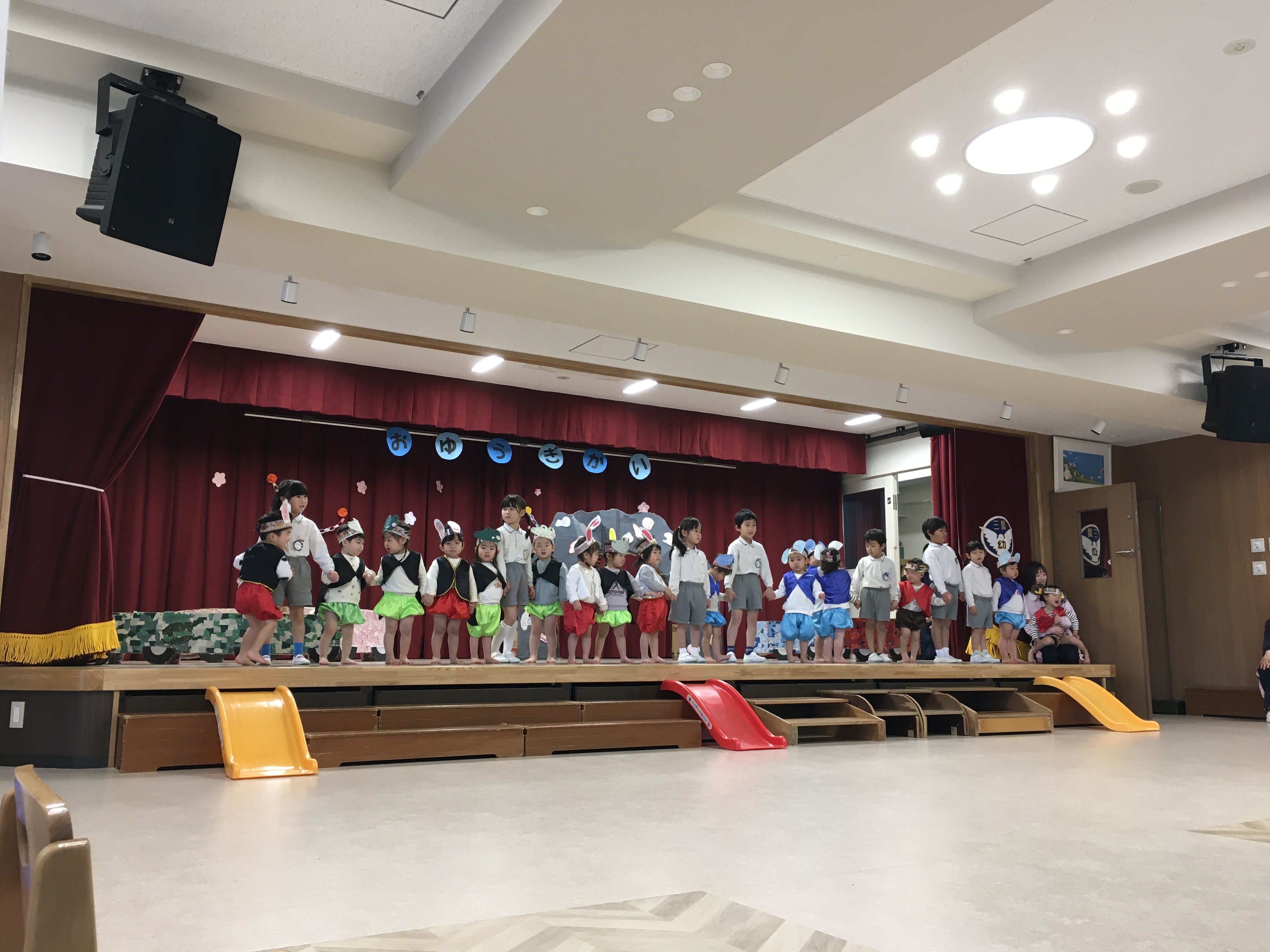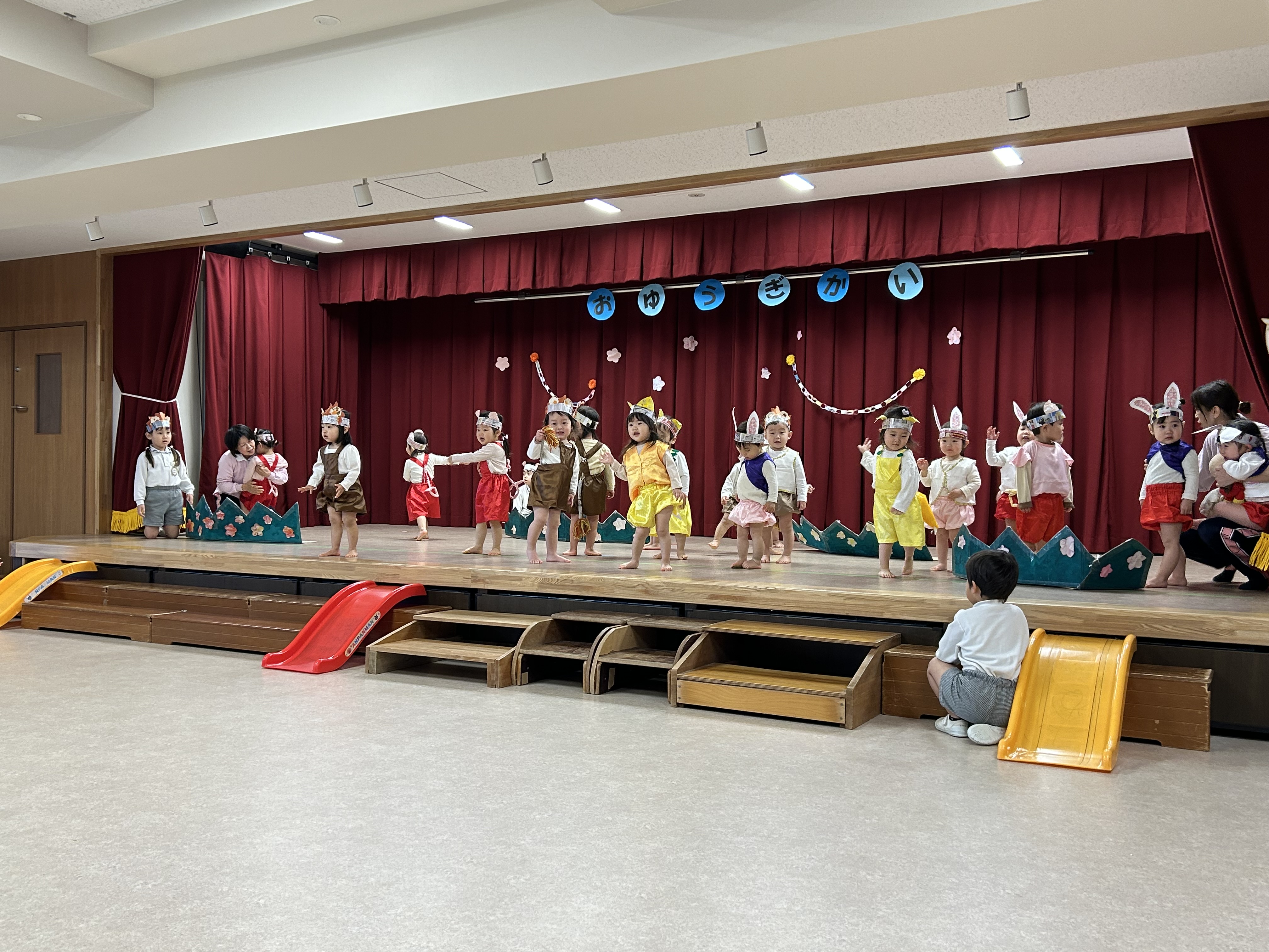 古森先生がお話の中で「普段の生活を見てください」と言われた通り、普段の保育室で踊ったり歌ったり手遊びしたり様子をホールの舞台で見て頂きました。