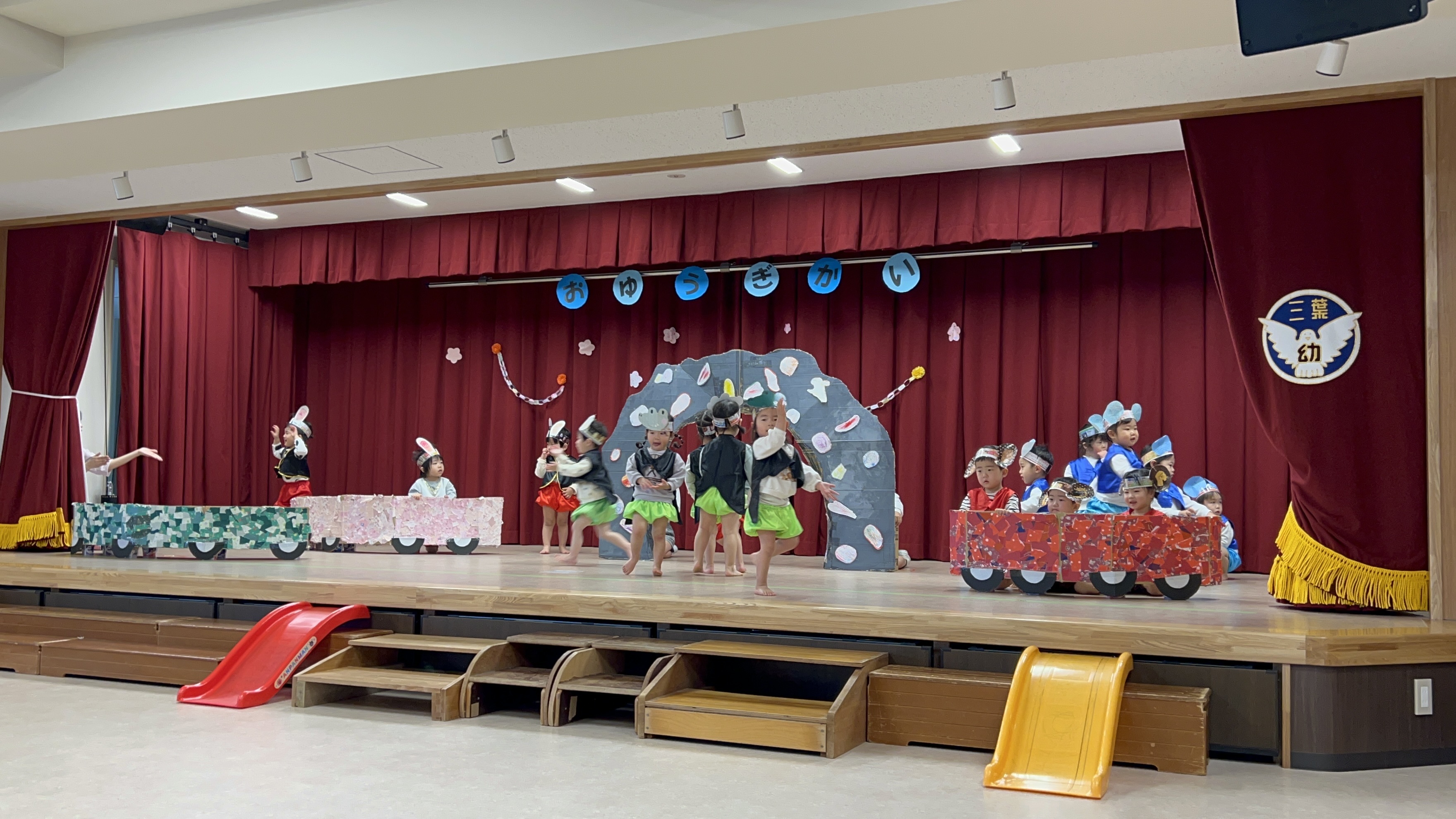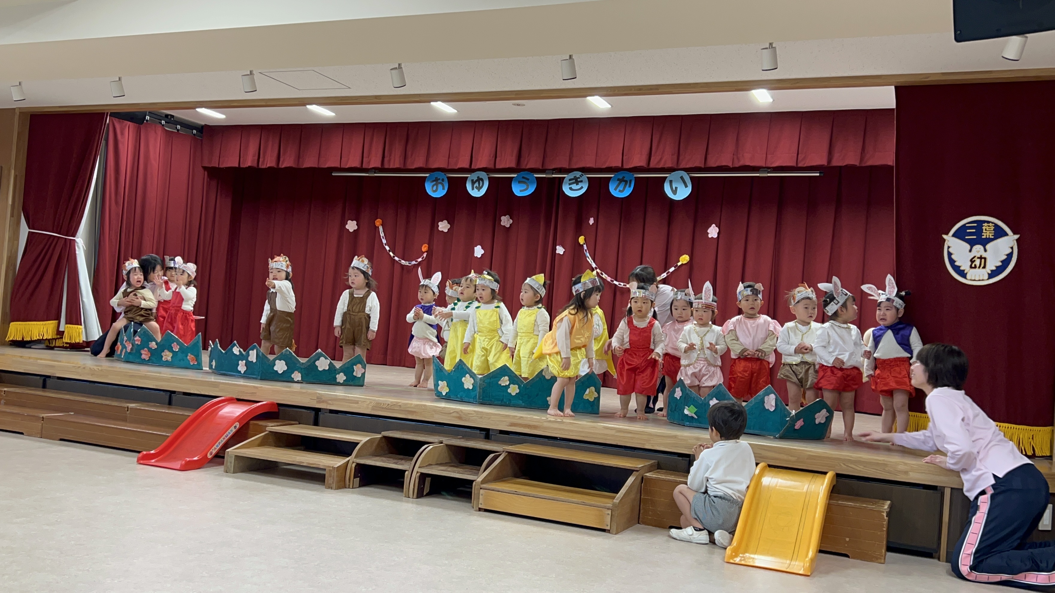昨日から降り続いた雨から一転、天気も良く過ごしやすい気温の中、三葉幼稚園ひよこ組のおゆうぎ会が行われました。