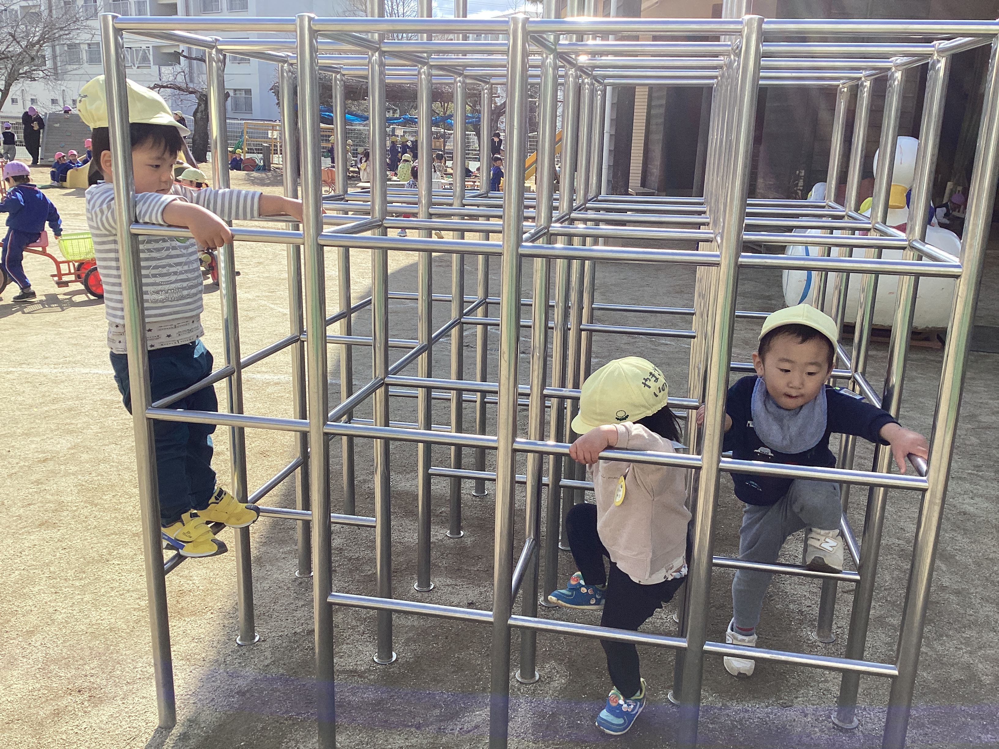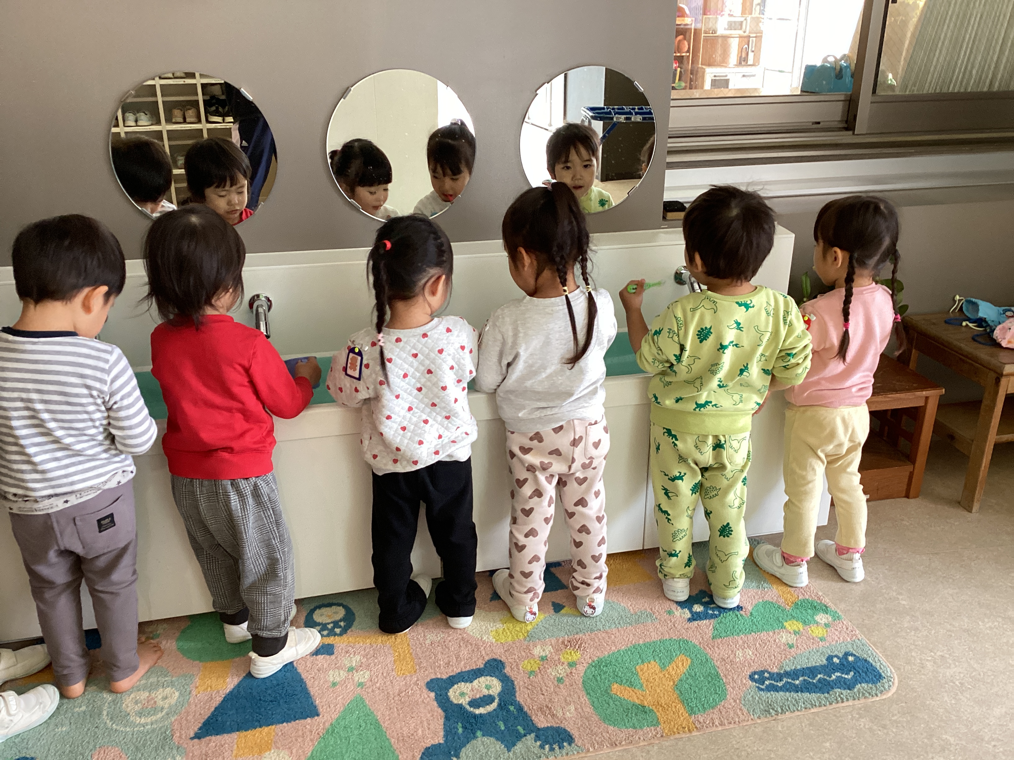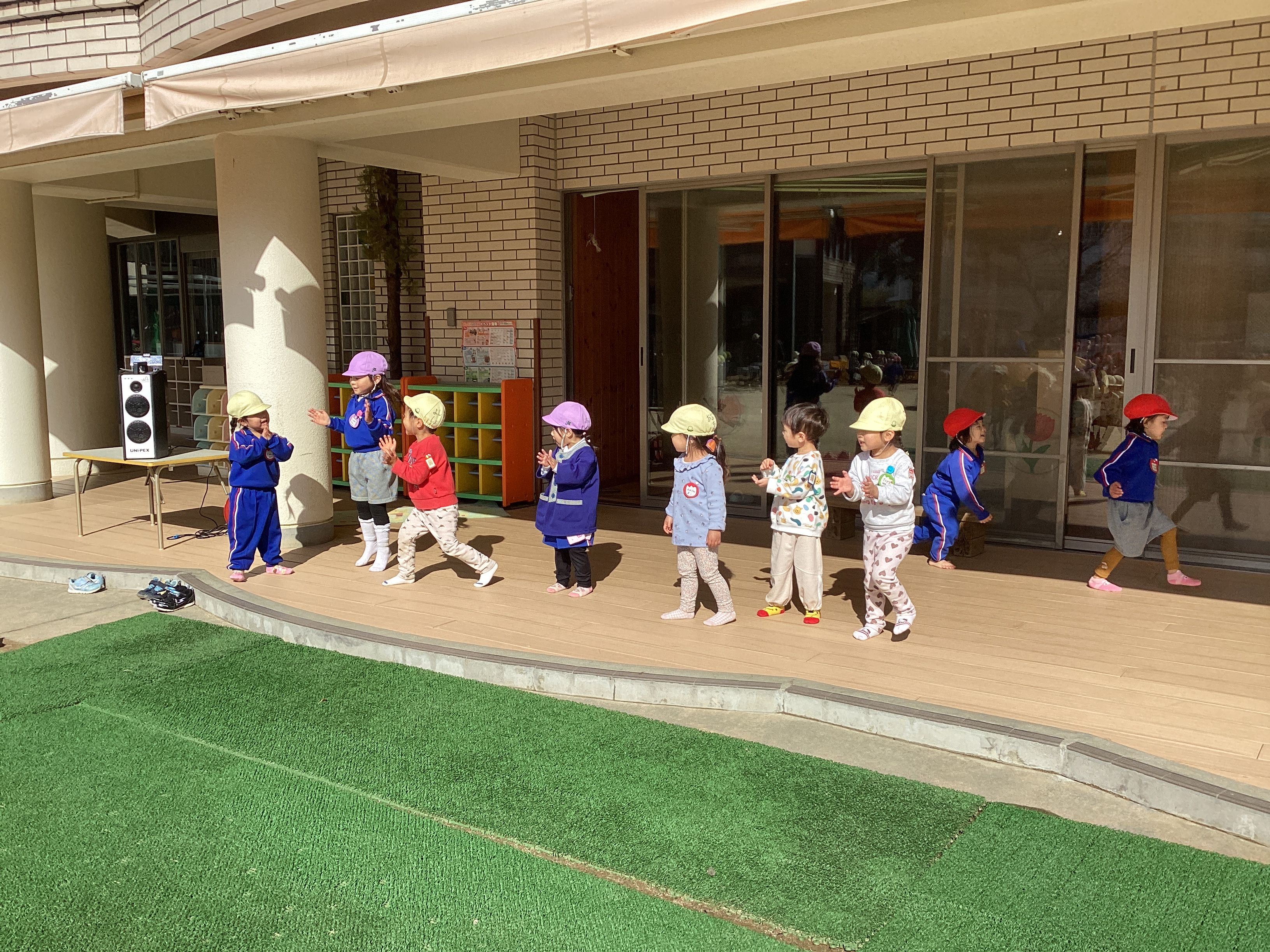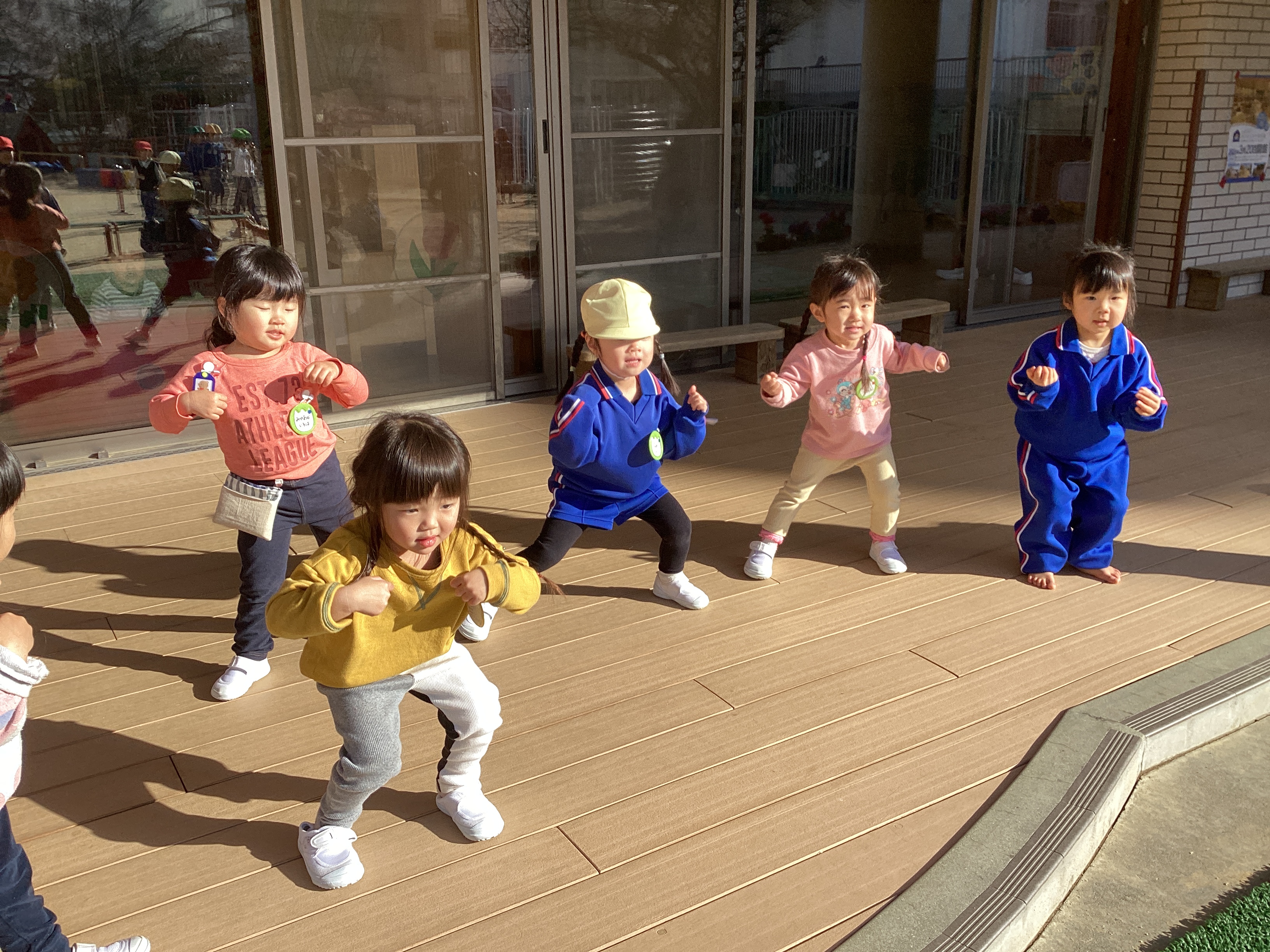 緑組では、朝から「今日はお弁当持ってきた!」「パパとママが作ってくれた!」とわくわく。登園したばかりなのに「もうお弁当の時間?」と今か今かと待ちわびていました。そんなお弁当を食べる前に今日は晴れ!戸外で思いっきり遊んでから食べることにしました。発表会が終わり、緑組と黄組は2階から1階の自分の部屋戻ってきたこの1週間。毎日のように戸外から様々な音楽が聞こえてくるとすぐにテラスへ出て踊りだします。そのお陰ですぐに振り付けを覚えるようになりました。分からなくても大丈夫。お兄さんお姉さんを見て踊ったり、時には自分で振り付けを考えてなりきって踊ったりしていました。