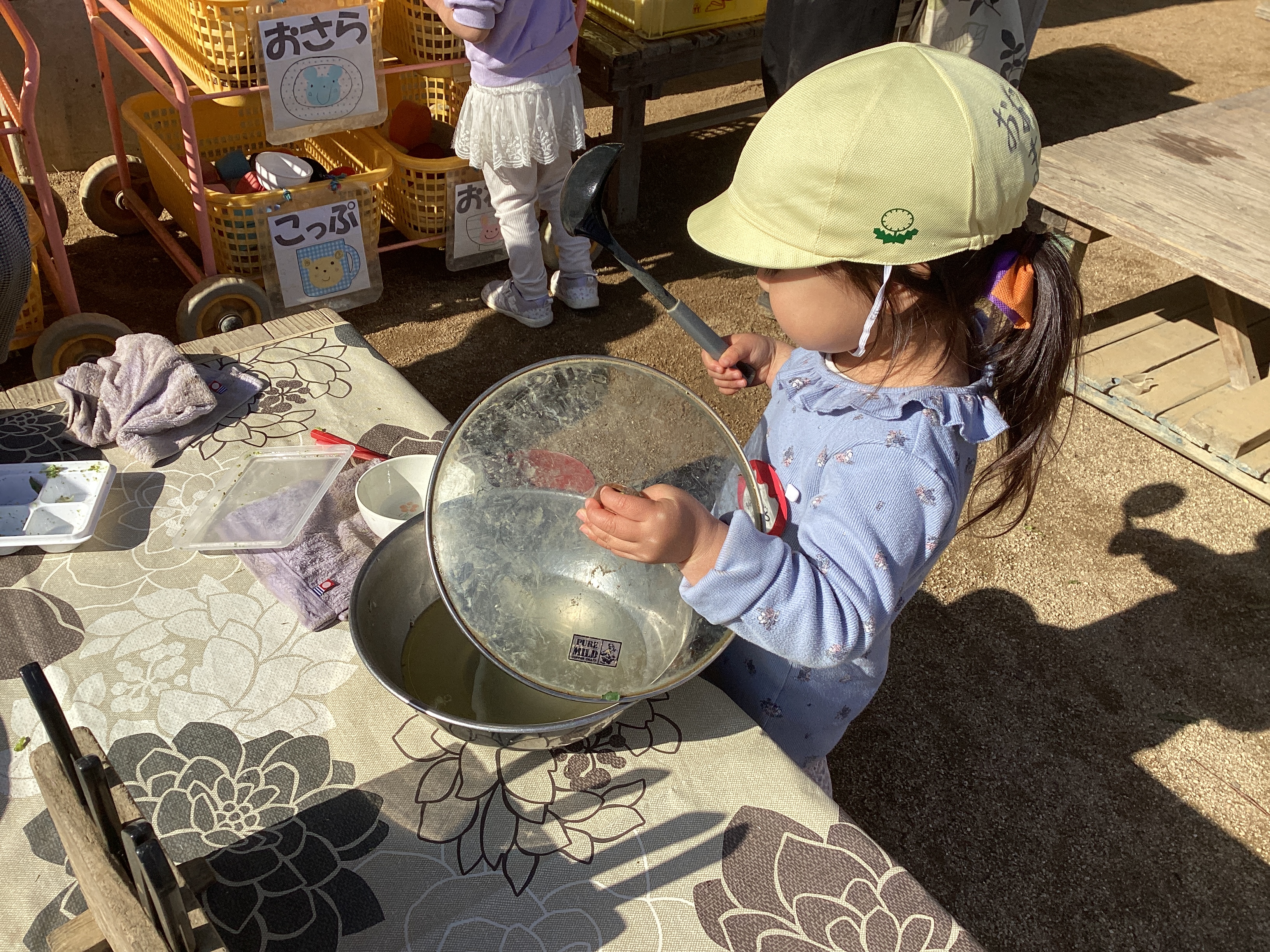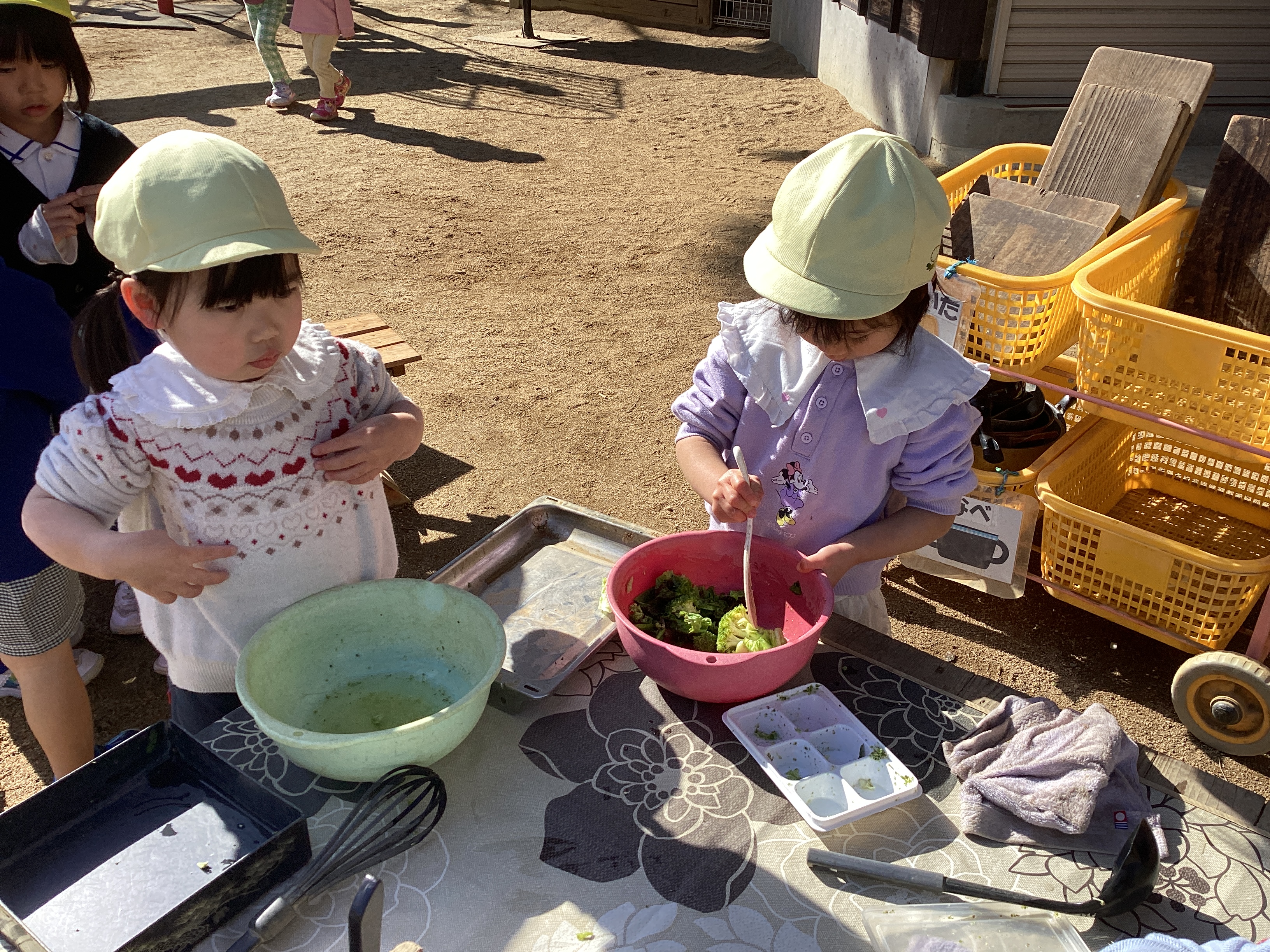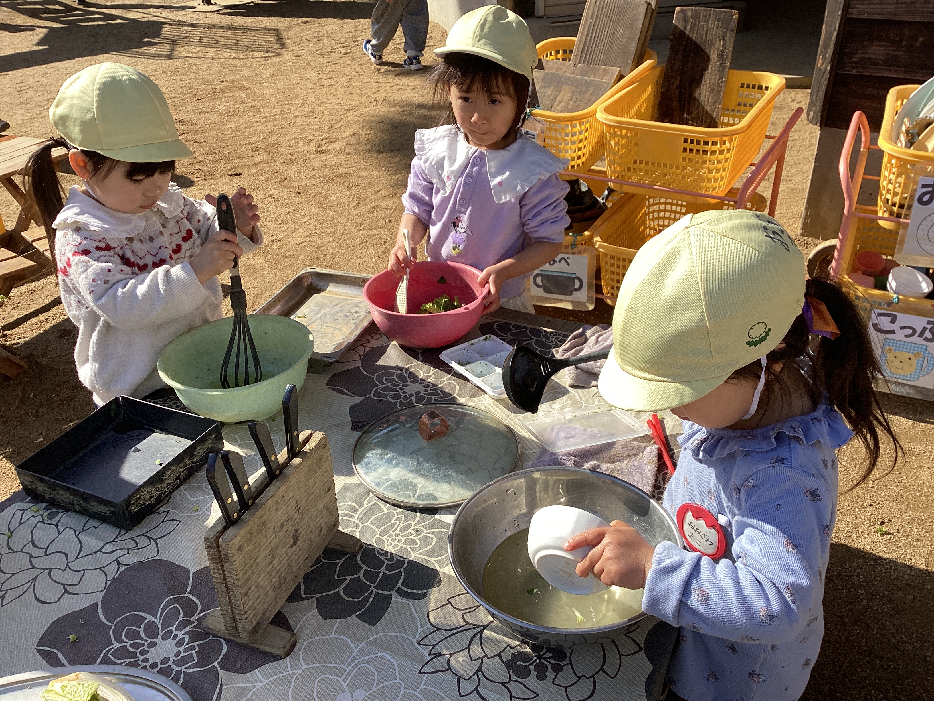 その隣にいたRちゃんは、ボールに蓋をして、開けていい匂いを嗅いではまた蓋をし…また開けて匂いを嗅いでは蓋をし、また開けて水を入れて蓋をし、しばらくして「できた!!」それはお味噌でした。たった3歳でもこんなに出来るなんて凄いなぁ。周りの大人のすることをよく見ているんだなぁ。そのようにして色々な事を学んでいるのだと感心しました。