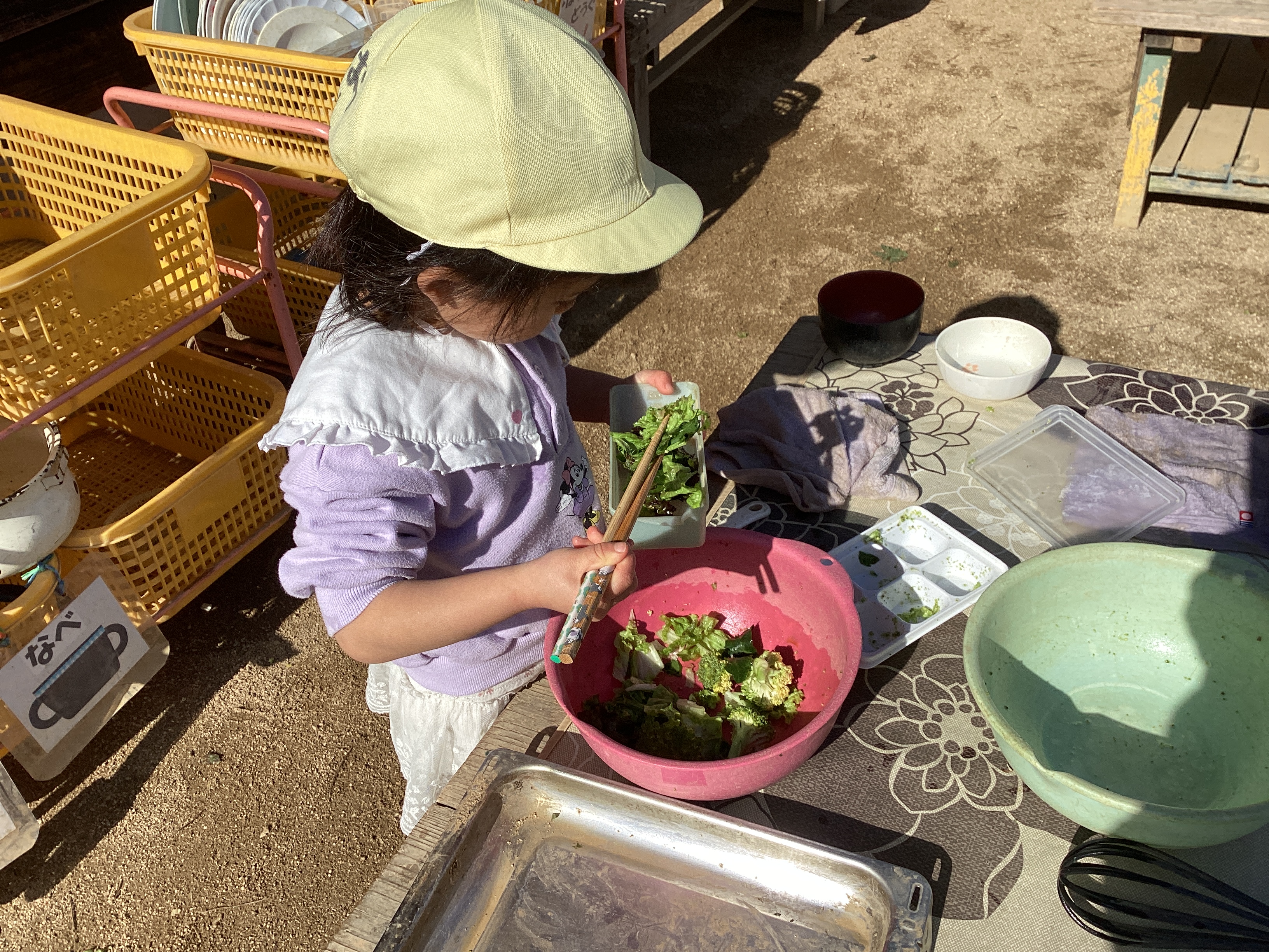 園庭をぐるりと見渡すとままごとコーナーで忙しくしているたんぽぽ組さんを見つけました。「幼稚園に行くからお弁当作っているの。」「これくらいのお弁当♪よ」発表会で「これくらいのお弁当箱」を踊ったたんぽぽ組さんはもっともっとお弁当が大好きになりました。Kちゃんはボールに切った材料を入れてしゃもじでかき混ぜています。しゃもじ?しゃもじで混ぜてる。どうしてだろう・・・。聞いてみると作っていたものはなんとちらし寿司。今度はしゃもじからお箸へと持ち替えてお弁当箱に入れています。その姿を見てすごい!!しゃもじでそのまま入れてしまいそうなところをちゃんとお箸に持ち替えている!!その姿は本当にお母さん!お台所でお母さんが作っている様子をじーっとよく見ていたんですね。