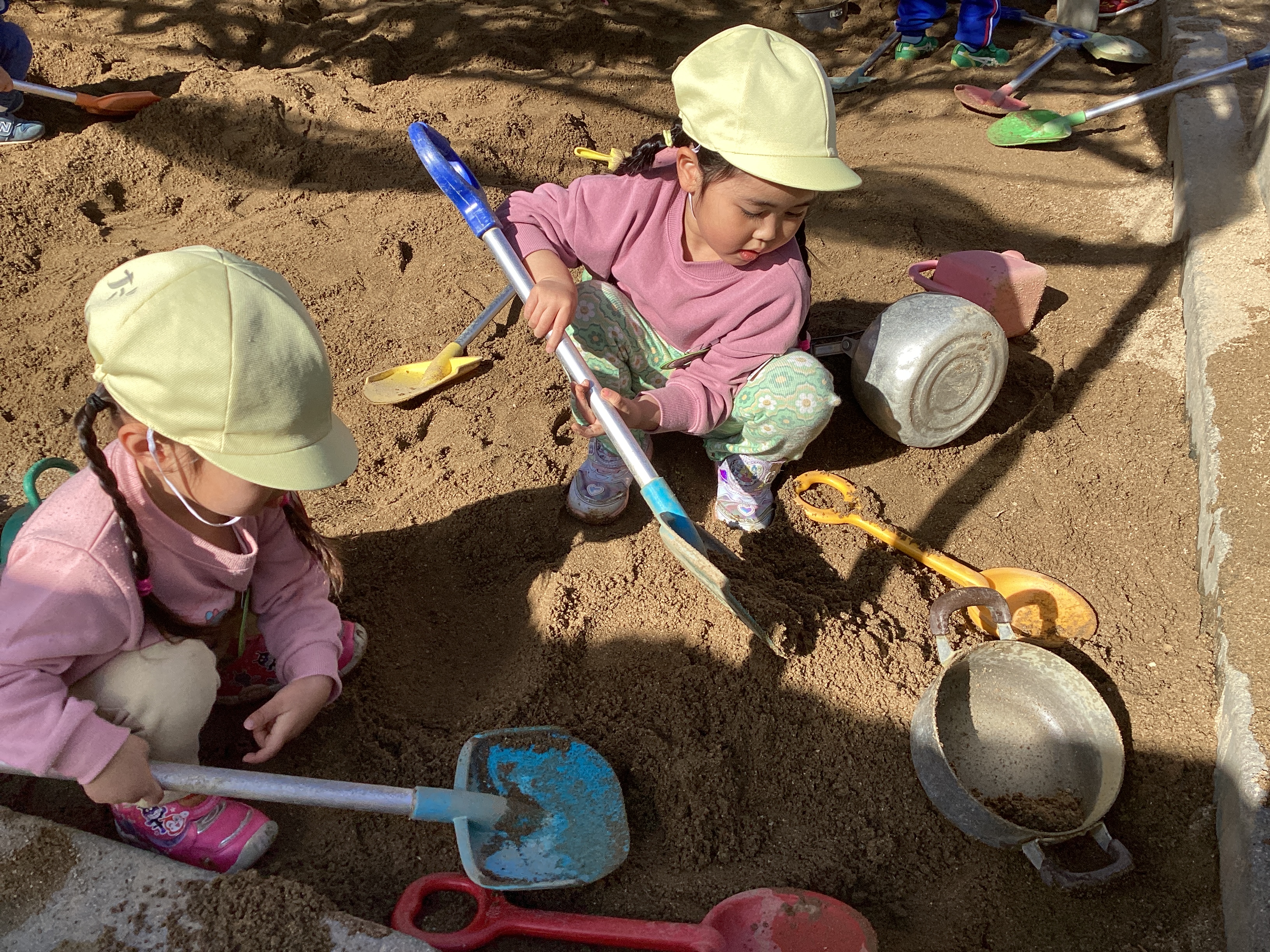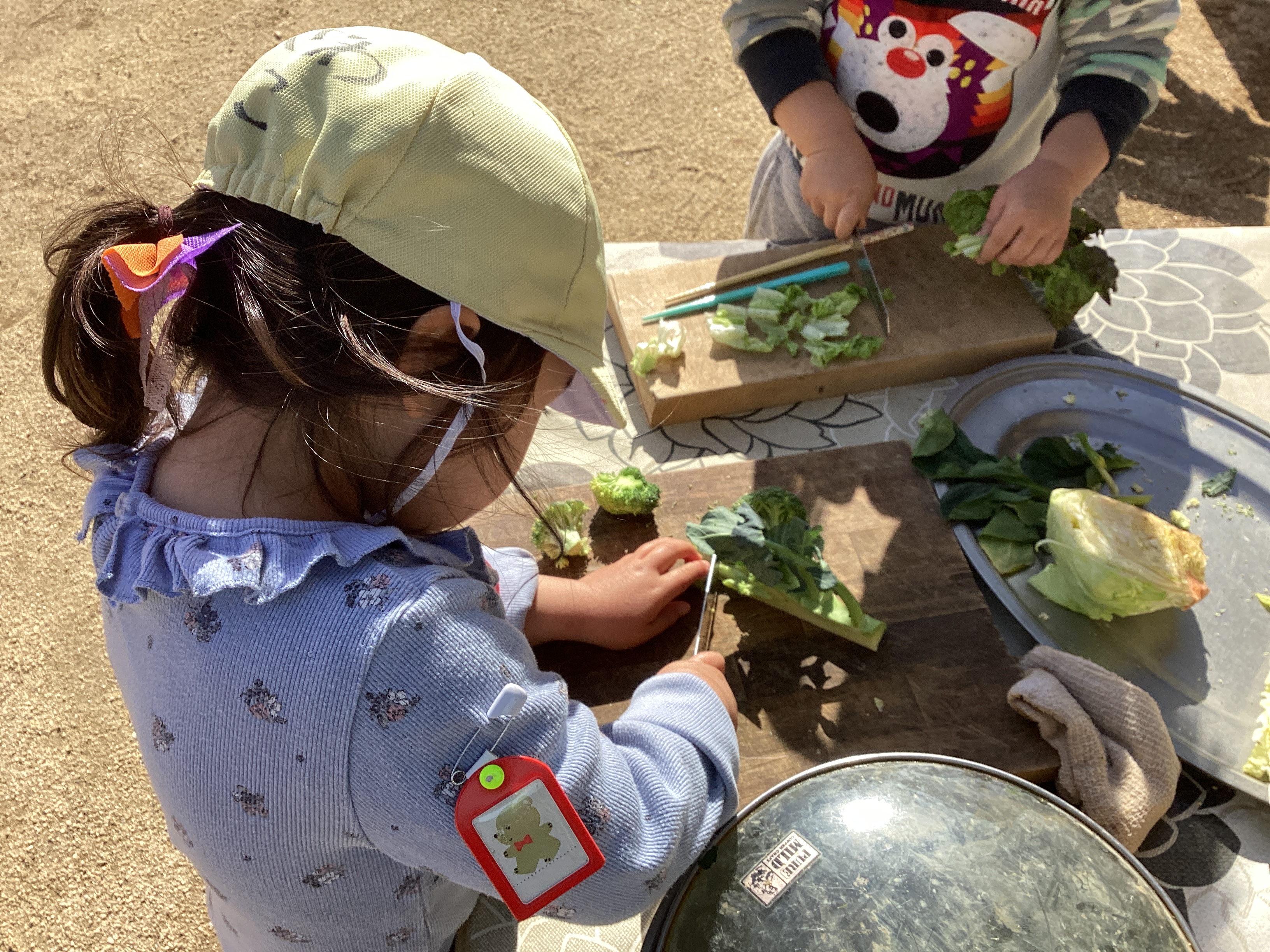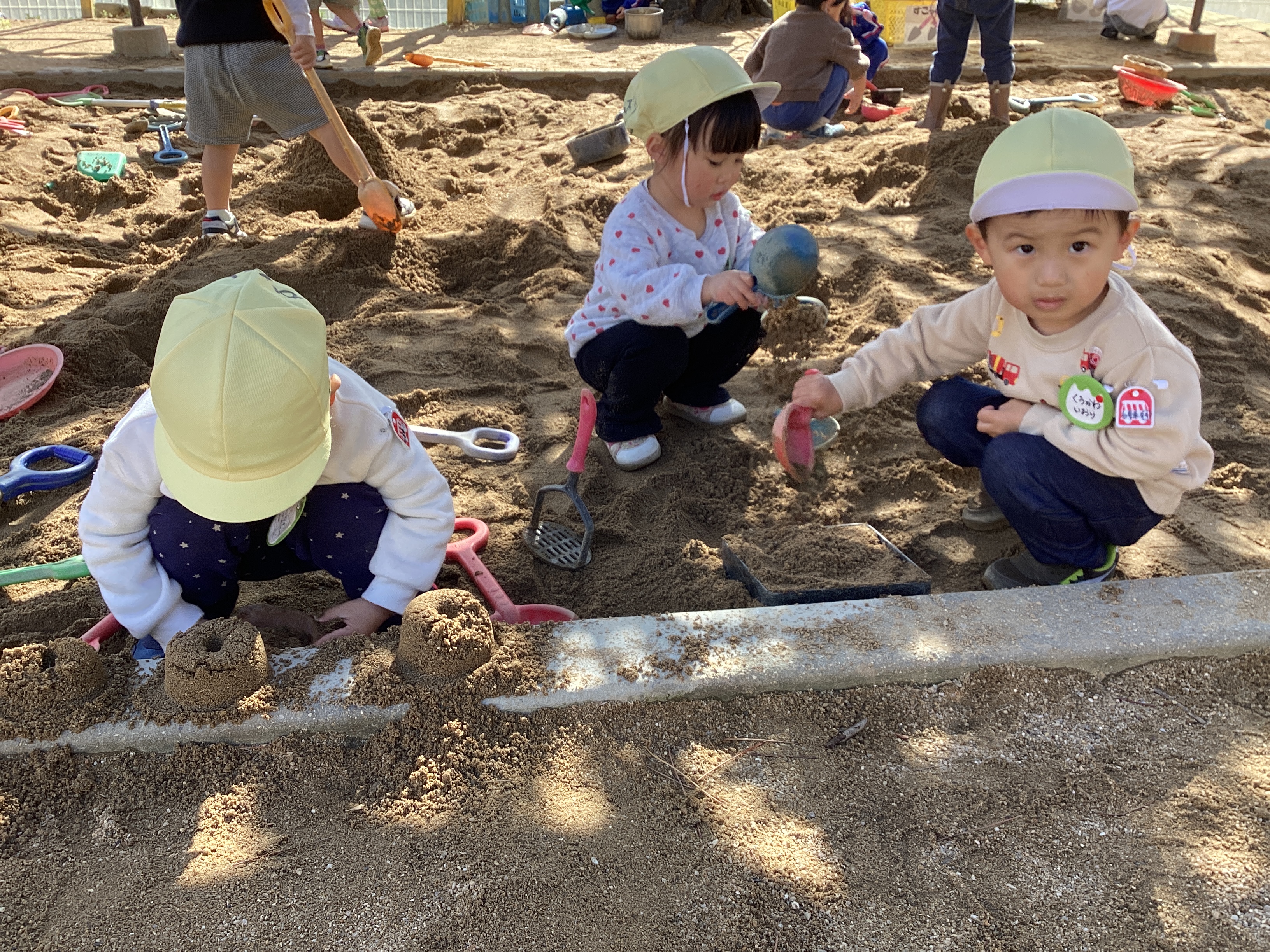 同じく砂場でも、「お肉作ってる。」「お弁当にご飯入れている。」「お弁当のデザート作ってる。」と、あちらこちらでお弁当を作っている姿が見られました。