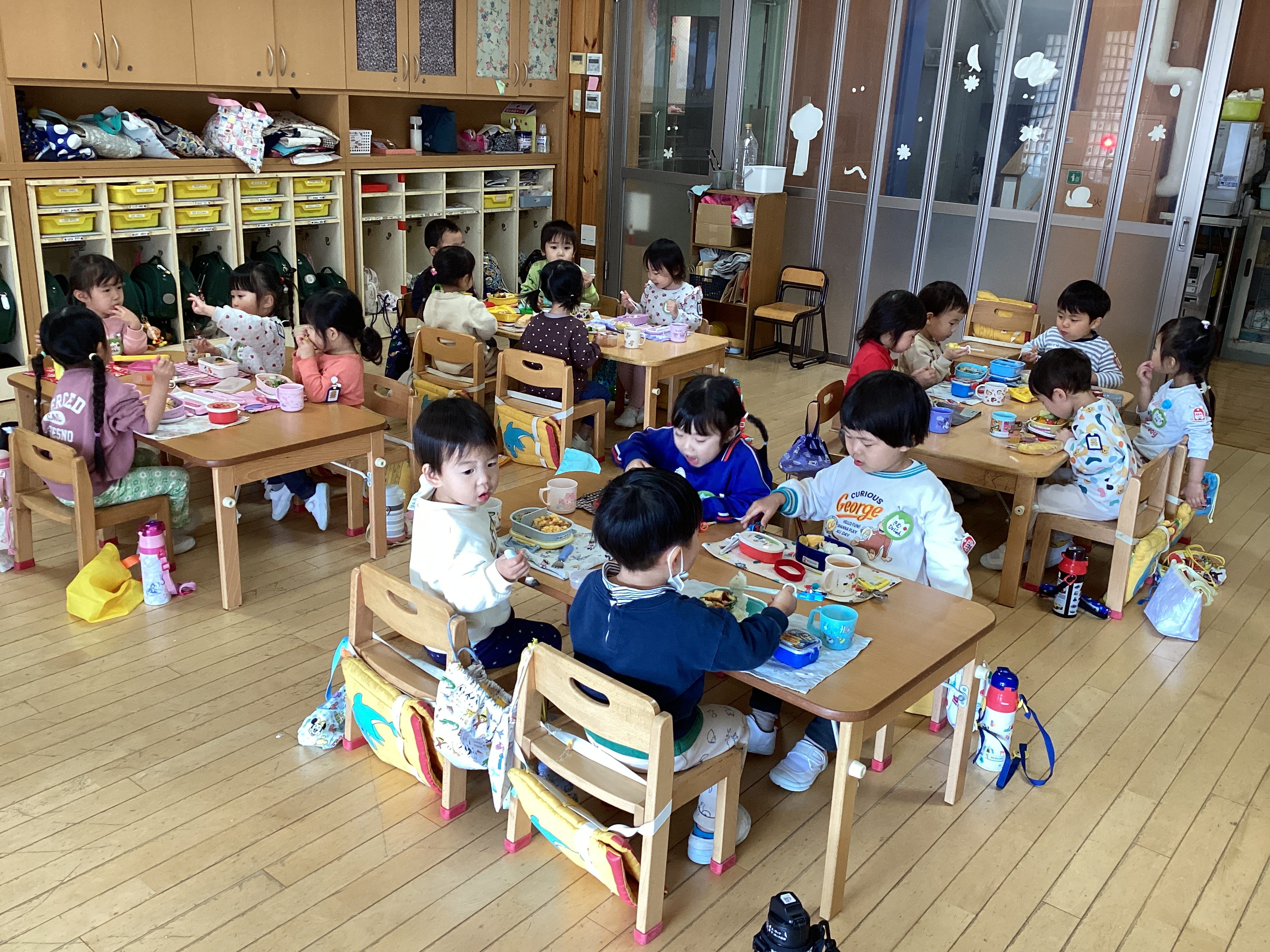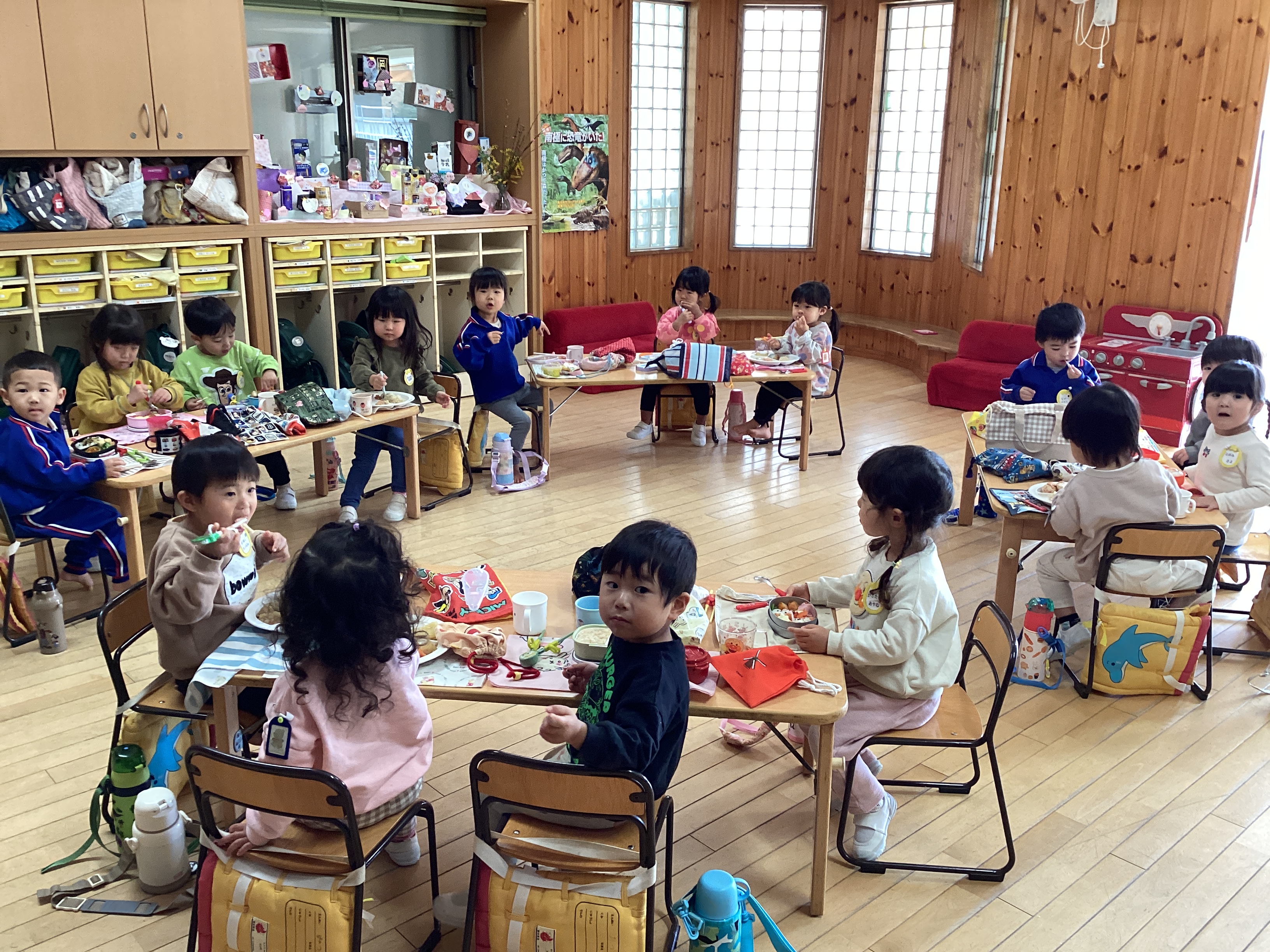 沢山遊んで嬉しい嬉しいお弁当の時間!「みてみてー!」「唐揚げ入ってる!」「バナナあるよー!」「卵焼きある!」と、もう大好きなお弁当の話がとまりません。とってもいい笑顔、そしてずっと笑顔で食べていました。